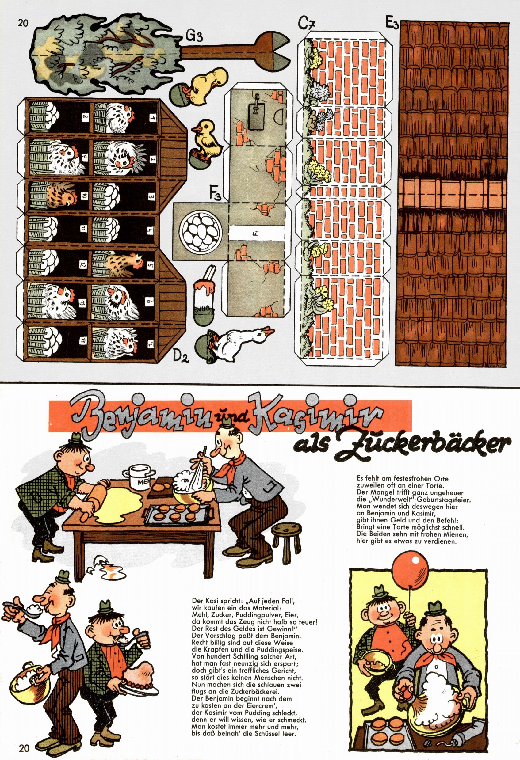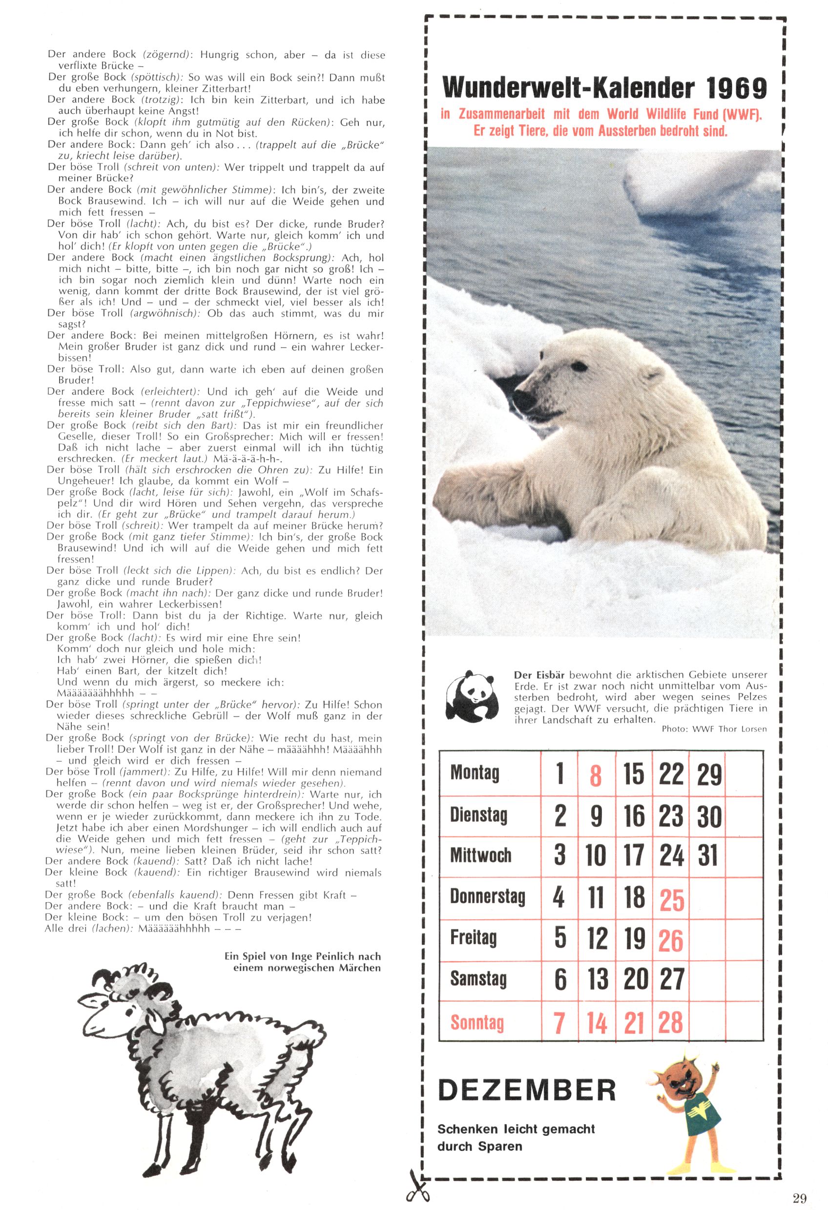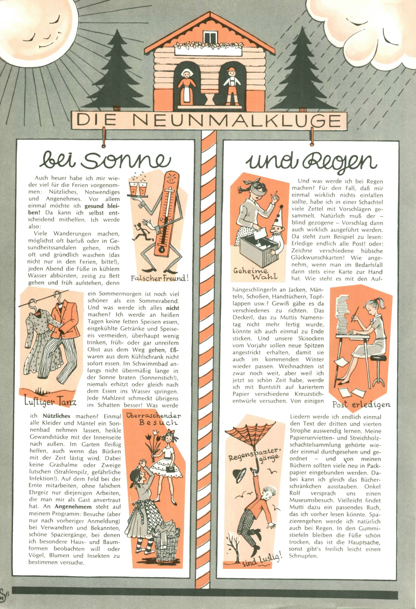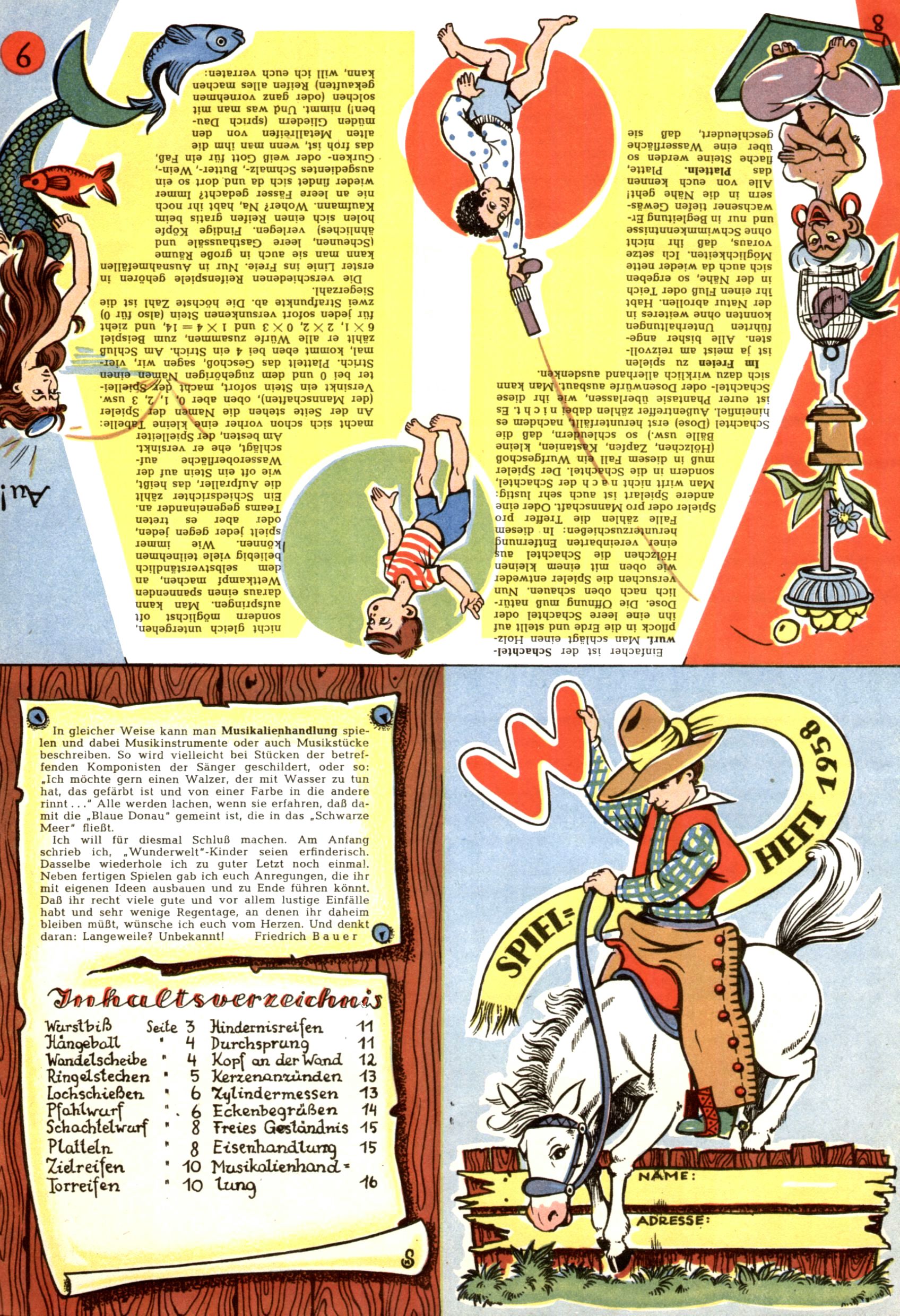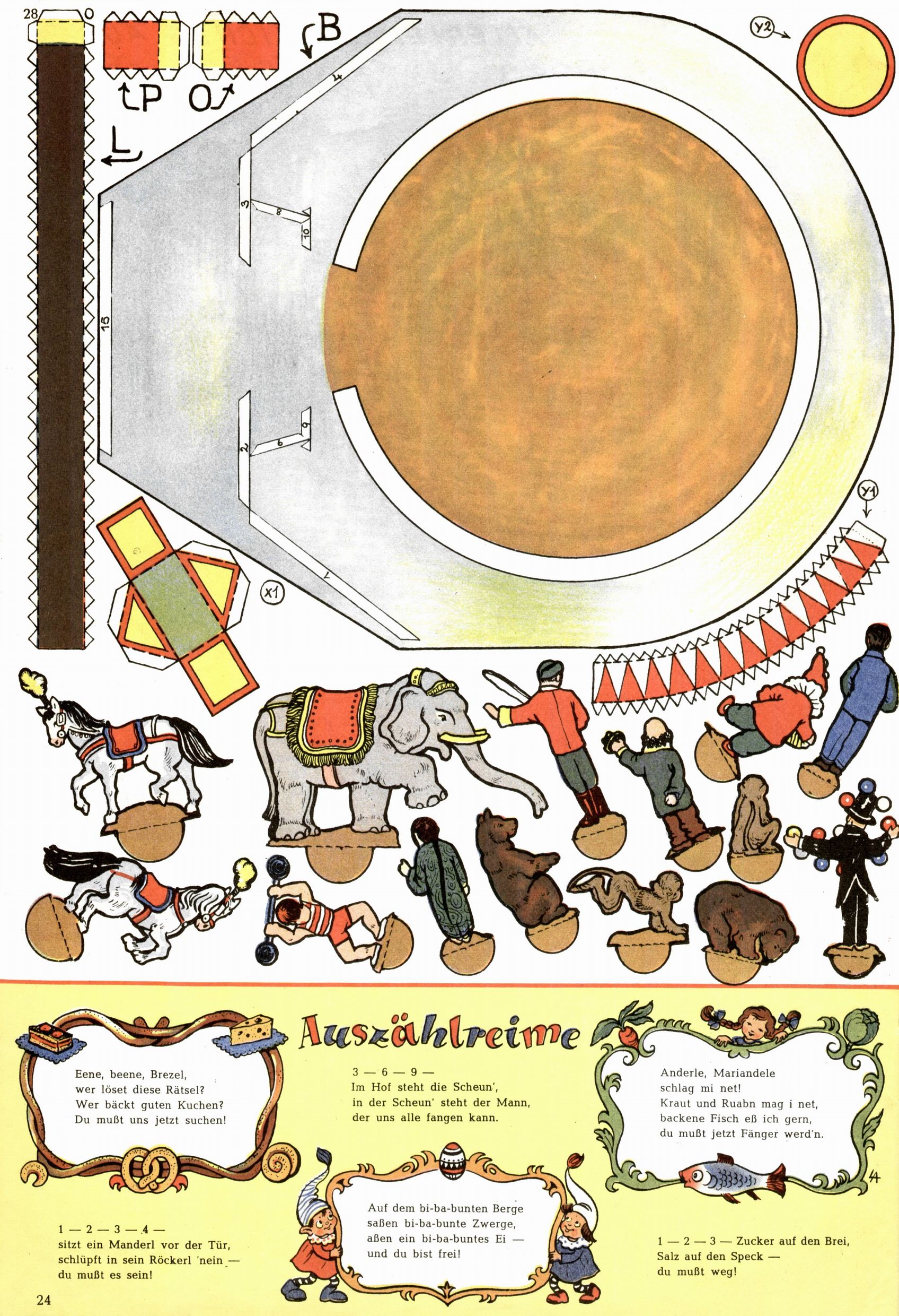Die Wunderwelt im Festtagsgewand In den Sonderheften präsentierte sich die Wunderwelt wahrhaftig in Feiertagsstimmung. Mit wenigen Ausnahmen gab es pro Jahr drei Sonderhefte - zu Weihnachten bzw. im Advent, zu Ostern und in den Ferien im Sommer. Experimente mit Faschings- und Muttertagsheften hatten sich nicht bewährt. Selbst als es die Einzelhefte in der Krisensituation nach 1967 nicht mehr gab, wurde die Wunderwelt-Zeitung im Layout der Sonderhefte fortgesetzt: Zunächst mit 3 bis 5 und ab 1971 immerhin wieder mit 10-12 Heften pro Jahr. Die Weihnachts-, Oster- und Ferienhefte hatten naturgemäß verschiedene Schwerpunkte. Während im Sommer Spielen und Werken mit Material im Vordergrund stand, waren es zu Weihnachten Krippen und Adventhäuser; zu Ostern dann Erzählungen, Hasenstädte und Oster-Basteleien. Das bessere Papier der Sonderhefte erleichterte das Ausschneiden der insgesamt mehr als 1000 Papiermodelle erheblich. Die Sonderhefte waren vergleichsweise aufwändig gestaltet, aber auch ein wichtiges Zusatzgeschäft für die Zeitung. Die Kinder fieberten dem Erscheinungsdatum der jeweiligen Ausgabe nicht selten richtiggehend entgegen. Mit knapp 100 Seiten pro Jahr machten die Sonderhefte von der Menge her zwar nicht einmal ein Viertel aus, trugen aber zum Erscheinungsbild mindestens genauso viel bei wie die Standardhefte. Im Wesentlichen blieb das Layout der Sonderhefte über die Jahre hin unverändert. Mühselig wurde es, als man den Inhalt der Beiträge vorübergehend auf die Seiten gleichmäßig verteilte und die Kinder ermunterte, die Hefte in der Mitte zu zerschneiden. Die eine Hälfte enthielt dann etwa Erzählungen und Bastelvorschläge, der andere Teil der Zeitung Spielanleitungen. Zur übersichtlichkeit trugen diese Layoutversuche jedenfalls in keiner Weise bei und als besonderen Auswuchs gab es eine Zeitlang auf einer Seite oft mehrere Seitennummern, je nachdem, ob sich diese auf das Gesamtheft oder den herauszunehmenden und zu zerschneidenden Heftteil bezogen. Gegen Ende der 1950er Jahre kehrte man wieder zu einem ganzseitigen Layout zurück und Ideen wie ein Spiel-(Heft-im-)Heft gehörten der Vergangenheit an. In den Sonderheften experimentierte man dann noch ab Mitte der 1960er Jahre, als die Verkaufszahlen stark rückläufig waren, mit grundsätzlich neuen Darstellungsformen - weg vom Niedlich-Kitschigen und engagierte neue Grafikerinnen wie Gundi Groh und Hella Soyka. Den erhofften Erfolg brachte dies jedoch nicht mehr. |