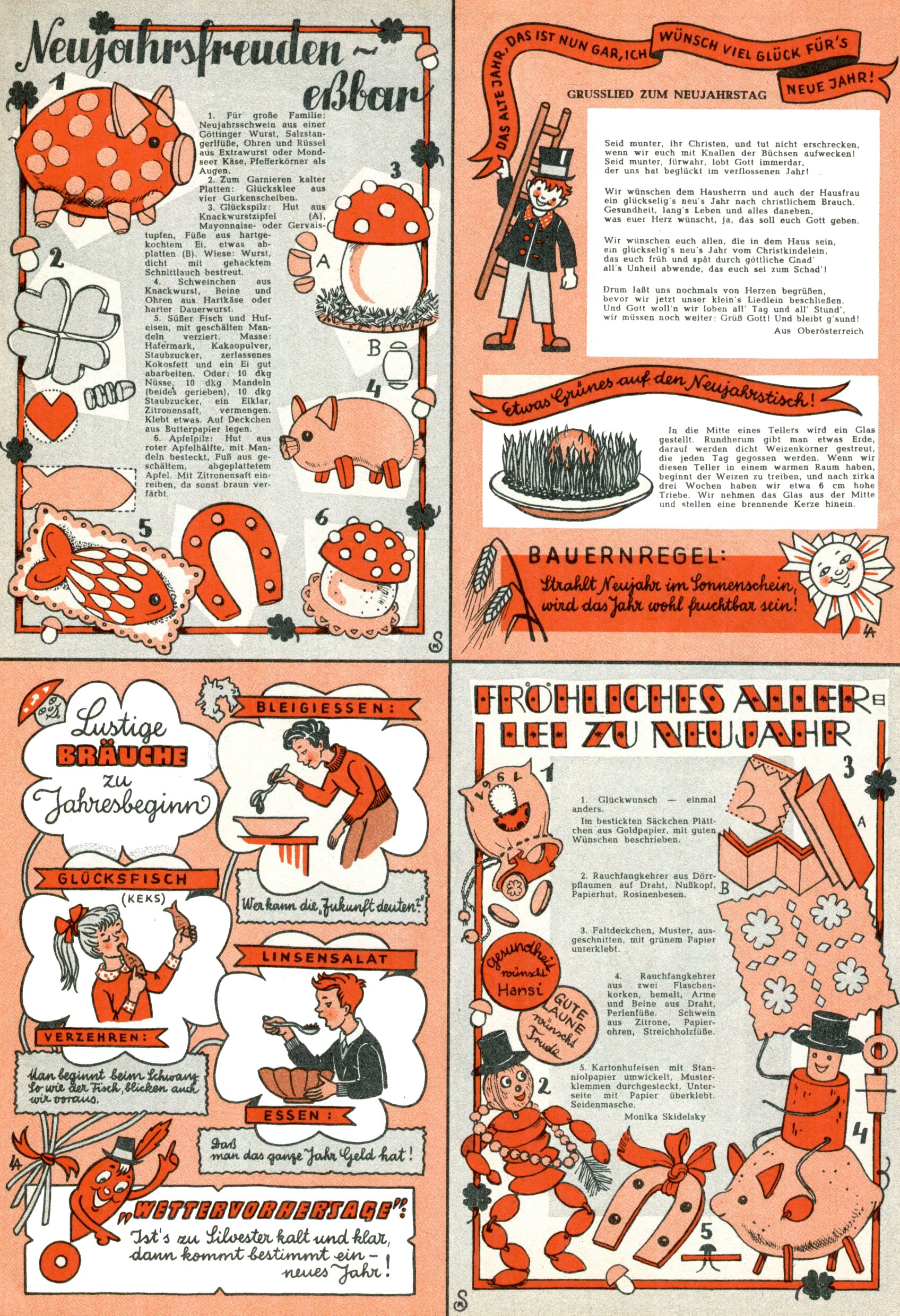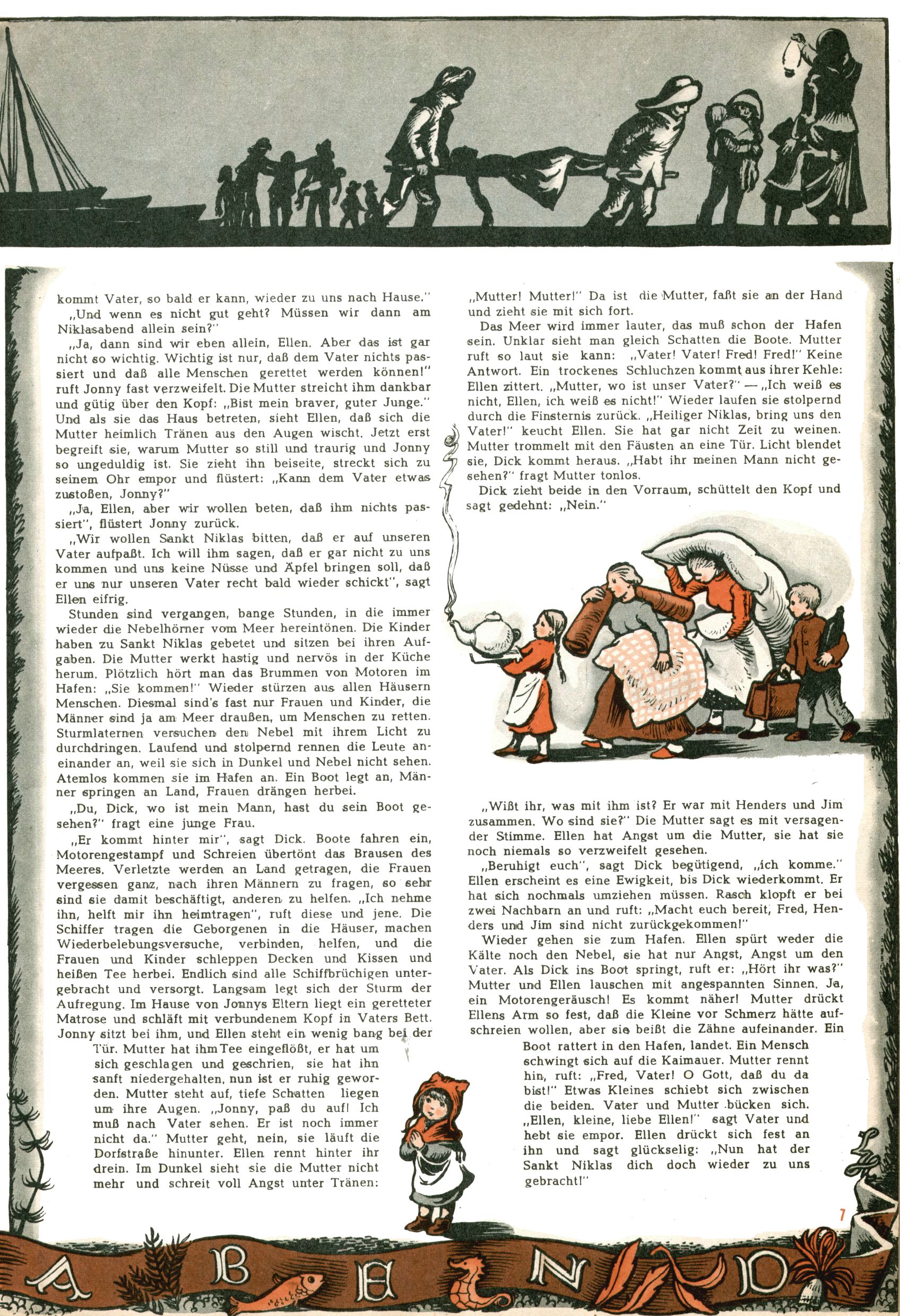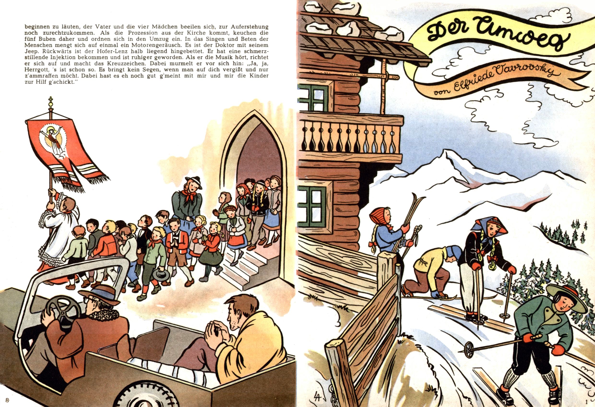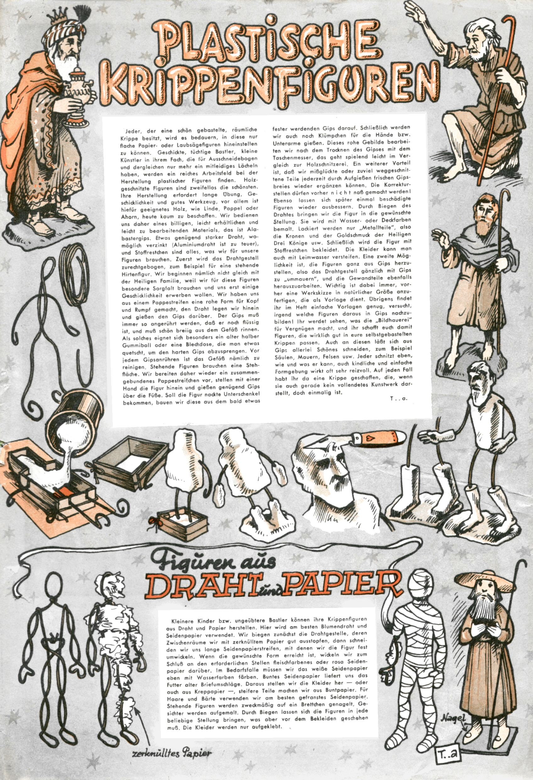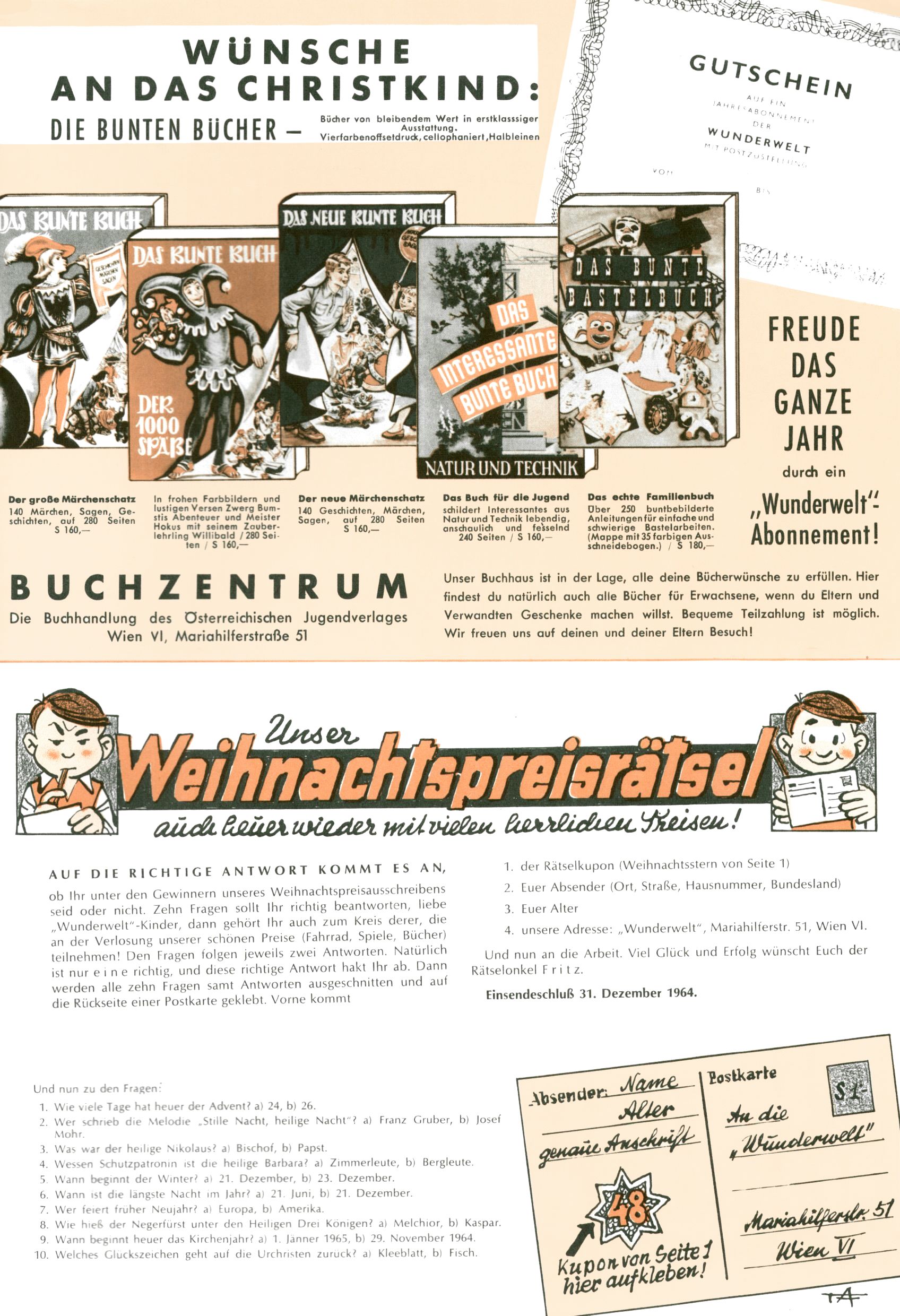 Die Wunderwelt im Festtagsgewand In den Sonderheften präsentierte sich die Wunderwelt wahrhaftig in Feiertagsstimmung. Mit wenigen Ausnahmen gab es pro Jahr drei Sonderhefte - zu Weihnachten bzw. im Advent, zu Ostern und in den Ferien im Sommer. Experimente mit Faschings- und Muttertagsheften hatten sich nicht bewährt. Selbst als es die Einzelhefte in der Krisensituation nach 1967 nicht mehr gab, wurde die Wunderwelt-Zeitung im Layout der Sonderhefte fortgesetzt: Zunächst mit 3 bis 5 und ab 1971 immerhin wieder mit 10-12 Heften pro Jahr. Die Weihnachts-, Oster- und Ferienhefte hatten naturgemäß verschiedene Schwerpunkte. Während im Sommer Spielen und Werken mit Material im Vordergrund stand, waren es zu Weihnachten Krippen und Adventhäuser; zu Ostern dann Erzählungen, Hasenstädte und Oster-Basteleien. Das bessere Papier der Sonderhefte erleichterte das Ausschneiden der insgesamt mehr als 1000 Papiermodelle erheblich. Die Sonderhefte waren vergleichsweise aufwändig gestaltet, aber auch ein wichtiges Zusatzgeschäft für die Zeitung. Die Kinder fieberten dem Erscheinungsdatum der jeweiligen Ausgabe nicht selten richtiggehend entgegen. Mit knapp 100 Seiten pro Jahr machten die Sonderhefte von der Menge her zwar nicht einmal ein Viertel aus, trugen aber zum Erscheinungsbild mindestens genauso viel bei wie die Standardhefte. Im Wesentlichen blieb das Layout der Sonderhefte über die Jahre hin unverändert. Mühselig wurde es, als man den Inhalt der Beiträge vorübergehend auf die Seiten gleichmäßig verteilte und die Kinder ermunterte, die Hefte in der Mitte zu zerschneiden. Die eine Hälfte enthielt dann etwa Erzählungen und Bastelvorschläge, der andere Teil der Zeitung Spielanleitungen. Zur übersichtlichkeit trugen diese Layoutversuche jedenfalls in keiner Weise bei und als besonderen Auswuchs gab es eine Zeitlang auf einer Seite oft mehrere Seitennummern, je nachdem, ob sich diese auf das Gesamtheft oder den herauszunehmenden und zu zerschneidenden Heftteil bezogen. Gegen Ende der 1950er Jahre kehrte man wieder zu einem ganzseitigen Layout zurück und Ideen wie ein Spiel-(Heft-im-)Heft gehörten der Vergangenheit an. In den Sonderheften experimentierte man dann noch ab Mitte der 1960er Jahre, als die Verkaufszahlen stark rückläufig waren, mit grundsätzlich neuen Darstellungsformen - weg vom Niedlich-Kitschigen und engagierte neue Grafikerinnen wie Gundi Groh und Hella Soyka. Den erhofften Erfolg brachte dies jedoch nicht mehr. |