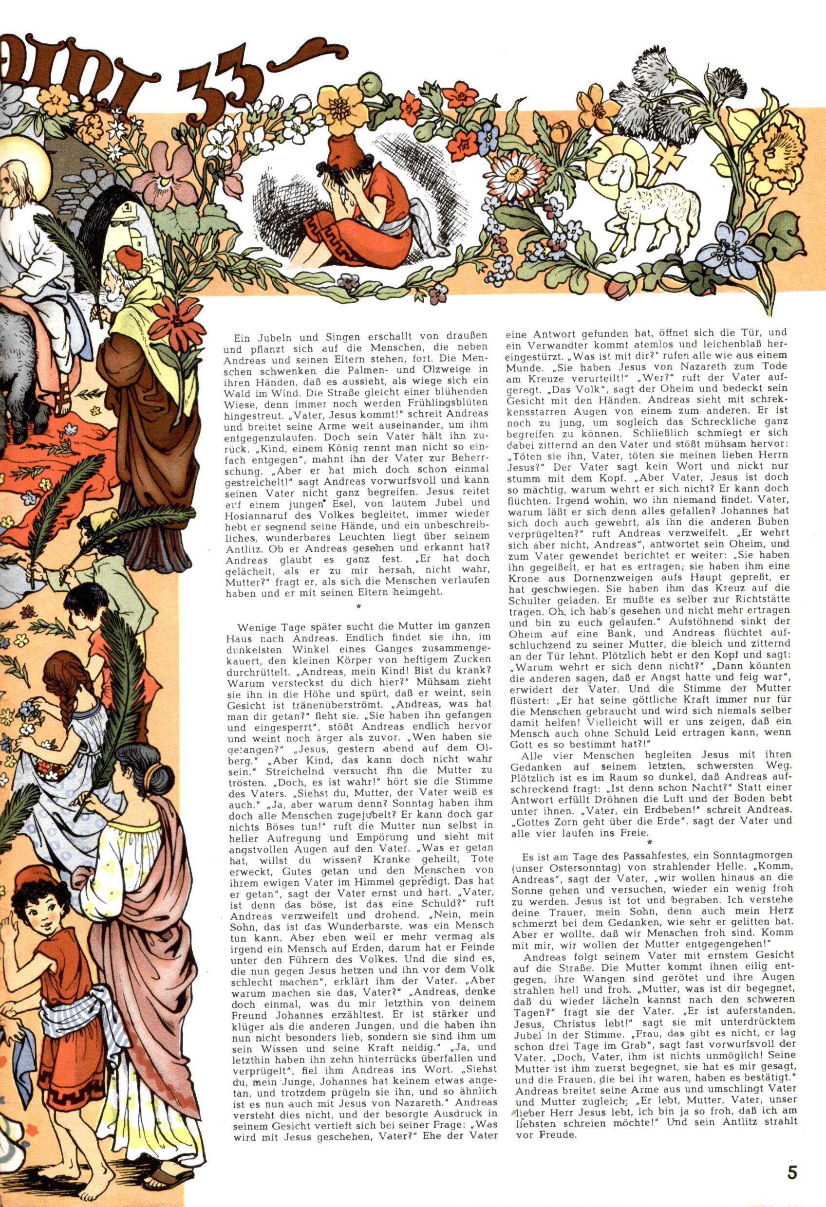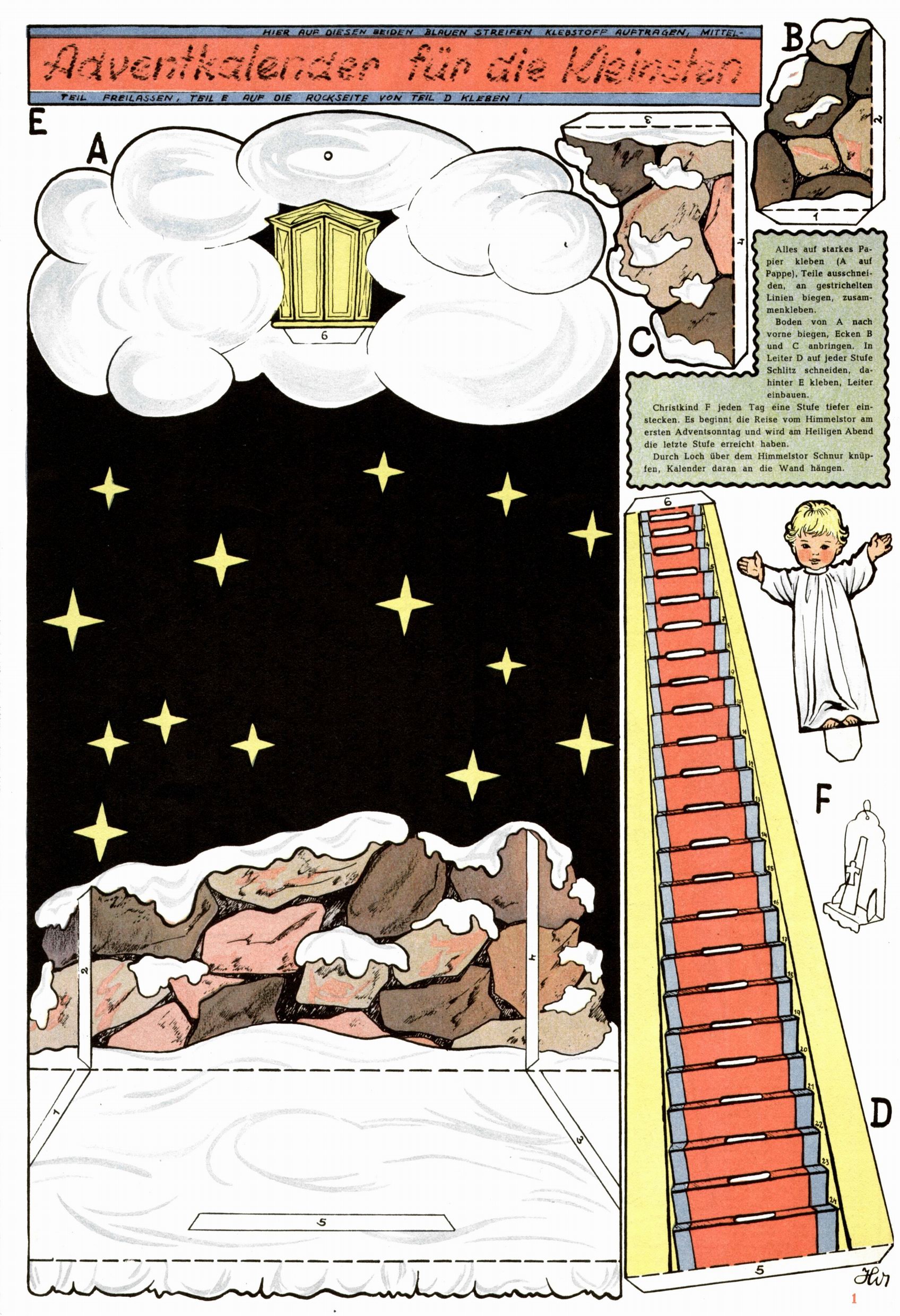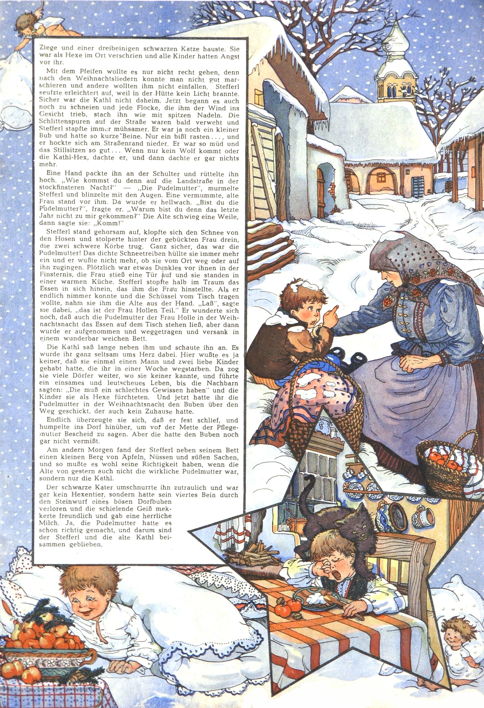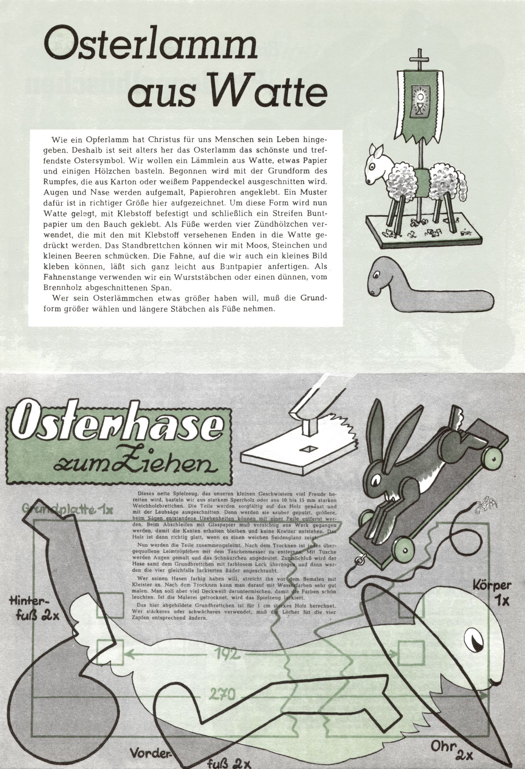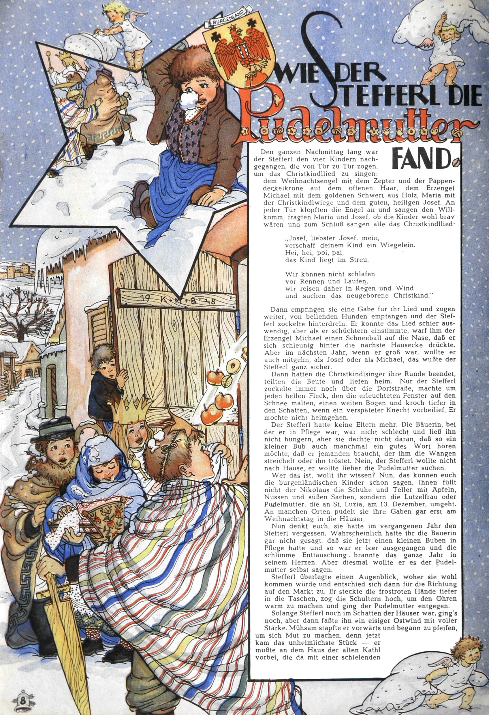 Die Wunderwelt im Festtagsgewand In den Sonderheften präsentierte sich die Wunderwelt wahrhaftig in Feiertagsstimmung. Mit wenigen Ausnahmen gab es pro Jahr drei Sonderhefte - zu Weihnachten bzw. im Advent, zu Ostern und in den Ferien im Sommer. Experimente mit Faschings- und Muttertagsheften hatten sich nicht bewährt. Selbst als es die Einzelhefte in der Krisensituation nach 1967 nicht mehr gab, wurde die Wunderwelt-Zeitung im Layout der Sonderhefte fortgesetzt: Zunächst mit 3 bis 5 und ab 1971 immerhin wieder mit 10-12 Heften pro Jahr. Die Weihnachts-, Oster- und Ferienhefte hatten naturgemäß verschiedene Schwerpunkte. Während im Sommer Spielen und Werken mit Material im Vordergrund stand, waren es zu Weihnachten Krippen und Adventhäuser; zu Ostern dann Erzählungen, Hasenstädte und Oster-Basteleien. Das bessere Papier der Sonderhefte erleichterte das Ausschneiden der insgesamt mehr als 1000 Papiermodelle erheblich. Die Sonderhefte waren vergleichsweise aufwändig gestaltet, aber auch ein wichtiges Zusatzgeschäft für die Zeitung. Die Kinder fieberten dem Erscheinungsdatum der jeweiligen Ausgabe nicht selten richtiggehend entgegen. Mit knapp 100 Seiten pro Jahr machten die Sonderhefte von der Menge her zwar nicht einmal ein Viertel aus, trugen aber zum Erscheinungsbild mindestens genauso viel bei wie die Standardhefte. Im Wesentlichen blieb das Layout der Sonderhefte über die Jahre hin unverändert. Mühselig wurde es, als man den Inhalt der Beiträge vorübergehend auf die Seiten gleichmäßig verteilte und die Kinder ermunterte, die Hefte in der Mitte zu zerschneiden. Die eine Hälfte enthielt dann etwa Erzählungen und Bastelvorschläge, der andere Teil der Zeitung Spielanleitungen. Zur übersichtlichkeit trugen diese Layoutversuche jedenfalls in keiner Weise bei und als besonderen Auswuchs gab es eine Zeitlang auf einer Seite oft mehrere Seitennummern, je nachdem, ob sich diese auf das Gesamtheft oder den herauszunehmenden und zu zerschneidenden Heftteil bezogen. Gegen Ende der 1950er Jahre kehrte man wieder zu einem ganzseitigen Layout zurück und Ideen wie ein Spiel-(Heft-im-)Heft gehörten der Vergangenheit an. In den Sonderheften experimentierte man dann noch ab Mitte der 1960er Jahre, als die Verkaufszahlen stark rückläufig waren, mit grundsätzlich neuen Darstellungsformen - weg vom Niedlich-Kitschigen und engagierte neue Grafikerinnen wie Gundi Groh und Hella Soyka. Den erhofften Erfolg brachte dies jedoch nicht mehr. |