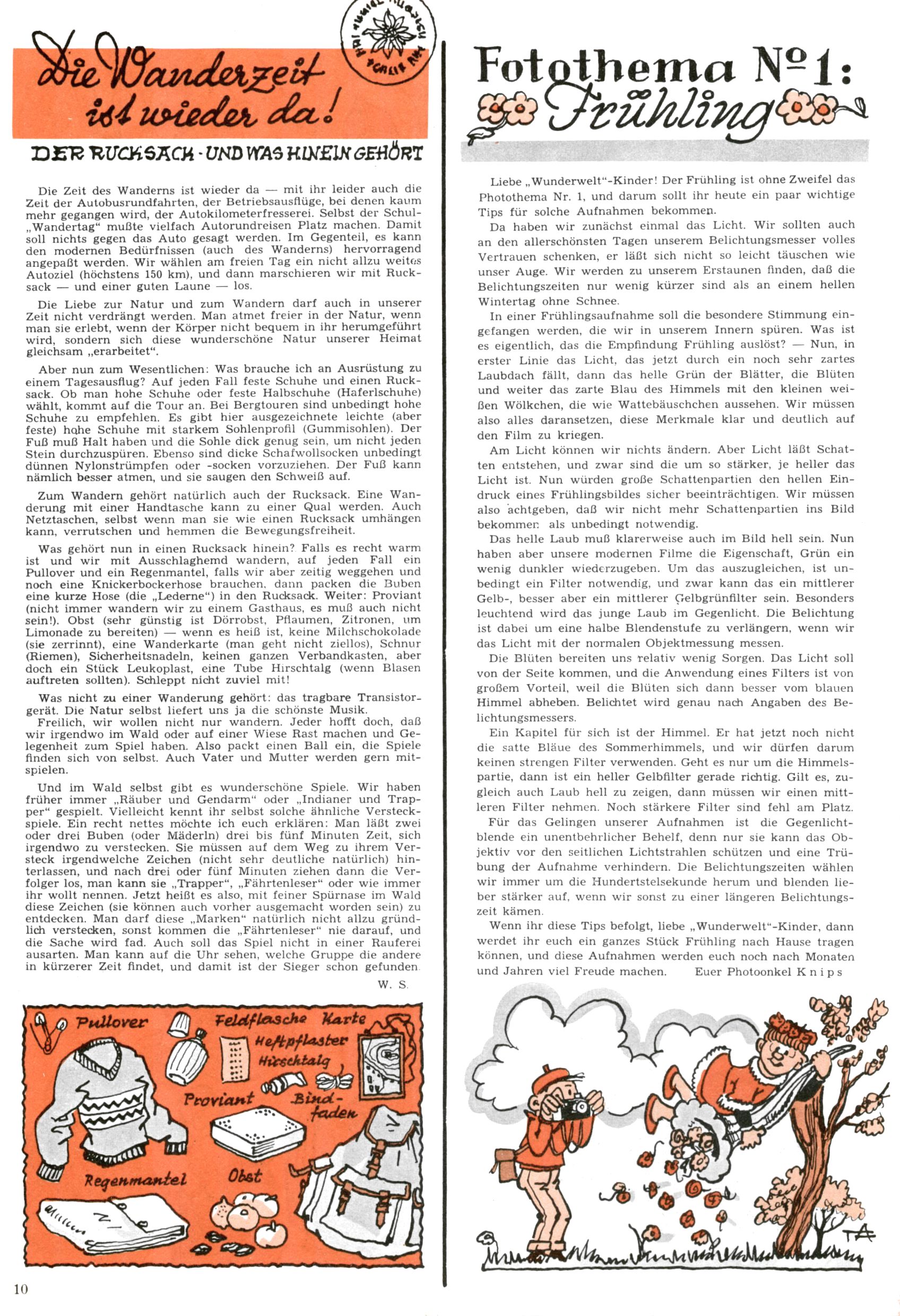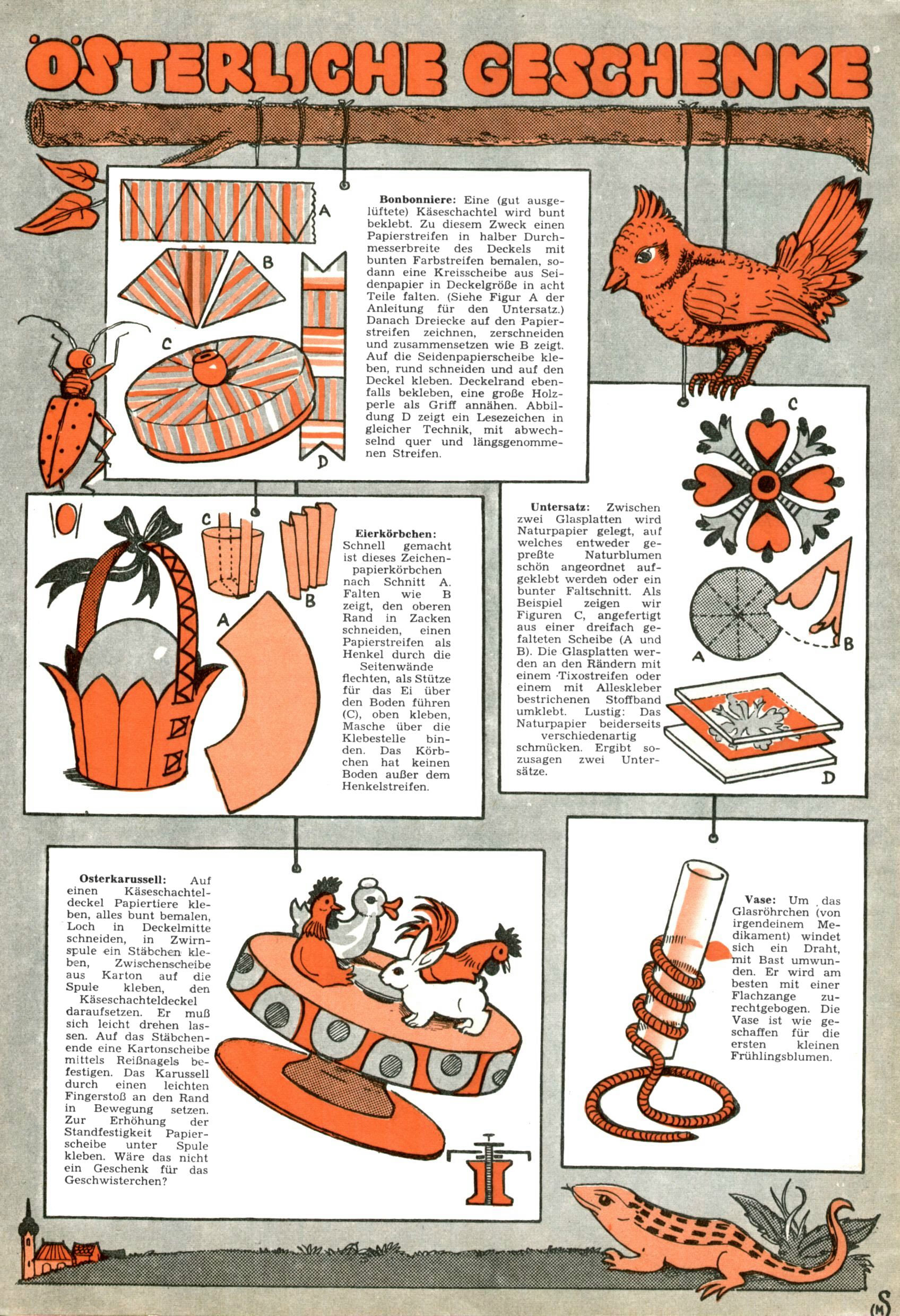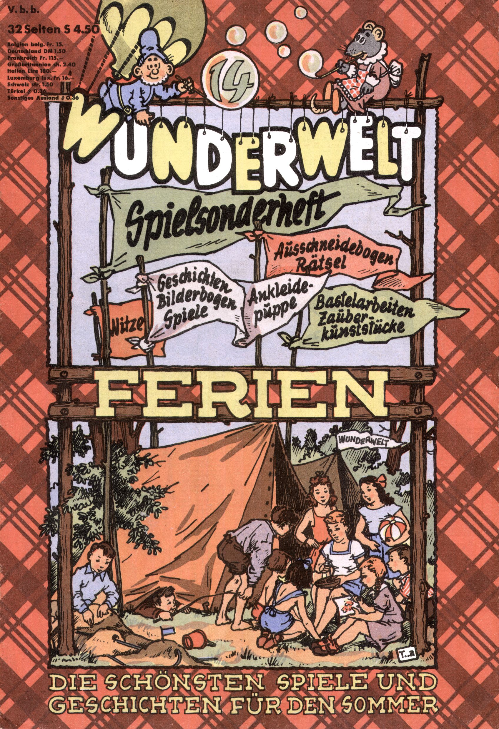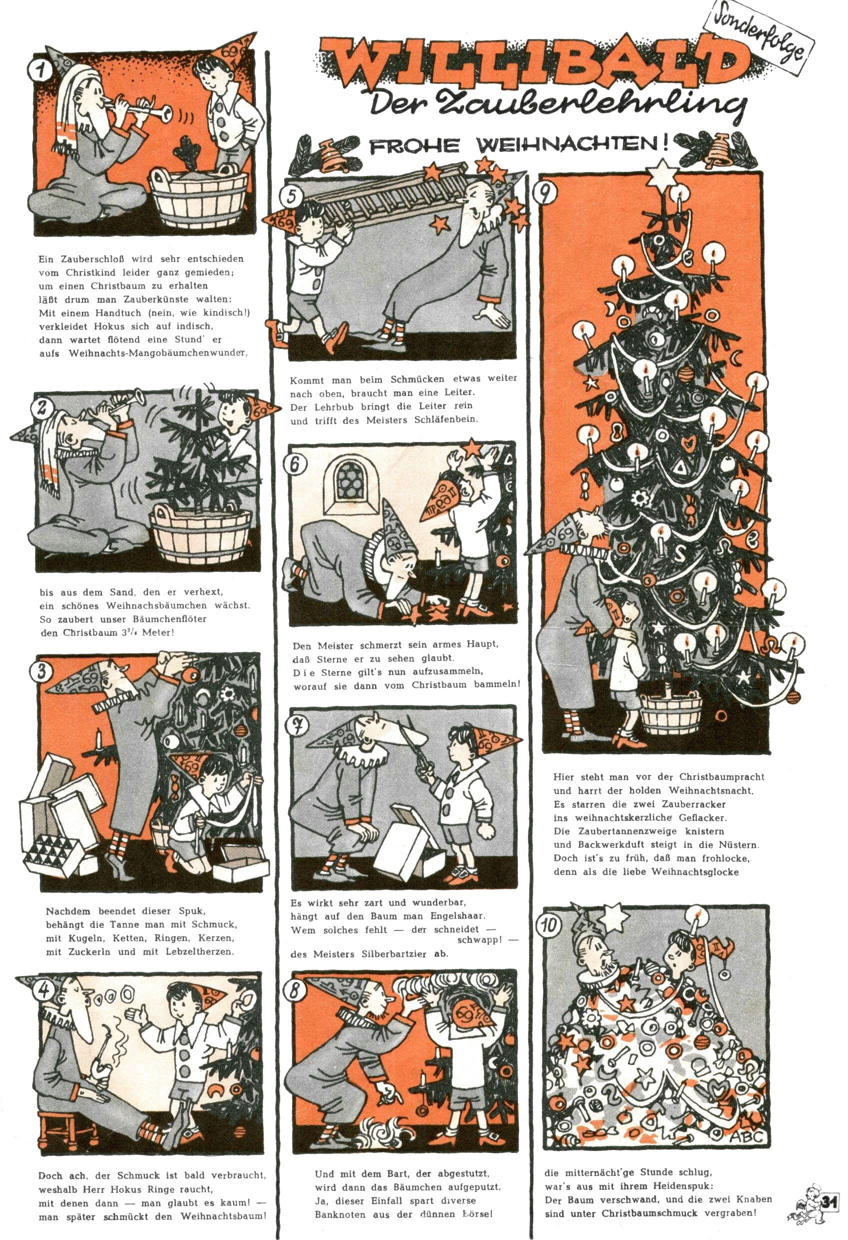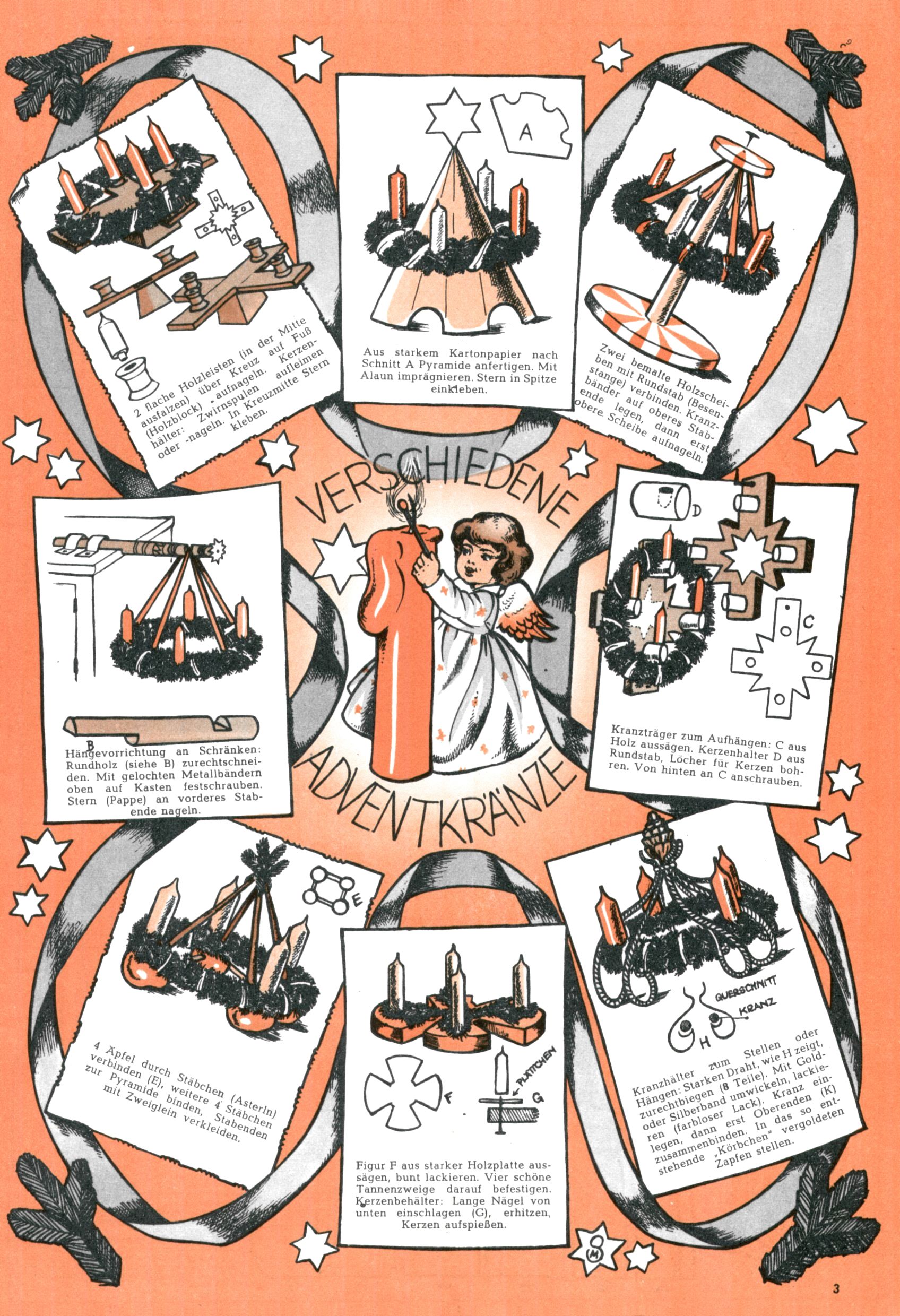 Die Wunderwelt im Festtagsgewand In den Sonderheften präsentierte sich die Wunderwelt wahrhaftig in Feiertagsstimmung. Mit wenigen Ausnahmen gab es pro Jahr drei Sonderhefte - zu Weihnachten bzw. im Advent, zu Ostern und in den Ferien im Sommer. Experimente mit Faschings- und Muttertagsheften hatten sich nicht bewährt. Selbst als es die Einzelhefte in der Krisensituation nach 1967 nicht mehr gab, wurde die Wunderwelt-Zeitung im Layout der Sonderhefte fortgesetzt: Zunächst mit 3 bis 5 und ab 1971 immerhin wieder mit 10-12 Heften pro Jahr. Die Weihnachts-, Oster- und Ferienhefte hatten naturgemäß verschiedene Schwerpunkte. Während im Sommer Spielen und Werken mit Material im Vordergrund stand, waren es zu Weihnachten Krippen und Adventhäuser; zu Ostern dann Erzählungen, Hasenstädte und Oster-Basteleien. Das bessere Papier der Sonderhefte erleichterte das Ausschneiden der insgesamt mehr als 1000 Papiermodelle erheblich. Die Sonderhefte waren vergleichsweise aufwändig gestaltet, aber auch ein wichtiges Zusatzgeschäft für die Zeitung. Die Kinder fieberten dem Erscheinungsdatum der jeweiligen Ausgabe nicht selten richtiggehend entgegen. Mit knapp 100 Seiten pro Jahr machten die Sonderhefte von der Menge her zwar nicht einmal ein Viertel aus, trugen aber zum Erscheinungsbild mindestens genauso viel bei wie die Standardhefte. Im Wesentlichen blieb das Layout der Sonderhefte über die Jahre hin unverändert. Mühselig wurde es, als man den Inhalt der Beiträge vorübergehend auf die Seiten gleichmäßig verteilte und die Kinder ermunterte, die Hefte in der Mitte zu zerschneiden. Die eine Hälfte enthielt dann etwa Erzählungen und Bastelvorschläge, der andere Teil der Zeitung Spielanleitungen. Zur übersichtlichkeit trugen diese Layoutversuche jedenfalls in keiner Weise bei und als besonderen Auswuchs gab es eine Zeitlang auf einer Seite oft mehrere Seitennummern, je nachdem, ob sich diese auf das Gesamtheft oder den herauszunehmenden und zu zerschneidenden Heftteil bezogen. Gegen Ende der 1950er Jahre kehrte man wieder zu einem ganzseitigen Layout zurück und Ideen wie ein Spiel-(Heft-im-)Heft gehörten der Vergangenheit an. In den Sonderheften experimentierte man dann noch ab Mitte der 1960er Jahre, als die Verkaufszahlen stark rückläufig waren, mit grundsätzlich neuen Darstellungsformen - weg vom Niedlich-Kitschigen und engagierte neue Grafikerinnen wie Gundi Groh und Hella Soyka. Den erhofften Erfolg brachte dies jedoch nicht mehr. |