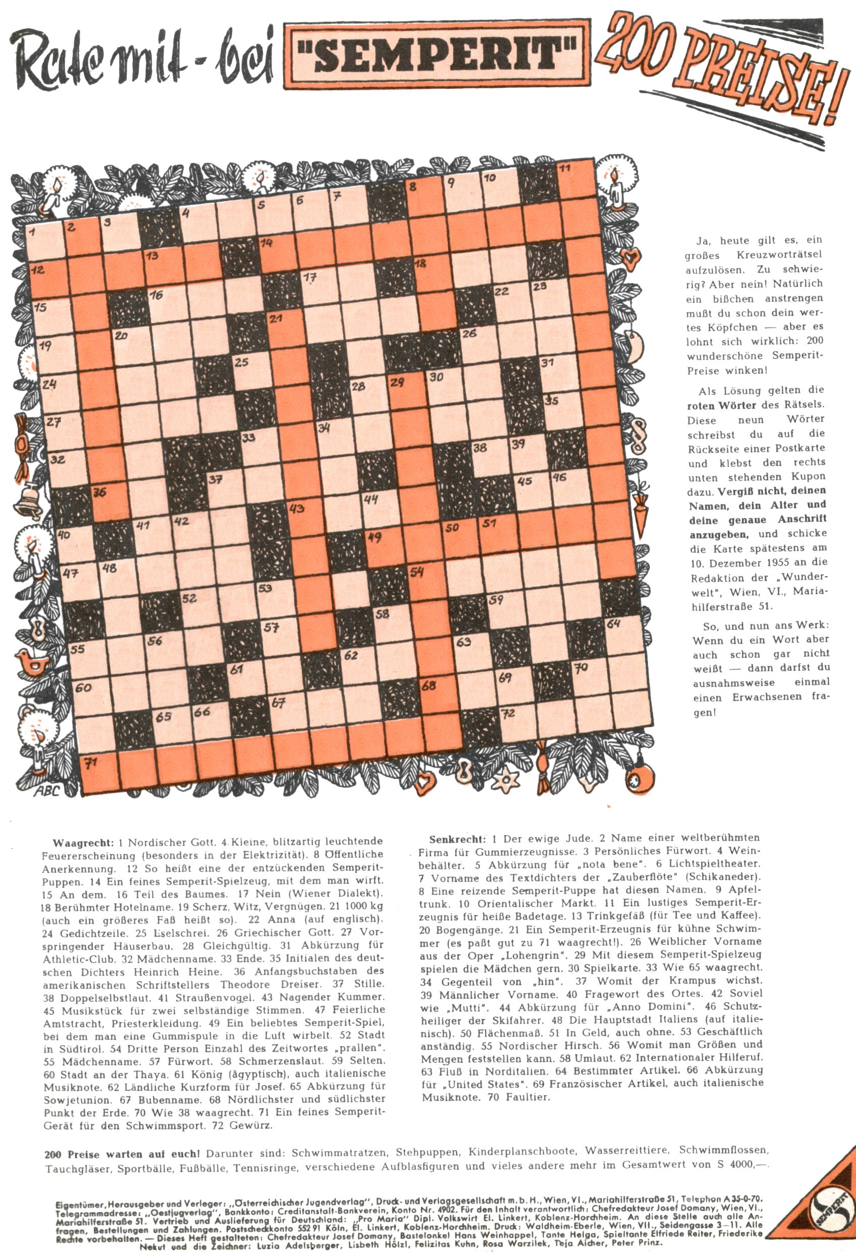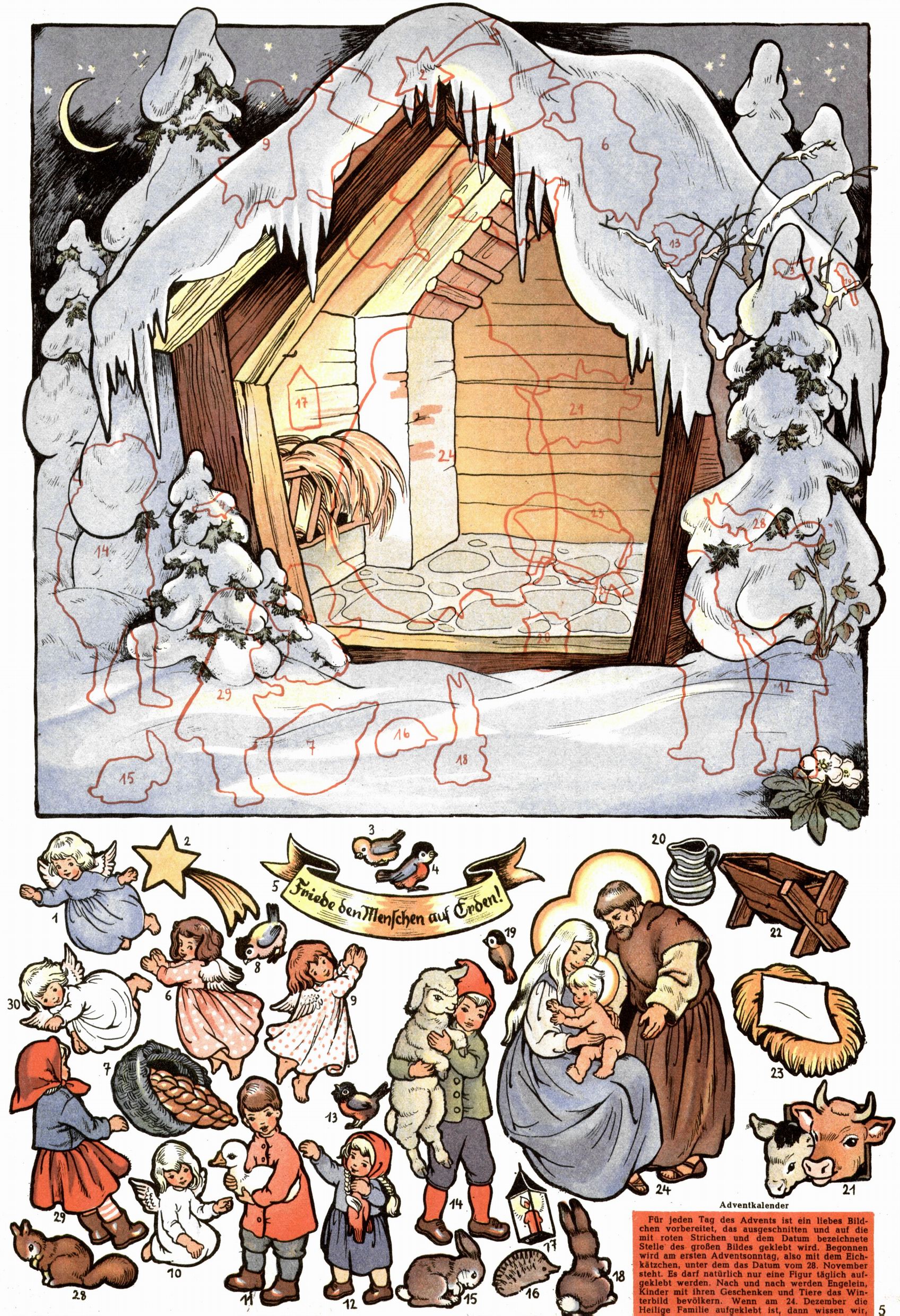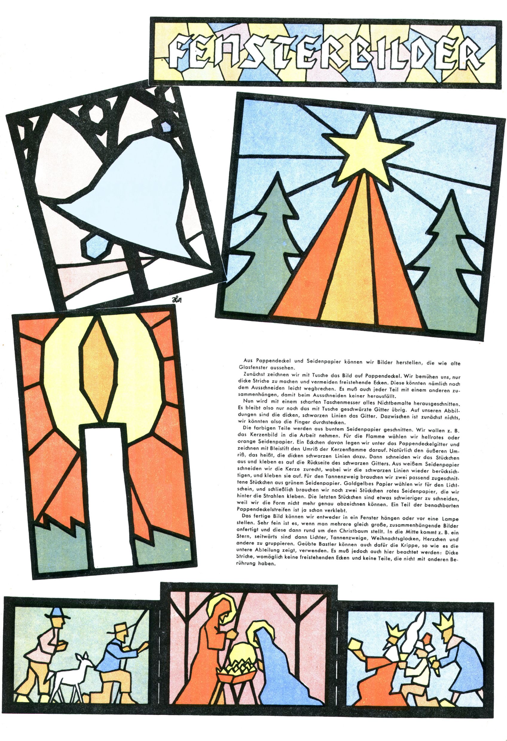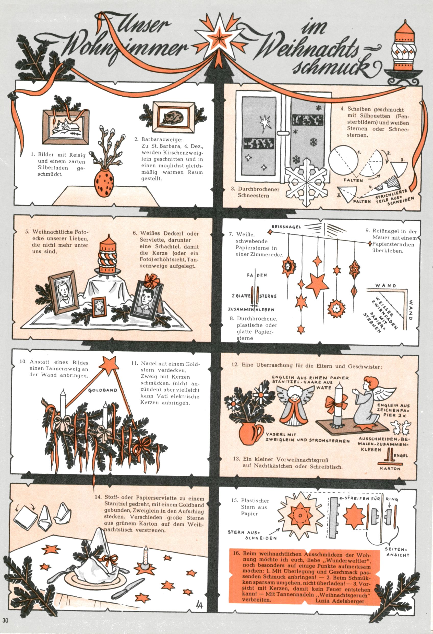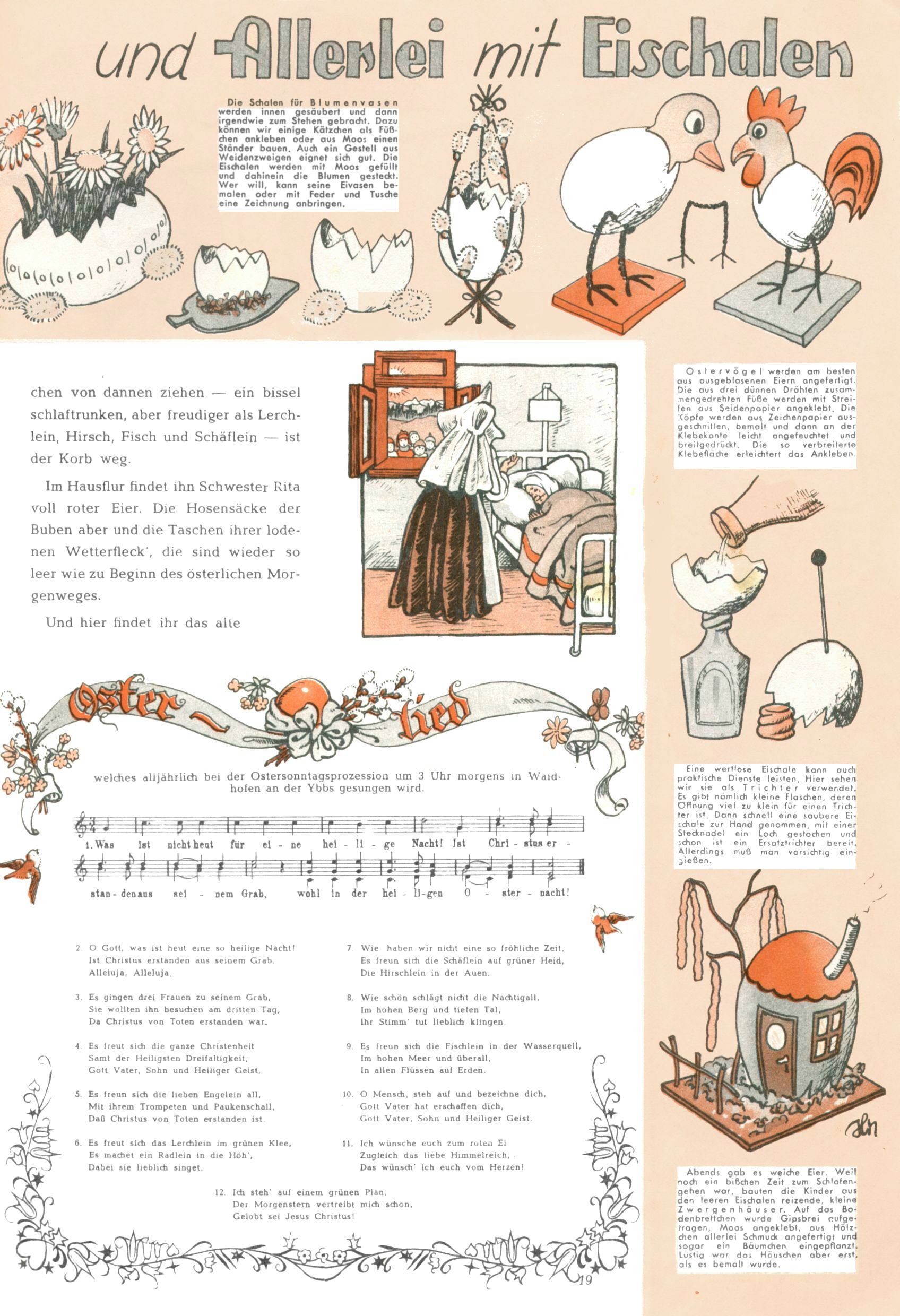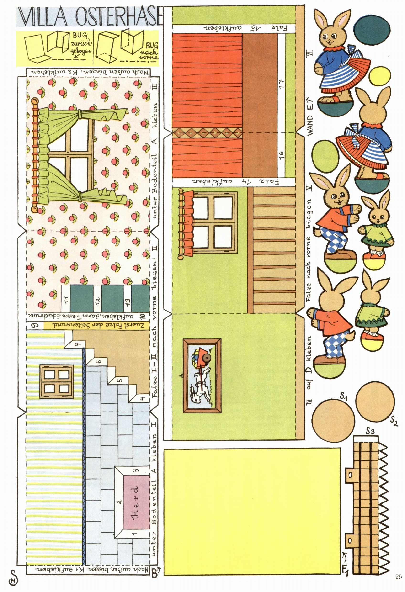 Die Wunderwelt im Festtagsgewand In den Sonderheften präsentierte sich die Wunderwelt wahrhaftig in Feiertagsstimmung. Mit wenigen Ausnahmen gab es pro Jahr drei Sonderhefte - zu Weihnachten bzw. im Advent, zu Ostern und in den Ferien im Sommer. Experimente mit Faschings- und Muttertagsheften hatten sich nicht bewährt. Selbst als es die Einzelhefte in der Krisensituation nach 1967 nicht mehr gab, wurde die Wunderwelt-Zeitung im Layout der Sonderhefte fortgesetzt: Zunächst mit 3 bis 5 und ab 1971 immerhin wieder mit 10-12 Heften pro Jahr. Die Weihnachts-, Oster- und Ferienhefte hatten naturgemäß verschiedene Schwerpunkte. Während im Sommer Spielen und Werken mit Material im Vordergrund stand, waren es zu Weihnachten Krippen und Adventhäuser; zu Ostern dann Erzählungen, Hasenstädte und Oster-Basteleien. Das bessere Papier der Sonderhefte erleichterte das Ausschneiden der insgesamt mehr als 1000 Papiermodelle erheblich. Die Sonderhefte waren vergleichsweise aufwändig gestaltet, aber auch ein wichtiges Zusatzgeschäft für die Zeitung. Die Kinder fieberten dem Erscheinungsdatum der jeweiligen Ausgabe nicht selten richtiggehend entgegen. Mit knapp 100 Seiten pro Jahr machten die Sonderhefte von der Menge her zwar nicht einmal ein Viertel aus, trugen aber zum Erscheinungsbild mindestens genauso viel bei wie die Standardhefte. Im Wesentlichen blieb das Layout der Sonderhefte über die Jahre hin unverändert. Mühselig wurde es, als man den Inhalt der Beiträge vorübergehend auf die Seiten gleichmäßig verteilte und die Kinder ermunterte, die Hefte in der Mitte zu zerschneiden. Die eine Hälfte enthielt dann etwa Erzählungen und Bastelvorschläge, der andere Teil der Zeitung Spielanleitungen. Zur übersichtlichkeit trugen diese Layoutversuche jedenfalls in keiner Weise bei und als besonderen Auswuchs gab es eine Zeitlang auf einer Seite oft mehrere Seitennummern, je nachdem, ob sich diese auf das Gesamtheft oder den herauszunehmenden und zu zerschneidenden Heftteil bezogen. Gegen Ende der 1950er Jahre kehrte man wieder zu einem ganzseitigen Layout zurück und Ideen wie ein Spiel-(Heft-im-)Heft gehörten der Vergangenheit an. In den Sonderheften experimentierte man dann noch ab Mitte der 1960er Jahre, als die Verkaufszahlen stark rückläufig waren, mit grundsätzlich neuen Darstellungsformen - weg vom Niedlich-Kitschigen und engagierte neue Grafikerinnen wie Gundi Groh und Hella Soyka. Den erhofften Erfolg brachte dies jedoch nicht mehr. |