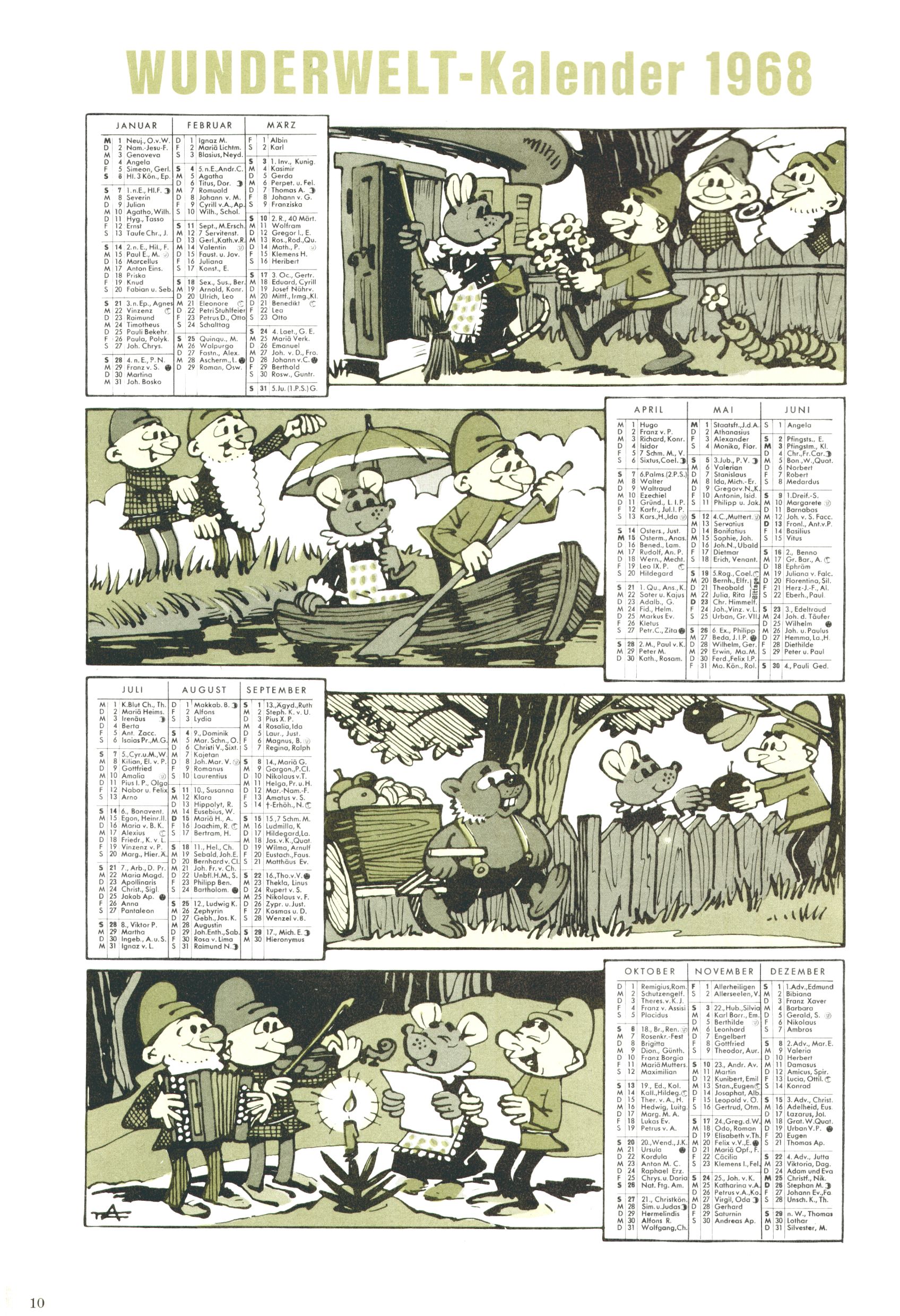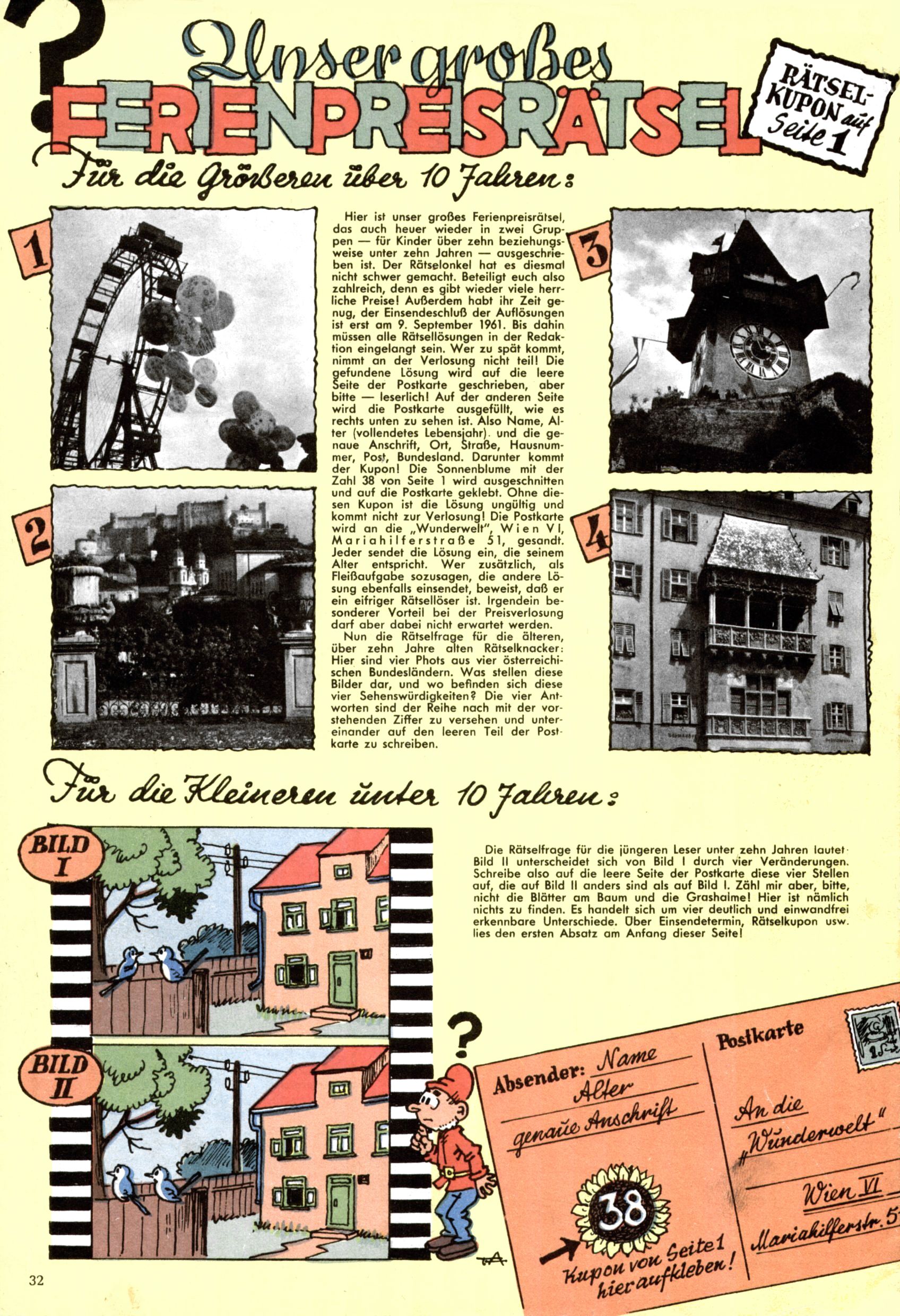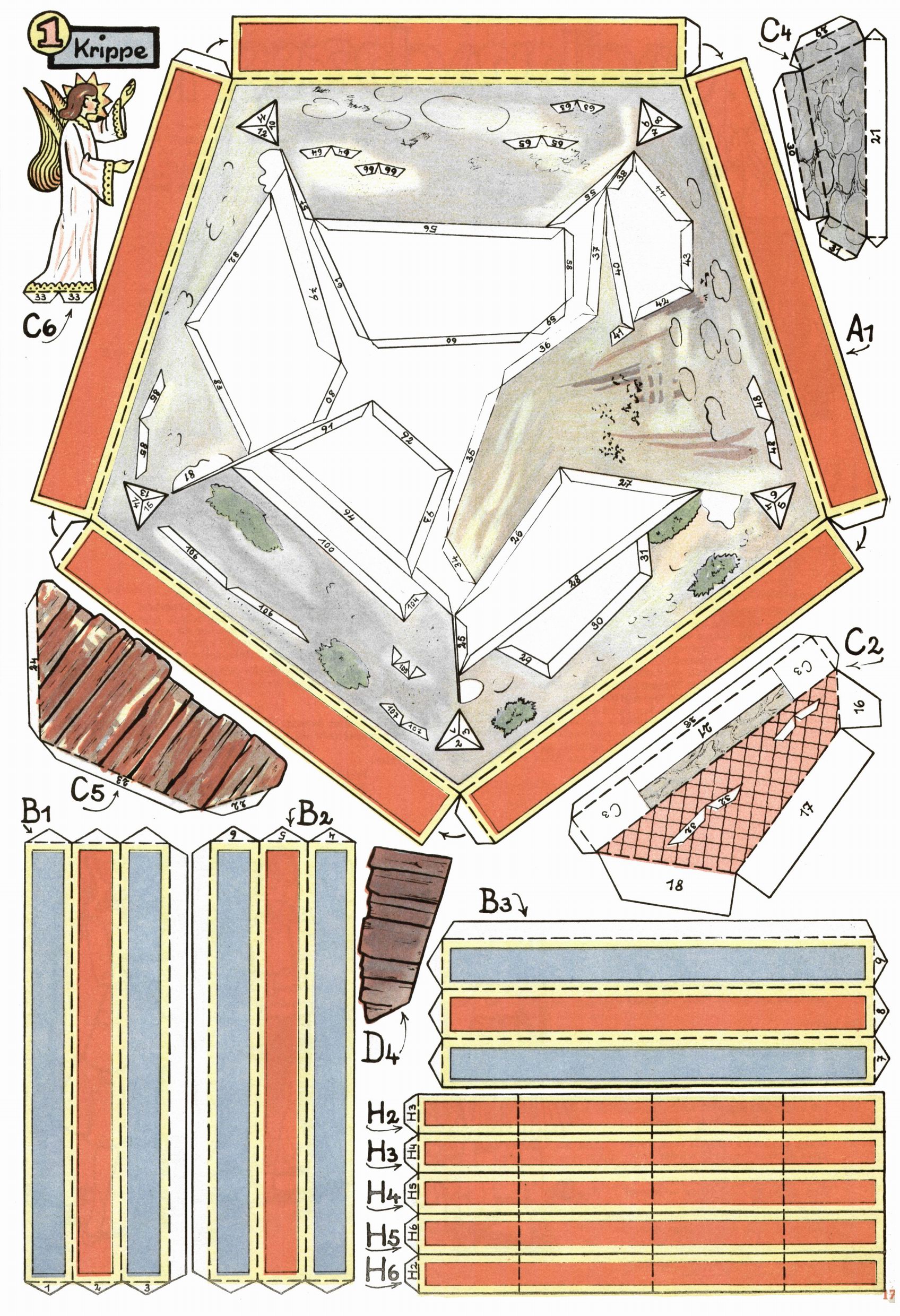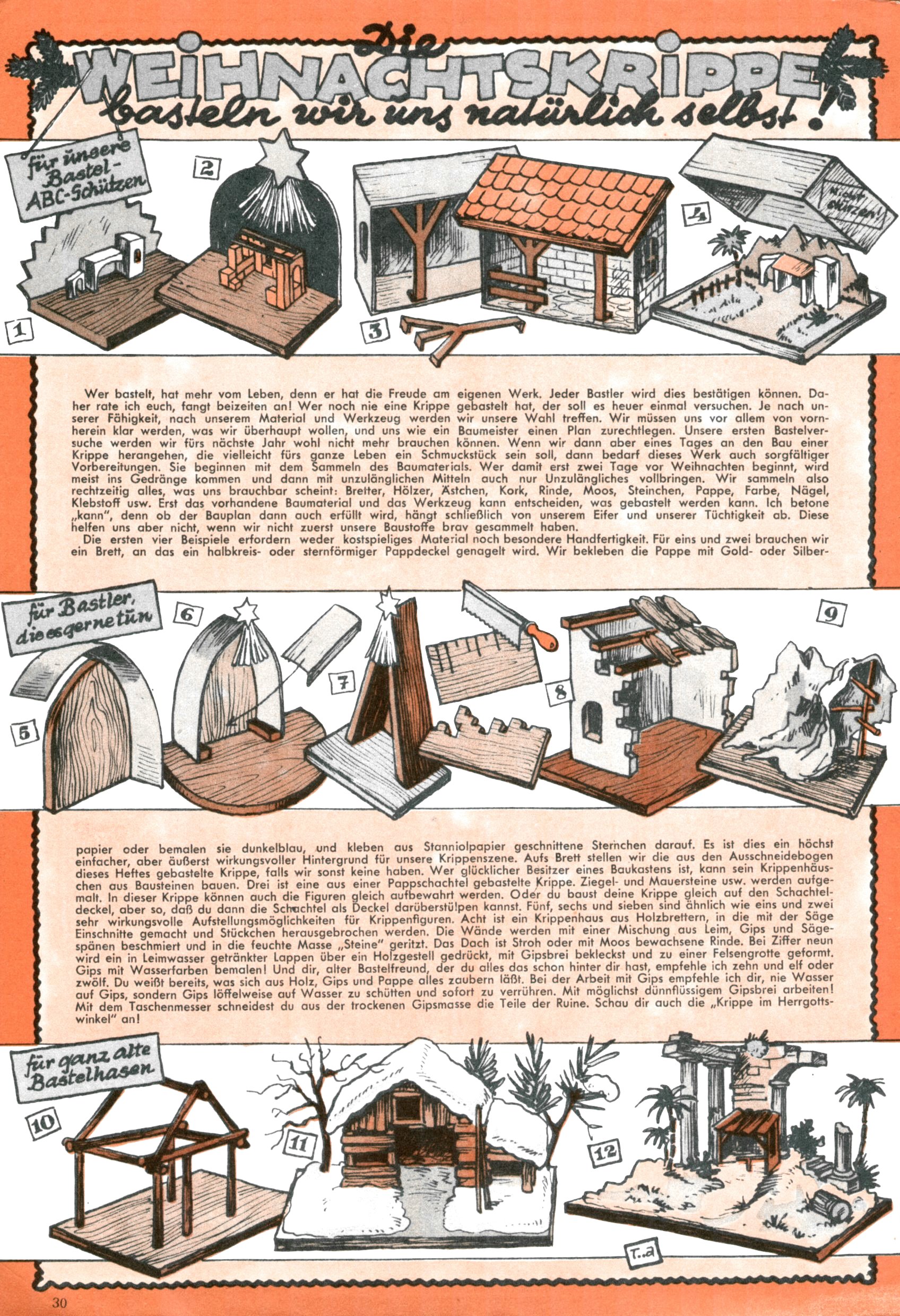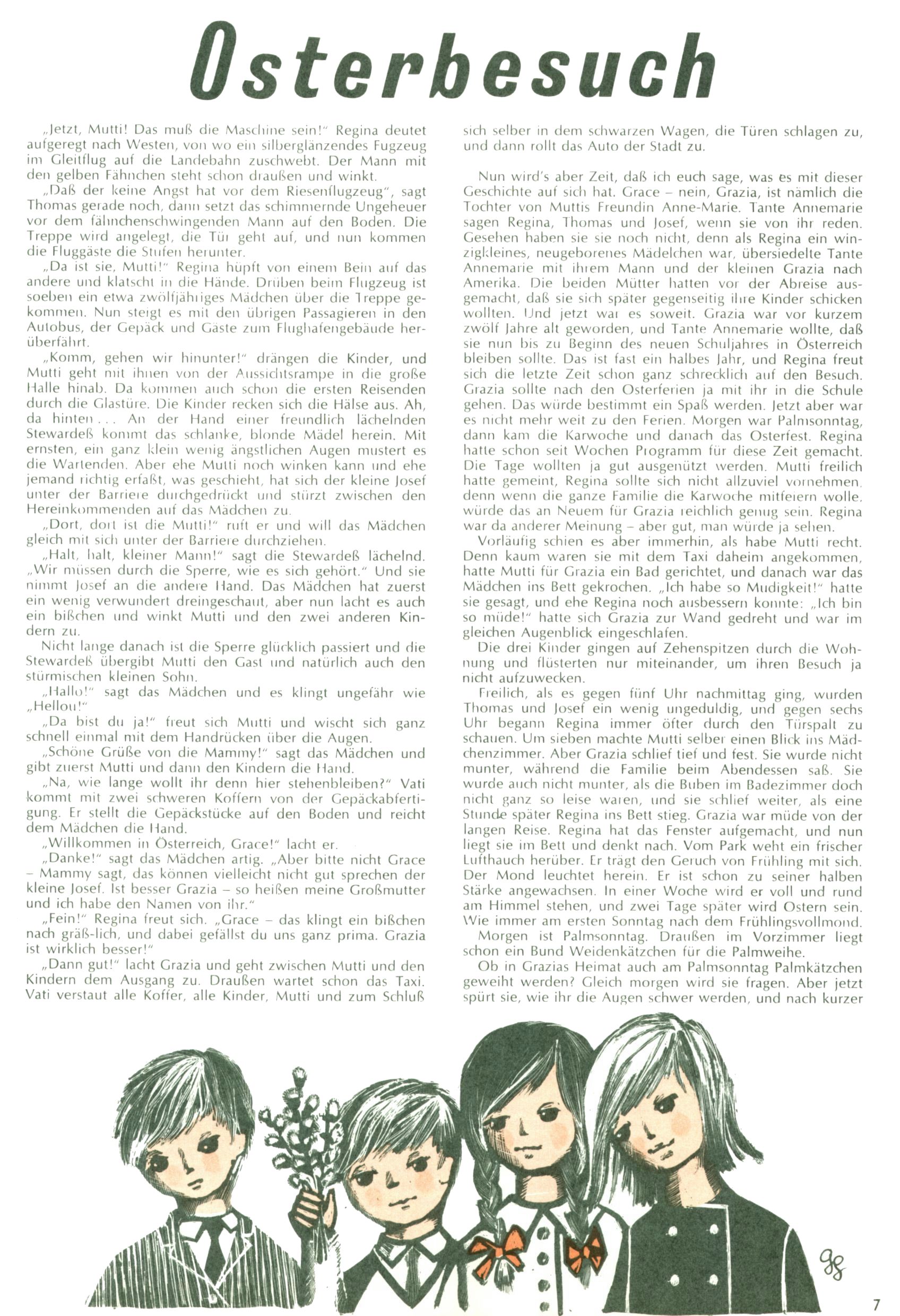 Die Wunderwelt im Festtagsgewand In den Sonderheften präsentierte sich die Wunderwelt wahrhaftig in Feiertagsstimmung. Mit wenigen Ausnahmen gab es pro Jahr drei Sonderhefte - zu Weihnachten bzw. im Advent, zu Ostern und in den Ferien im Sommer. Experimente mit Faschings- und Muttertagsheften hatten sich nicht bewährt. Selbst als es die Einzelhefte in der Krisensituation nach 1967 nicht mehr gab, wurde die Wunderwelt-Zeitung im Layout der Sonderhefte fortgesetzt: Zunächst mit 3 bis 5 und ab 1971 immerhin wieder mit 10-12 Heften pro Jahr. Die Weihnachts-, Oster- und Ferienhefte hatten naturgemäß verschiedene Schwerpunkte. Während im Sommer Spielen und Werken mit Material im Vordergrund stand, waren es zu Weihnachten Krippen und Adventhäuser; zu Ostern dann Erzählungen, Hasenstädte und Oster-Basteleien. Das bessere Papier der Sonderhefte erleichterte das Ausschneiden der insgesamt mehr als 1000 Papiermodelle erheblich. Die Sonderhefte waren vergleichsweise aufwändig gestaltet, aber auch ein wichtiges Zusatzgeschäft für die Zeitung. Die Kinder fieberten dem Erscheinungsdatum der jeweiligen Ausgabe nicht selten richtiggehend entgegen. Mit knapp 100 Seiten pro Jahr machten die Sonderhefte von der Menge her zwar nicht einmal ein Viertel aus, trugen aber zum Erscheinungsbild mindestens genauso viel bei wie die Standardhefte. Im Wesentlichen blieb das Layout der Sonderhefte über die Jahre hin unverändert. Mühselig wurde es, als man den Inhalt der Beiträge vorübergehend auf die Seiten gleichmäßig verteilte und die Kinder ermunterte, die Hefte in der Mitte zu zerschneiden. Die eine Hälfte enthielt dann etwa Erzählungen und Bastelvorschläge, der andere Teil der Zeitung Spielanleitungen. Zur übersichtlichkeit trugen diese Layoutversuche jedenfalls in keiner Weise bei und als besonderen Auswuchs gab es eine Zeitlang auf einer Seite oft mehrere Seitennummern, je nachdem, ob sich diese auf das Gesamtheft oder den herauszunehmenden und zu zerschneidenden Heftteil bezogen. Gegen Ende der 1950er Jahre kehrte man wieder zu einem ganzseitigen Layout zurück und Ideen wie ein Spiel-(Heft-im-)Heft gehörten der Vergangenheit an. In den Sonderheften experimentierte man dann noch ab Mitte der 1960er Jahre, als die Verkaufszahlen stark rückläufig waren, mit grundsätzlich neuen Darstellungsformen - weg vom Niedlich-Kitschigen und engagierte neue Grafikerinnen wie Gundi Groh und Hella Soyka. Den erhofften Erfolg brachte dies jedoch nicht mehr. |