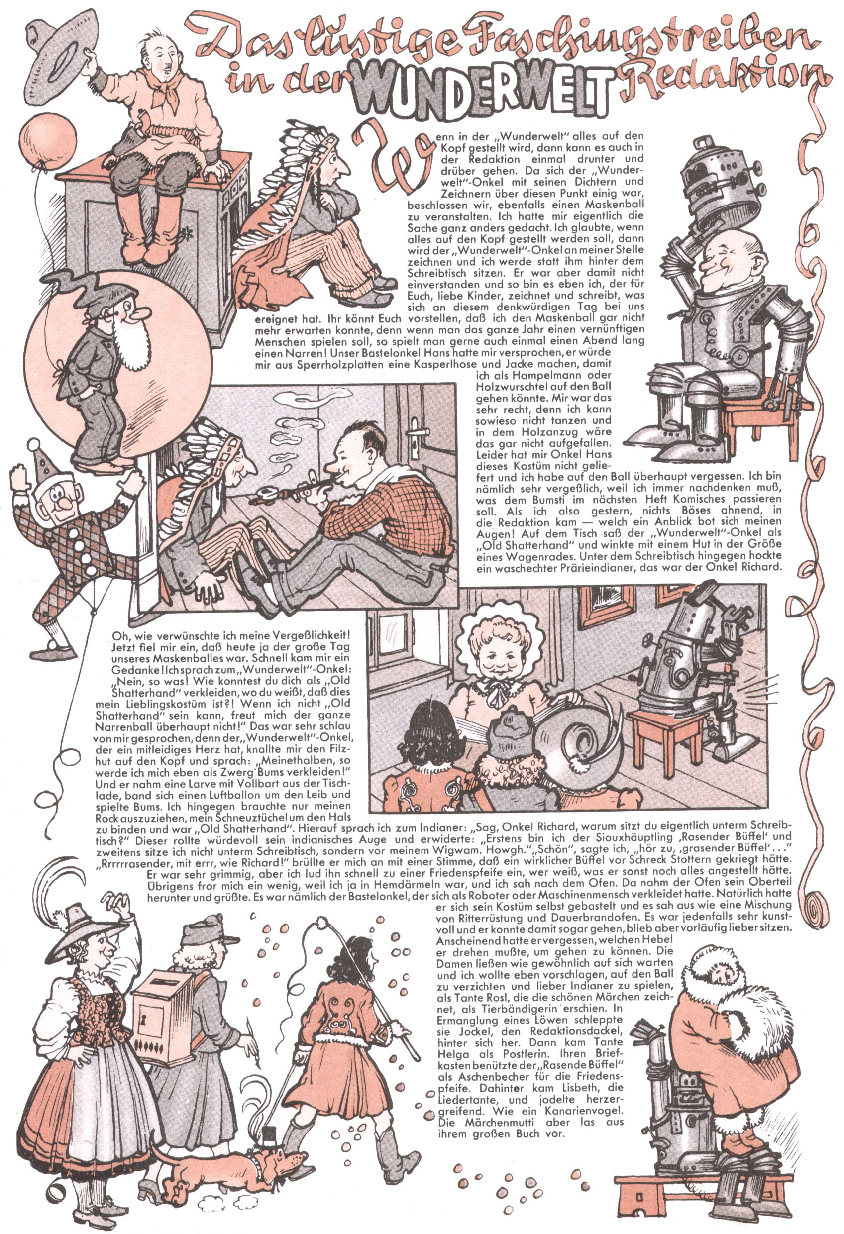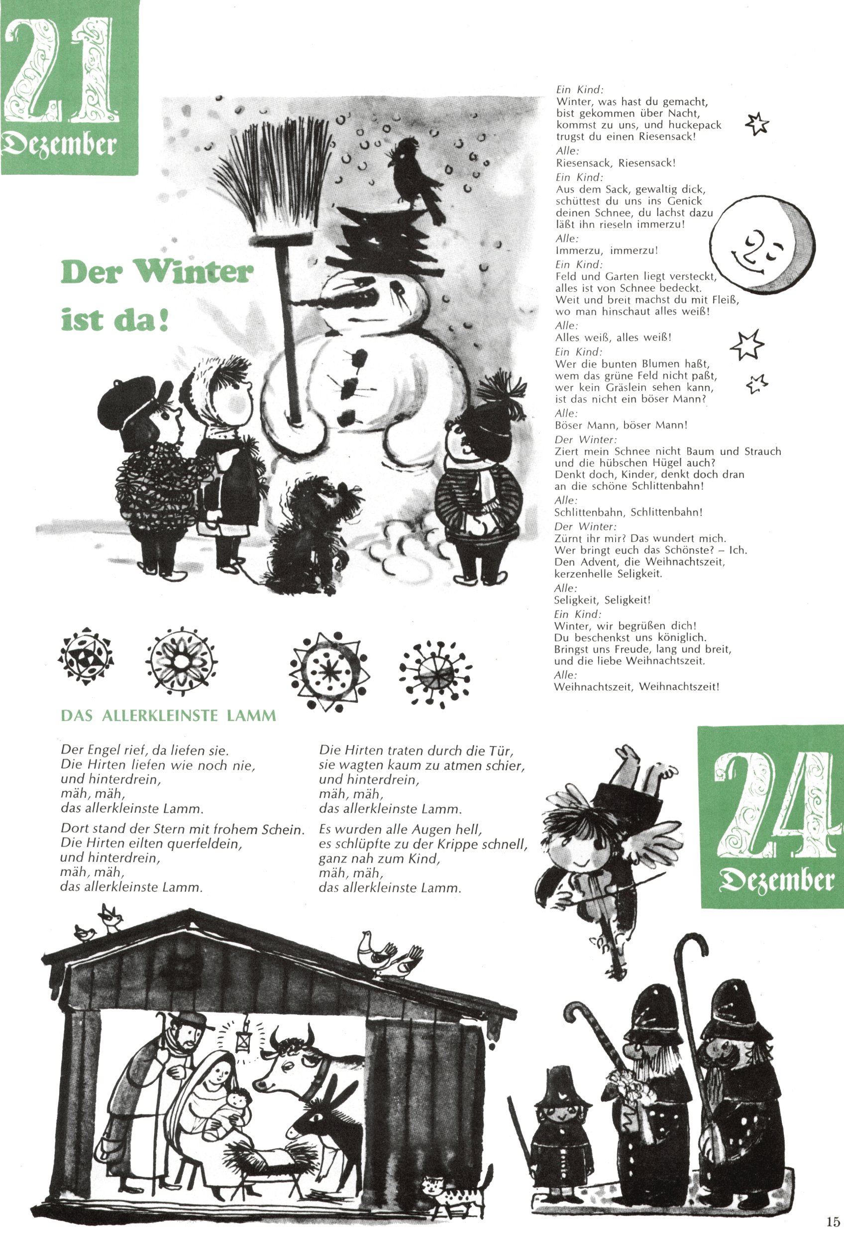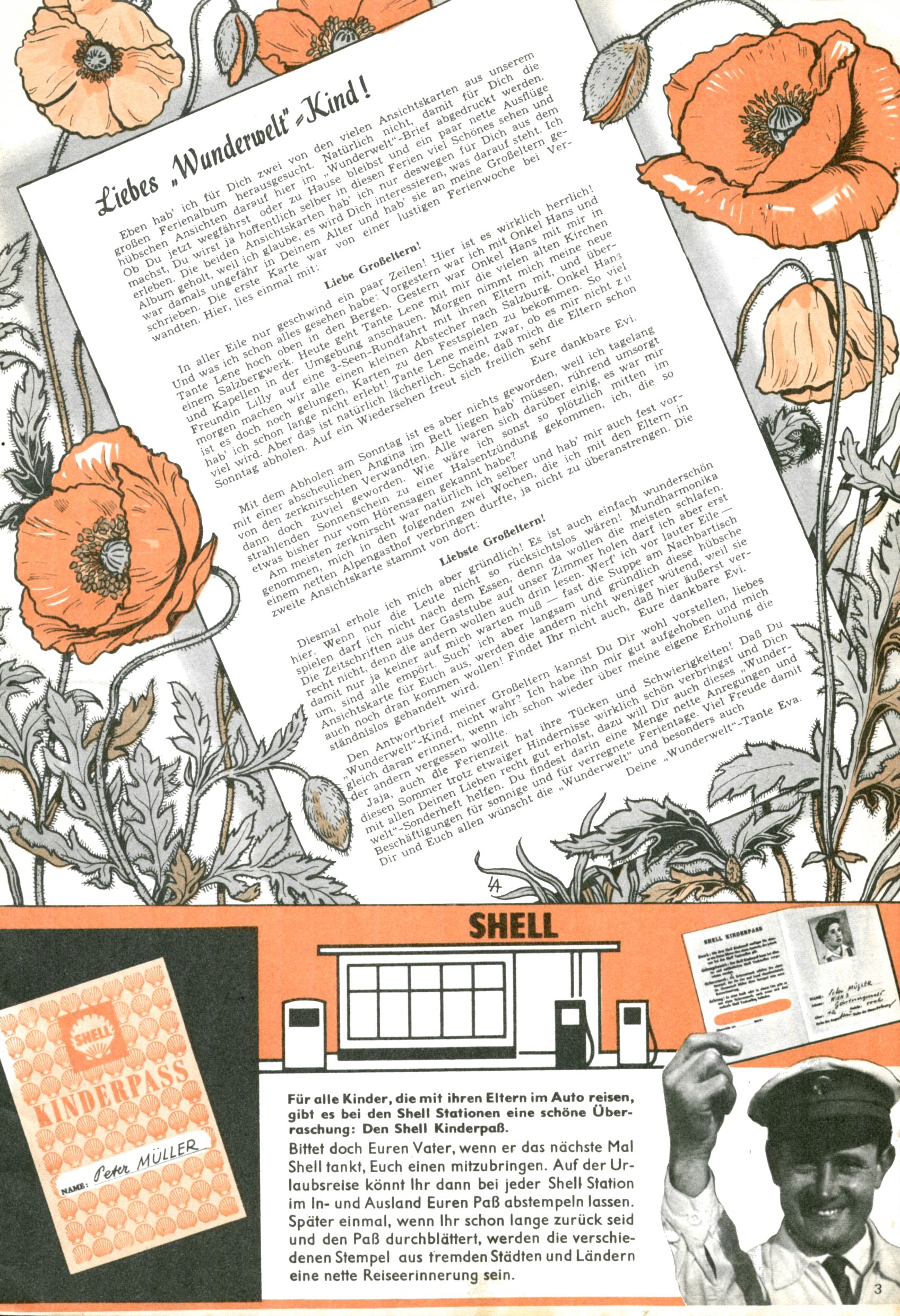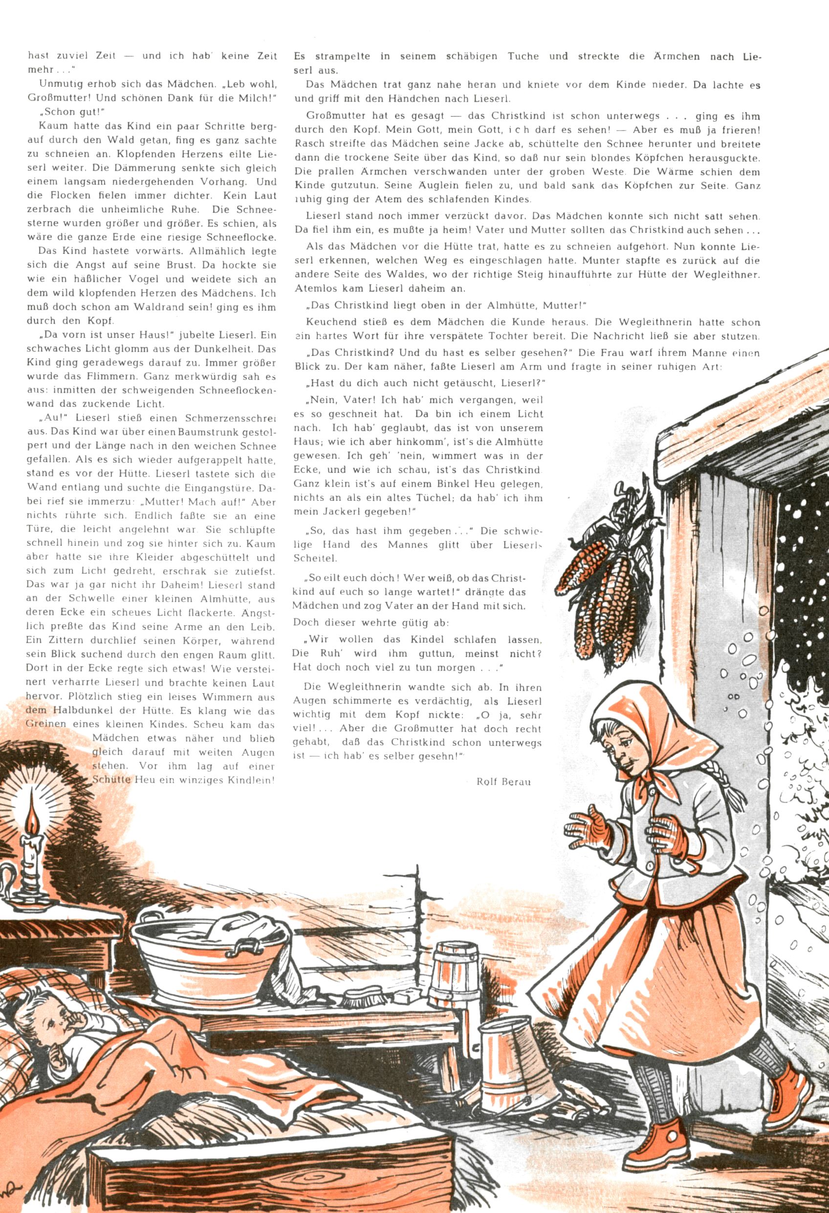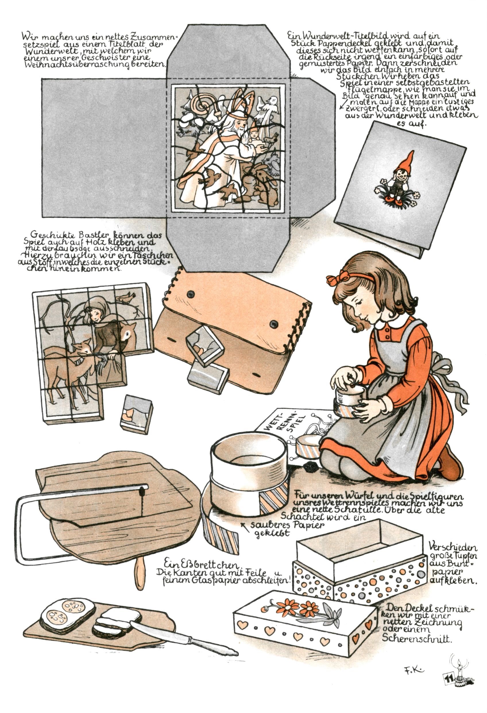 Die Wunderwelt im Festtagsgewand In den Sonderheften präsentierte sich die Wunderwelt wahrhaftig in Feiertagsstimmung. Mit wenigen Ausnahmen gab es pro Jahr drei Sonderhefte - zu Weihnachten bzw. im Advent, zu Ostern und in den Ferien im Sommer. Experimente mit Faschings- und Muttertagsheften hatten sich nicht bewährt. Selbst als es die Einzelhefte in der Krisensituation nach 1967 nicht mehr gab, wurde die Wunderwelt-Zeitung im Layout der Sonderhefte fortgesetzt: Zunächst mit 3 bis 5 und ab 1971 immerhin wieder mit 10-12 Heften pro Jahr. Die Weihnachts-, Oster- und Ferienhefte hatten naturgemäß verschiedene Schwerpunkte. Während im Sommer Spielen und Werken mit Material im Vordergrund stand, waren es zu Weihnachten Krippen und Adventhäuser; zu Ostern dann Erzählungen, Hasenstädte und Oster-Basteleien. Das bessere Papier der Sonderhefte erleichterte das Ausschneiden der insgesamt mehr als 1000 Papiermodelle erheblich. Die Sonderhefte waren vergleichsweise aufwändig gestaltet, aber auch ein wichtiges Zusatzgeschäft für die Zeitung. Die Kinder fieberten dem Erscheinungsdatum der jeweiligen Ausgabe nicht selten richtiggehend entgegen. Mit knapp 100 Seiten pro Jahr machten die Sonderhefte von der Menge her zwar nicht einmal ein Viertel aus, trugen aber zum Erscheinungsbild mindestens genauso viel bei wie die Standardhefte. Im Wesentlichen blieb das Layout der Sonderhefte über die Jahre hin unverändert. Mühselig wurde es, als man den Inhalt der Beiträge vorübergehend auf die Seiten gleichmäßig verteilte und die Kinder ermunterte, die Hefte in der Mitte zu zerschneiden. Die eine Hälfte enthielt dann etwa Erzählungen und Bastelvorschläge, der andere Teil der Zeitung Spielanleitungen. Zur übersichtlichkeit trugen diese Layoutversuche jedenfalls in keiner Weise bei und als besonderen Auswuchs gab es eine Zeitlang auf einer Seite oft mehrere Seitennummern, je nachdem, ob sich diese auf das Gesamtheft oder den herauszunehmenden und zu zerschneidenden Heftteil bezogen. Gegen Ende der 1950er Jahre kehrte man wieder zu einem ganzseitigen Layout zurück und Ideen wie ein Spiel-(Heft-im-)Heft gehörten der Vergangenheit an. In den Sonderheften experimentierte man dann noch ab Mitte der 1960er Jahre, als die Verkaufszahlen stark rückläufig waren, mit grundsätzlich neuen Darstellungsformen - weg vom Niedlich-Kitschigen und engagierte neue Grafikerinnen wie Gundi Groh und Hella Soyka. Den erhofften Erfolg brachte dies jedoch nicht mehr. |