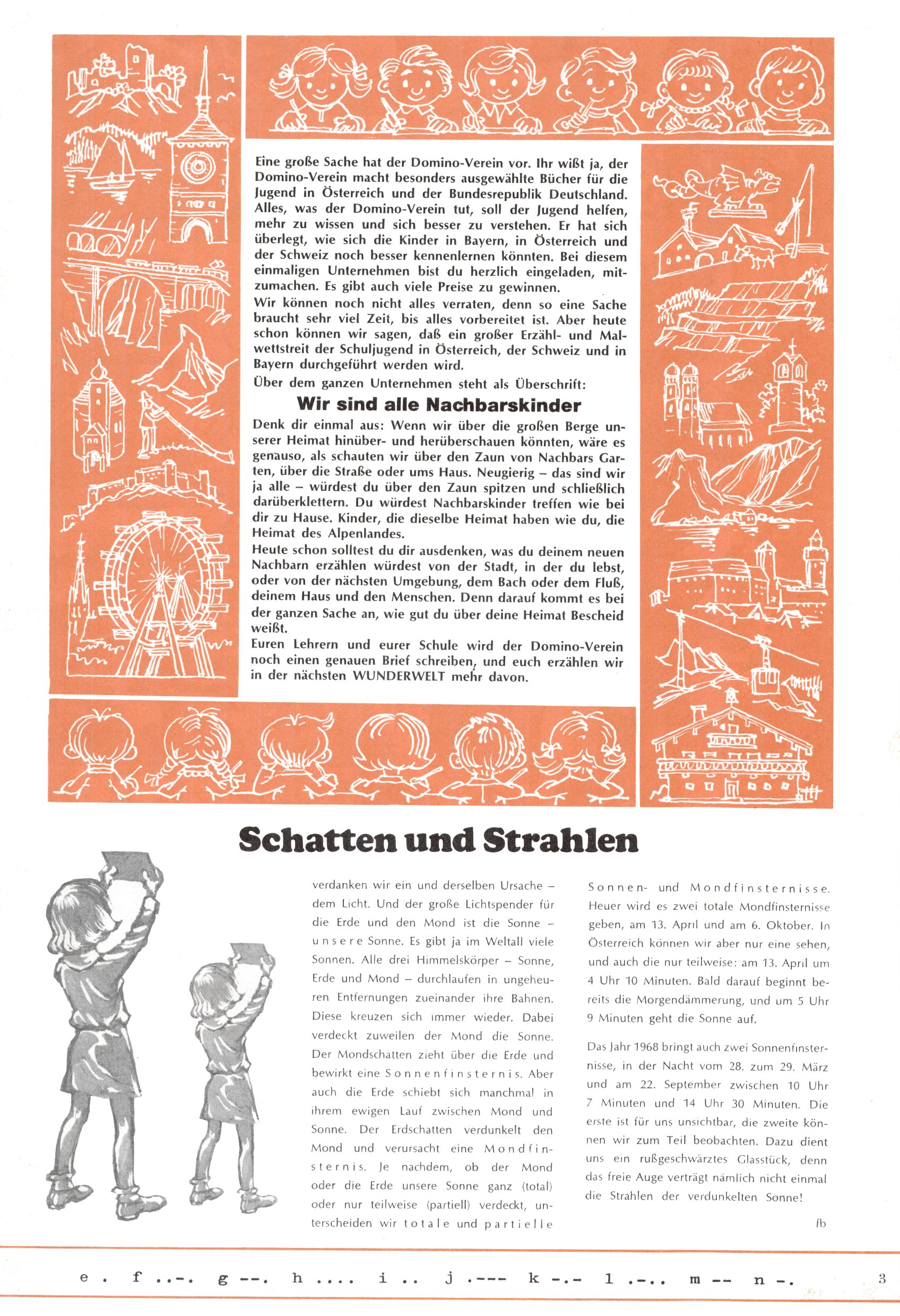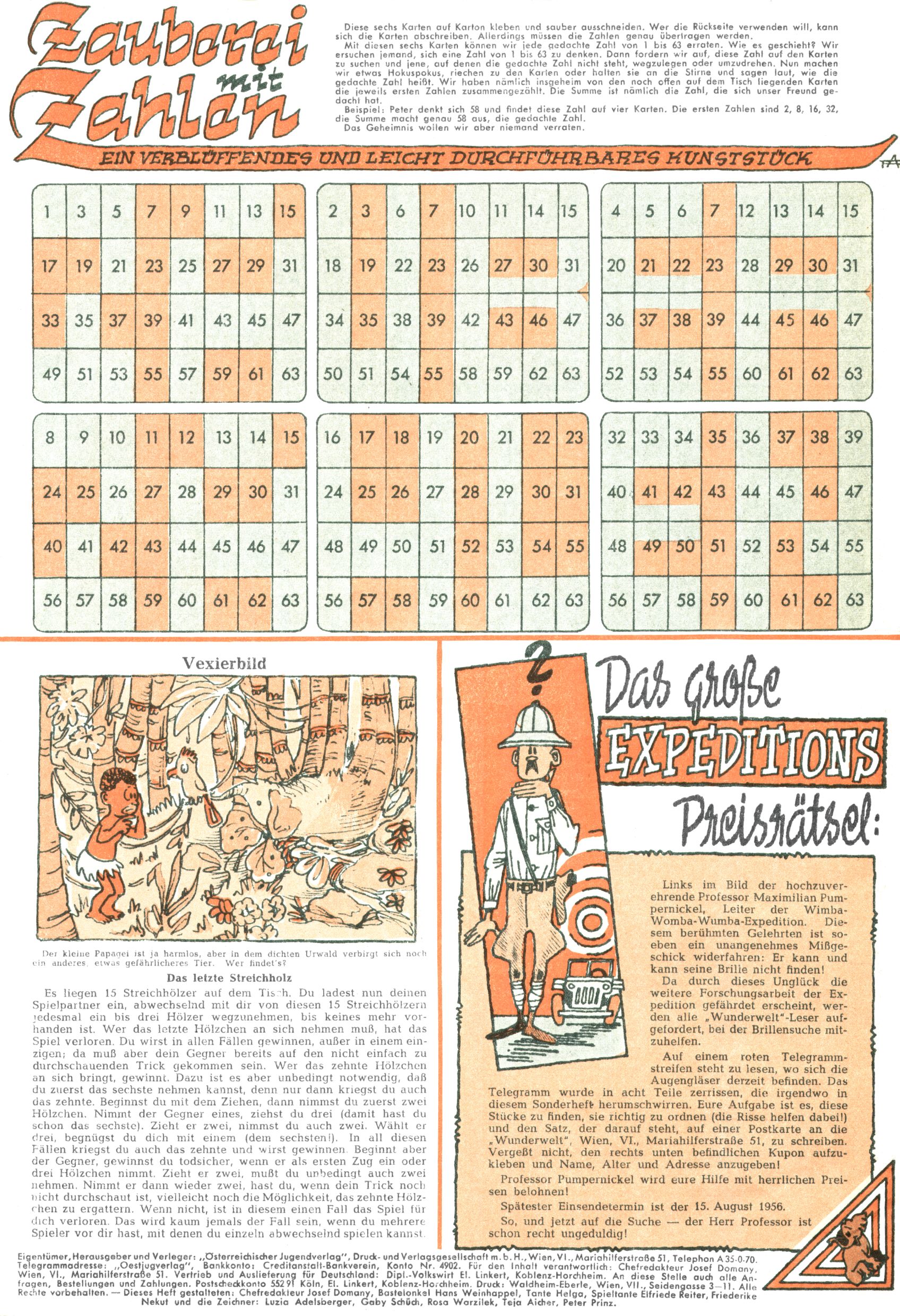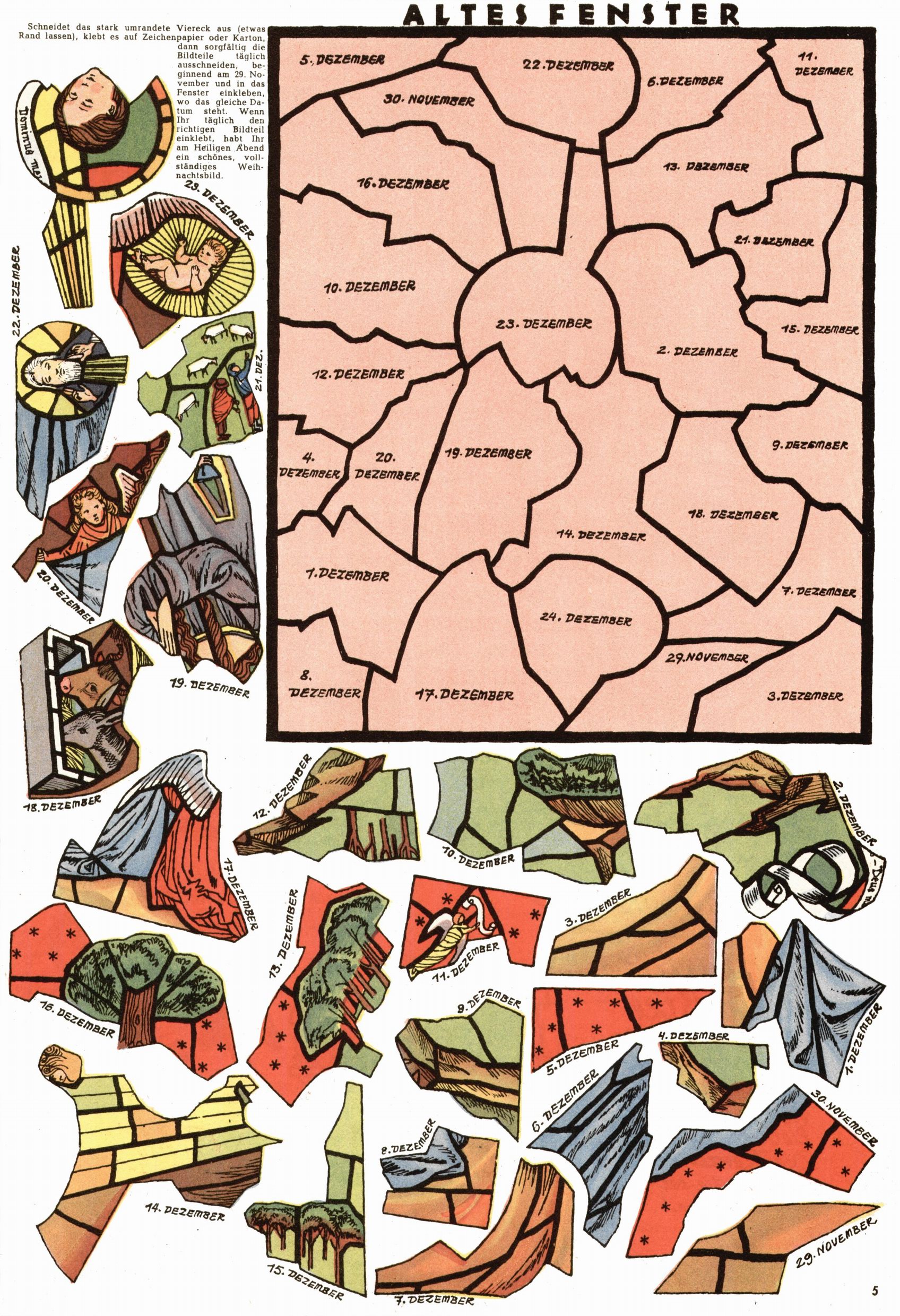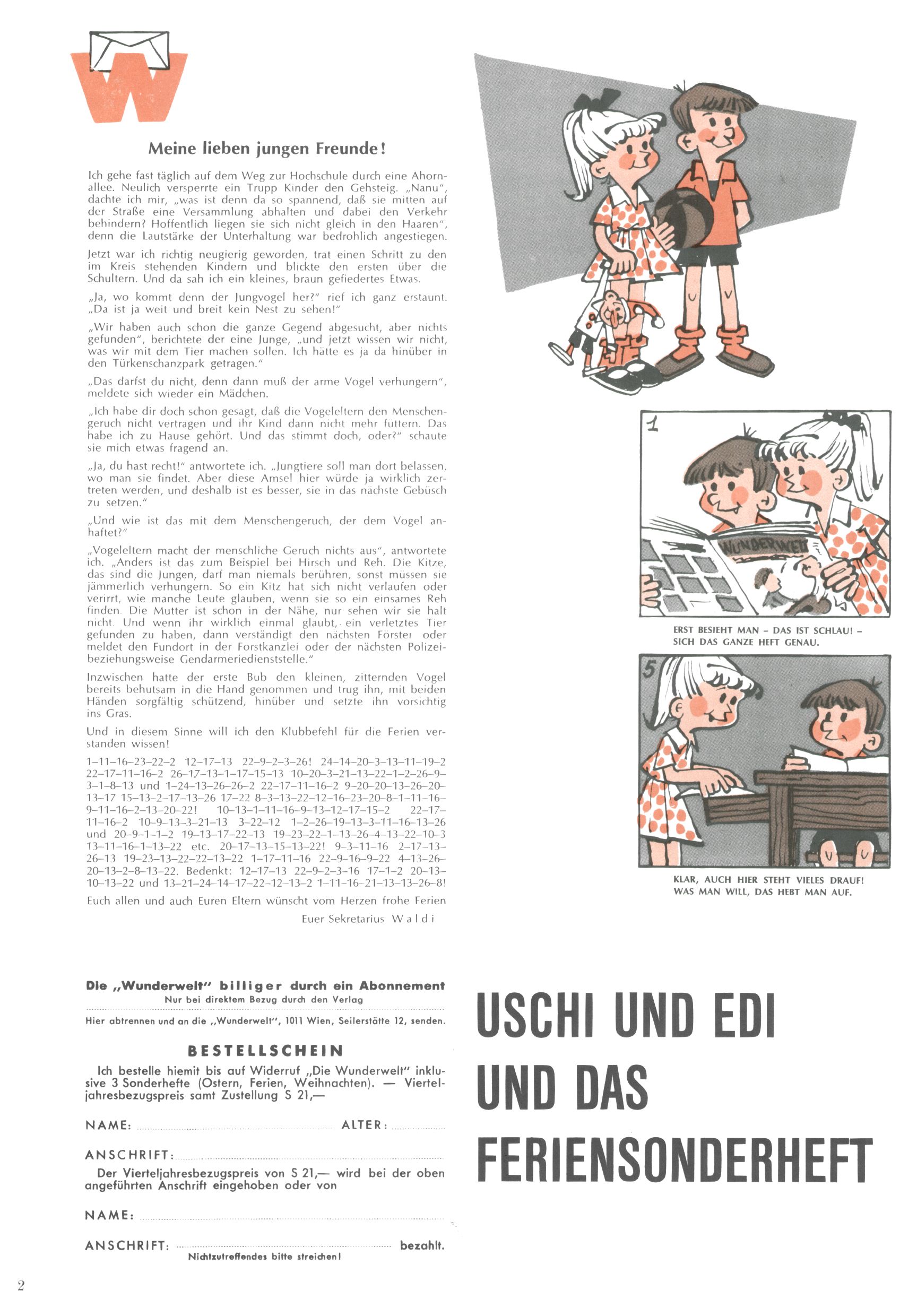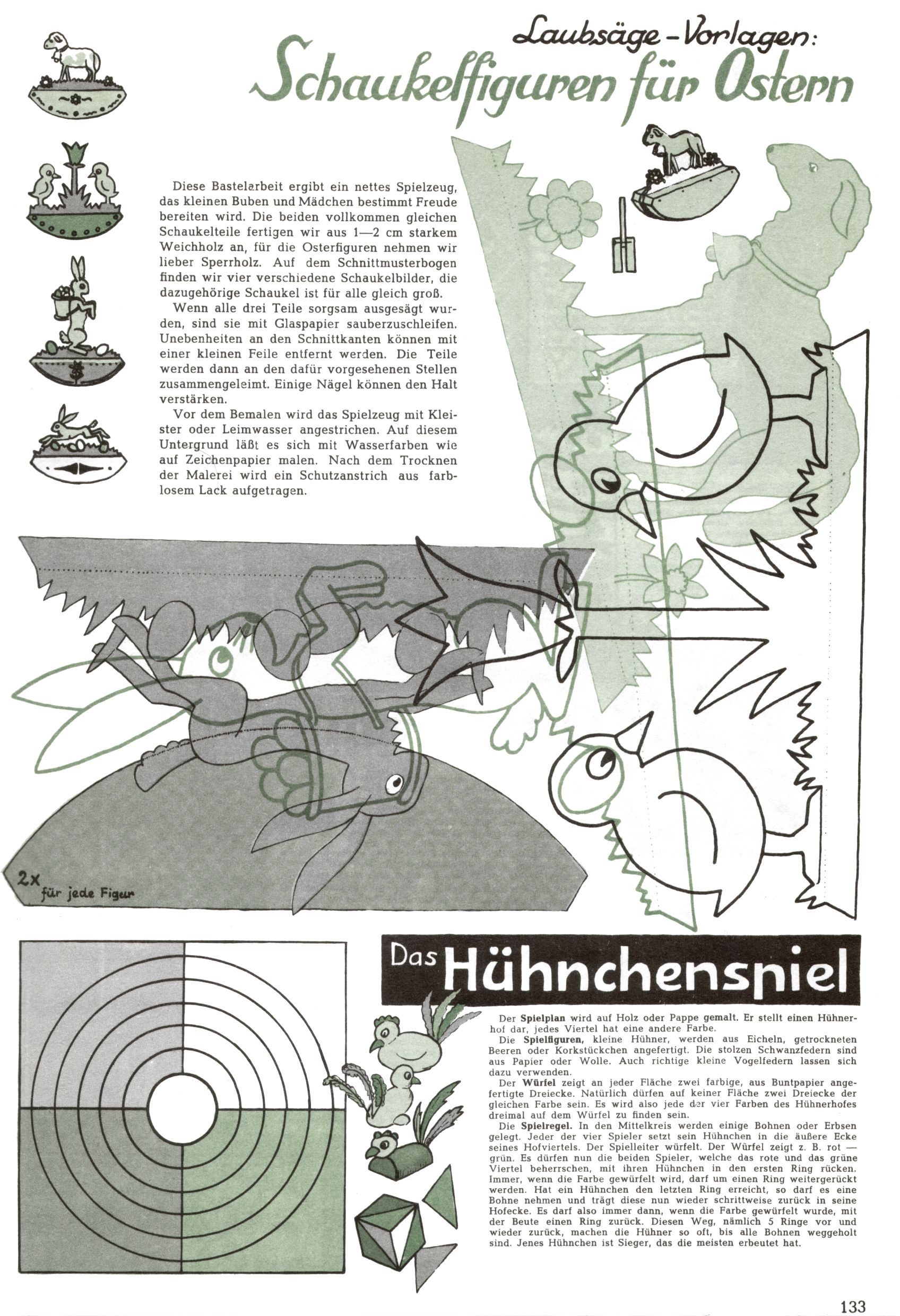 Die Wunderwelt im Festtagsgewand In den Sonderheften präsentierte sich die Wunderwelt wahrhaftig in Feiertagsstimmung. Mit wenigen Ausnahmen gab es pro Jahr drei Sonderhefte - zu Weihnachten bzw. im Advent, zu Ostern und in den Ferien im Sommer. Experimente mit Faschings- und Muttertagsheften hatten sich nicht bewährt. Selbst als es die Einzelhefte in der Krisensituation nach 1967 nicht mehr gab, wurde die Wunderwelt-Zeitung im Layout der Sonderhefte fortgesetzt: Zunächst mit 3 bis 5 und ab 1971 immerhin wieder mit 10-12 Heften pro Jahr. Die Weihnachts-, Oster- und Ferienhefte hatten naturgemäß verschiedene Schwerpunkte. Während im Sommer Spielen und Werken mit Material im Vordergrund stand, waren es zu Weihnachten Krippen und Adventhäuser; zu Ostern dann Erzählungen, Hasenstädte und Oster-Basteleien. Das bessere Papier der Sonderhefte erleichterte das Ausschneiden der insgesamt mehr als 1000 Papiermodelle erheblich. Die Sonderhefte waren vergleichsweise aufwändig gestaltet, aber auch ein wichtiges Zusatzgeschäft für die Zeitung. Die Kinder fieberten dem Erscheinungsdatum der jeweiligen Ausgabe nicht selten richtiggehend entgegen. Mit knapp 100 Seiten pro Jahr machten die Sonderhefte von der Menge her zwar nicht einmal ein Viertel aus, trugen aber zum Erscheinungsbild mindestens genauso viel bei wie die Standardhefte. Im Wesentlichen blieb das Layout der Sonderhefte über die Jahre hin unverändert. Mühselig wurde es, als man den Inhalt der Beiträge vorübergehend auf die Seiten gleichmäßig verteilte und die Kinder ermunterte, die Hefte in der Mitte zu zerschneiden. Die eine Hälfte enthielt dann etwa Erzählungen und Bastelvorschläge, der andere Teil der Zeitung Spielanleitungen. Zur übersichtlichkeit trugen diese Layoutversuche jedenfalls in keiner Weise bei und als besonderen Auswuchs gab es eine Zeitlang auf einer Seite oft mehrere Seitennummern, je nachdem, ob sich diese auf das Gesamtheft oder den herauszunehmenden und zu zerschneidenden Heftteil bezogen. Gegen Ende der 1950er Jahre kehrte man wieder zu einem ganzseitigen Layout zurück und Ideen wie ein Spiel-(Heft-im-)Heft gehörten der Vergangenheit an. In den Sonderheften experimentierte man dann noch ab Mitte der 1960er Jahre, als die Verkaufszahlen stark rückläufig waren, mit grundsätzlich neuen Darstellungsformen - weg vom Niedlich-Kitschigen und engagierte neue Grafikerinnen wie Gundi Groh und Hella Soyka. Den erhofften Erfolg brachte dies jedoch nicht mehr. |