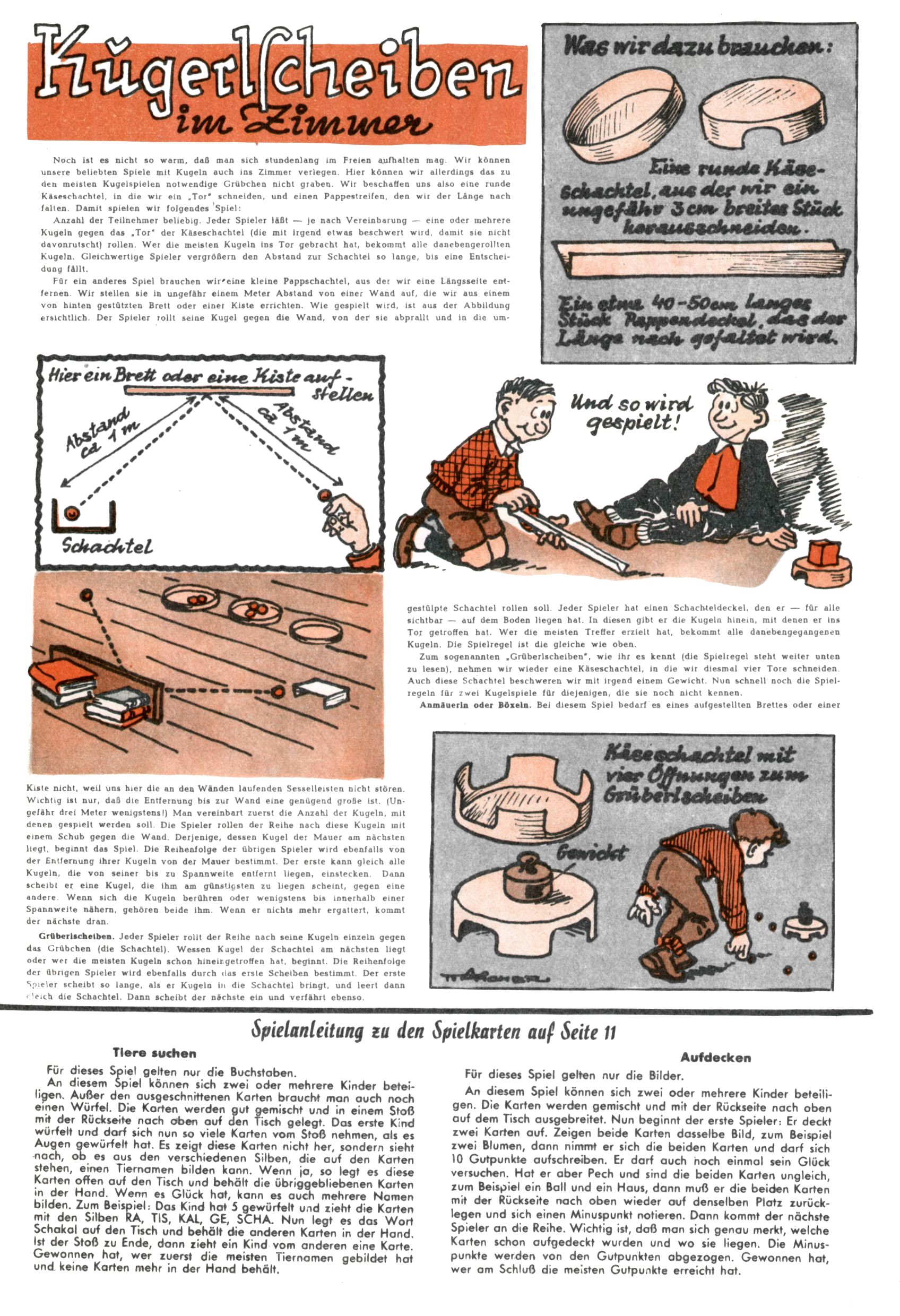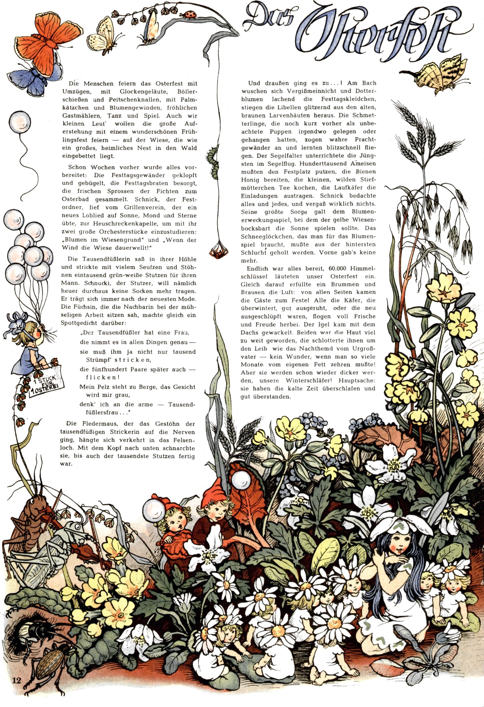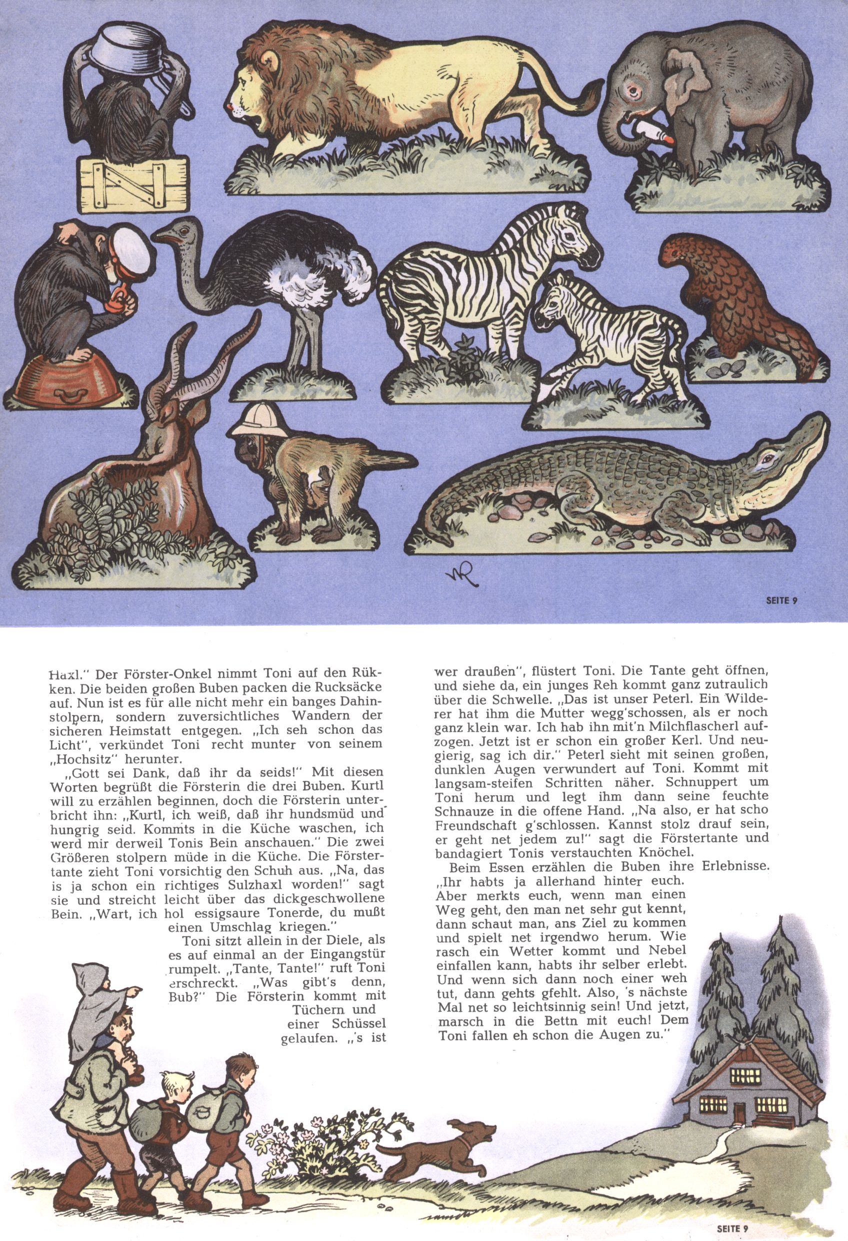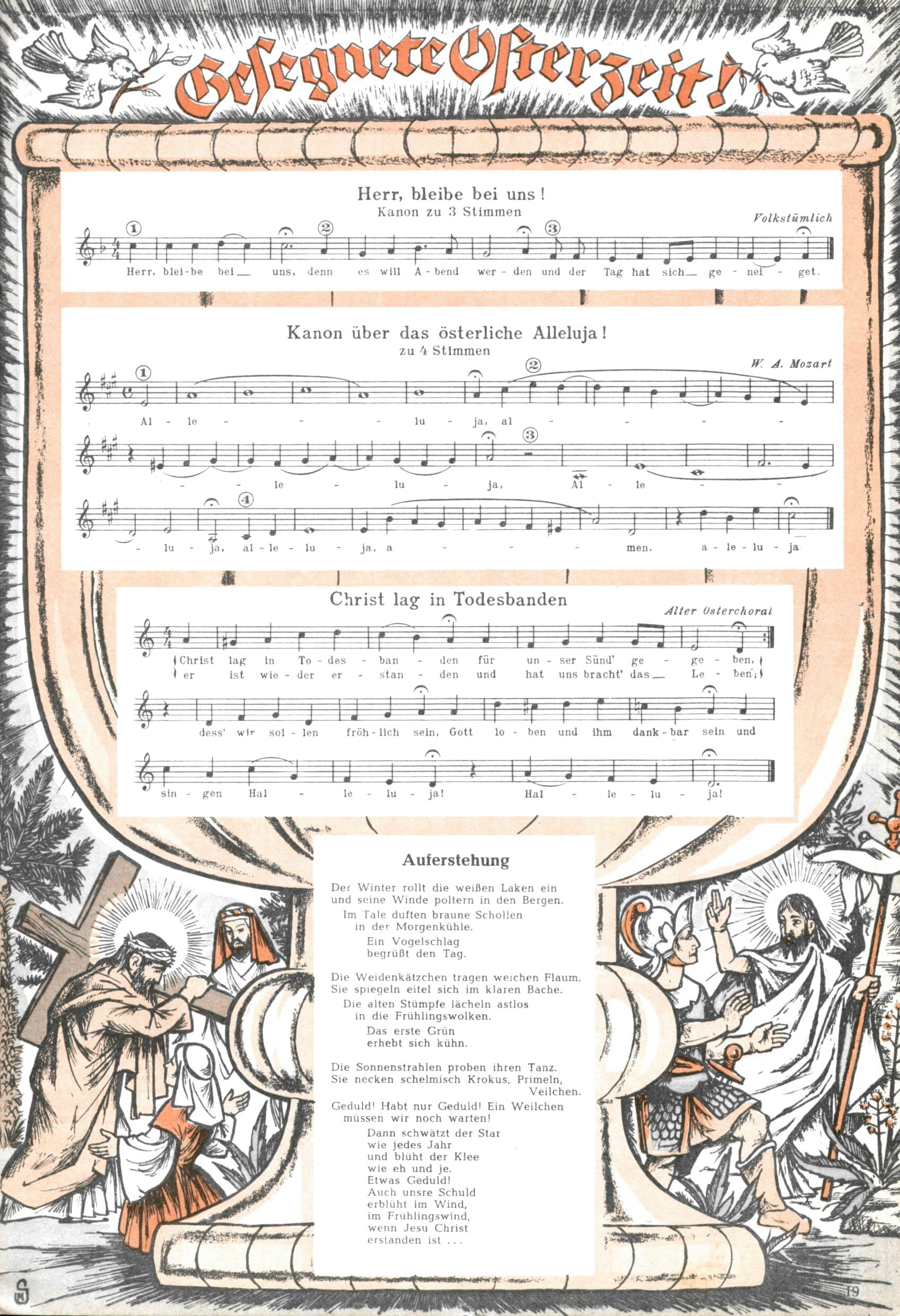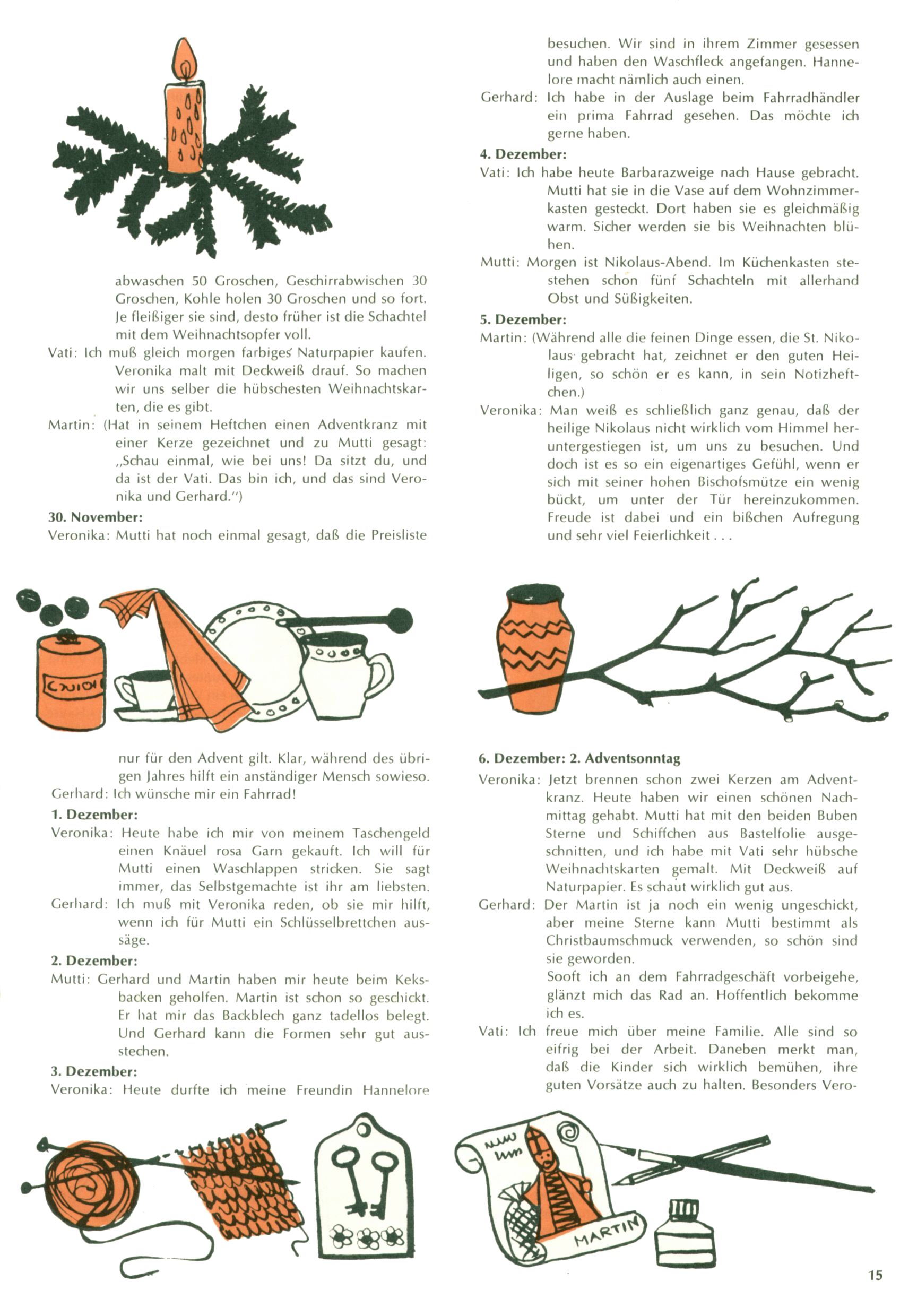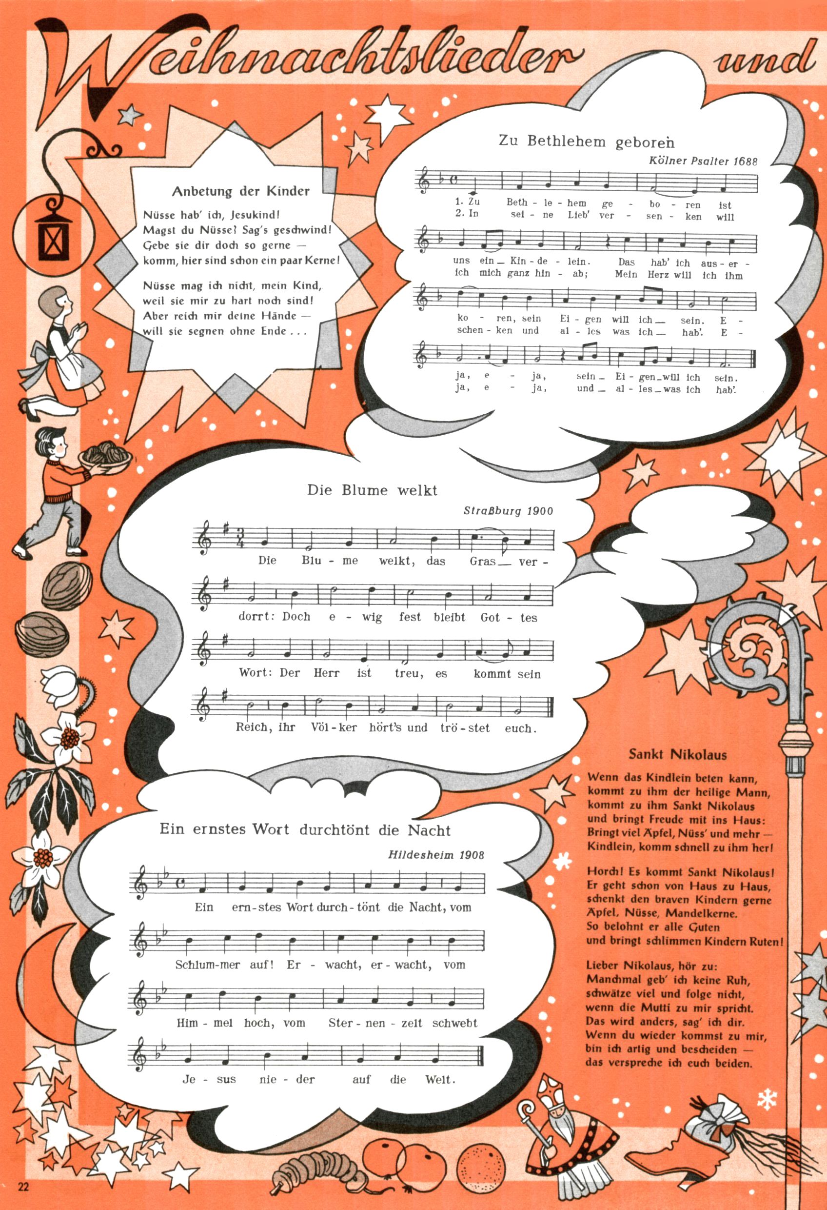 Die Wunderwelt im Festtagsgewand In den Sonderheften präsentierte sich die Wunderwelt wahrhaftig in Feiertagsstimmung. Mit wenigen Ausnahmen gab es pro Jahr drei Sonderhefte - zu Weihnachten bzw. im Advent, zu Ostern und in den Ferien im Sommer. Experimente mit Faschings- und Muttertagsheften hatten sich nicht bewährt. Selbst als es die Einzelhefte in der Krisensituation nach 1967 nicht mehr gab, wurde die Wunderwelt-Zeitung im Layout der Sonderhefte fortgesetzt: Zunächst mit 3 bis 5 und ab 1971 immerhin wieder mit 10-12 Heften pro Jahr. Die Weihnachts-, Oster- und Ferienhefte hatten naturgemäß verschiedene Schwerpunkte. Während im Sommer Spielen und Werken mit Material im Vordergrund stand, waren es zu Weihnachten Krippen und Adventhäuser; zu Ostern dann Erzählungen, Hasenstädte und Oster-Basteleien. Das bessere Papier der Sonderhefte erleichterte das Ausschneiden der insgesamt mehr als 1000 Papiermodelle erheblich. Die Sonderhefte waren vergleichsweise aufwändig gestaltet, aber auch ein wichtiges Zusatzgeschäft für die Zeitung. Die Kinder fieberten dem Erscheinungsdatum der jeweiligen Ausgabe nicht selten richtiggehend entgegen. Mit knapp 100 Seiten pro Jahr machten die Sonderhefte von der Menge her zwar nicht einmal ein Viertel aus, trugen aber zum Erscheinungsbild mindestens genauso viel bei wie die Standardhefte. Im Wesentlichen blieb das Layout der Sonderhefte über die Jahre hin unverändert. Mühselig wurde es, als man den Inhalt der Beiträge vorübergehend auf die Seiten gleichmäßig verteilte und die Kinder ermunterte, die Hefte in der Mitte zu zerschneiden. Die eine Hälfte enthielt dann etwa Erzählungen und Bastelvorschläge, der andere Teil der Zeitung Spielanleitungen. Zur übersichtlichkeit trugen diese Layoutversuche jedenfalls in keiner Weise bei und als besonderen Auswuchs gab es eine Zeitlang auf einer Seite oft mehrere Seitennummern, je nachdem, ob sich diese auf das Gesamtheft oder den herauszunehmenden und zu zerschneidenden Heftteil bezogen. Gegen Ende der 1950er Jahre kehrte man wieder zu einem ganzseitigen Layout zurück und Ideen wie ein Spiel-(Heft-im-)Heft gehörten der Vergangenheit an. In den Sonderheften experimentierte man dann noch ab Mitte der 1960er Jahre, als die Verkaufszahlen stark rückläufig waren, mit grundsätzlich neuen Darstellungsformen - weg vom Niedlich-Kitschigen und engagierte neue Grafikerinnen wie Gundi Groh und Hella Soyka. Den erhofften Erfolg brachte dies jedoch nicht mehr. |