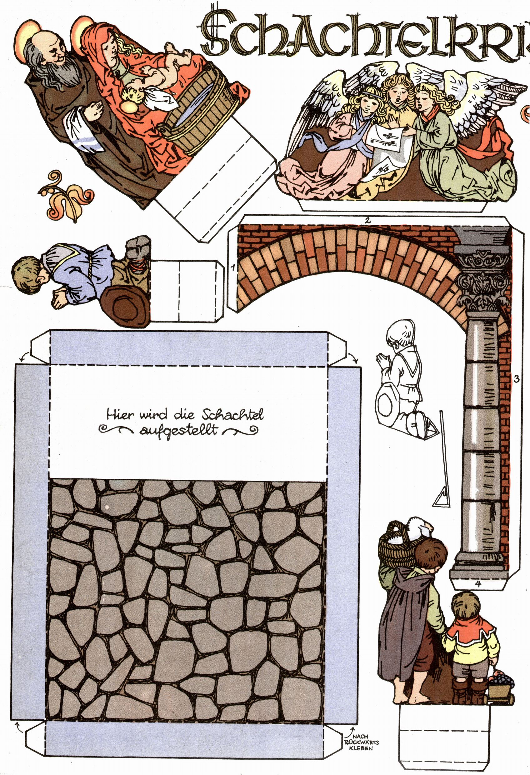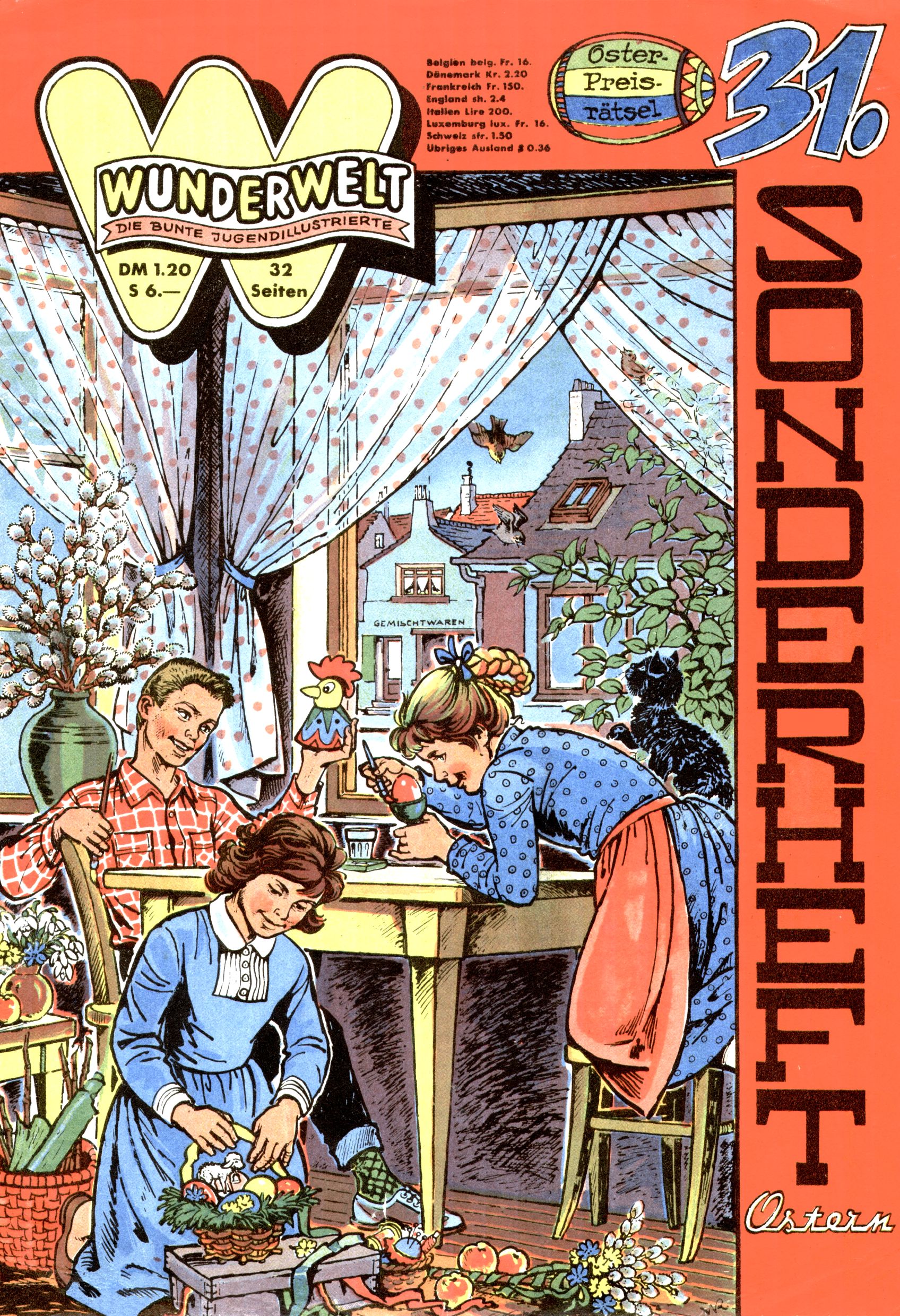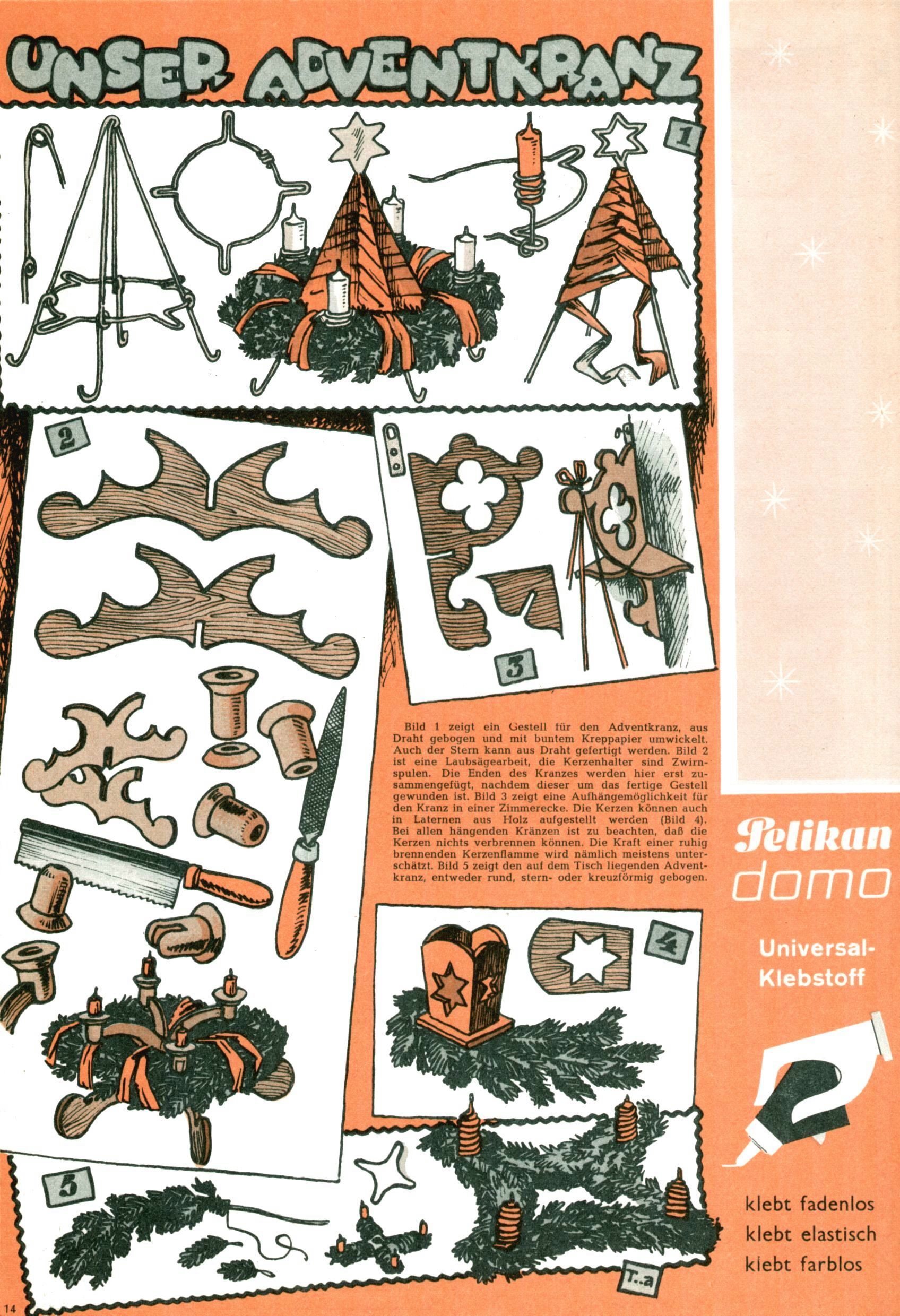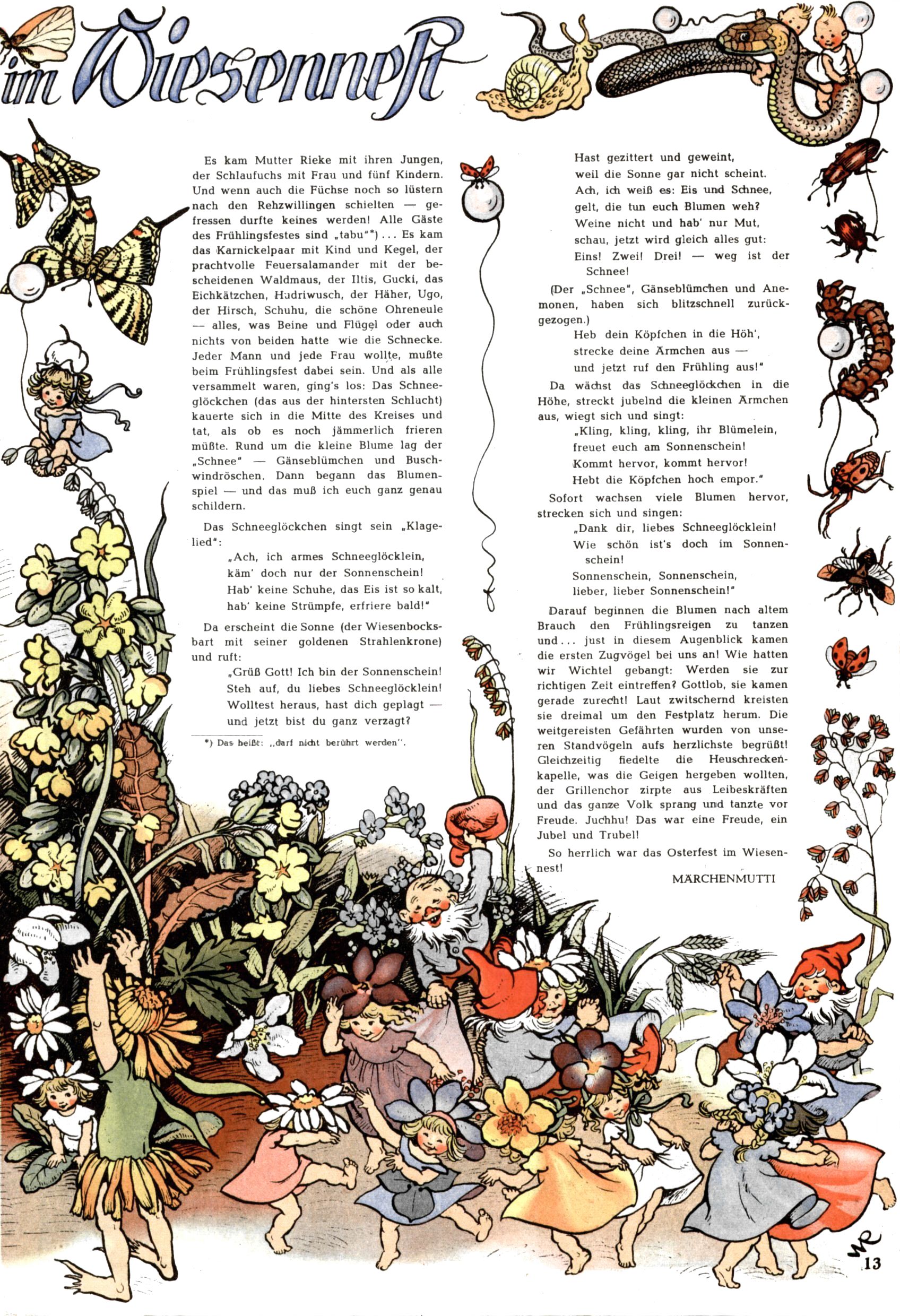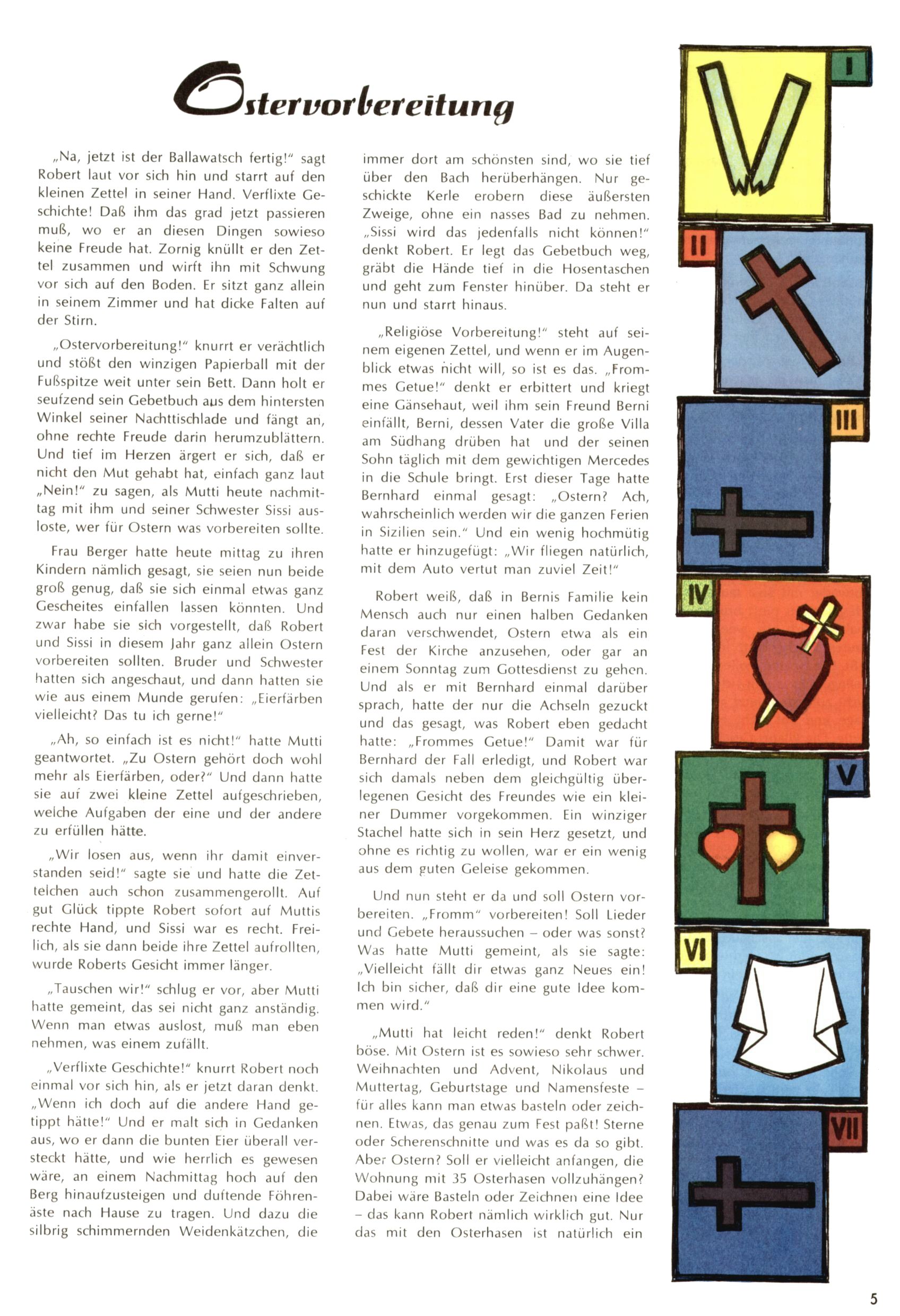 Die Wunderwelt im Festtagsgewand In den Sonderheften präsentierte sich die Wunderwelt wahrhaftig in Feiertagsstimmung. Mit wenigen Ausnahmen gab es pro Jahr drei Sonderhefte - zu Weihnachten bzw. im Advent, zu Ostern und in den Ferien im Sommer. Experimente mit Faschings- und Muttertagsheften hatten sich nicht bewährt. Selbst als es die Einzelhefte in der Krisensituation nach 1967 nicht mehr gab, wurde die Wunderwelt-Zeitung im Layout der Sonderhefte fortgesetzt: Zunächst mit 3 bis 5 und ab 1971 immerhin wieder mit 10-12 Heften pro Jahr. Die Weihnachts-, Oster- und Ferienhefte hatten naturgemäß verschiedene Schwerpunkte. Während im Sommer Spielen und Werken mit Material im Vordergrund stand, waren es zu Weihnachten Krippen und Adventhäuser; zu Ostern dann Erzählungen, Hasenstädte und Oster-Basteleien. Das bessere Papier der Sonderhefte erleichterte das Ausschneiden der insgesamt mehr als 1000 Papiermodelle erheblich. Die Sonderhefte waren vergleichsweise aufwändig gestaltet, aber auch ein wichtiges Zusatzgeschäft für die Zeitung. Die Kinder fieberten dem Erscheinungsdatum der jeweiligen Ausgabe nicht selten richtiggehend entgegen. Mit knapp 100 Seiten pro Jahr machten die Sonderhefte von der Menge her zwar nicht einmal ein Viertel aus, trugen aber zum Erscheinungsbild mindestens genauso viel bei wie die Standardhefte. Im Wesentlichen blieb das Layout der Sonderhefte über die Jahre hin unverändert. Mühselig wurde es, als man den Inhalt der Beiträge vorübergehend auf die Seiten gleichmäßig verteilte und die Kinder ermunterte, die Hefte in der Mitte zu zerschneiden. Die eine Hälfte enthielt dann etwa Erzählungen und Bastelvorschläge, der andere Teil der Zeitung Spielanleitungen. Zur übersichtlichkeit trugen diese Layoutversuche jedenfalls in keiner Weise bei und als besonderen Auswuchs gab es eine Zeitlang auf einer Seite oft mehrere Seitennummern, je nachdem, ob sich diese auf das Gesamtheft oder den herauszunehmenden und zu zerschneidenden Heftteil bezogen. Gegen Ende der 1950er Jahre kehrte man wieder zu einem ganzseitigen Layout zurück und Ideen wie ein Spiel-(Heft-im-)Heft gehörten der Vergangenheit an. In den Sonderheften experimentierte man dann noch ab Mitte der 1960er Jahre, als die Verkaufszahlen stark rückläufig waren, mit grundsätzlich neuen Darstellungsformen - weg vom Niedlich-Kitschigen und engagierte neue Grafikerinnen wie Gundi Groh und Hella Soyka. Den erhofften Erfolg brachte dies jedoch nicht mehr. |
