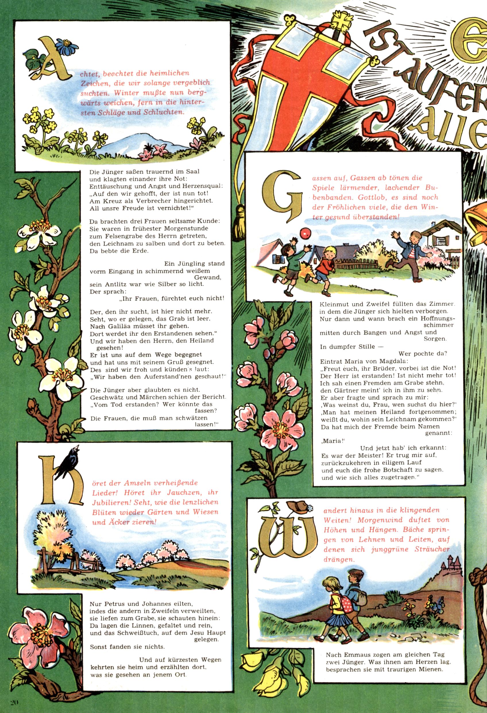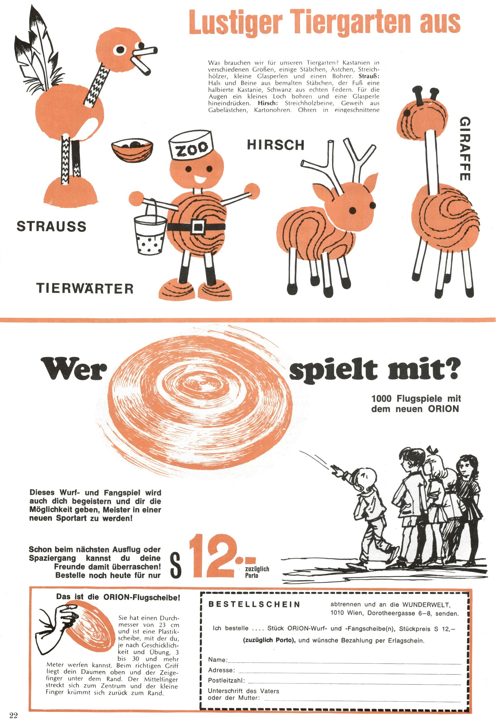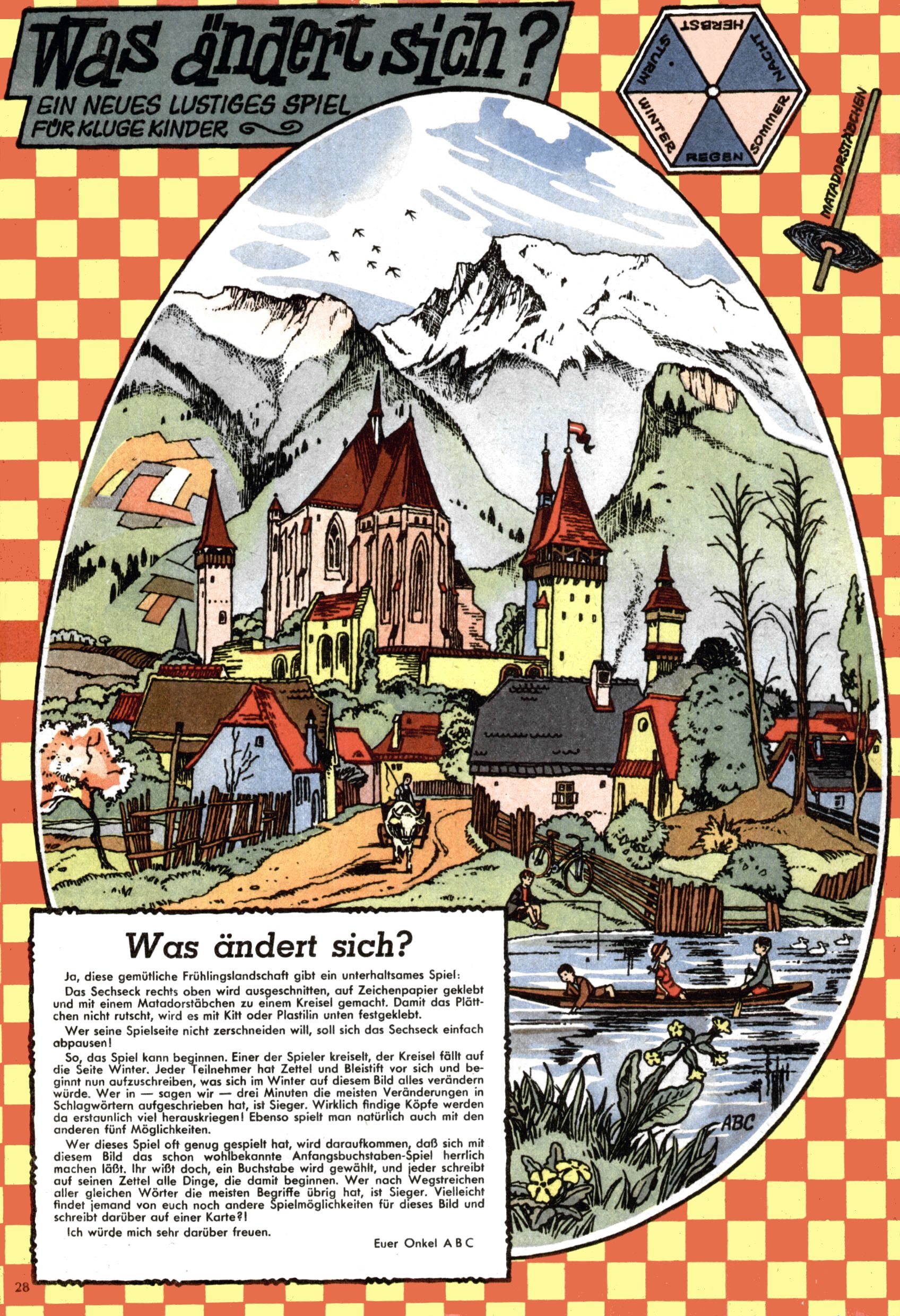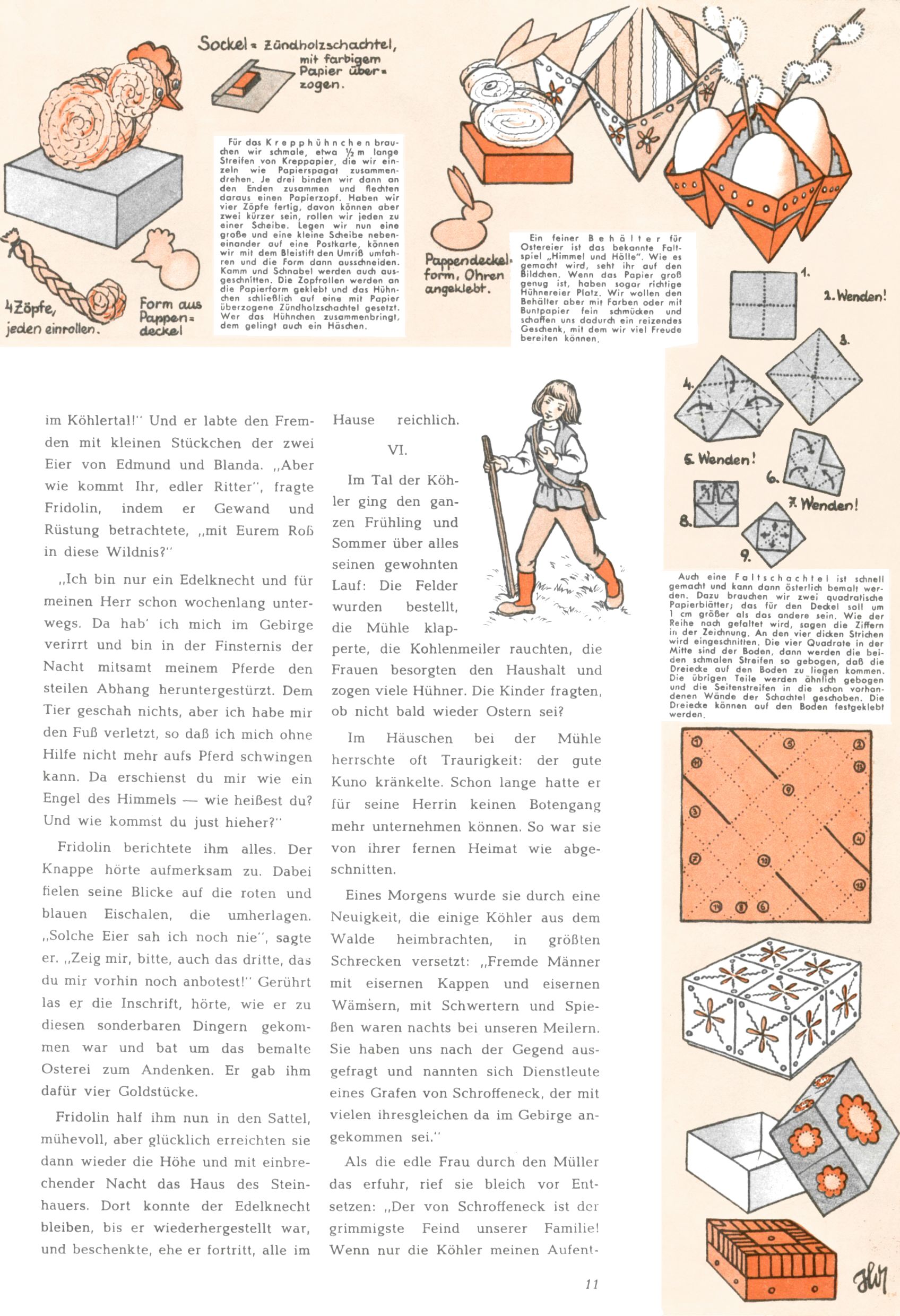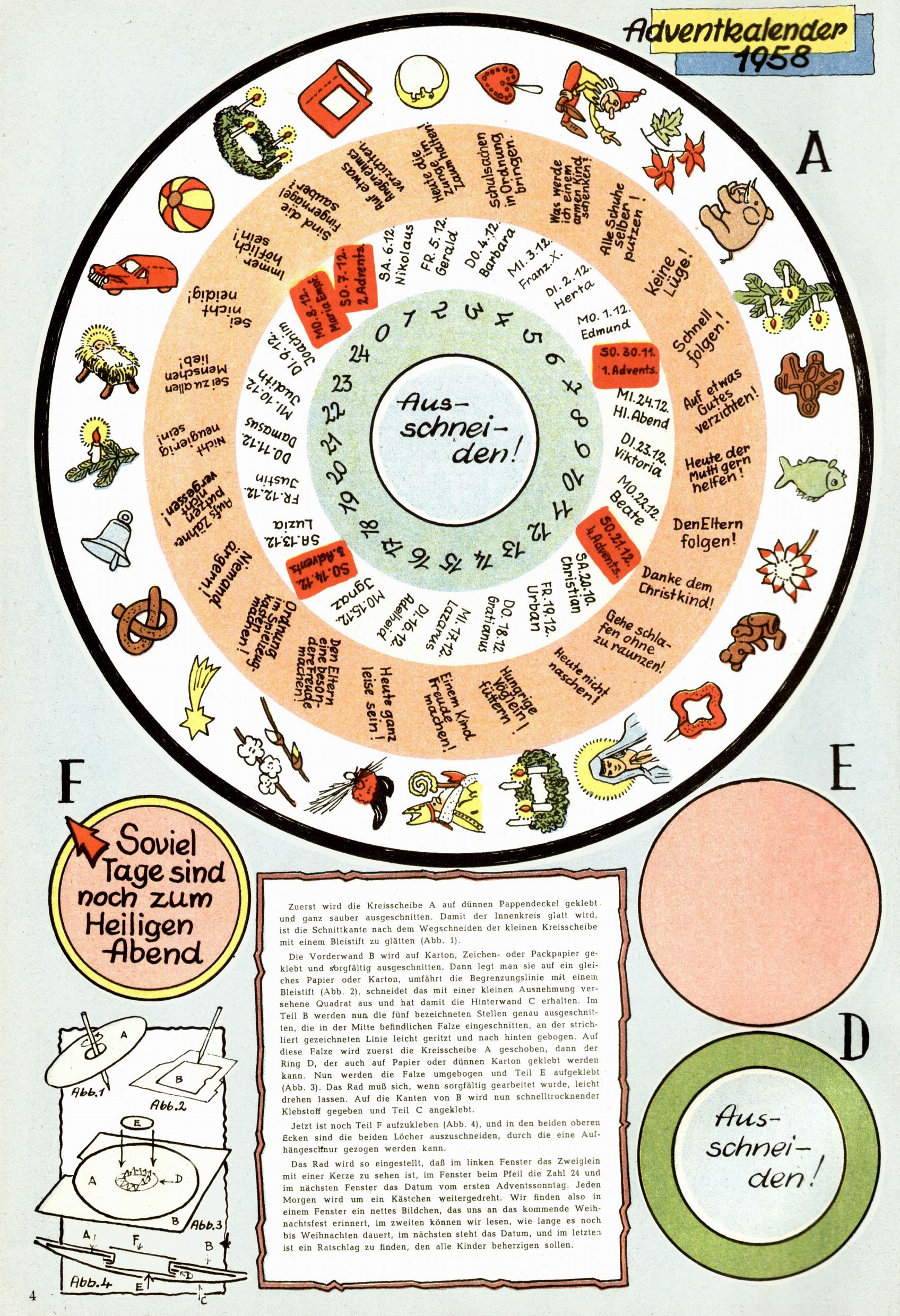 Die Wunderwelt im Festtagsgewand In den Sonderheften präsentierte sich die Wunderwelt wahrhaftig in Feiertagsstimmung. Mit wenigen Ausnahmen gab es pro Jahr drei Sonderhefte - zu Weihnachten bzw. im Advent, zu Ostern und in den Ferien im Sommer. Experimente mit Faschings- und Muttertagsheften hatten sich nicht bewährt. Selbst als es die Einzelhefte in der Krisensituation nach 1967 nicht mehr gab, wurde die Wunderwelt-Zeitung im Layout der Sonderhefte fortgesetzt: Zunächst mit 3 bis 5 und ab 1971 immerhin wieder mit 10-12 Heften pro Jahr. Die Weihnachts-, Oster- und Ferienhefte hatten naturgemäß verschiedene Schwerpunkte. Während im Sommer Spielen und Werken mit Material im Vordergrund stand, waren es zu Weihnachten Krippen und Adventhäuser; zu Ostern dann Erzählungen, Hasenstädte und Oster-Basteleien. Das bessere Papier der Sonderhefte erleichterte das Ausschneiden der insgesamt mehr als 1000 Papiermodelle erheblich. Die Sonderhefte waren vergleichsweise aufwändig gestaltet, aber auch ein wichtiges Zusatzgeschäft für die Zeitung. Die Kinder fieberten dem Erscheinungsdatum der jeweiligen Ausgabe nicht selten richtiggehend entgegen. Mit knapp 100 Seiten pro Jahr machten die Sonderhefte von der Menge her zwar nicht einmal ein Viertel aus, trugen aber zum Erscheinungsbild mindestens genauso viel bei wie die Standardhefte. Im Wesentlichen blieb das Layout der Sonderhefte über die Jahre hin unverändert. Mühselig wurde es, als man den Inhalt der Beiträge vorübergehend auf die Seiten gleichmäßig verteilte und die Kinder ermunterte, die Hefte in der Mitte zu zerschneiden. Die eine Hälfte enthielt dann etwa Erzählungen und Bastelvorschläge, der andere Teil der Zeitung Spielanleitungen. Zur übersichtlichkeit trugen diese Layoutversuche jedenfalls in keiner Weise bei und als besonderen Auswuchs gab es eine Zeitlang auf einer Seite oft mehrere Seitennummern, je nachdem, ob sich diese auf das Gesamtheft oder den herauszunehmenden und zu zerschneidenden Heftteil bezogen. Gegen Ende der 1950er Jahre kehrte man wieder zu einem ganzseitigen Layout zurück und Ideen wie ein Spiel-(Heft-im-)Heft gehörten der Vergangenheit an. In den Sonderheften experimentierte man dann noch ab Mitte der 1960er Jahre, als die Verkaufszahlen stark rückläufig waren, mit grundsätzlich neuen Darstellungsformen - weg vom Niedlich-Kitschigen und engagierte neue Grafikerinnen wie Gundi Groh und Hella Soyka. Den erhofften Erfolg brachte dies jedoch nicht mehr. |