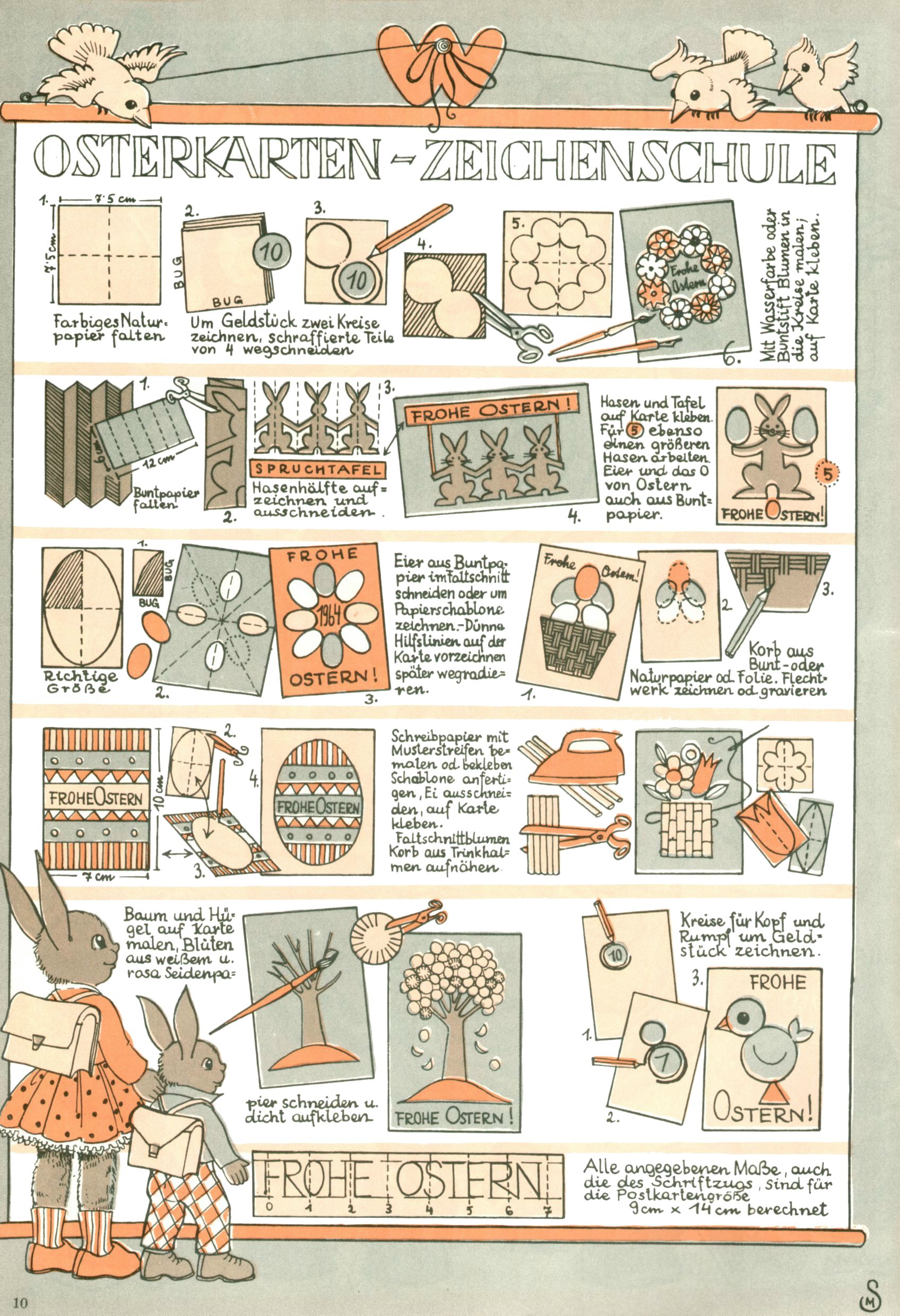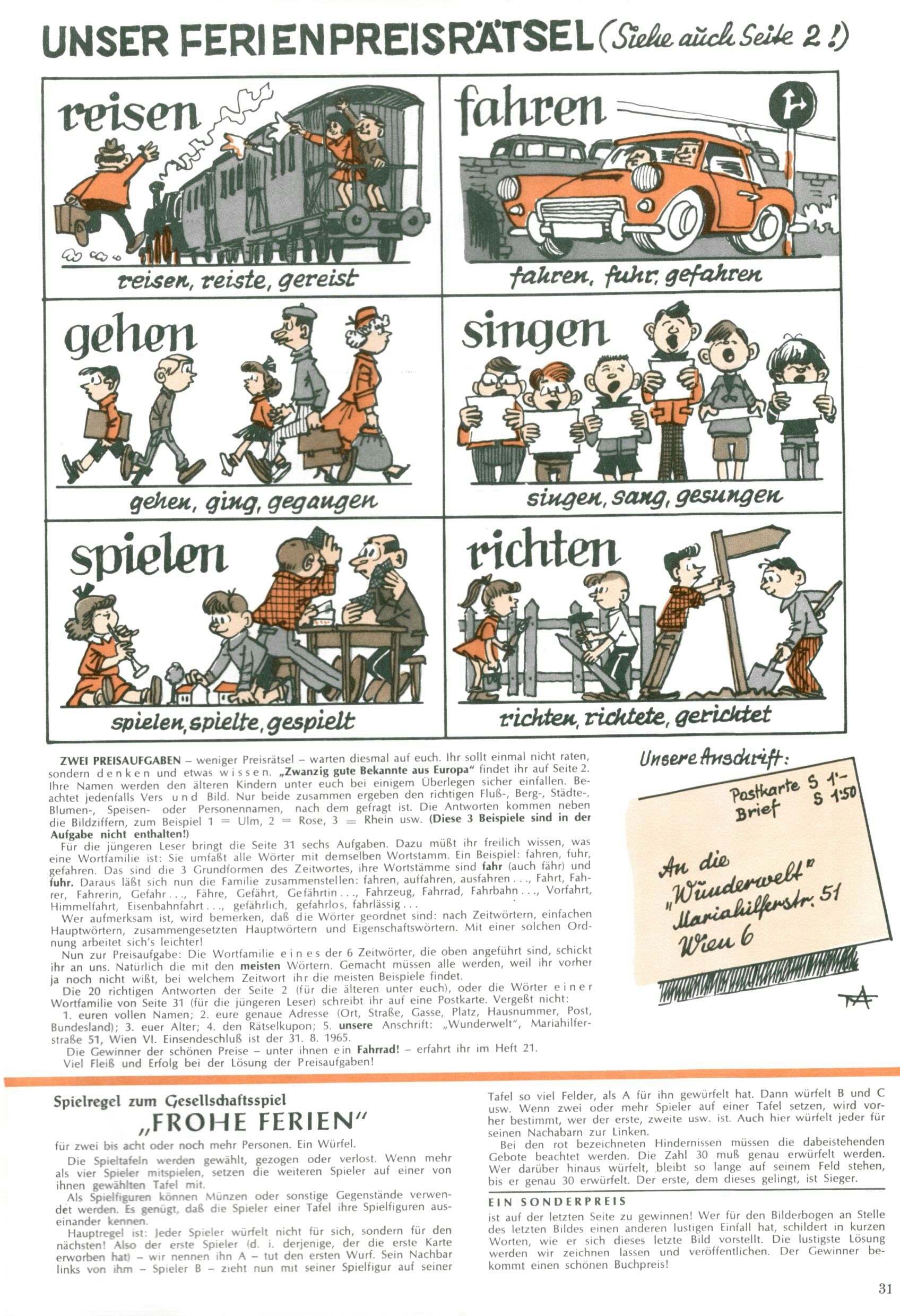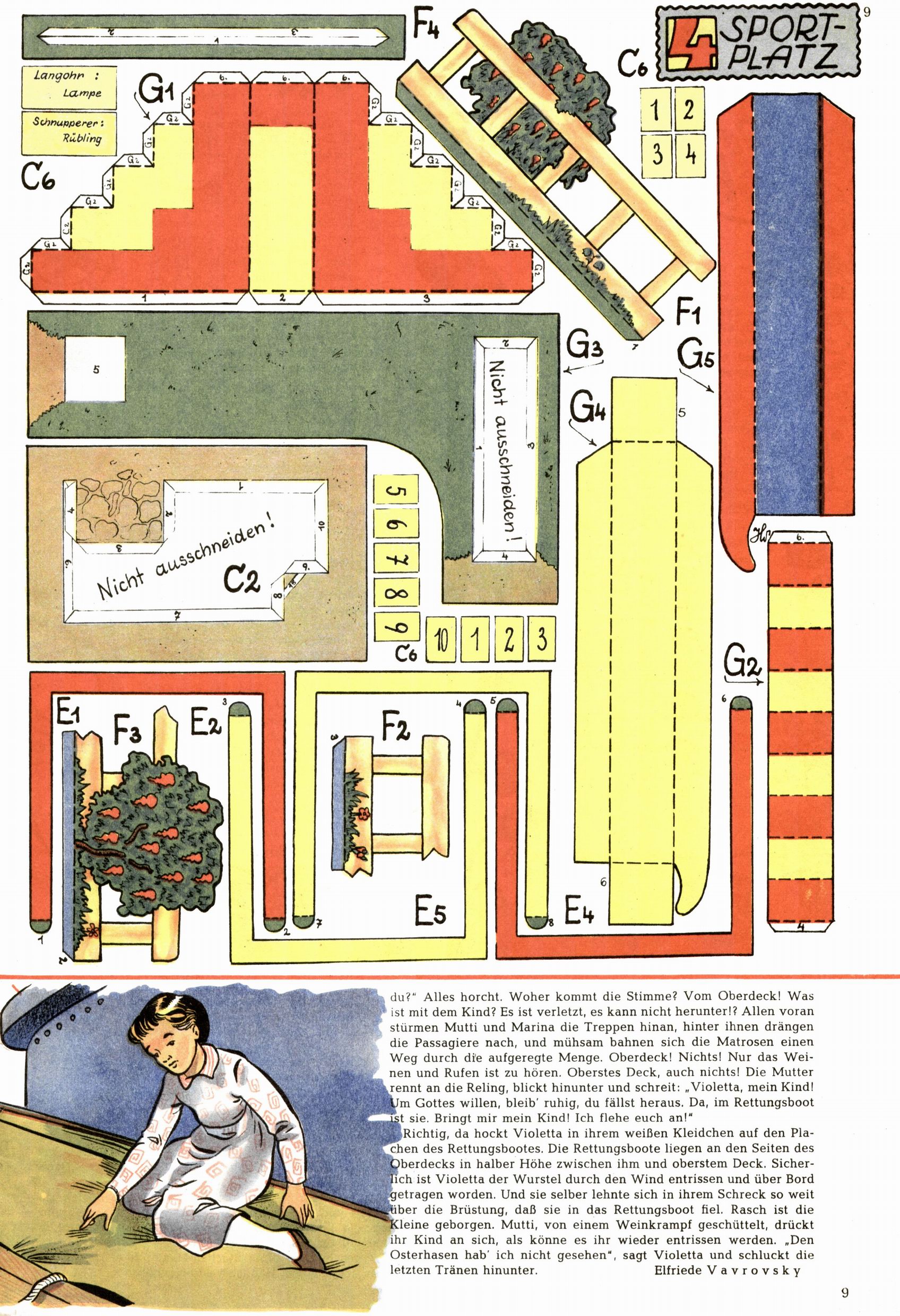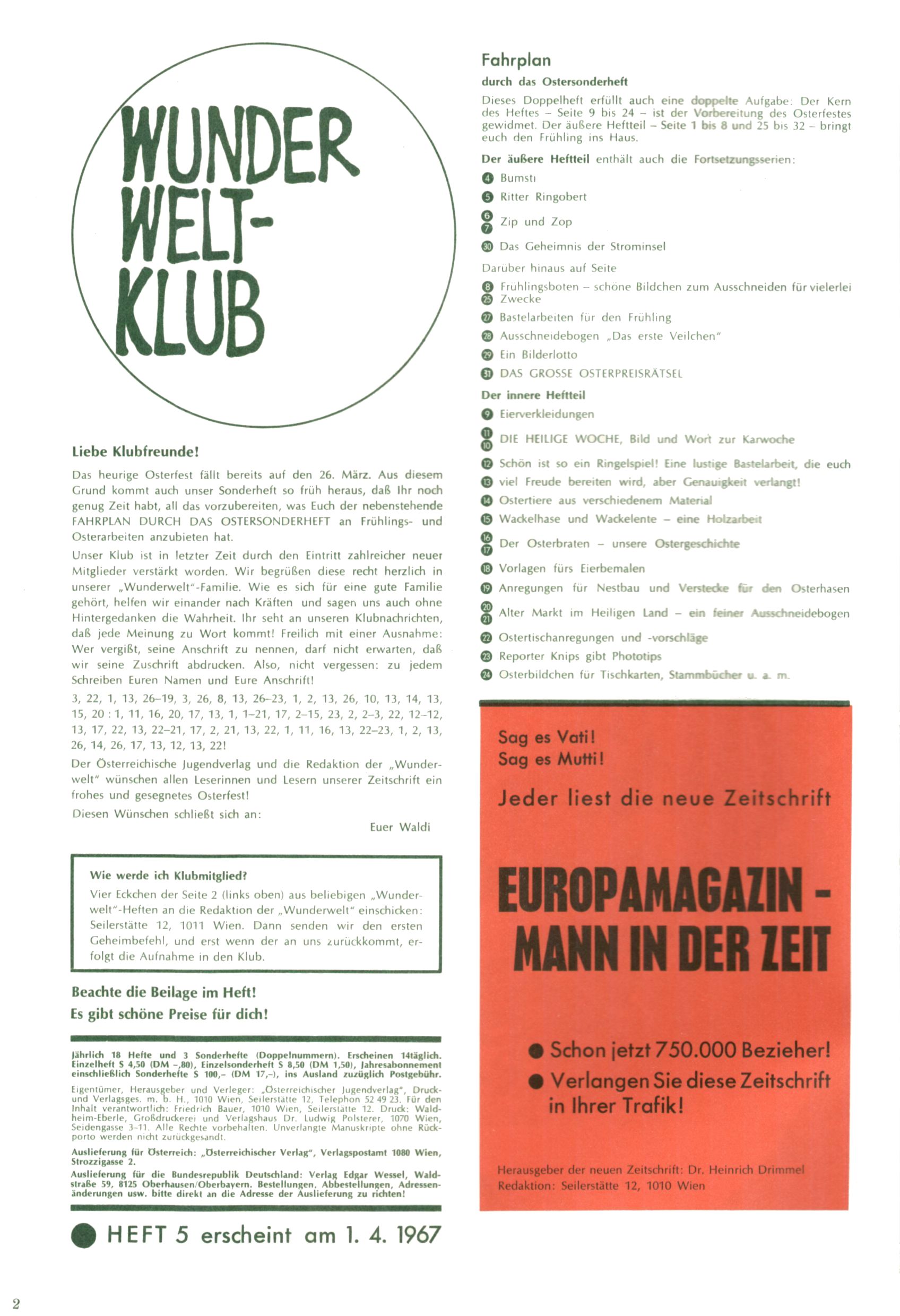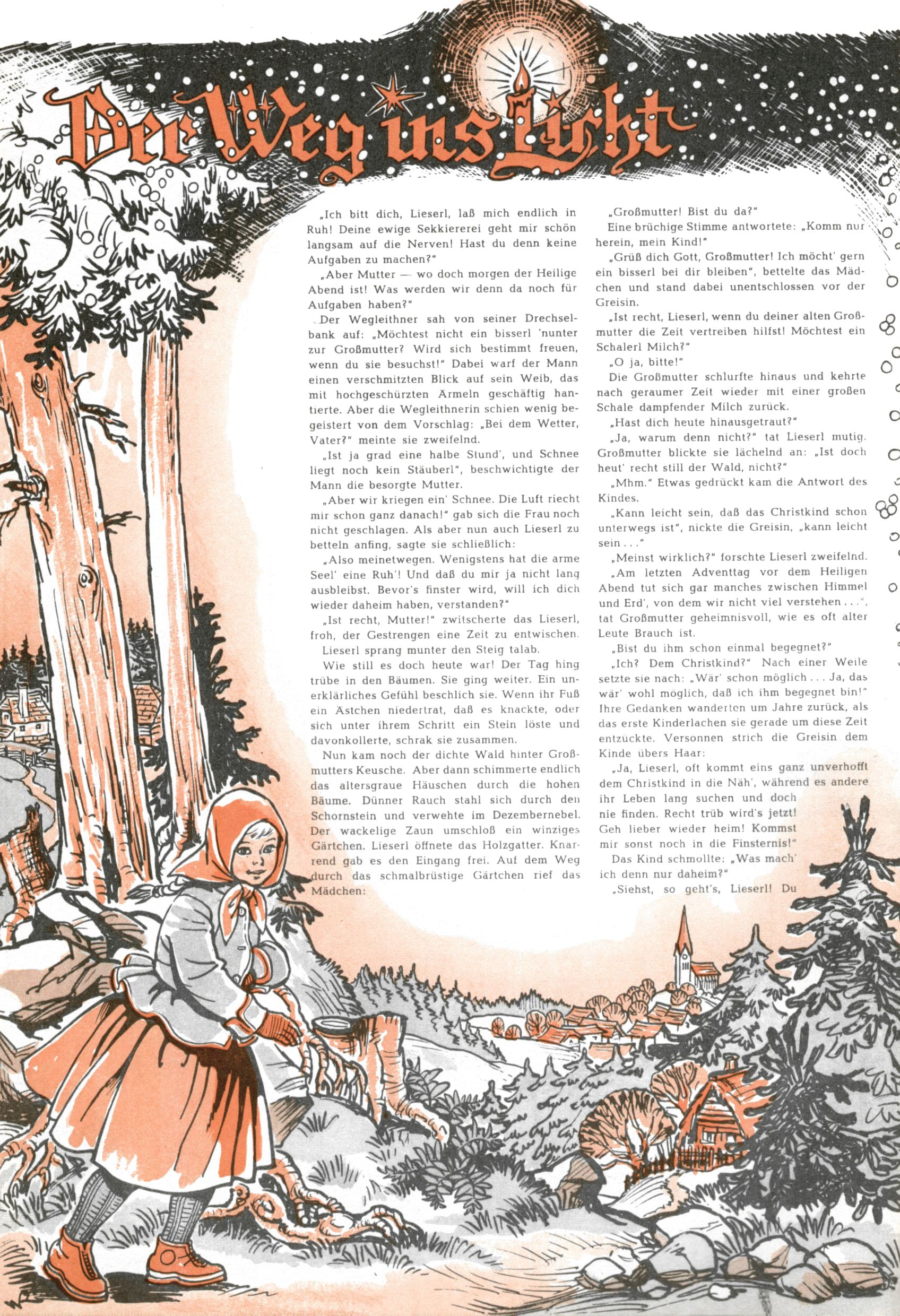 Die Wunderwelt im Festtagsgewand In den Sonderheften präsentierte sich die Wunderwelt wahrhaftig in Feiertagsstimmung. Mit wenigen Ausnahmen gab es pro Jahr drei Sonderhefte - zu Weihnachten bzw. im Advent, zu Ostern und in den Ferien im Sommer. Experimente mit Faschings- und Muttertagsheften hatten sich nicht bewährt. Selbst als es die Einzelhefte in der Krisensituation nach 1967 nicht mehr gab, wurde die Wunderwelt-Zeitung im Layout der Sonderhefte fortgesetzt: Zunächst mit 3 bis 5 und ab 1971 immerhin wieder mit 10-12 Heften pro Jahr. Die Weihnachts-, Oster- und Ferienhefte hatten naturgemäß verschiedene Schwerpunkte. Während im Sommer Spielen und Werken mit Material im Vordergrund stand, waren es zu Weihnachten Krippen und Adventhäuser; zu Ostern dann Erzählungen, Hasenstädte und Oster-Basteleien. Das bessere Papier der Sonderhefte erleichterte das Ausschneiden der insgesamt mehr als 1000 Papiermodelle erheblich. Die Sonderhefte waren vergleichsweise aufwändig gestaltet, aber auch ein wichtiges Zusatzgeschäft für die Zeitung. Die Kinder fieberten dem Erscheinungsdatum der jeweiligen Ausgabe nicht selten richtiggehend entgegen. Mit knapp 100 Seiten pro Jahr machten die Sonderhefte von der Menge her zwar nicht einmal ein Viertel aus, trugen aber zum Erscheinungsbild mindestens genauso viel bei wie die Standardhefte. Im Wesentlichen blieb das Layout der Sonderhefte über die Jahre hin unverändert. Mühselig wurde es, als man den Inhalt der Beiträge vorübergehend auf die Seiten gleichmäßig verteilte und die Kinder ermunterte, die Hefte in der Mitte zu zerschneiden. Die eine Hälfte enthielt dann etwa Erzählungen und Bastelvorschläge, der andere Teil der Zeitung Spielanleitungen. Zur übersichtlichkeit trugen diese Layoutversuche jedenfalls in keiner Weise bei und als besonderen Auswuchs gab es eine Zeitlang auf einer Seite oft mehrere Seitennummern, je nachdem, ob sich diese auf das Gesamtheft oder den herauszunehmenden und zu zerschneidenden Heftteil bezogen. Gegen Ende der 1950er Jahre kehrte man wieder zu einem ganzseitigen Layout zurück und Ideen wie ein Spiel-(Heft-im-)Heft gehörten der Vergangenheit an. In den Sonderheften experimentierte man dann noch ab Mitte der 1960er Jahre, als die Verkaufszahlen stark rückläufig waren, mit grundsätzlich neuen Darstellungsformen - weg vom Niedlich-Kitschigen und engagierte neue Grafikerinnen wie Gundi Groh und Hella Soyka. Den erhofften Erfolg brachte dies jedoch nicht mehr. |