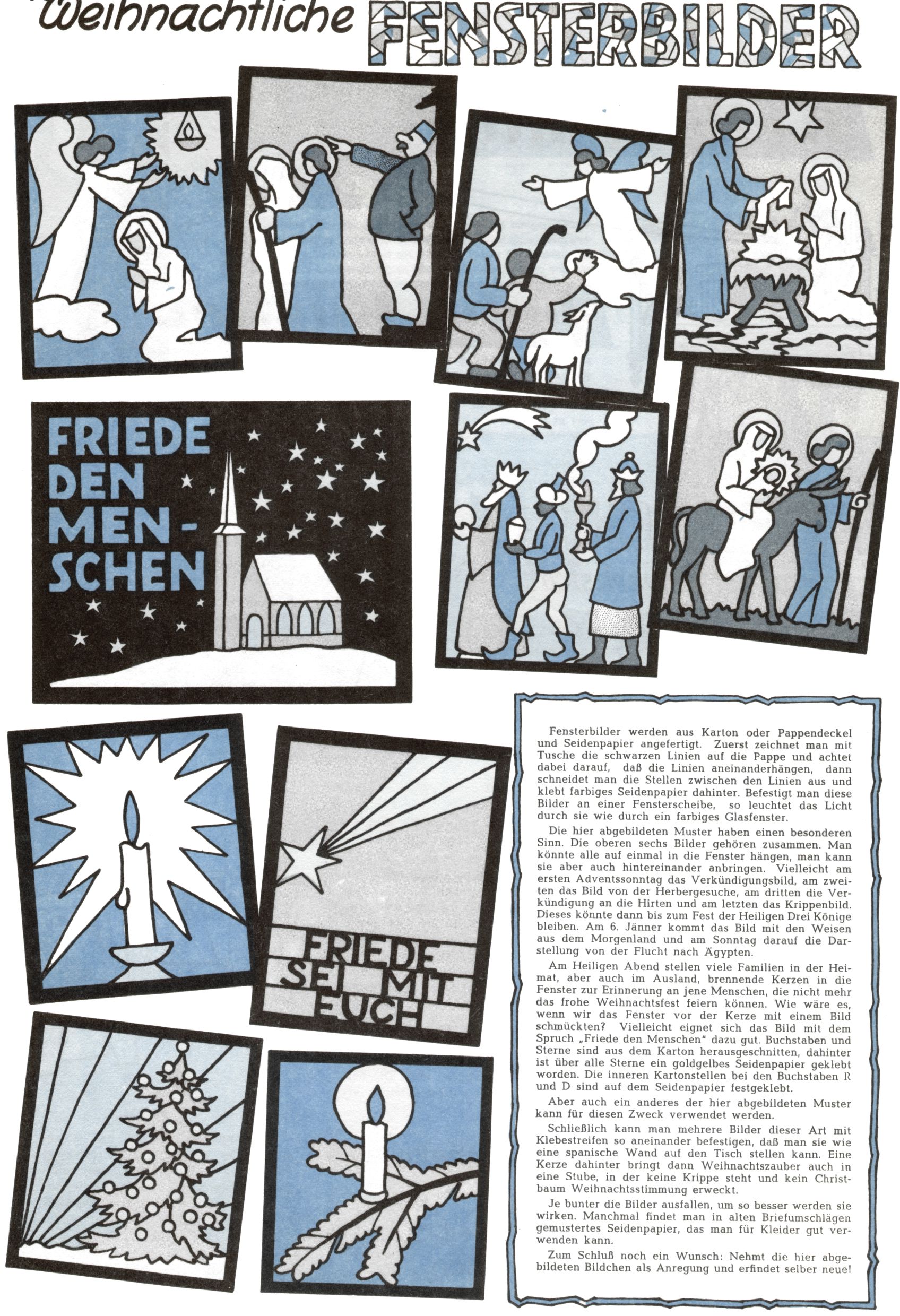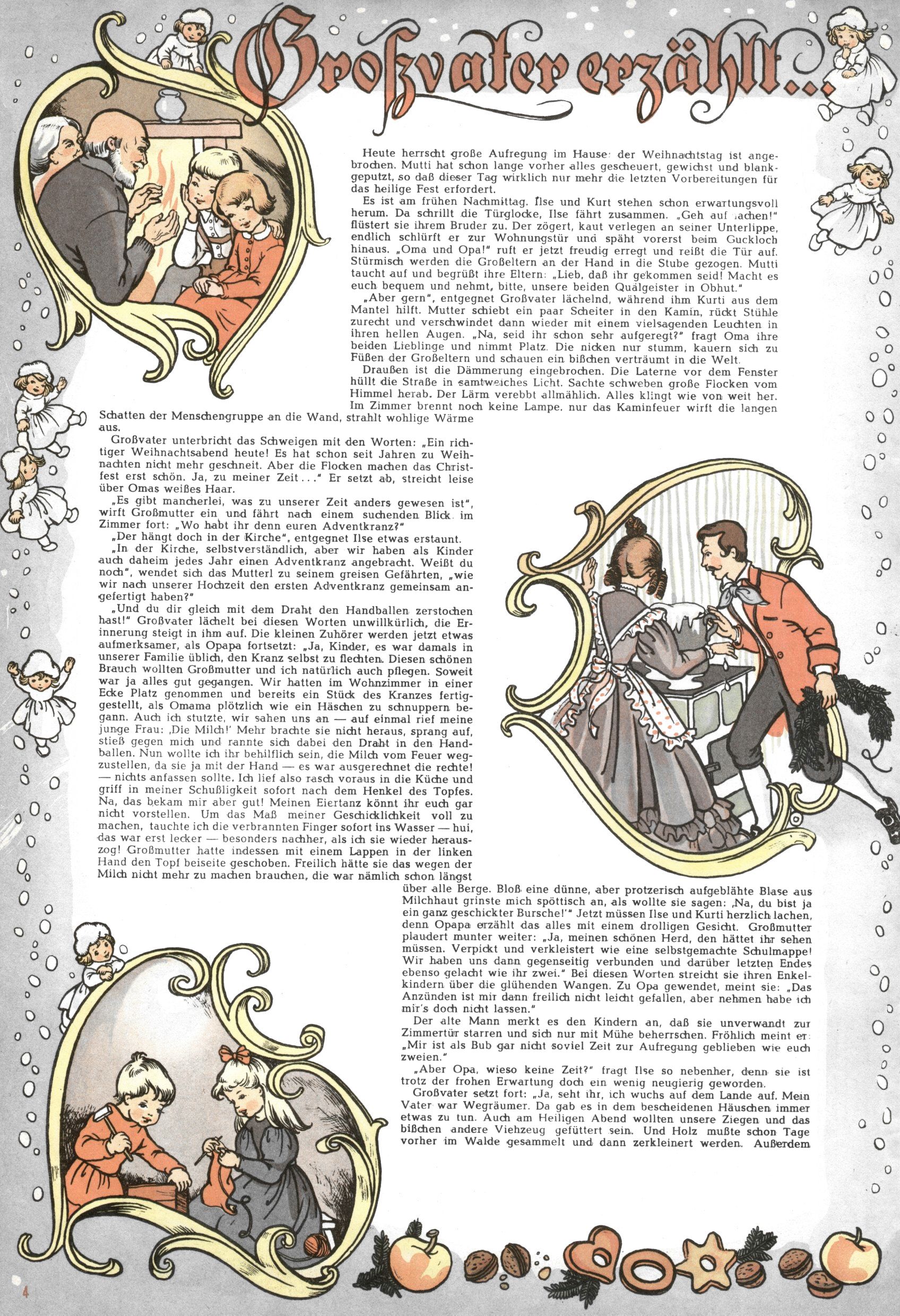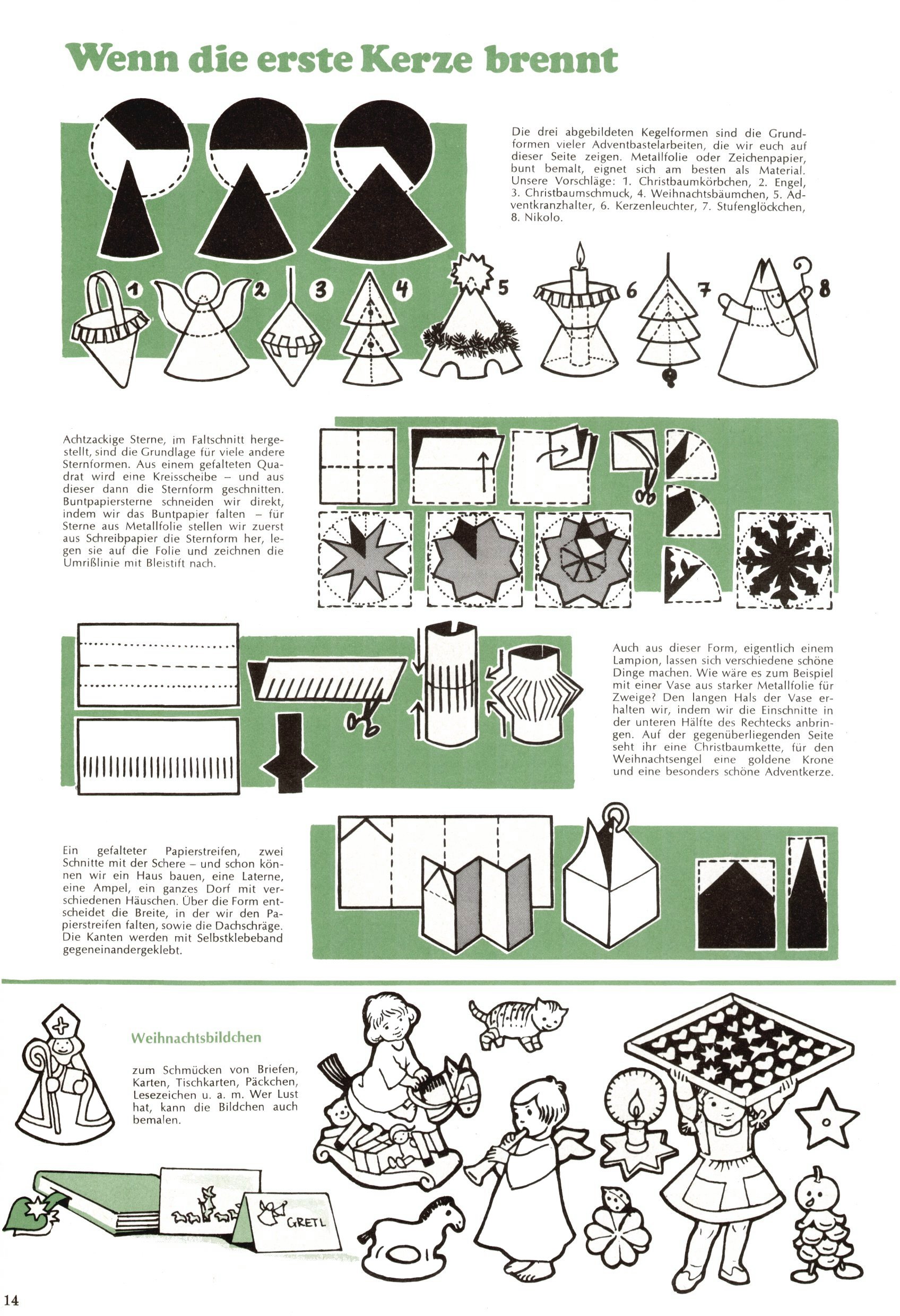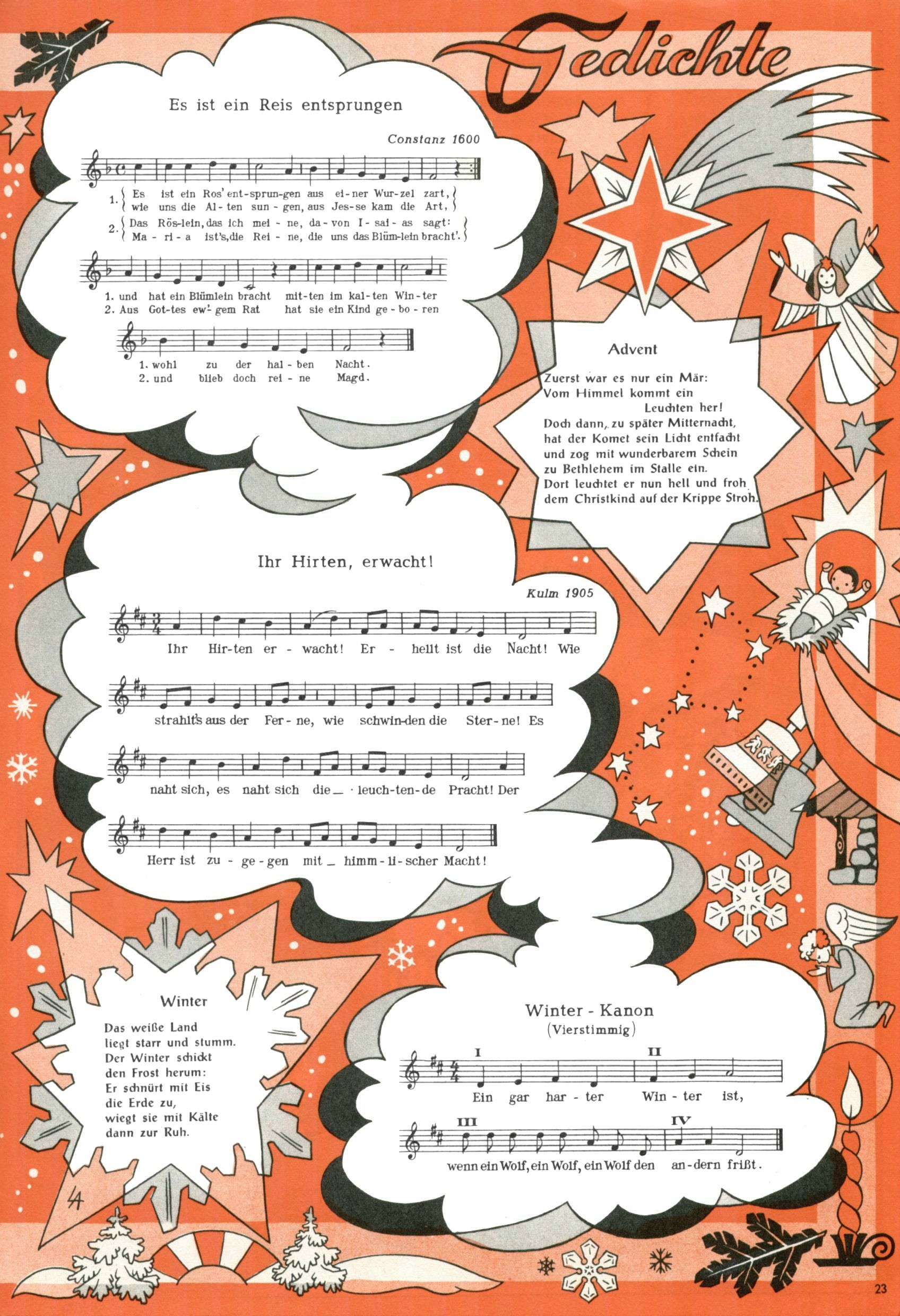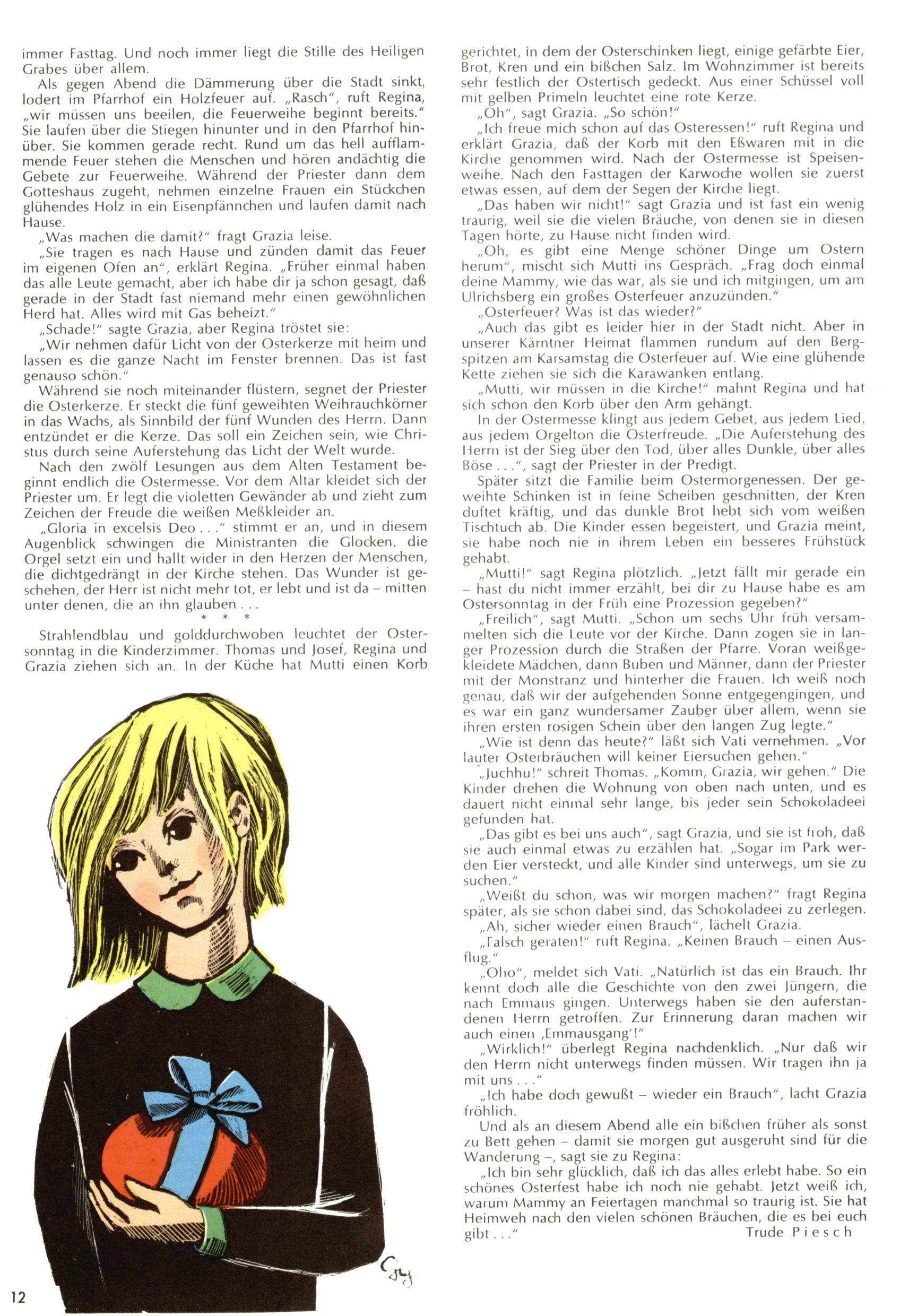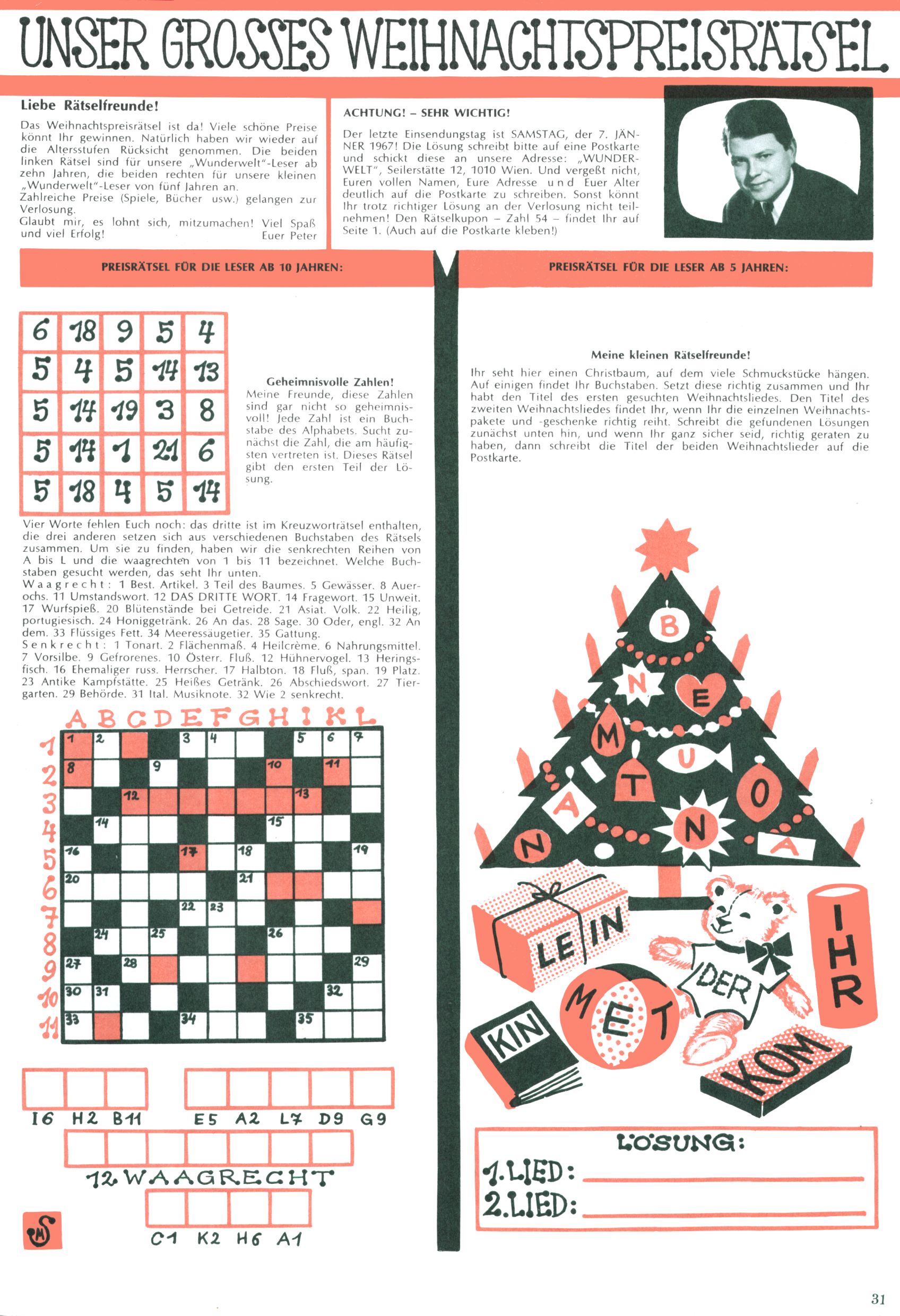 Die Wunderwelt im Festtagsgewand In den Sonderheften präsentierte sich die Wunderwelt wahrhaftig in Feiertagsstimmung. Mit wenigen Ausnahmen gab es pro Jahr drei Sonderhefte - zu Weihnachten bzw. im Advent, zu Ostern und in den Ferien im Sommer. Experimente mit Faschings- und Muttertagsheften hatten sich nicht bewährt. Selbst als es die Einzelhefte in der Krisensituation nach 1967 nicht mehr gab, wurde die Wunderwelt-Zeitung im Layout der Sonderhefte fortgesetzt: Zunächst mit 3 bis 5 und ab 1971 immerhin wieder mit 10-12 Heften pro Jahr. Die Weihnachts-, Oster- und Ferienhefte hatten naturgemäß verschiedene Schwerpunkte. Während im Sommer Spielen und Werken mit Material im Vordergrund stand, waren es zu Weihnachten Krippen und Adventhäuser; zu Ostern dann Erzählungen, Hasenstädte und Oster-Basteleien. Das bessere Papier der Sonderhefte erleichterte das Ausschneiden der insgesamt mehr als 1000 Papiermodelle erheblich. Die Sonderhefte waren vergleichsweise aufwändig gestaltet, aber auch ein wichtiges Zusatzgeschäft für die Zeitung. Die Kinder fieberten dem Erscheinungsdatum der jeweiligen Ausgabe nicht selten richtiggehend entgegen. Mit knapp 100 Seiten pro Jahr machten die Sonderhefte von der Menge her zwar nicht einmal ein Viertel aus, trugen aber zum Erscheinungsbild mindestens genauso viel bei wie die Standardhefte. Im Wesentlichen blieb das Layout der Sonderhefte über die Jahre hin unverändert. Mühselig wurde es, als man den Inhalt der Beiträge vorübergehend auf die Seiten gleichmäßig verteilte und die Kinder ermunterte, die Hefte in der Mitte zu zerschneiden. Die eine Hälfte enthielt dann etwa Erzählungen und Bastelvorschläge, der andere Teil der Zeitung Spielanleitungen. Zur übersichtlichkeit trugen diese Layoutversuche jedenfalls in keiner Weise bei und als besonderen Auswuchs gab es eine Zeitlang auf einer Seite oft mehrere Seitennummern, je nachdem, ob sich diese auf das Gesamtheft oder den herauszunehmenden und zu zerschneidenden Heftteil bezogen. Gegen Ende der 1950er Jahre kehrte man wieder zu einem ganzseitigen Layout zurück und Ideen wie ein Spiel-(Heft-im-)Heft gehörten der Vergangenheit an. In den Sonderheften experimentierte man dann noch ab Mitte der 1960er Jahre, als die Verkaufszahlen stark rückläufig waren, mit grundsätzlich neuen Darstellungsformen - weg vom Niedlich-Kitschigen und engagierte neue Grafikerinnen wie Gundi Groh und Hella Soyka. Den erhofften Erfolg brachte dies jedoch nicht mehr. |