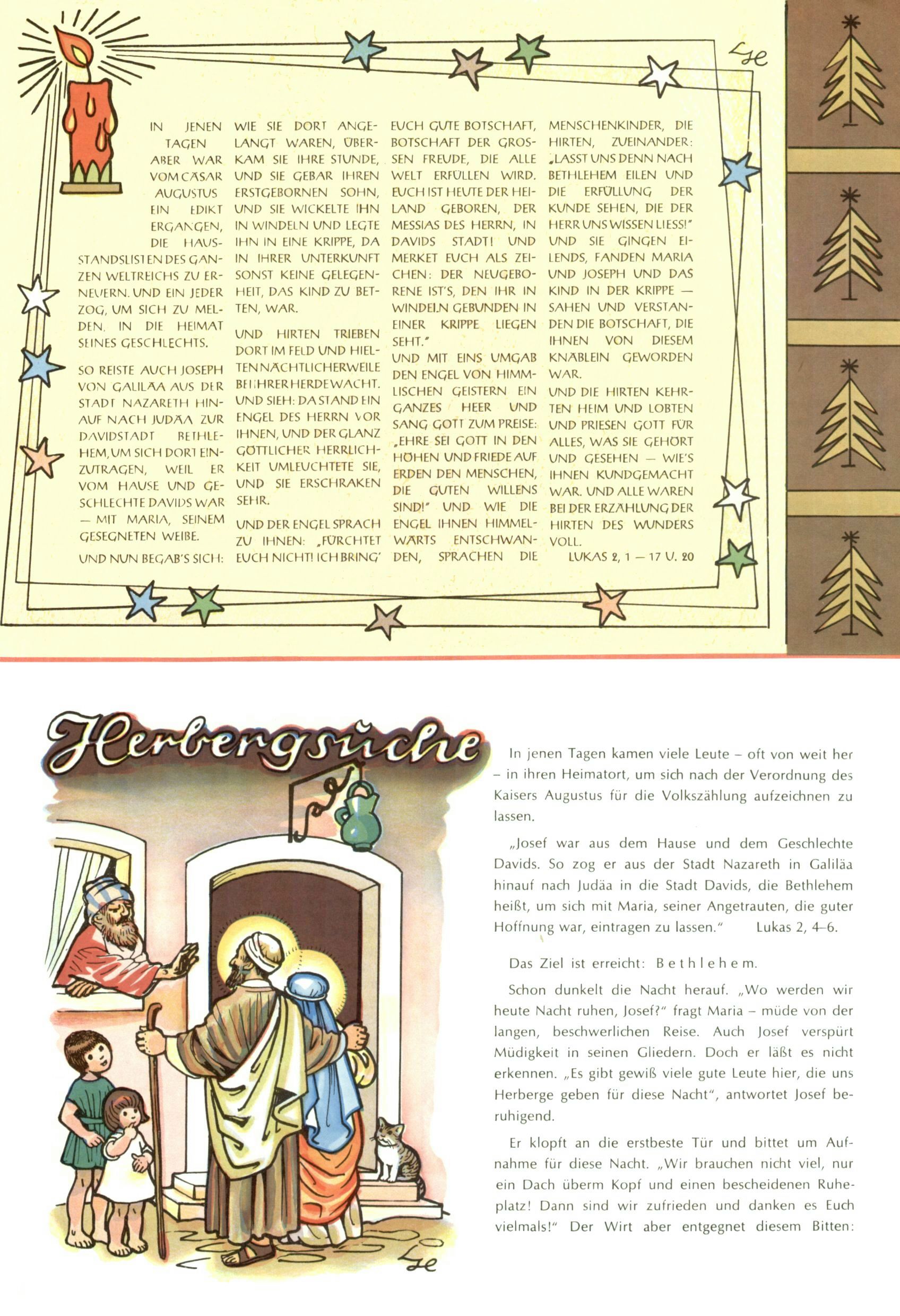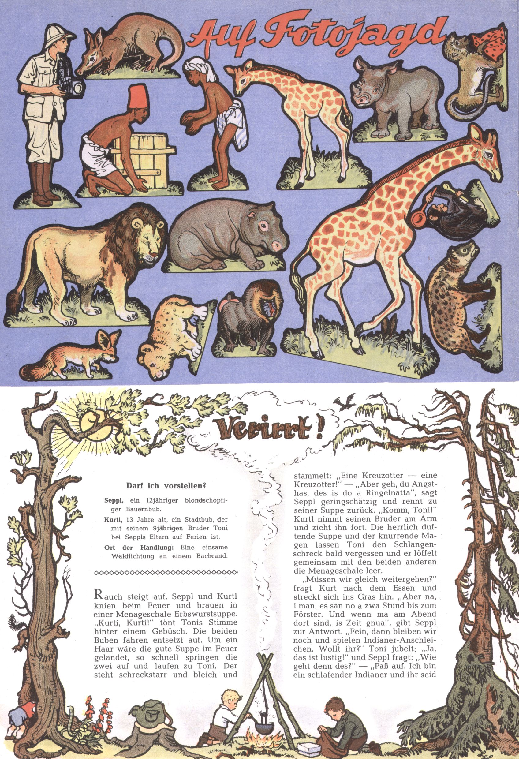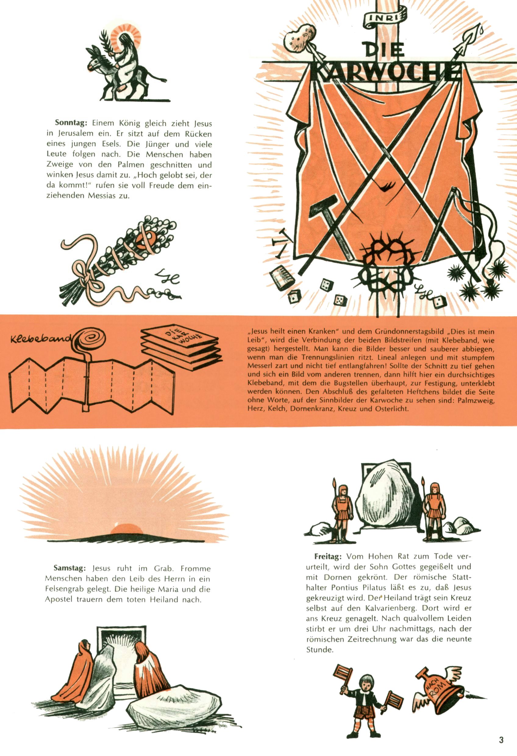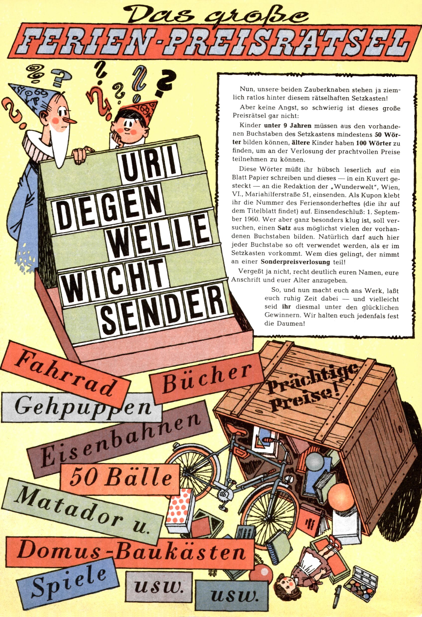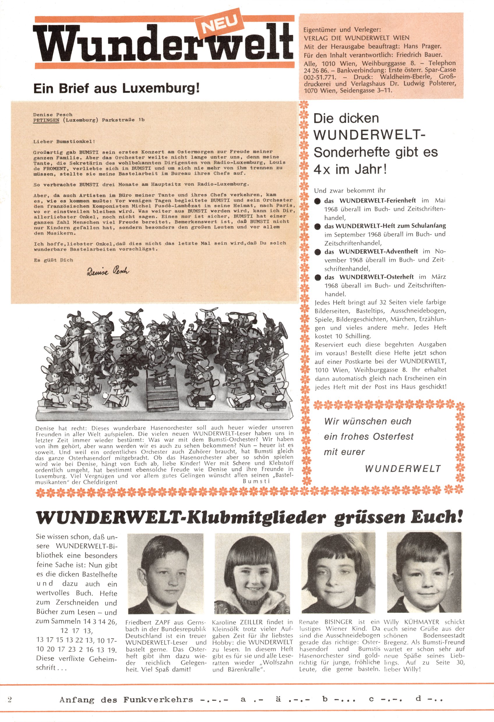 Die Wunderwelt im Festtagsgewand In den Sonderheften präsentierte sich die Wunderwelt wahrhaftig in Feiertagsstimmung. Mit wenigen Ausnahmen gab es pro Jahr drei Sonderhefte - zu Weihnachten bzw. im Advent, zu Ostern und in den Ferien im Sommer. Experimente mit Faschings- und Muttertagsheften hatten sich nicht bewährt. Selbst als es die Einzelhefte in der Krisensituation nach 1967 nicht mehr gab, wurde die Wunderwelt-Zeitung im Layout der Sonderhefte fortgesetzt: Zunächst mit 3 bis 5 und ab 1971 immerhin wieder mit 10-12 Heften pro Jahr. Die Weihnachts-, Oster- und Ferienhefte hatten naturgemäß verschiedene Schwerpunkte. Während im Sommer Spielen und Werken mit Material im Vordergrund stand, waren es zu Weihnachten Krippen und Adventhäuser; zu Ostern dann Erzählungen, Hasenstädte und Oster-Basteleien. Das bessere Papier der Sonderhefte erleichterte das Ausschneiden der insgesamt mehr als 1000 Papiermodelle erheblich. Die Sonderhefte waren vergleichsweise aufwändig gestaltet, aber auch ein wichtiges Zusatzgeschäft für die Zeitung. Die Kinder fieberten dem Erscheinungsdatum der jeweiligen Ausgabe nicht selten richtiggehend entgegen. Mit knapp 100 Seiten pro Jahr machten die Sonderhefte von der Menge her zwar nicht einmal ein Viertel aus, trugen aber zum Erscheinungsbild mindestens genauso viel bei wie die Standardhefte. Im Wesentlichen blieb das Layout der Sonderhefte über die Jahre hin unverändert. Mühselig wurde es, als man den Inhalt der Beiträge vorübergehend auf die Seiten gleichmäßig verteilte und die Kinder ermunterte, die Hefte in der Mitte zu zerschneiden. Die eine Hälfte enthielt dann etwa Erzählungen und Bastelvorschläge, der andere Teil der Zeitung Spielanleitungen. Zur übersichtlichkeit trugen diese Layoutversuche jedenfalls in keiner Weise bei und als besonderen Auswuchs gab es eine Zeitlang auf einer Seite oft mehrere Seitennummern, je nachdem, ob sich diese auf das Gesamtheft oder den herauszunehmenden und zu zerschneidenden Heftteil bezogen. Gegen Ende der 1950er Jahre kehrte man wieder zu einem ganzseitigen Layout zurück und Ideen wie ein Spiel-(Heft-im-)Heft gehörten der Vergangenheit an. In den Sonderheften experimentierte man dann noch ab Mitte der 1960er Jahre, als die Verkaufszahlen stark rückläufig waren, mit grundsätzlich neuen Darstellungsformen - weg vom Niedlich-Kitschigen und engagierte neue Grafikerinnen wie Gundi Groh und Hella Soyka. Den erhofften Erfolg brachte dies jedoch nicht mehr. |