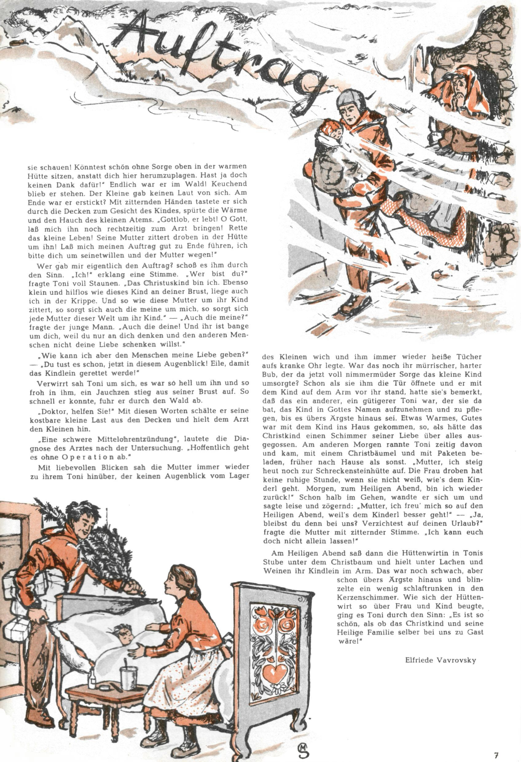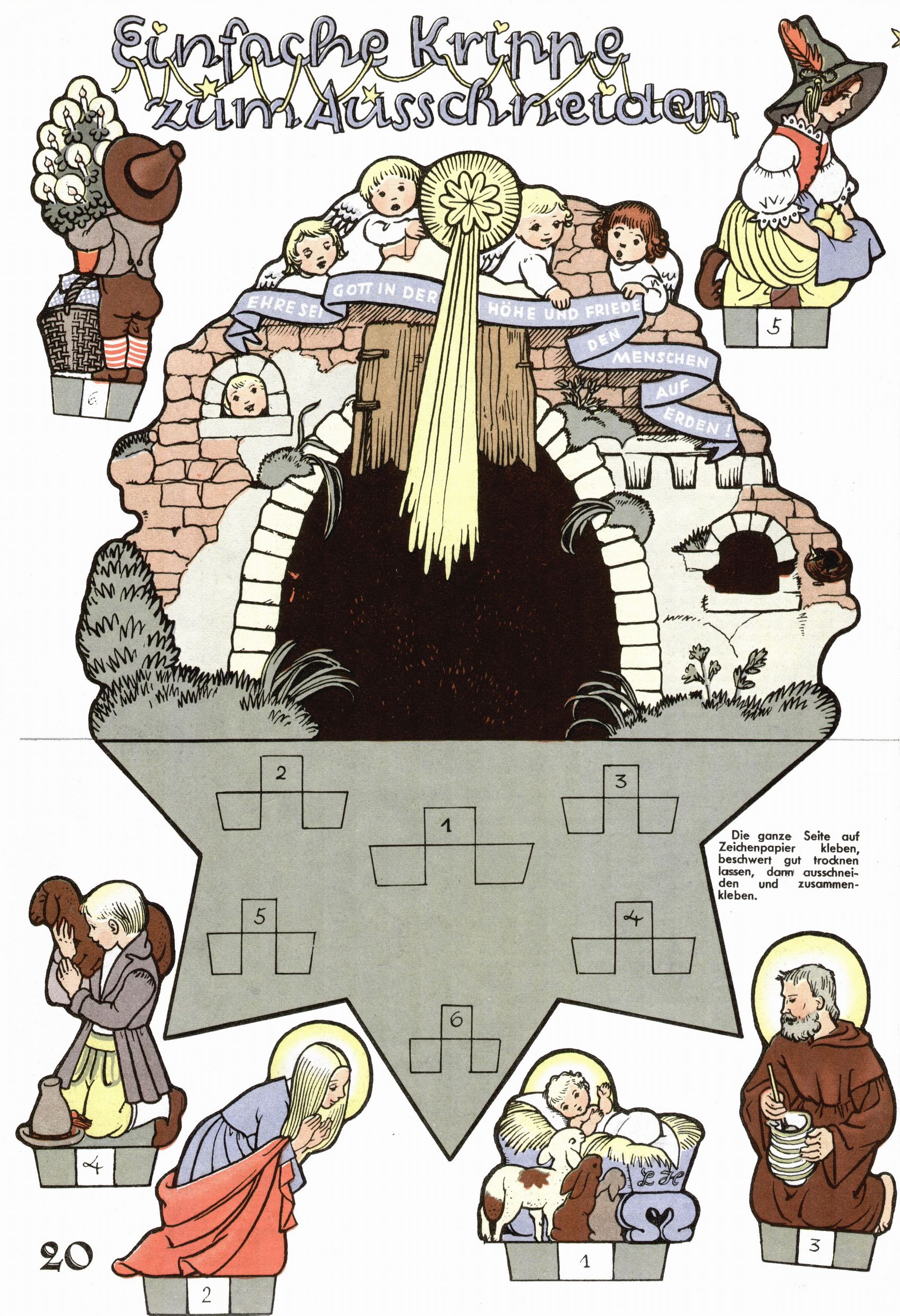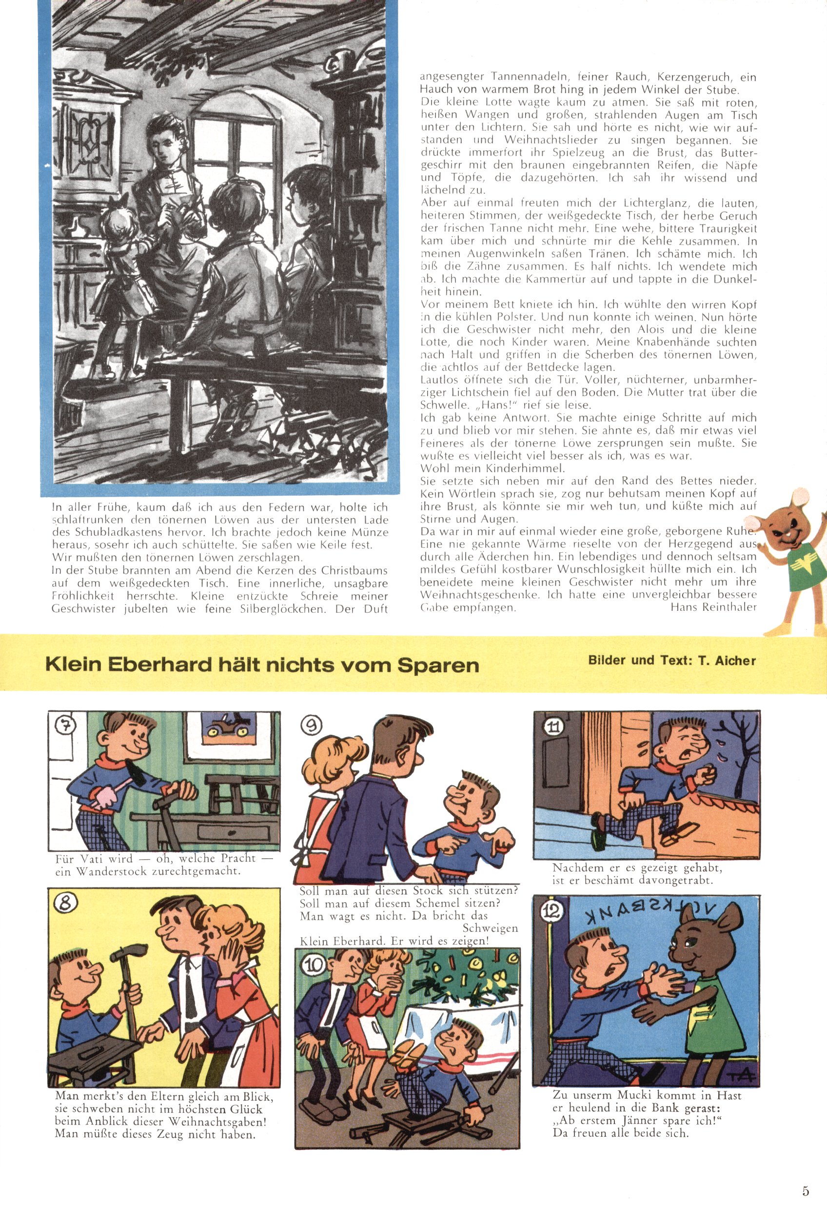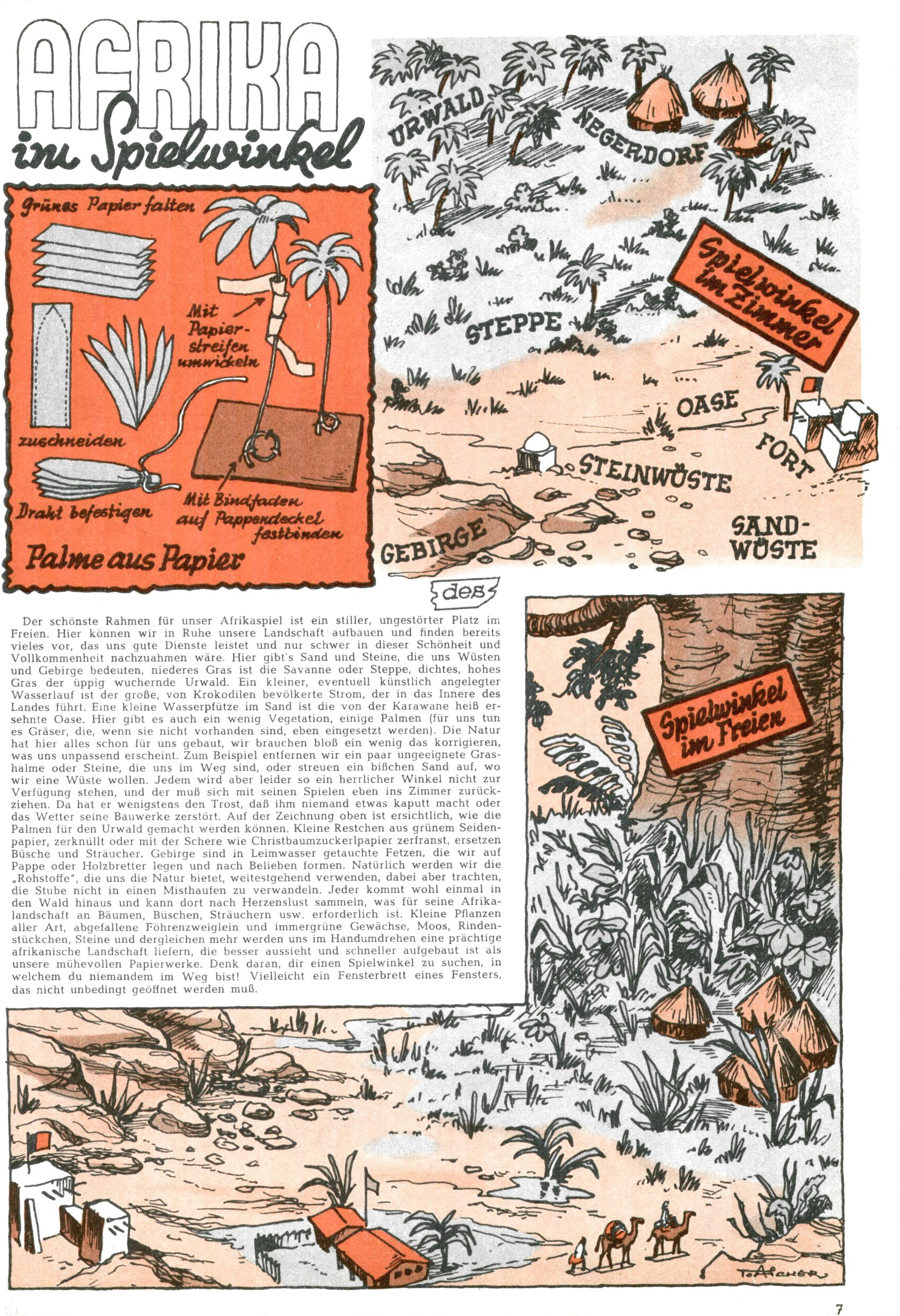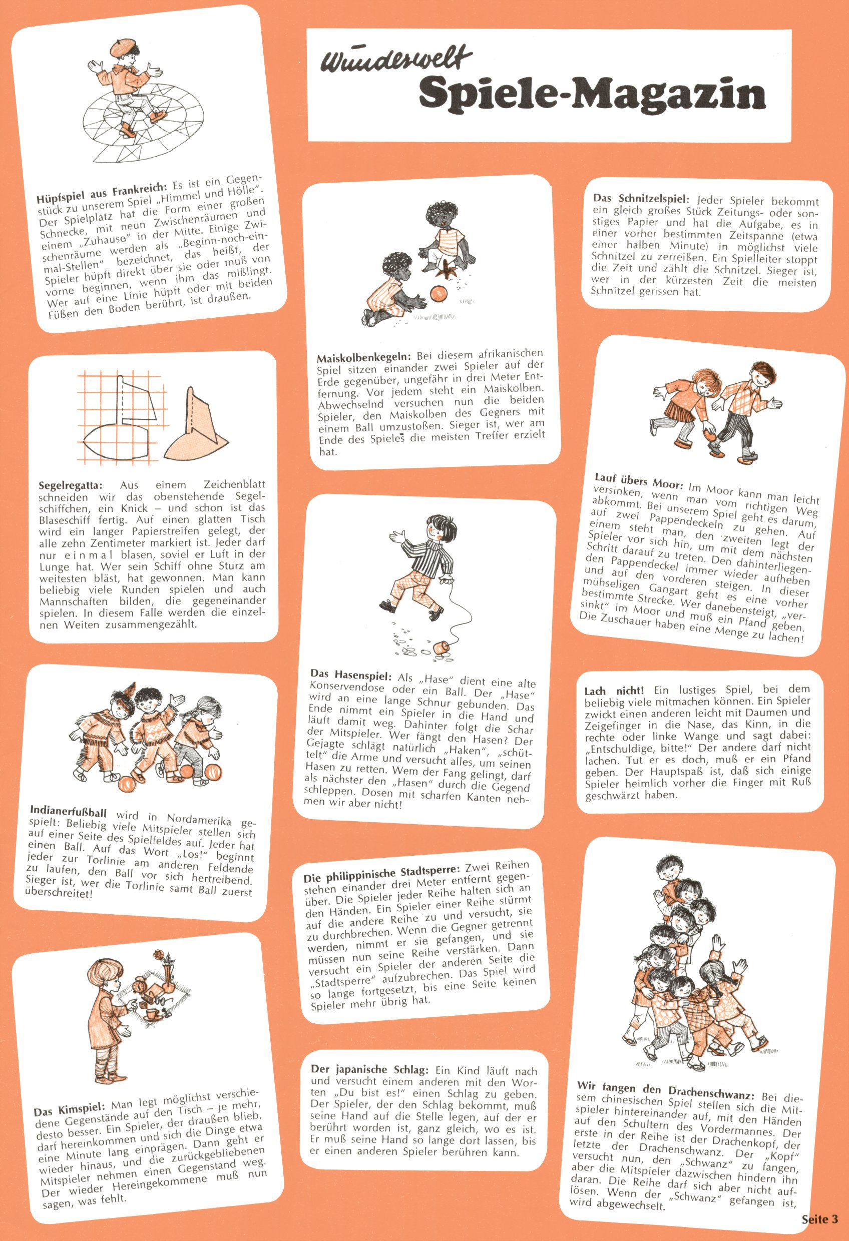 Die Wunderwelt im Festtagsgewand In den Sonderheften präsentierte sich die Wunderwelt wahrhaftig in Feiertagsstimmung. Mit wenigen Ausnahmen gab es pro Jahr drei Sonderhefte - zu Weihnachten bzw. im Advent, zu Ostern und in den Ferien im Sommer. Experimente mit Faschings- und Muttertagsheften hatten sich nicht bewährt. Selbst als es die Einzelhefte in der Krisensituation nach 1967 nicht mehr gab, wurde die Wunderwelt-Zeitung im Layout der Sonderhefte fortgesetzt: Zunächst mit 3 bis 5 und ab 1971 immerhin wieder mit 10-12 Heften pro Jahr. Die Weihnachts-, Oster- und Ferienhefte hatten naturgemäß verschiedene Schwerpunkte. Während im Sommer Spielen und Werken mit Material im Vordergrund stand, waren es zu Weihnachten Krippen und Adventhäuser; zu Ostern dann Erzählungen, Hasenstädte und Oster-Basteleien. Das bessere Papier der Sonderhefte erleichterte das Ausschneiden der insgesamt mehr als 1000 Papiermodelle erheblich. Die Sonderhefte waren vergleichsweise aufwändig gestaltet, aber auch ein wichtiges Zusatzgeschäft für die Zeitung. Die Kinder fieberten dem Erscheinungsdatum der jeweiligen Ausgabe nicht selten richtiggehend entgegen. Mit knapp 100 Seiten pro Jahr machten die Sonderhefte von der Menge her zwar nicht einmal ein Viertel aus, trugen aber zum Erscheinungsbild mindestens genauso viel bei wie die Standardhefte. Im Wesentlichen blieb das Layout der Sonderhefte über die Jahre hin unverändert. Mühselig wurde es, als man den Inhalt der Beiträge vorübergehend auf die Seiten gleichmäßig verteilte und die Kinder ermunterte, die Hefte in der Mitte zu zerschneiden. Die eine Hälfte enthielt dann etwa Erzählungen und Bastelvorschläge, der andere Teil der Zeitung Spielanleitungen. Zur übersichtlichkeit trugen diese Layoutversuche jedenfalls in keiner Weise bei und als besonderen Auswuchs gab es eine Zeitlang auf einer Seite oft mehrere Seitennummern, je nachdem, ob sich diese auf das Gesamtheft oder den herauszunehmenden und zu zerschneidenden Heftteil bezogen. Gegen Ende der 1950er Jahre kehrte man wieder zu einem ganzseitigen Layout zurück und Ideen wie ein Spiel-(Heft-im-)Heft gehörten der Vergangenheit an. In den Sonderheften experimentierte man dann noch ab Mitte der 1960er Jahre, als die Verkaufszahlen stark rückläufig waren, mit grundsätzlich neuen Darstellungsformen - weg vom Niedlich-Kitschigen und engagierte neue Grafikerinnen wie Gundi Groh und Hella Soyka. Den erhofften Erfolg brachte dies jedoch nicht mehr. |