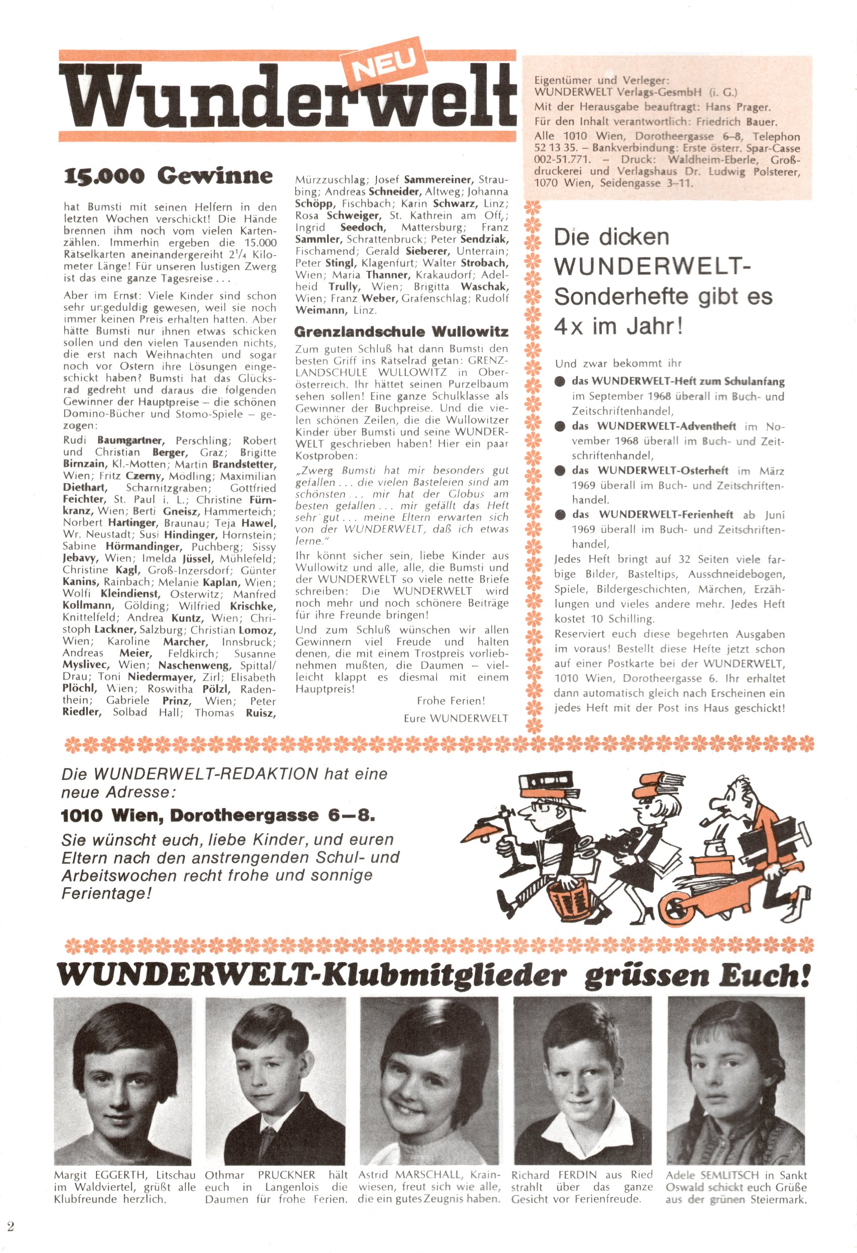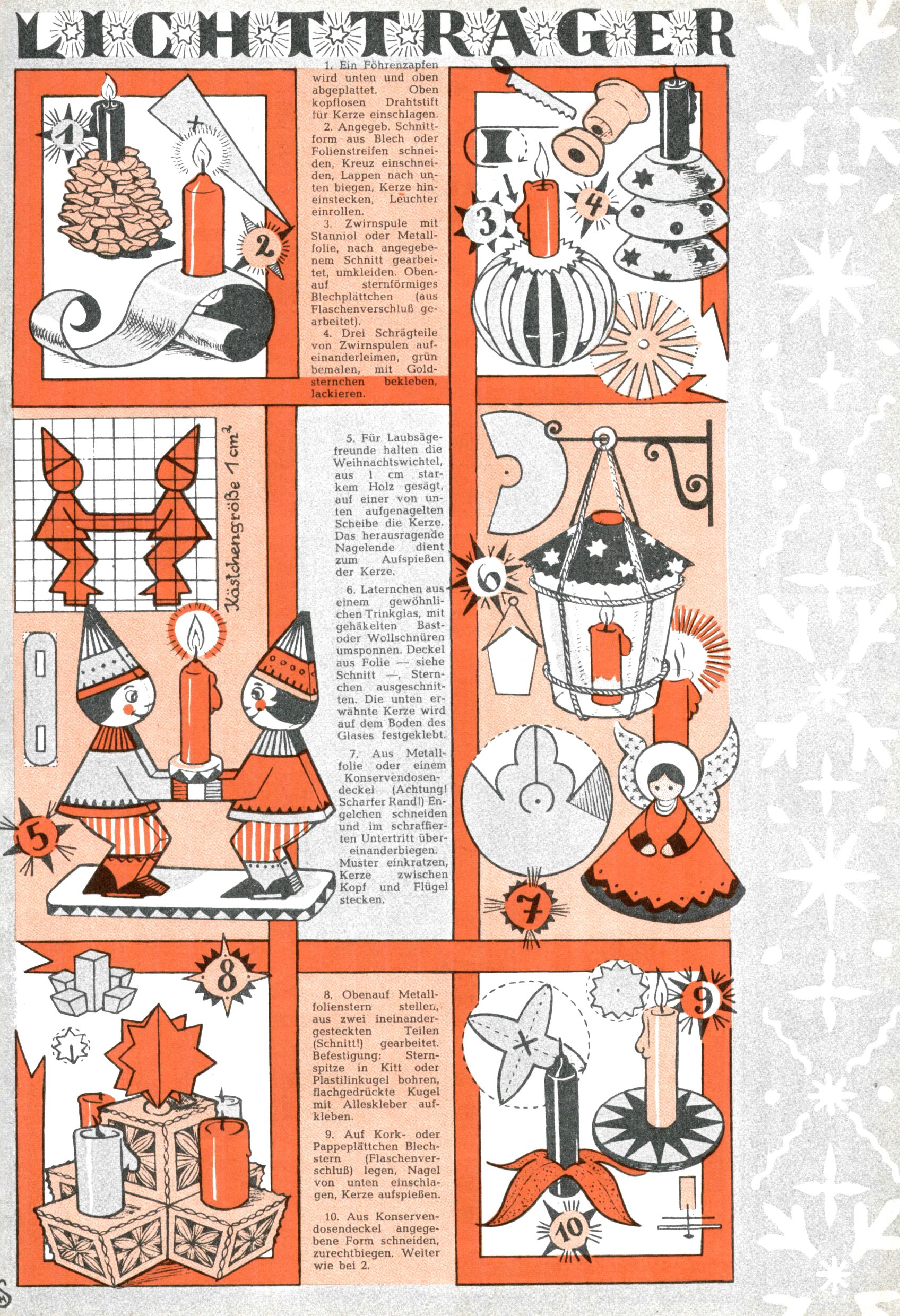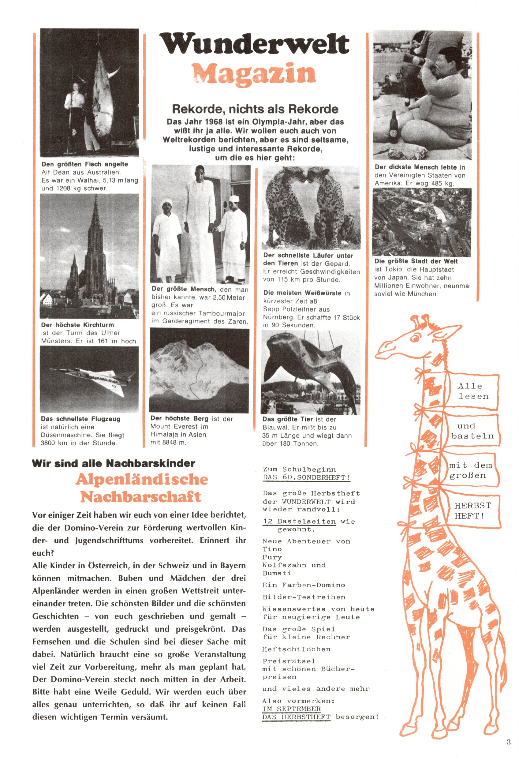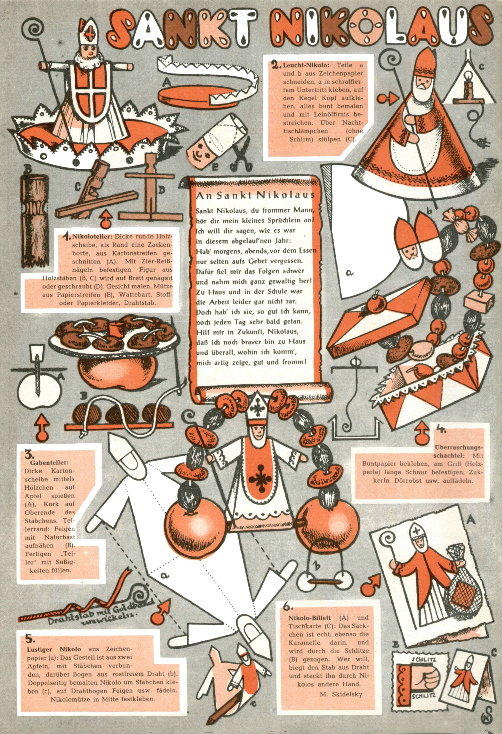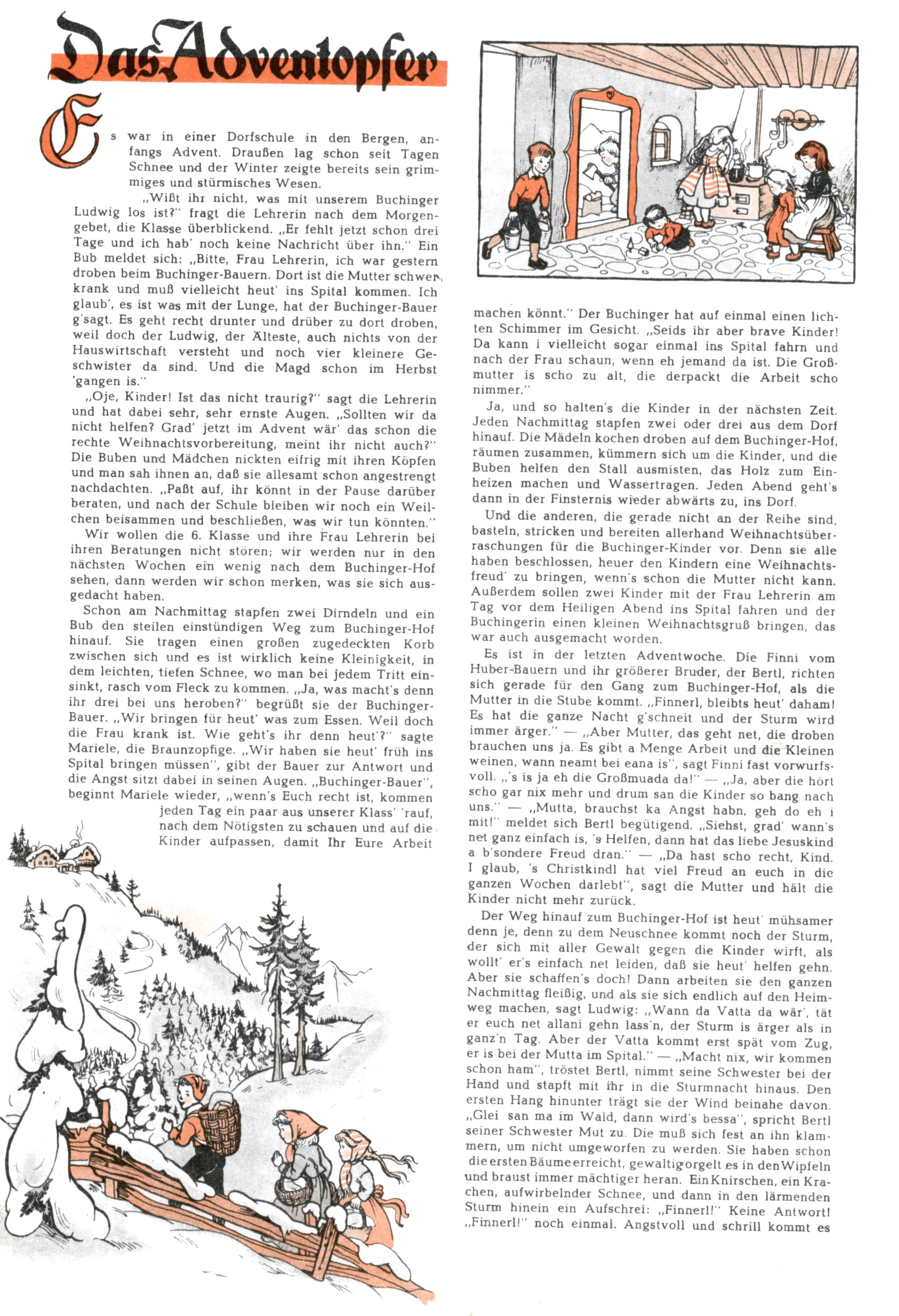 Die Wunderwelt im Festtagsgewand In den Sonderheften präsentierte sich die Wunderwelt wahrhaftig in Feiertagsstimmung. Mit wenigen Ausnahmen gab es pro Jahr drei Sonderhefte - zu Weihnachten bzw. im Advent, zu Ostern und in den Ferien im Sommer. Experimente mit Faschings- und Muttertagsheften hatten sich nicht bewährt. Selbst als es die Einzelhefte in der Krisensituation nach 1967 nicht mehr gab, wurde die Wunderwelt-Zeitung im Layout der Sonderhefte fortgesetzt: Zunächst mit 3 bis 5 und ab 1971 immerhin wieder mit 10-12 Heften pro Jahr. Die Weihnachts-, Oster- und Ferienhefte hatten naturgemäß verschiedene Schwerpunkte. Während im Sommer Spielen und Werken mit Material im Vordergrund stand, waren es zu Weihnachten Krippen und Adventhäuser; zu Ostern dann Erzählungen, Hasenstädte und Oster-Basteleien. Das bessere Papier der Sonderhefte erleichterte das Ausschneiden der insgesamt mehr als 1000 Papiermodelle erheblich. Die Sonderhefte waren vergleichsweise aufwändig gestaltet, aber auch ein wichtiges Zusatzgeschäft für die Zeitung. Die Kinder fieberten dem Erscheinungsdatum der jeweiligen Ausgabe nicht selten richtiggehend entgegen. Mit knapp 100 Seiten pro Jahr machten die Sonderhefte von der Menge her zwar nicht einmal ein Viertel aus, trugen aber zum Erscheinungsbild mindestens genauso viel bei wie die Standardhefte. Im Wesentlichen blieb das Layout der Sonderhefte über die Jahre hin unverändert. Mühselig wurde es, als man den Inhalt der Beiträge vorübergehend auf die Seiten gleichmäßig verteilte und die Kinder ermunterte, die Hefte in der Mitte zu zerschneiden. Die eine Hälfte enthielt dann etwa Erzählungen und Bastelvorschläge, der andere Teil der Zeitung Spielanleitungen. Zur übersichtlichkeit trugen diese Layoutversuche jedenfalls in keiner Weise bei und als besonderen Auswuchs gab es eine Zeitlang auf einer Seite oft mehrere Seitennummern, je nachdem, ob sich diese auf das Gesamtheft oder den herauszunehmenden und zu zerschneidenden Heftteil bezogen. Gegen Ende der 1950er Jahre kehrte man wieder zu einem ganzseitigen Layout zurück und Ideen wie ein Spiel-(Heft-im-)Heft gehörten der Vergangenheit an. In den Sonderheften experimentierte man dann noch ab Mitte der 1960er Jahre, als die Verkaufszahlen stark rückläufig waren, mit grundsätzlich neuen Darstellungsformen - weg vom Niedlich-Kitschigen und engagierte neue Grafikerinnen wie Gundi Groh und Hella Soyka. Den erhofften Erfolg brachte dies jedoch nicht mehr. |
