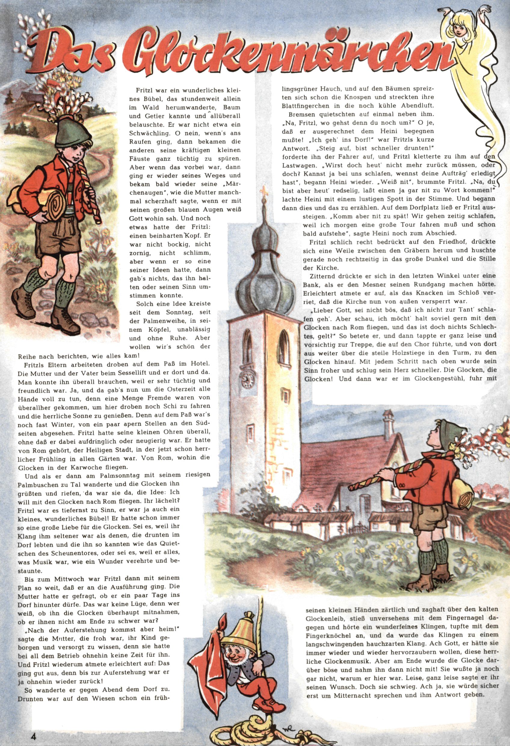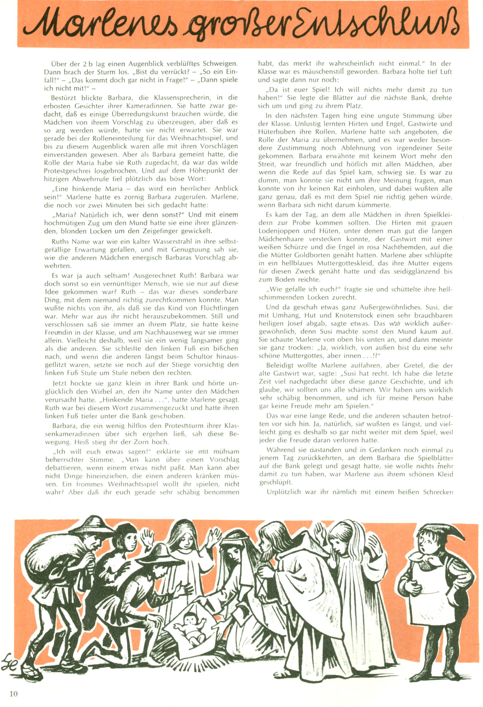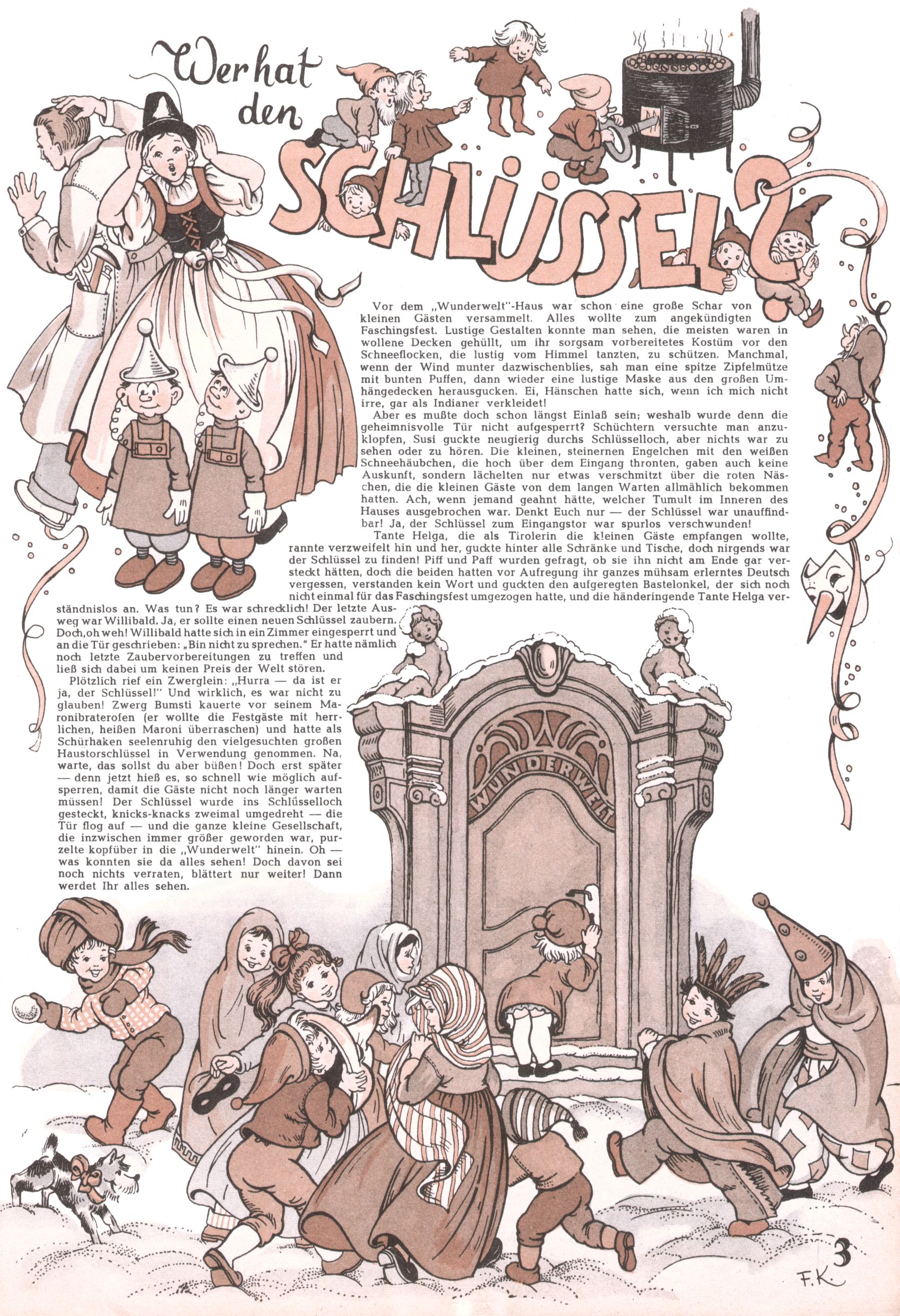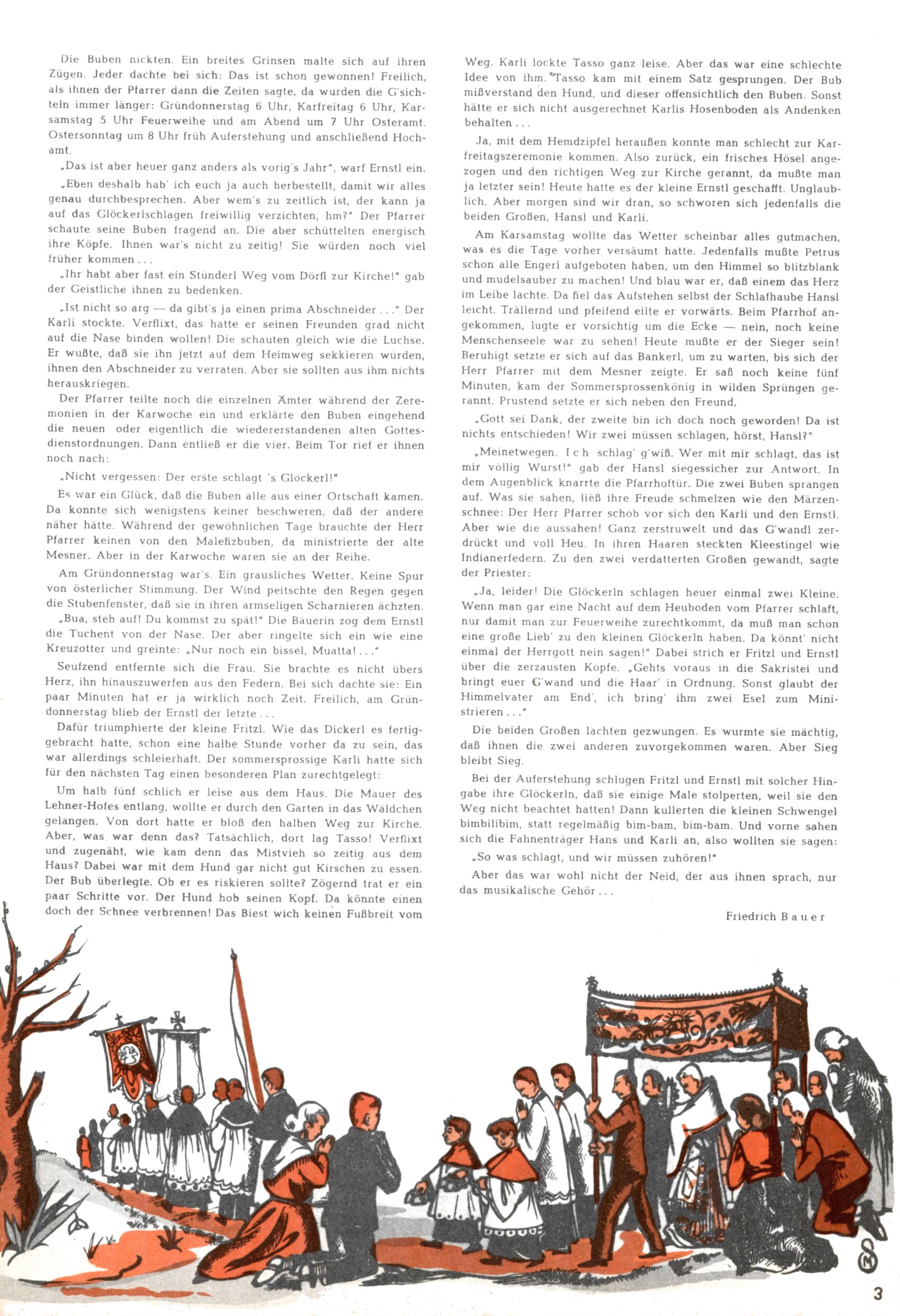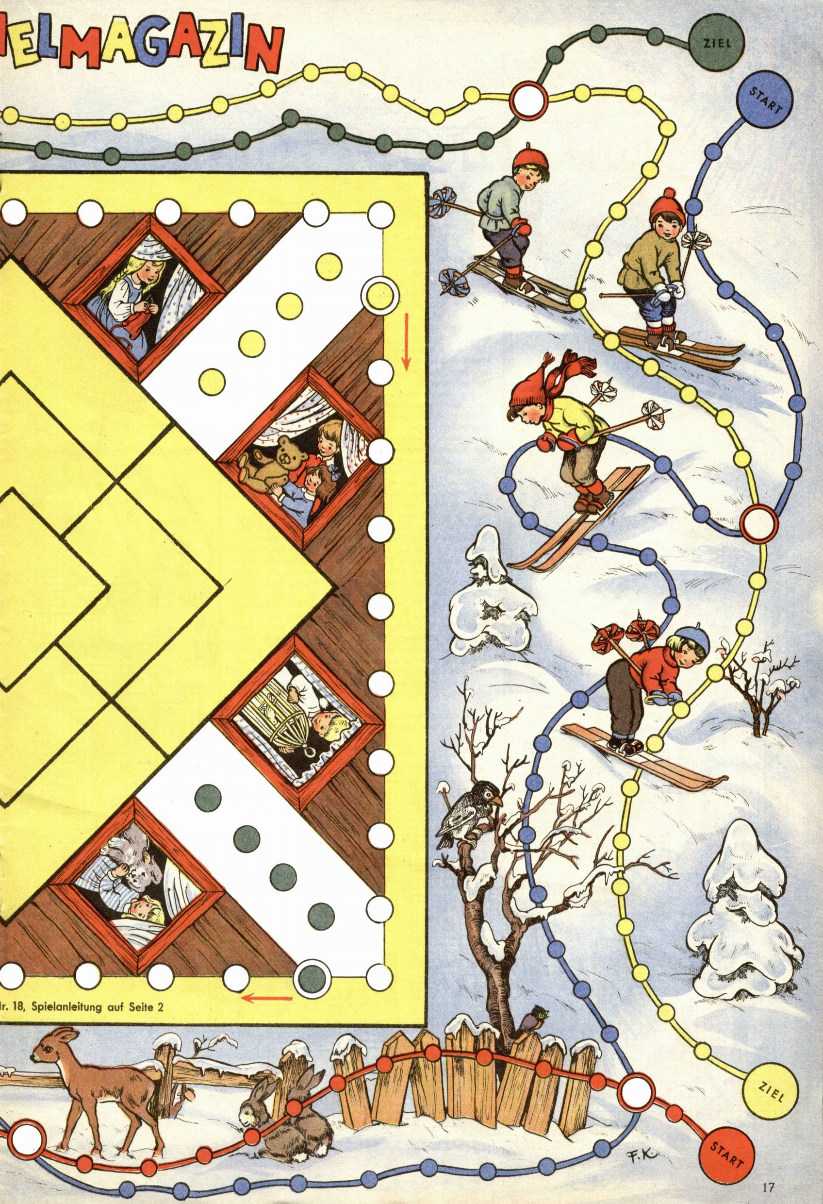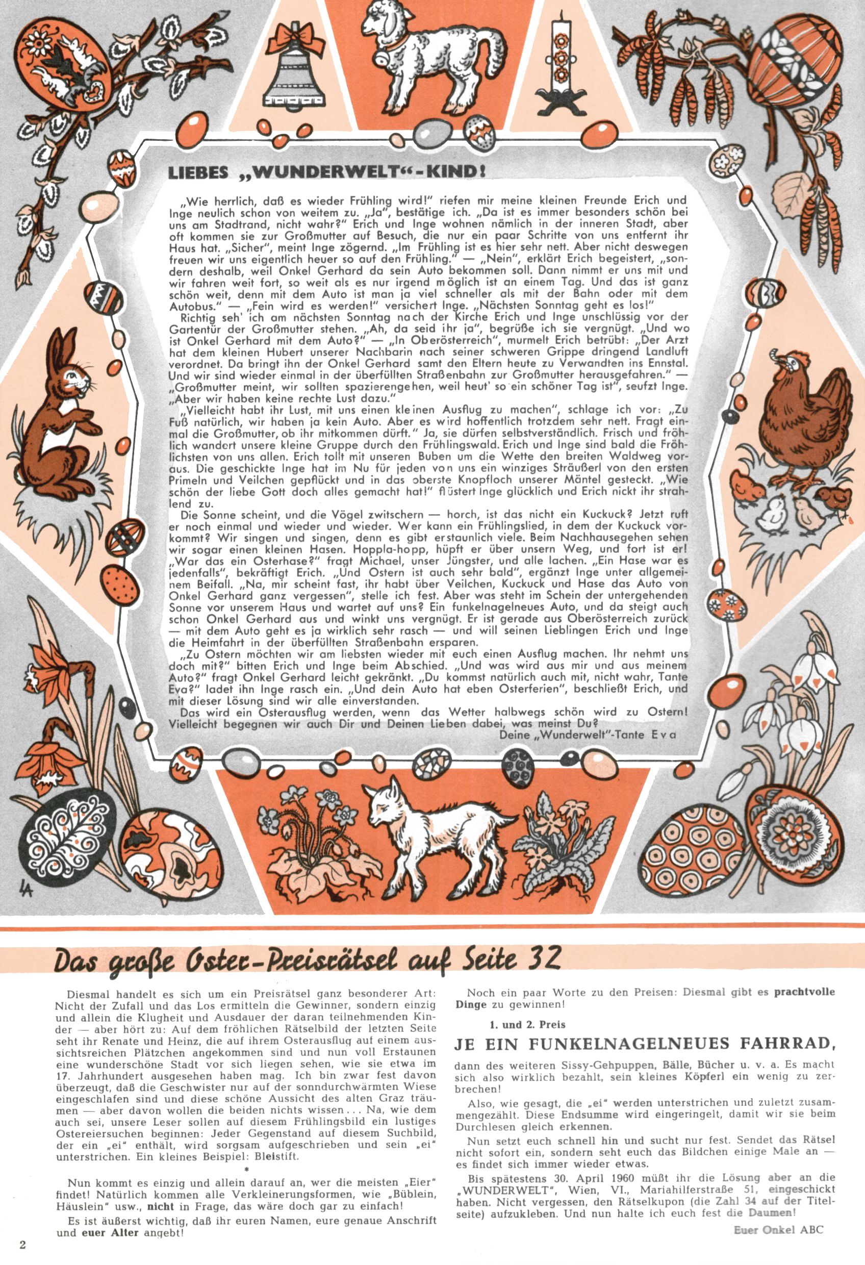 Die Wunderwelt im Festtagsgewand In den Sonderheften präsentierte sich die Wunderwelt wahrhaftig in Feiertagsstimmung. Mit wenigen Ausnahmen gab es pro Jahr drei Sonderhefte - zu Weihnachten bzw. im Advent, zu Ostern und in den Ferien im Sommer. Experimente mit Faschings- und Muttertagsheften hatten sich nicht bewährt. Selbst als es die Einzelhefte in der Krisensituation nach 1967 nicht mehr gab, wurde die Wunderwelt-Zeitung im Layout der Sonderhefte fortgesetzt: Zunächst mit 3 bis 5 und ab 1971 immerhin wieder mit 10-12 Heften pro Jahr. Die Weihnachts-, Oster- und Ferienhefte hatten naturgemäß verschiedene Schwerpunkte. Während im Sommer Spielen und Werken mit Material im Vordergrund stand, waren es zu Weihnachten Krippen und Adventhäuser; zu Ostern dann Erzählungen, Hasenstädte und Oster-Basteleien. Das bessere Papier der Sonderhefte erleichterte das Ausschneiden der insgesamt mehr als 1000 Papiermodelle erheblich. Die Sonderhefte waren vergleichsweise aufwändig gestaltet, aber auch ein wichtiges Zusatzgeschäft für die Zeitung. Die Kinder fieberten dem Erscheinungsdatum der jeweiligen Ausgabe nicht selten richtiggehend entgegen. Mit knapp 100 Seiten pro Jahr machten die Sonderhefte von der Menge her zwar nicht einmal ein Viertel aus, trugen aber zum Erscheinungsbild mindestens genauso viel bei wie die Standardhefte. Im Wesentlichen blieb das Layout der Sonderhefte über die Jahre hin unverändert. Mühselig wurde es, als man den Inhalt der Beiträge vorübergehend auf die Seiten gleichmäßig verteilte und die Kinder ermunterte, die Hefte in der Mitte zu zerschneiden. Die eine Hälfte enthielt dann etwa Erzählungen und Bastelvorschläge, der andere Teil der Zeitung Spielanleitungen. Zur übersichtlichkeit trugen diese Layoutversuche jedenfalls in keiner Weise bei und als besonderen Auswuchs gab es eine Zeitlang auf einer Seite oft mehrere Seitennummern, je nachdem, ob sich diese auf das Gesamtheft oder den herauszunehmenden und zu zerschneidenden Heftteil bezogen. Gegen Ende der 1950er Jahre kehrte man wieder zu einem ganzseitigen Layout zurück und Ideen wie ein Spiel-(Heft-im-)Heft gehörten der Vergangenheit an. In den Sonderheften experimentierte man dann noch ab Mitte der 1960er Jahre, als die Verkaufszahlen stark rückläufig waren, mit grundsätzlich neuen Darstellungsformen - weg vom Niedlich-Kitschigen und engagierte neue Grafikerinnen wie Gundi Groh und Hella Soyka. Den erhofften Erfolg brachte dies jedoch nicht mehr. |