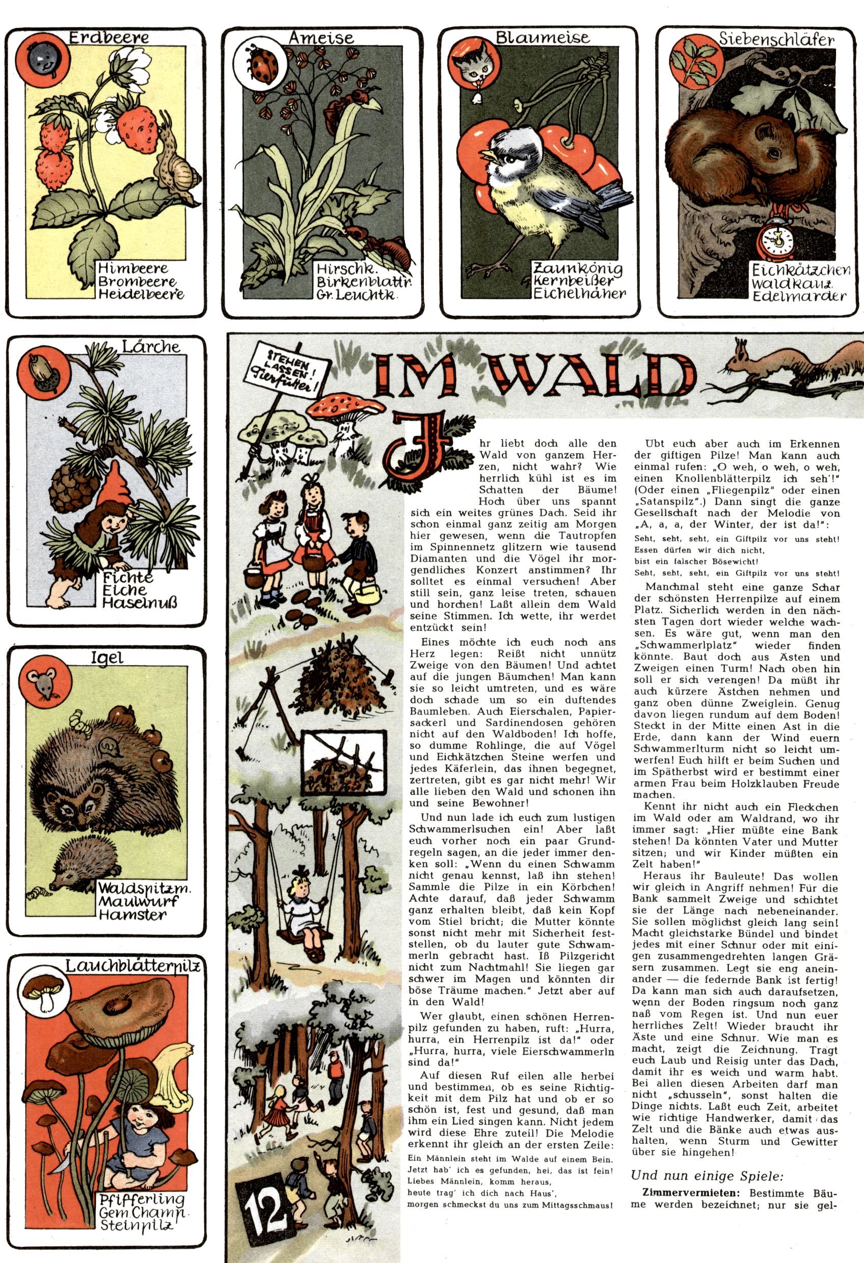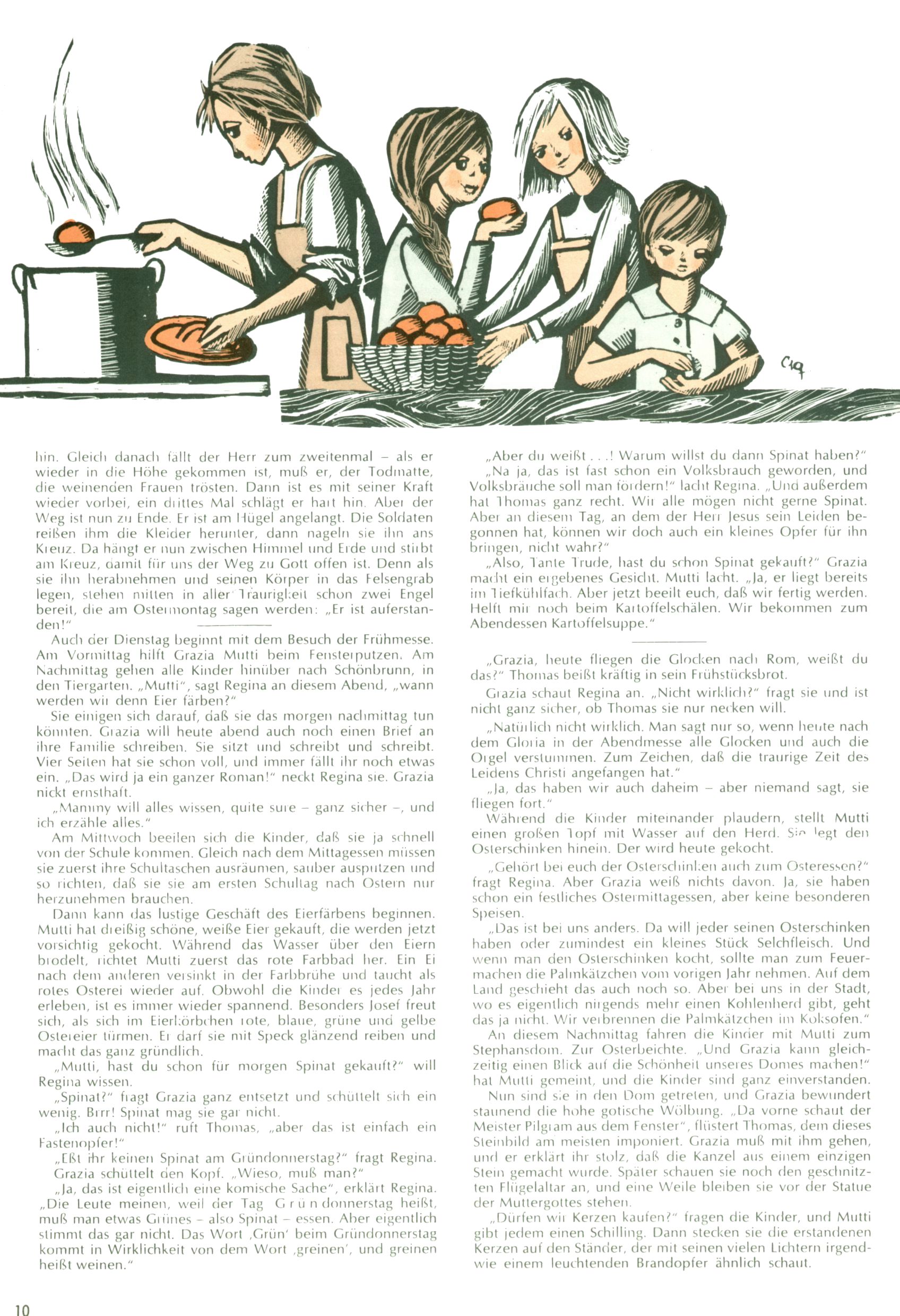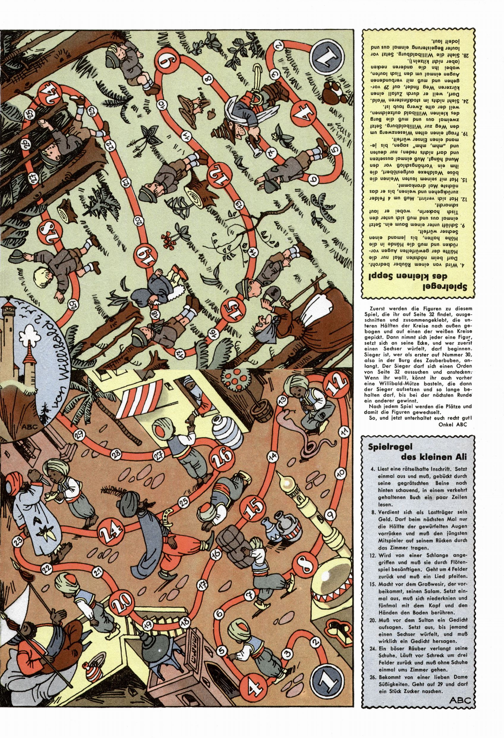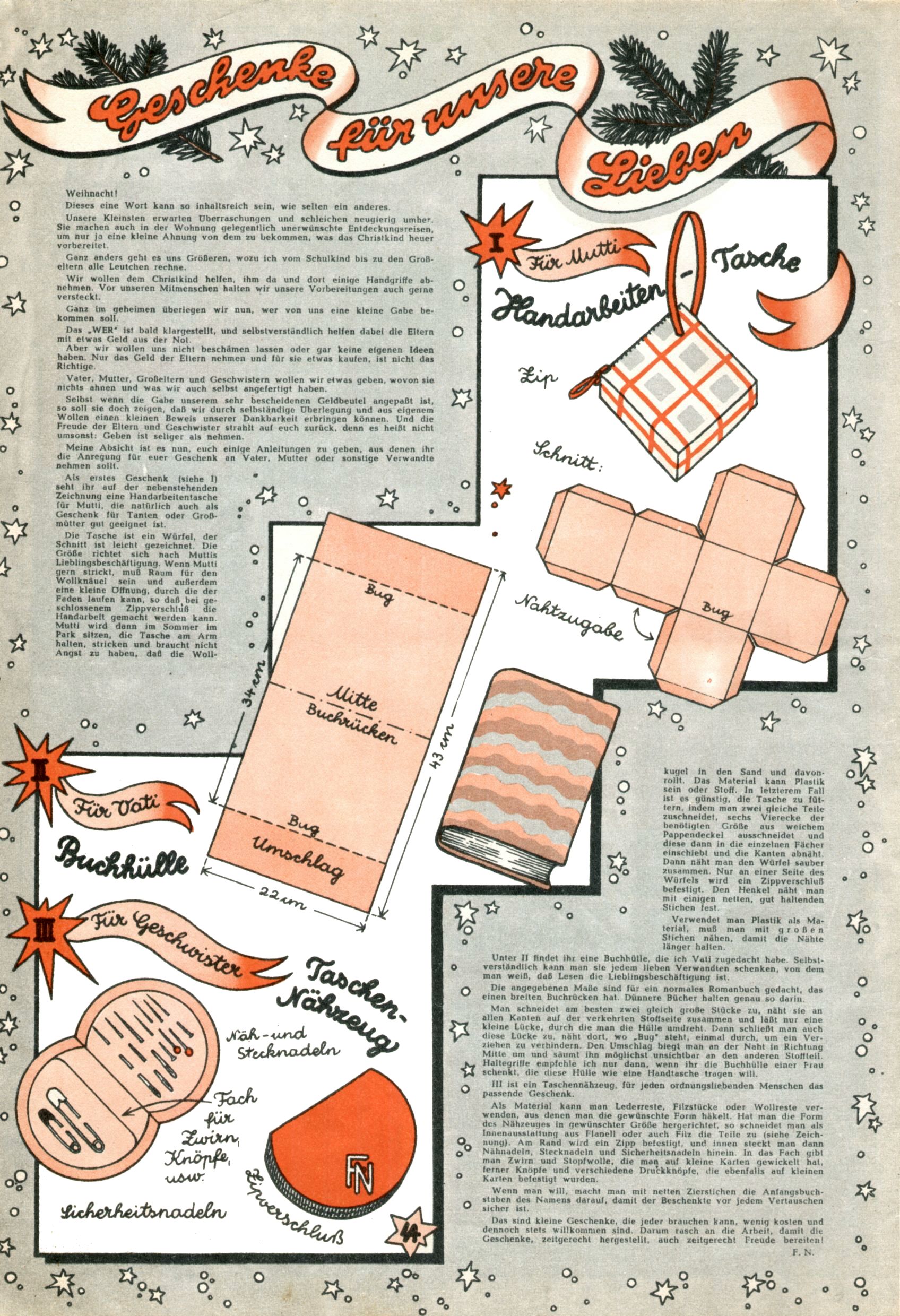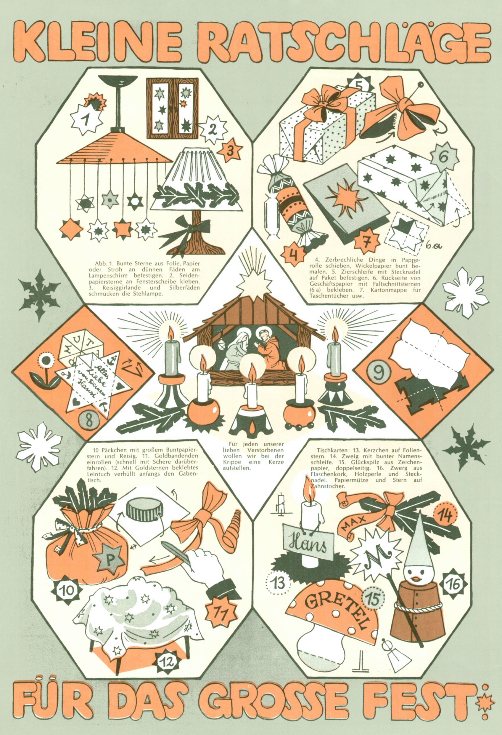 Die Wunderwelt im Festtagsgewand In den Sonderheften präsentierte sich die Wunderwelt wahrhaftig in Feiertagsstimmung. Mit wenigen Ausnahmen gab es pro Jahr drei Sonderhefte - zu Weihnachten bzw. im Advent, zu Ostern und in den Ferien im Sommer. Experimente mit Faschings- und Muttertagsheften hatten sich nicht bewährt. Selbst als es die Einzelhefte in der Krisensituation nach 1967 nicht mehr gab, wurde die Wunderwelt-Zeitung im Layout der Sonderhefte fortgesetzt: Zunächst mit 3 bis 5 und ab 1971 immerhin wieder mit 10-12 Heften pro Jahr. Die Weihnachts-, Oster- und Ferienhefte hatten naturgemäß verschiedene Schwerpunkte. Während im Sommer Spielen und Werken mit Material im Vordergrund stand, waren es zu Weihnachten Krippen und Adventhäuser; zu Ostern dann Erzählungen, Hasenstädte und Oster-Basteleien. Das bessere Papier der Sonderhefte erleichterte das Ausschneiden der insgesamt mehr als 1000 Papiermodelle erheblich. Die Sonderhefte waren vergleichsweise aufwändig gestaltet, aber auch ein wichtiges Zusatzgeschäft für die Zeitung. Die Kinder fieberten dem Erscheinungsdatum der jeweiligen Ausgabe nicht selten richtiggehend entgegen. Mit knapp 100 Seiten pro Jahr machten die Sonderhefte von der Menge her zwar nicht einmal ein Viertel aus, trugen aber zum Erscheinungsbild mindestens genauso viel bei wie die Standardhefte. Im Wesentlichen blieb das Layout der Sonderhefte über die Jahre hin unverändert. Mühselig wurde es, als man den Inhalt der Beiträge vorübergehend auf die Seiten gleichmäßig verteilte und die Kinder ermunterte, die Hefte in der Mitte zu zerschneiden. Die eine Hälfte enthielt dann etwa Erzählungen und Bastelvorschläge, der andere Teil der Zeitung Spielanleitungen. Zur übersichtlichkeit trugen diese Layoutversuche jedenfalls in keiner Weise bei und als besonderen Auswuchs gab es eine Zeitlang auf einer Seite oft mehrere Seitennummern, je nachdem, ob sich diese auf das Gesamtheft oder den herauszunehmenden und zu zerschneidenden Heftteil bezogen. Gegen Ende der 1950er Jahre kehrte man wieder zu einem ganzseitigen Layout zurück und Ideen wie ein Spiel-(Heft-im-)Heft gehörten der Vergangenheit an. In den Sonderheften experimentierte man dann noch ab Mitte der 1960er Jahre, als die Verkaufszahlen stark rückläufig waren, mit grundsätzlich neuen Darstellungsformen - weg vom Niedlich-Kitschigen und engagierte neue Grafikerinnen wie Gundi Groh und Hella Soyka. Den erhofften Erfolg brachte dies jedoch nicht mehr. |
