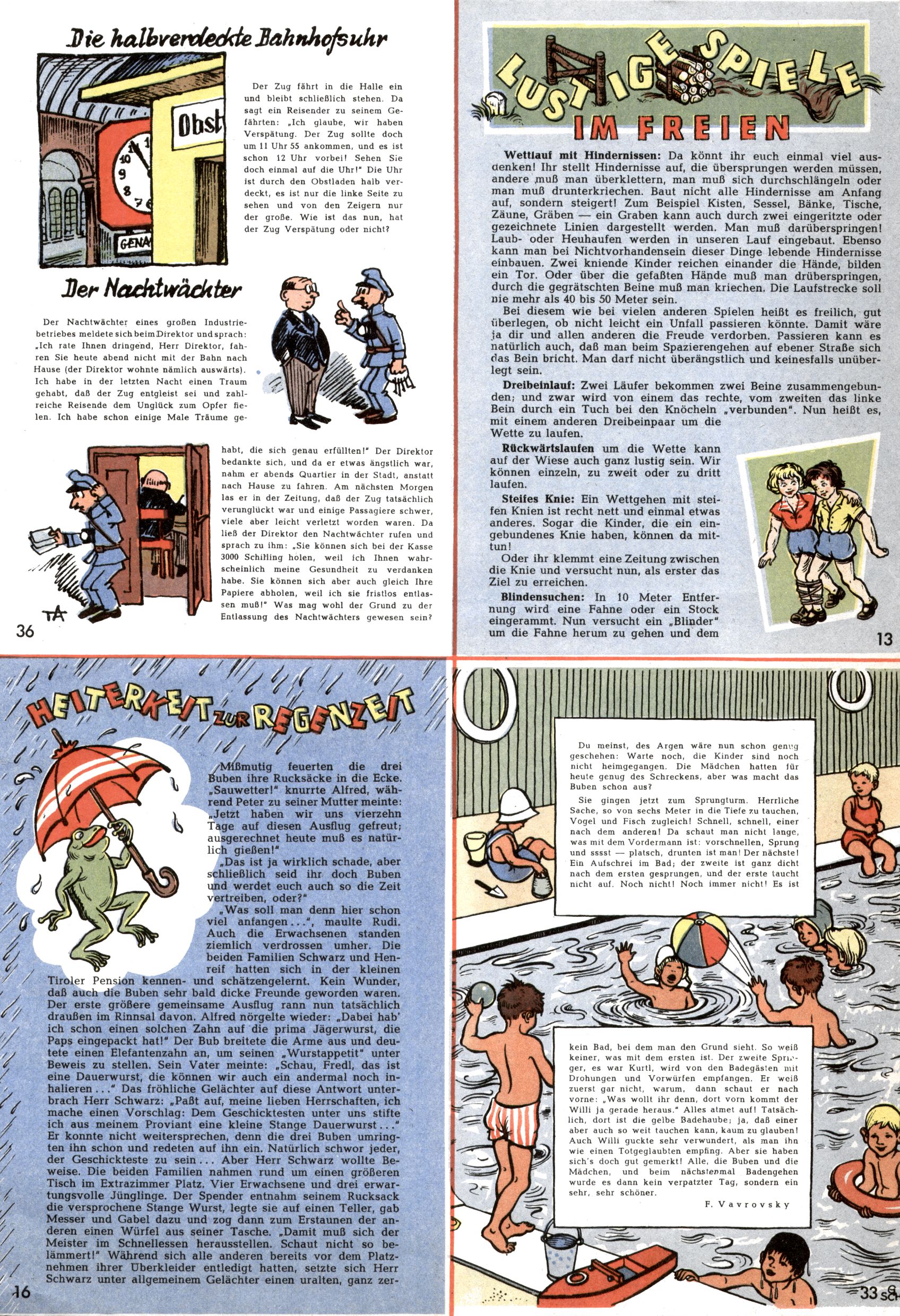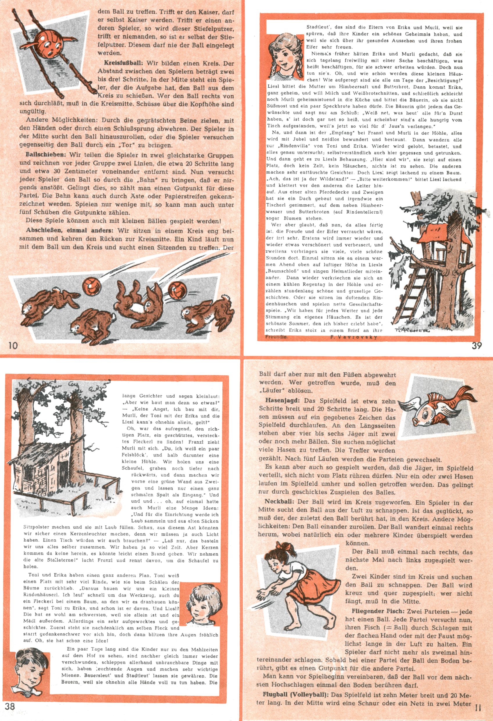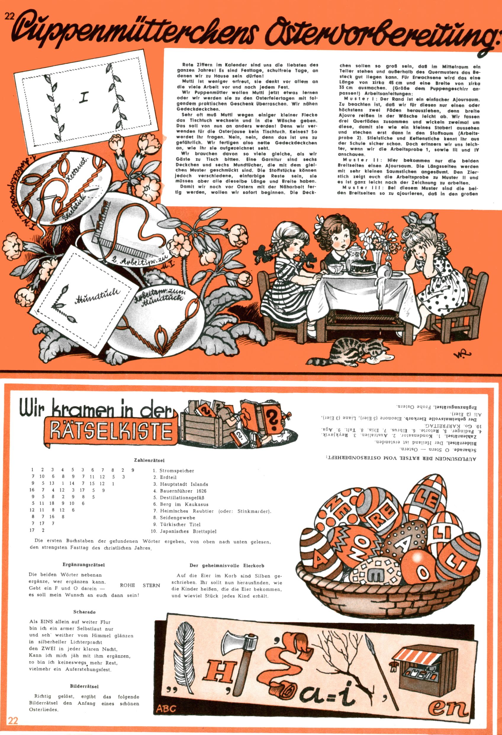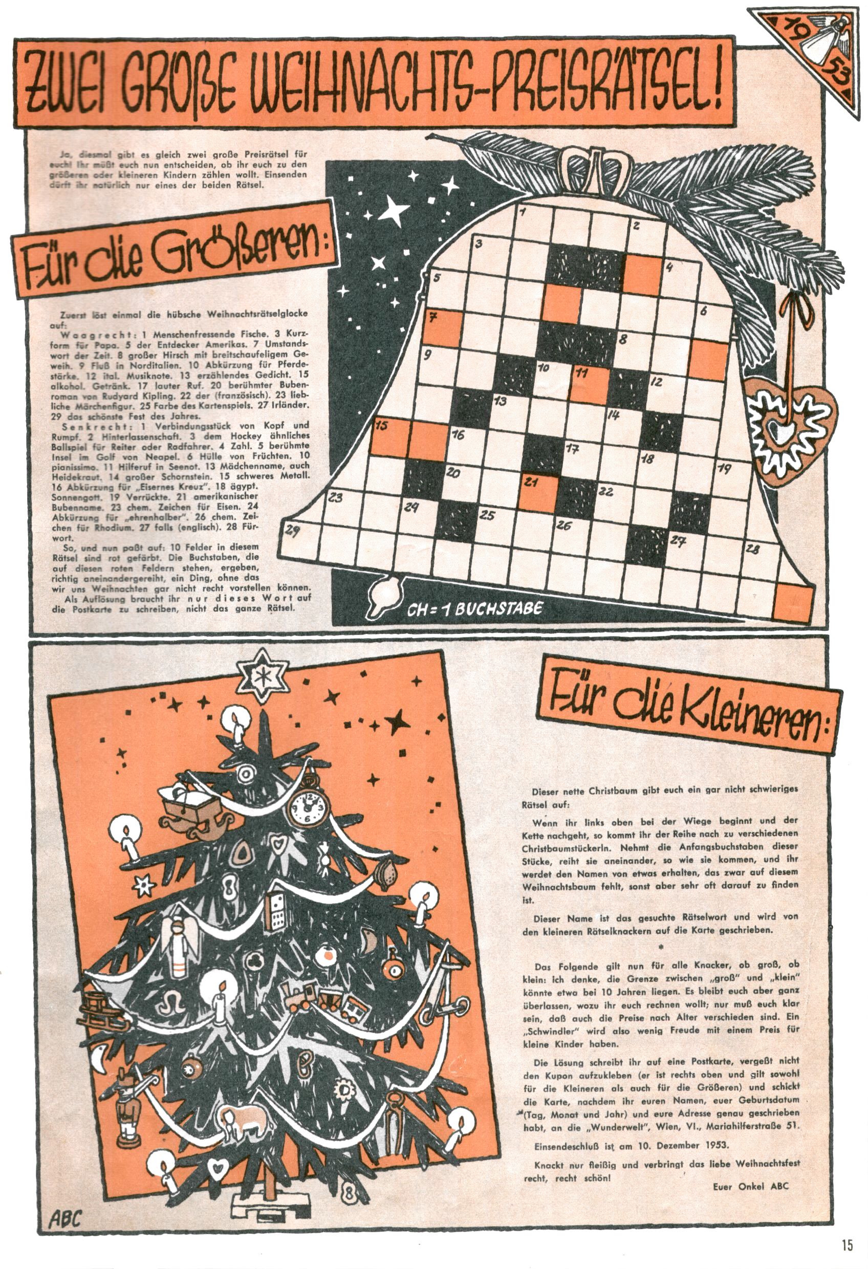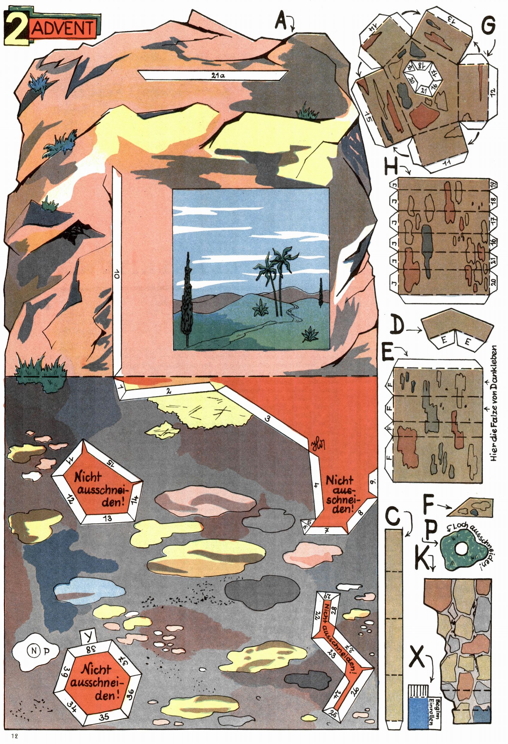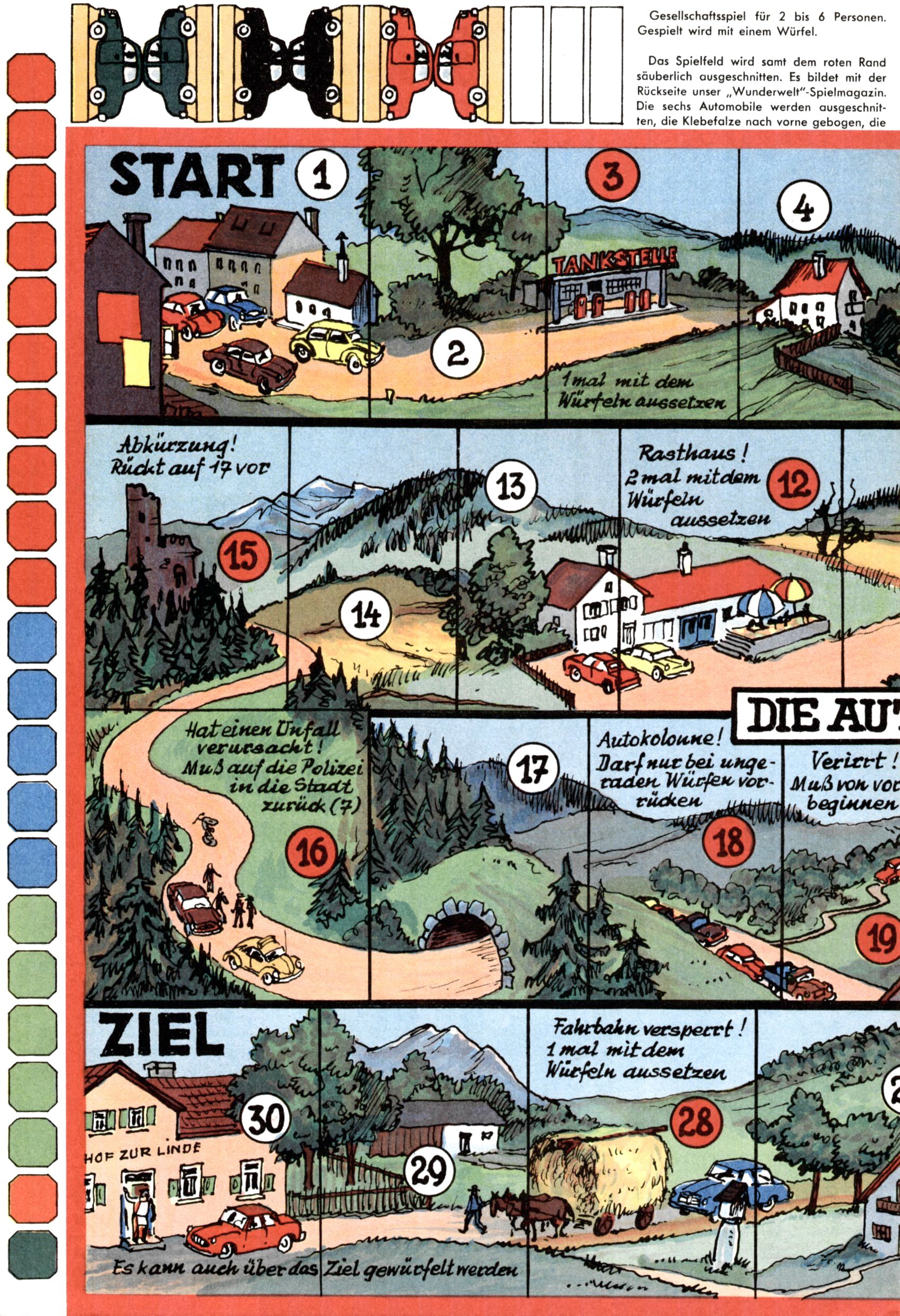 Die Wunderwelt im Festtagsgewand In den Sonderheften präsentierte sich die Wunderwelt wahrhaftig in Feiertagsstimmung. Mit wenigen Ausnahmen gab es pro Jahr drei Sonderhefte - zu Weihnachten bzw. im Advent, zu Ostern und in den Ferien im Sommer. Experimente mit Faschings- und Muttertagsheften hatten sich nicht bewährt. Selbst als es die Einzelhefte in der Krisensituation nach 1967 nicht mehr gab, wurde die Wunderwelt-Zeitung im Layout der Sonderhefte fortgesetzt: Zunächst mit 3 bis 5 und ab 1971 immerhin wieder mit 10-12 Heften pro Jahr. Die Weihnachts-, Oster- und Ferienhefte hatten naturgemäß verschiedene Schwerpunkte. Während im Sommer Spielen und Werken mit Material im Vordergrund stand, waren es zu Weihnachten Krippen und Adventhäuser; zu Ostern dann Erzählungen, Hasenstädte und Oster-Basteleien. Das bessere Papier der Sonderhefte erleichterte das Ausschneiden der insgesamt mehr als 1000 Papiermodelle erheblich. Die Sonderhefte waren vergleichsweise aufwändig gestaltet, aber auch ein wichtiges Zusatzgeschäft für die Zeitung. Die Kinder fieberten dem Erscheinungsdatum der jeweiligen Ausgabe nicht selten richtiggehend entgegen. Mit knapp 100 Seiten pro Jahr machten die Sonderhefte von der Menge her zwar nicht einmal ein Viertel aus, trugen aber zum Erscheinungsbild mindestens genauso viel bei wie die Standardhefte. Im Wesentlichen blieb das Layout der Sonderhefte über die Jahre hin unverändert. Mühselig wurde es, als man den Inhalt der Beiträge vorübergehend auf die Seiten gleichmäßig verteilte und die Kinder ermunterte, die Hefte in der Mitte zu zerschneiden. Die eine Hälfte enthielt dann etwa Erzählungen und Bastelvorschläge, der andere Teil der Zeitung Spielanleitungen. Zur übersichtlichkeit trugen diese Layoutversuche jedenfalls in keiner Weise bei und als besonderen Auswuchs gab es eine Zeitlang auf einer Seite oft mehrere Seitennummern, je nachdem, ob sich diese auf das Gesamtheft oder den herauszunehmenden und zu zerschneidenden Heftteil bezogen. Gegen Ende der 1950er Jahre kehrte man wieder zu einem ganzseitigen Layout zurück und Ideen wie ein Spiel-(Heft-im-)Heft gehörten der Vergangenheit an. In den Sonderheften experimentierte man dann noch ab Mitte der 1960er Jahre, als die Verkaufszahlen stark rückläufig waren, mit grundsätzlich neuen Darstellungsformen - weg vom Niedlich-Kitschigen und engagierte neue Grafikerinnen wie Gundi Groh und Hella Soyka. Den erhofften Erfolg brachte dies jedoch nicht mehr. |