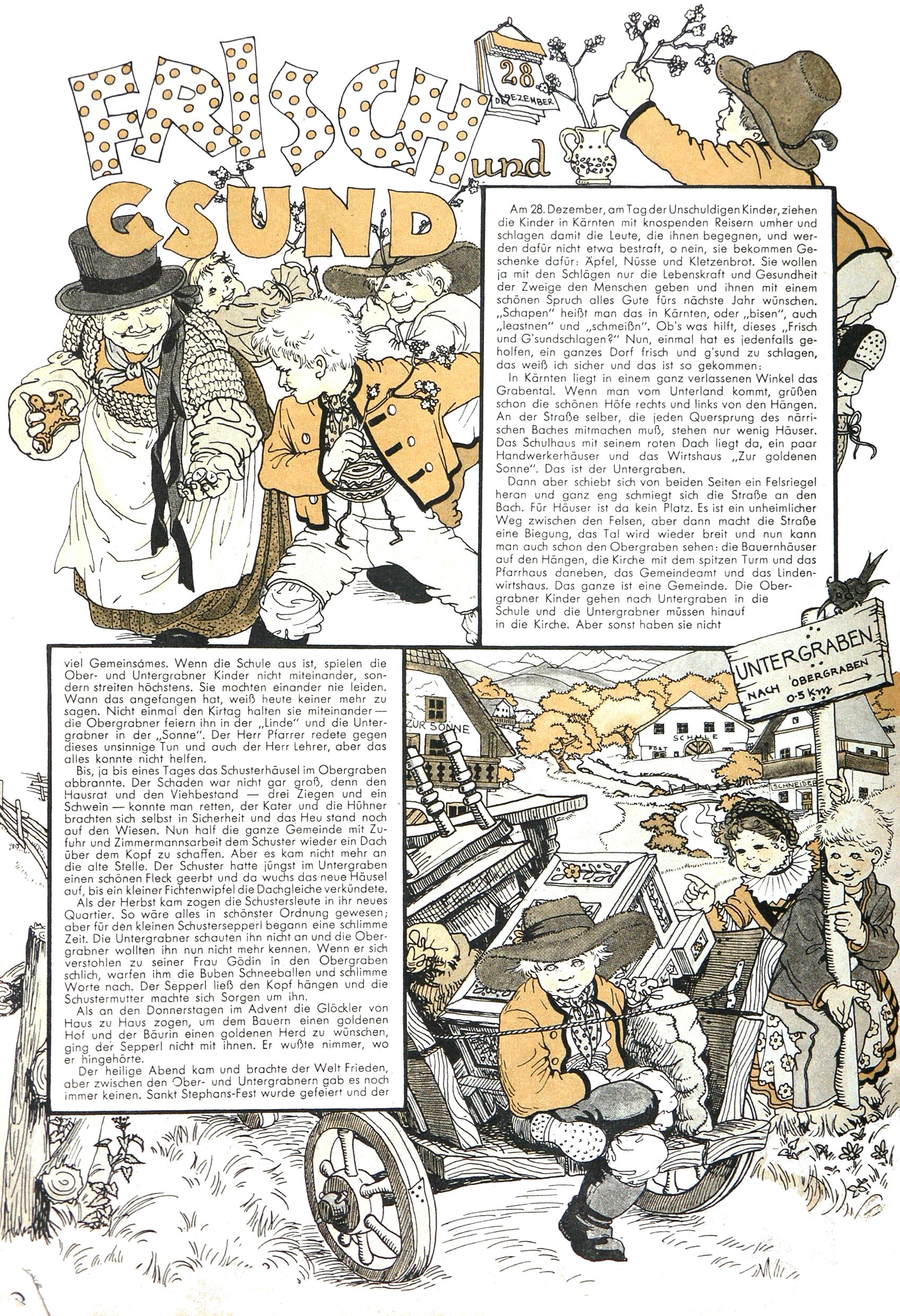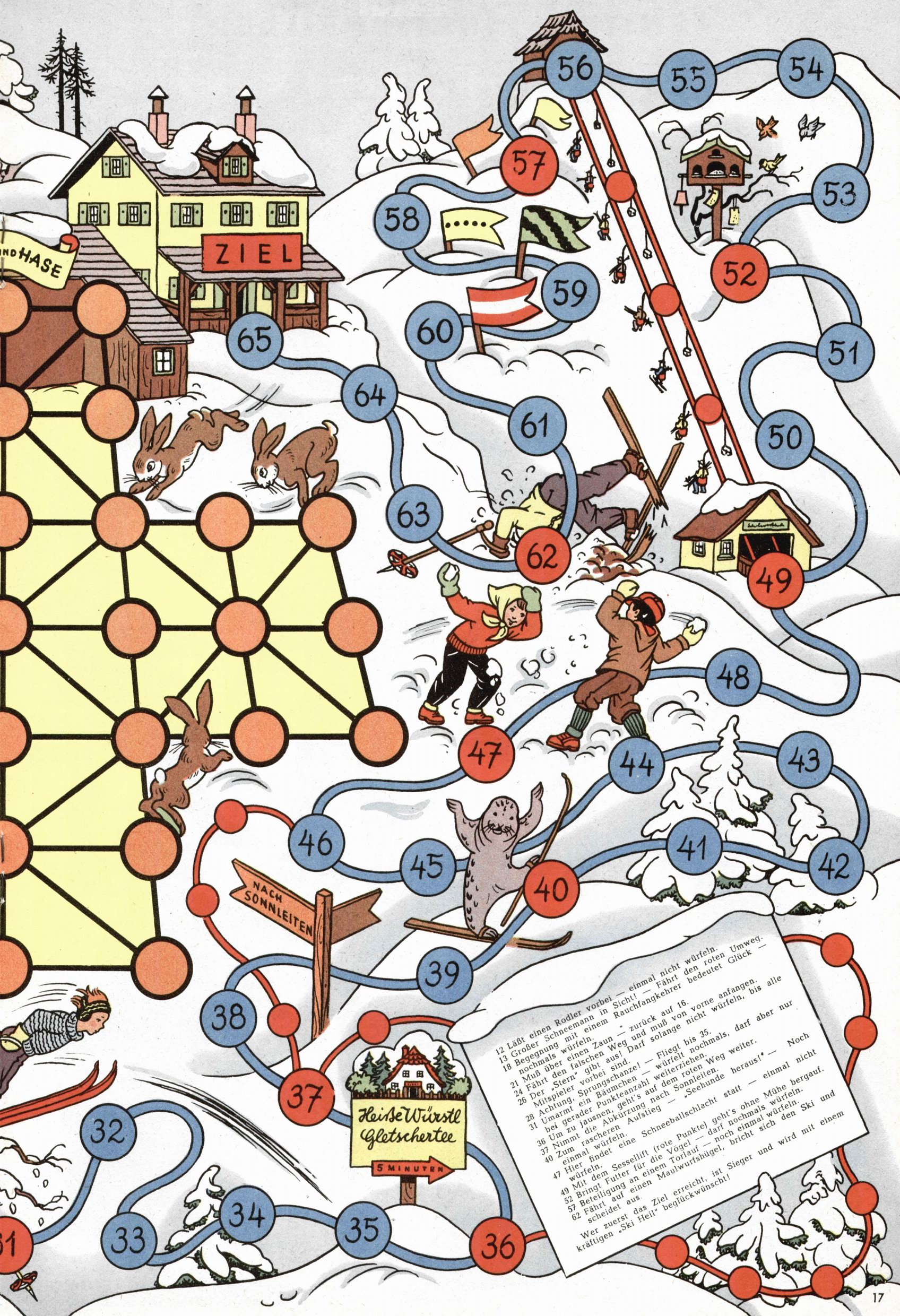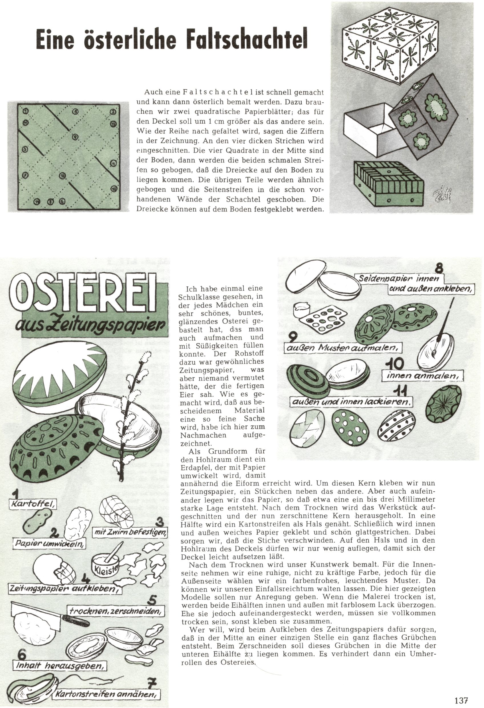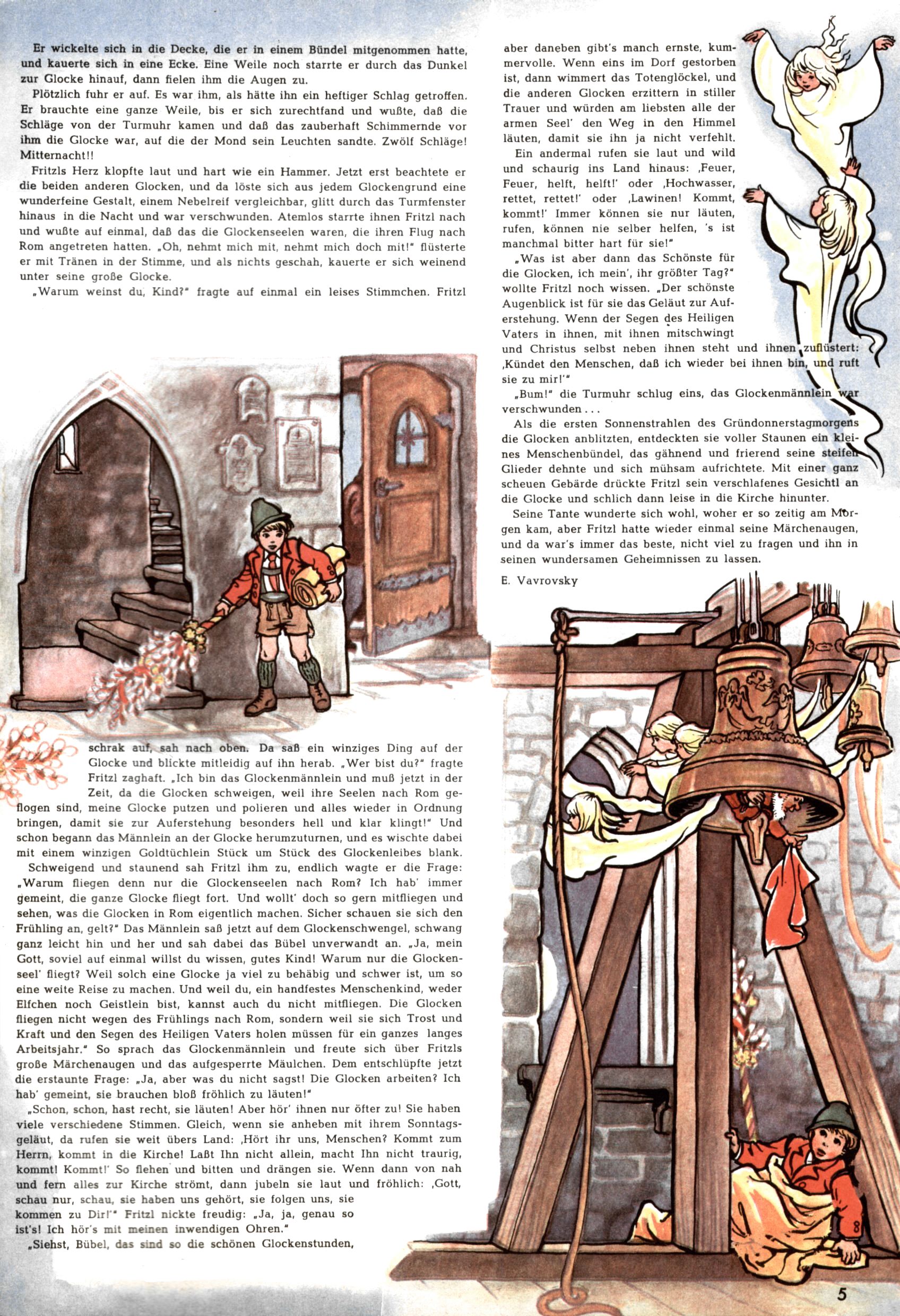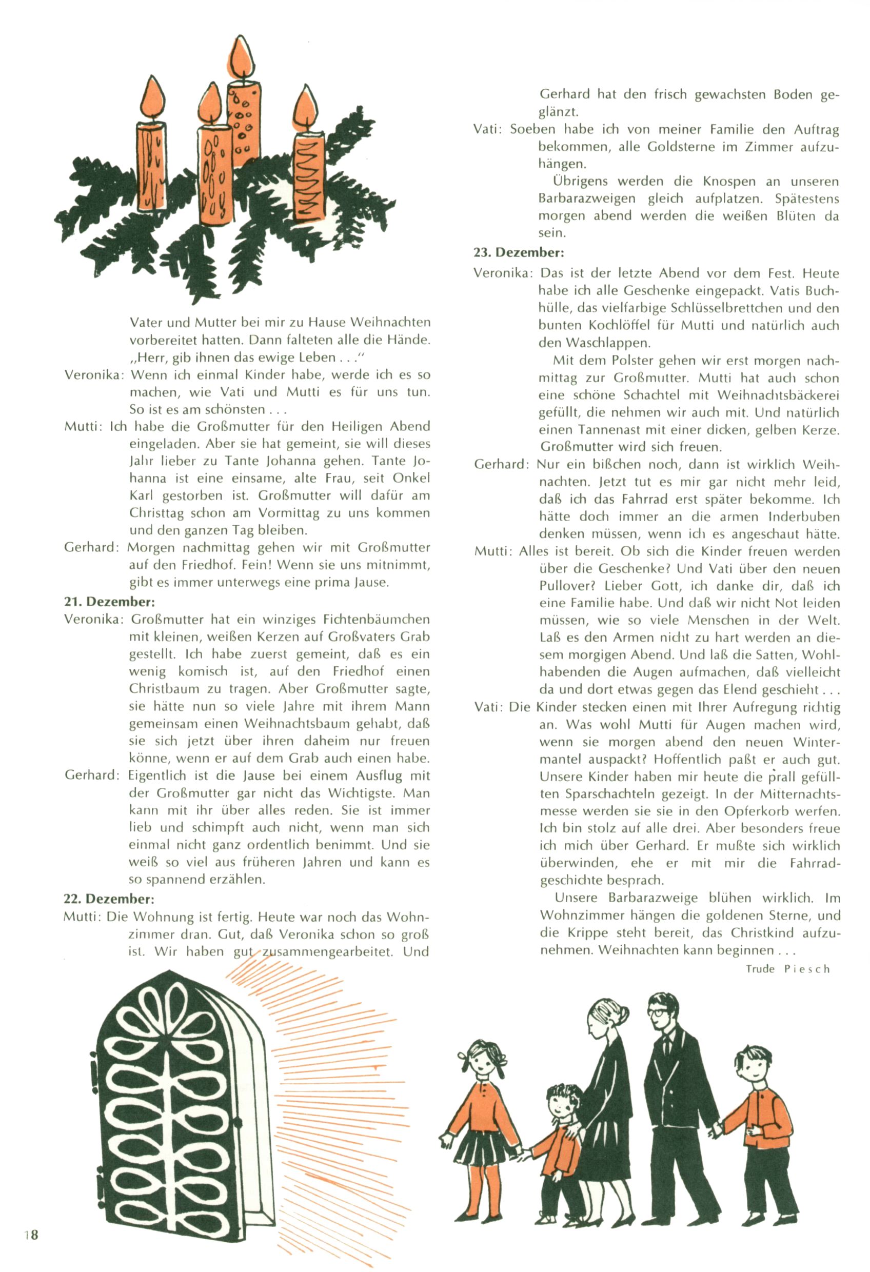 Die Wunderwelt im Festtagsgewand In den Sonderheften präsentierte sich die Wunderwelt wahrhaftig in Feiertagsstimmung. Mit wenigen Ausnahmen gab es pro Jahr drei Sonderhefte - zu Weihnachten bzw. im Advent, zu Ostern und in den Ferien im Sommer. Experimente mit Faschings- und Muttertagsheften hatten sich nicht bewährt. Selbst als es die Einzelhefte in der Krisensituation nach 1967 nicht mehr gab, wurde die Wunderwelt-Zeitung im Layout der Sonderhefte fortgesetzt: Zunächst mit 3 bis 5 und ab 1971 immerhin wieder mit 10-12 Heften pro Jahr. Die Weihnachts-, Oster- und Ferienhefte hatten naturgemäß verschiedene Schwerpunkte. Während im Sommer Spielen und Werken mit Material im Vordergrund stand, waren es zu Weihnachten Krippen und Adventhäuser; zu Ostern dann Erzählungen, Hasenstädte und Oster-Basteleien. Das bessere Papier der Sonderhefte erleichterte das Ausschneiden der insgesamt mehr als 1000 Papiermodelle erheblich. Die Sonderhefte waren vergleichsweise aufwändig gestaltet, aber auch ein wichtiges Zusatzgeschäft für die Zeitung. Die Kinder fieberten dem Erscheinungsdatum der jeweiligen Ausgabe nicht selten richtiggehend entgegen. Mit knapp 100 Seiten pro Jahr machten die Sonderhefte von der Menge her zwar nicht einmal ein Viertel aus, trugen aber zum Erscheinungsbild mindestens genauso viel bei wie die Standardhefte. Im Wesentlichen blieb das Layout der Sonderhefte über die Jahre hin unverändert. Mühselig wurde es, als man den Inhalt der Beiträge vorübergehend auf die Seiten gleichmäßig verteilte und die Kinder ermunterte, die Hefte in der Mitte zu zerschneiden. Die eine Hälfte enthielt dann etwa Erzählungen und Bastelvorschläge, der andere Teil der Zeitung Spielanleitungen. Zur übersichtlichkeit trugen diese Layoutversuche jedenfalls in keiner Weise bei und als besonderen Auswuchs gab es eine Zeitlang auf einer Seite oft mehrere Seitennummern, je nachdem, ob sich diese auf das Gesamtheft oder den herauszunehmenden und zu zerschneidenden Heftteil bezogen. Gegen Ende der 1950er Jahre kehrte man wieder zu einem ganzseitigen Layout zurück und Ideen wie ein Spiel-(Heft-im-)Heft gehörten der Vergangenheit an. In den Sonderheften experimentierte man dann noch ab Mitte der 1960er Jahre, als die Verkaufszahlen stark rückläufig waren, mit grundsätzlich neuen Darstellungsformen - weg vom Niedlich-Kitschigen und engagierte neue Grafikerinnen wie Gundi Groh und Hella Soyka. Den erhofften Erfolg brachte dies jedoch nicht mehr. |