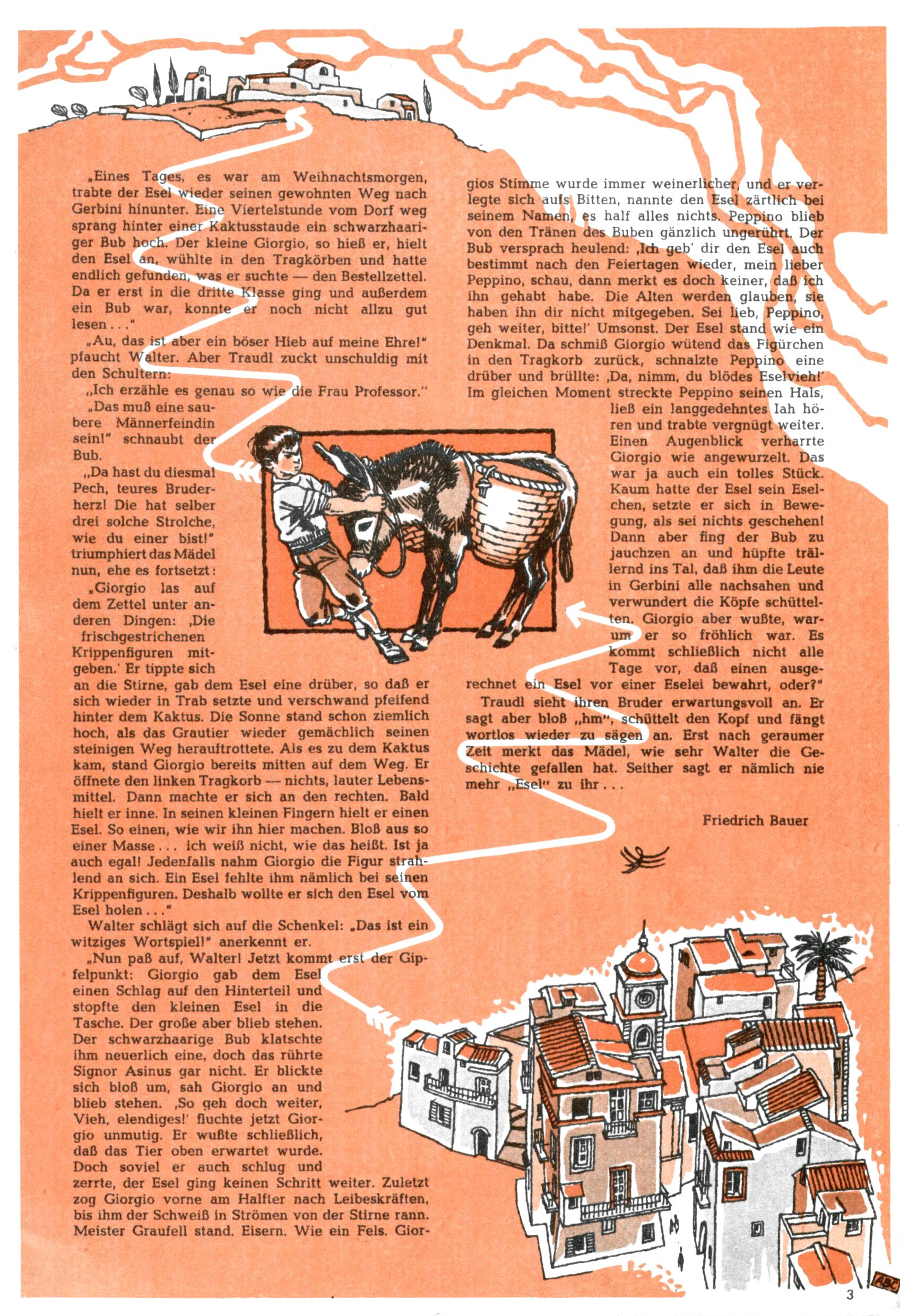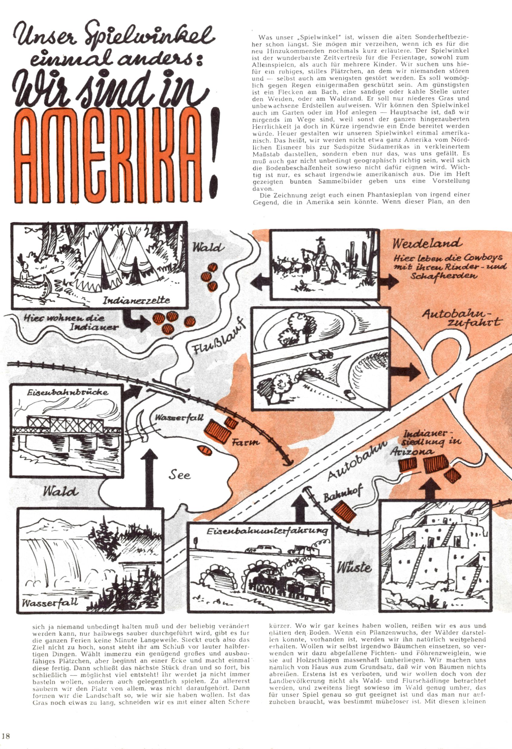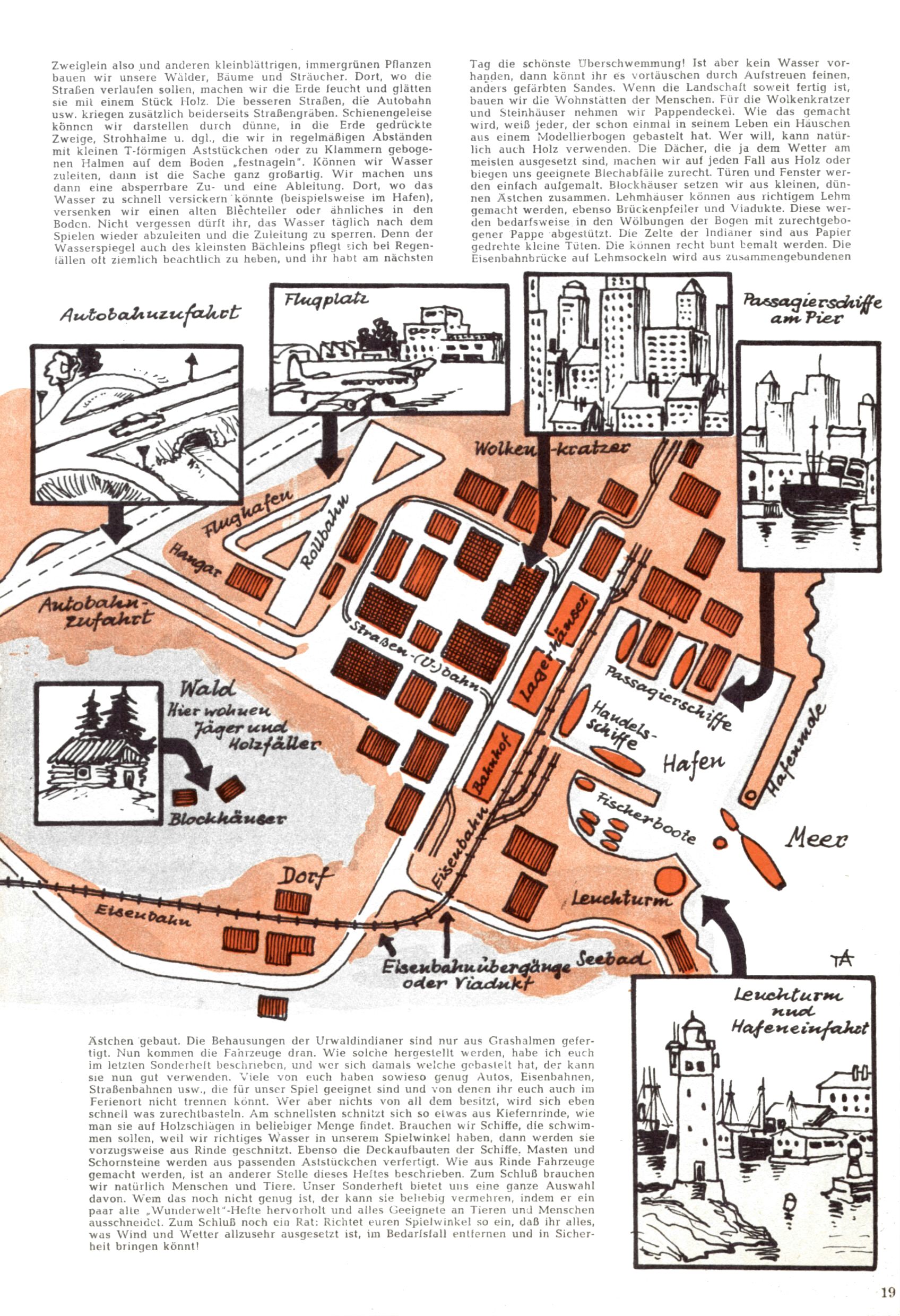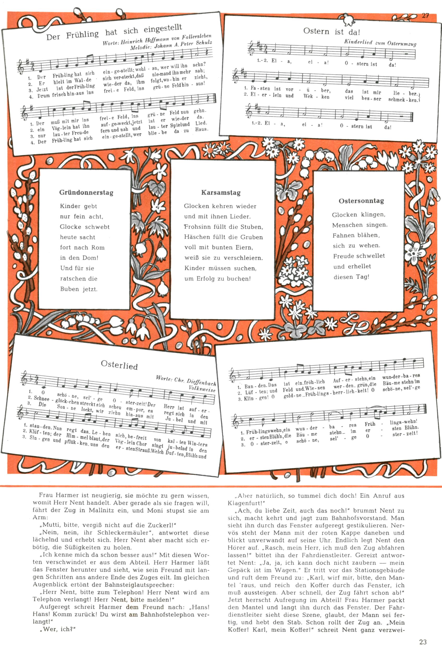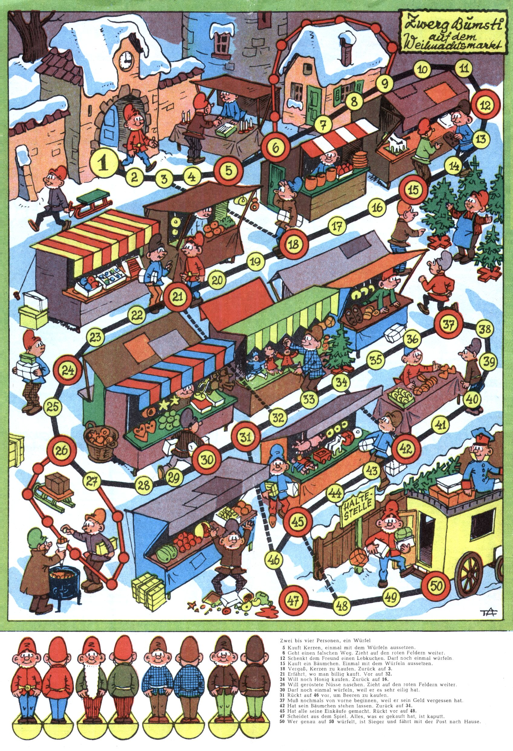 Die Wunderwelt im Festtagsgewand In den Sonderheften präsentierte sich die Wunderwelt wahrhaftig in Feiertagsstimmung. Mit wenigen Ausnahmen gab es pro Jahr drei Sonderhefte - zu Weihnachten bzw. im Advent, zu Ostern und in den Ferien im Sommer. Experimente mit Faschings- und Muttertagsheften hatten sich nicht bewährt. Selbst als es die Einzelhefte in der Krisensituation nach 1967 nicht mehr gab, wurde die Wunderwelt-Zeitung im Layout der Sonderhefte fortgesetzt: Zunächst mit 3 bis 5 und ab 1971 immerhin wieder mit 10-12 Heften pro Jahr. Die Weihnachts-, Oster- und Ferienhefte hatten naturgemäß verschiedene Schwerpunkte. Während im Sommer Spielen und Werken mit Material im Vordergrund stand, waren es zu Weihnachten Krippen und Adventhäuser; zu Ostern dann Erzählungen, Hasenstädte und Oster-Basteleien. Das bessere Papier der Sonderhefte erleichterte das Ausschneiden der insgesamt mehr als 1000 Papiermodelle erheblich. Die Sonderhefte waren vergleichsweise aufwändig gestaltet, aber auch ein wichtiges Zusatzgeschäft für die Zeitung. Die Kinder fieberten dem Erscheinungsdatum der jeweiligen Ausgabe nicht selten richtiggehend entgegen. Mit knapp 100 Seiten pro Jahr machten die Sonderhefte von der Menge her zwar nicht einmal ein Viertel aus, trugen aber zum Erscheinungsbild mindestens genauso viel bei wie die Standardhefte. Im Wesentlichen blieb das Layout der Sonderhefte über die Jahre hin unverändert. Mühselig wurde es, als man den Inhalt der Beiträge vorübergehend auf die Seiten gleichmäßig verteilte und die Kinder ermunterte, die Hefte in der Mitte zu zerschneiden. Die eine Hälfte enthielt dann etwa Erzählungen und Bastelvorschläge, der andere Teil der Zeitung Spielanleitungen. Zur übersichtlichkeit trugen diese Layoutversuche jedenfalls in keiner Weise bei und als besonderen Auswuchs gab es eine Zeitlang auf einer Seite oft mehrere Seitennummern, je nachdem, ob sich diese auf das Gesamtheft oder den herauszunehmenden und zu zerschneidenden Heftteil bezogen. Gegen Ende der 1950er Jahre kehrte man wieder zu einem ganzseitigen Layout zurück und Ideen wie ein Spiel-(Heft-im-)Heft gehörten der Vergangenheit an. In den Sonderheften experimentierte man dann noch ab Mitte der 1960er Jahre, als die Verkaufszahlen stark rückläufig waren, mit grundsätzlich neuen Darstellungsformen - weg vom Niedlich-Kitschigen und engagierte neue Grafikerinnen wie Gundi Groh und Hella Soyka. Den erhofften Erfolg brachte dies jedoch nicht mehr. |
