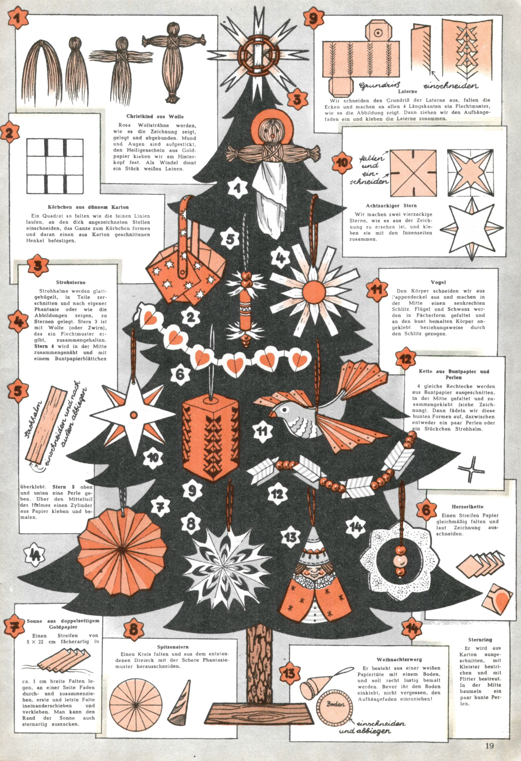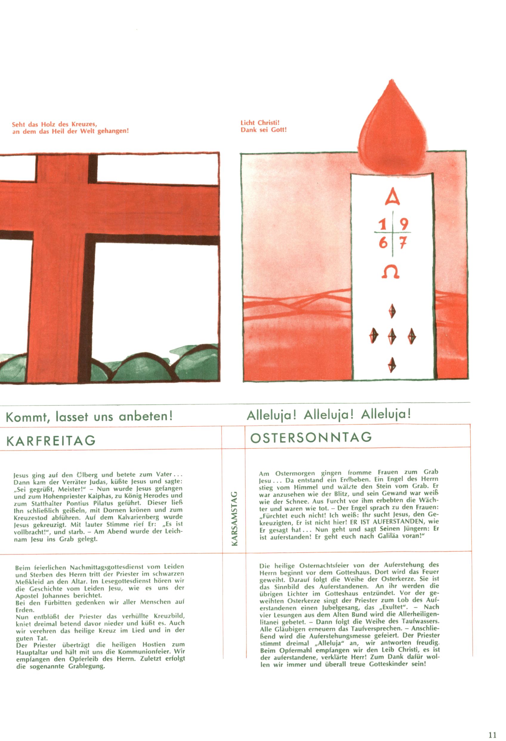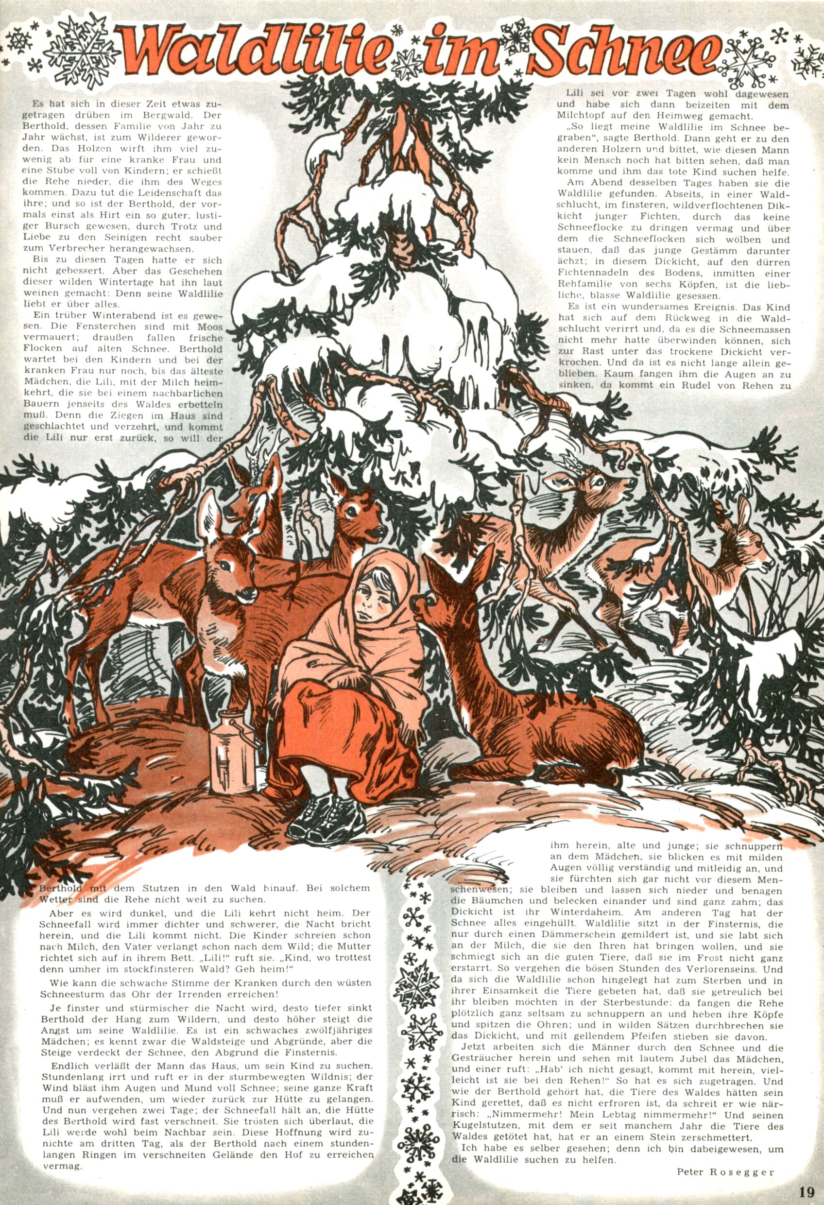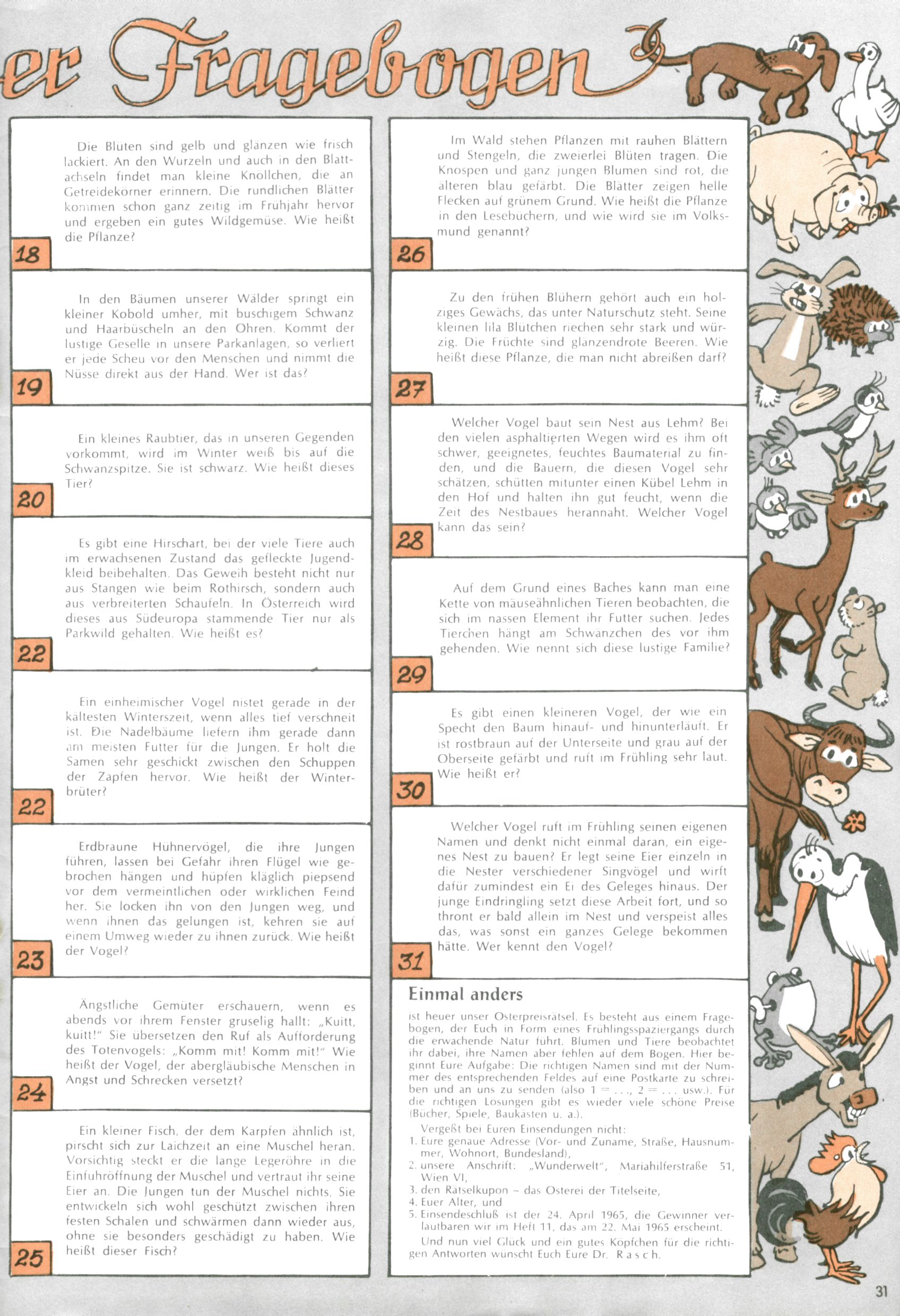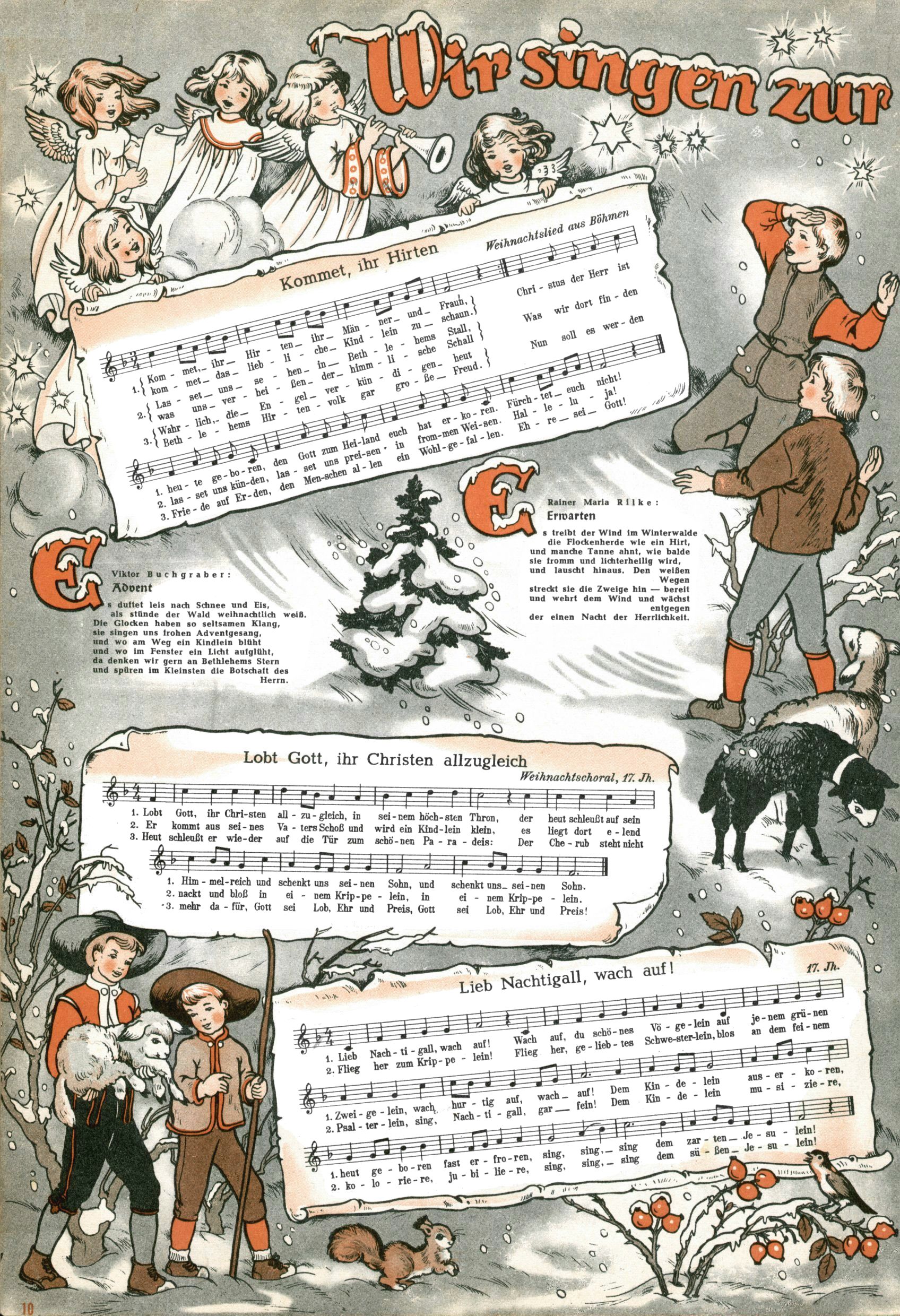 Die Wunderwelt im Festtagsgewand In den Sonderheften präsentierte sich die Wunderwelt wahrhaftig in Feiertagsstimmung. Mit wenigen Ausnahmen gab es pro Jahr drei Sonderhefte - zu Weihnachten bzw. im Advent, zu Ostern und in den Ferien im Sommer. Experimente mit Faschings- und Muttertagsheften hatten sich nicht bewährt. Selbst als es die Einzelhefte in der Krisensituation nach 1967 nicht mehr gab, wurde die Wunderwelt-Zeitung im Layout der Sonderhefte fortgesetzt: Zunächst mit 3 bis 5 und ab 1971 immerhin wieder mit 10-12 Heften pro Jahr. Die Weihnachts-, Oster- und Ferienhefte hatten naturgemäß verschiedene Schwerpunkte. Während im Sommer Spielen und Werken mit Material im Vordergrund stand, waren es zu Weihnachten Krippen und Adventhäuser; zu Ostern dann Erzählungen, Hasenstädte und Oster-Basteleien. Das bessere Papier der Sonderhefte erleichterte das Ausschneiden der insgesamt mehr als 1000 Papiermodelle erheblich. Die Sonderhefte waren vergleichsweise aufwändig gestaltet, aber auch ein wichtiges Zusatzgeschäft für die Zeitung. Die Kinder fieberten dem Erscheinungsdatum der jeweiligen Ausgabe nicht selten richtiggehend entgegen. Mit knapp 100 Seiten pro Jahr machten die Sonderhefte von der Menge her zwar nicht einmal ein Viertel aus, trugen aber zum Erscheinungsbild mindestens genauso viel bei wie die Standardhefte. Im Wesentlichen blieb das Layout der Sonderhefte über die Jahre hin unverändert. Mühselig wurde es, als man den Inhalt der Beiträge vorübergehend auf die Seiten gleichmäßig verteilte und die Kinder ermunterte, die Hefte in der Mitte zu zerschneiden. Die eine Hälfte enthielt dann etwa Erzählungen und Bastelvorschläge, der andere Teil der Zeitung Spielanleitungen. Zur übersichtlichkeit trugen diese Layoutversuche jedenfalls in keiner Weise bei und als besonderen Auswuchs gab es eine Zeitlang auf einer Seite oft mehrere Seitennummern, je nachdem, ob sich diese auf das Gesamtheft oder den herauszunehmenden und zu zerschneidenden Heftteil bezogen. Gegen Ende der 1950er Jahre kehrte man wieder zu einem ganzseitigen Layout zurück und Ideen wie ein Spiel-(Heft-im-)Heft gehörten der Vergangenheit an. In den Sonderheften experimentierte man dann noch ab Mitte der 1960er Jahre, als die Verkaufszahlen stark rückläufig waren, mit grundsätzlich neuen Darstellungsformen - weg vom Niedlich-Kitschigen und engagierte neue Grafikerinnen wie Gundi Groh und Hella Soyka. Den erhofften Erfolg brachte dies jedoch nicht mehr. |