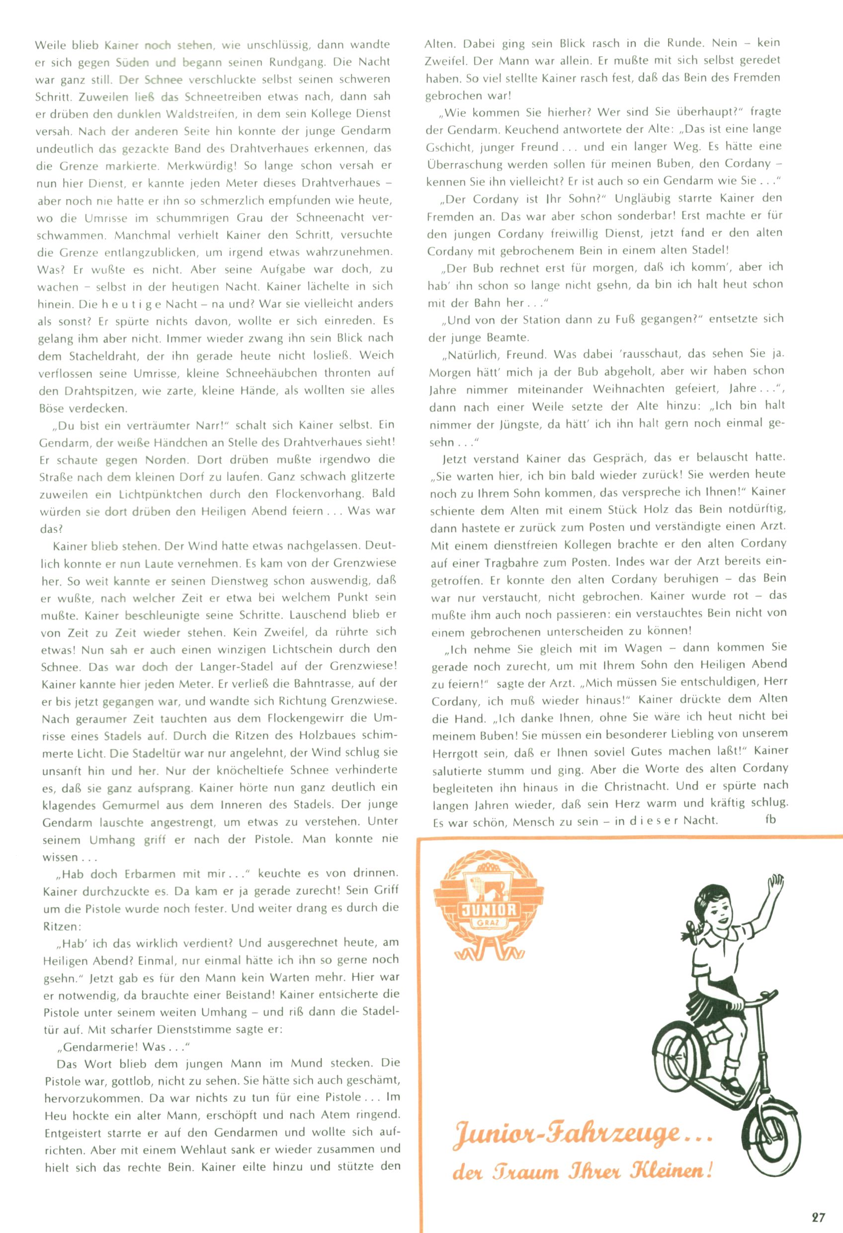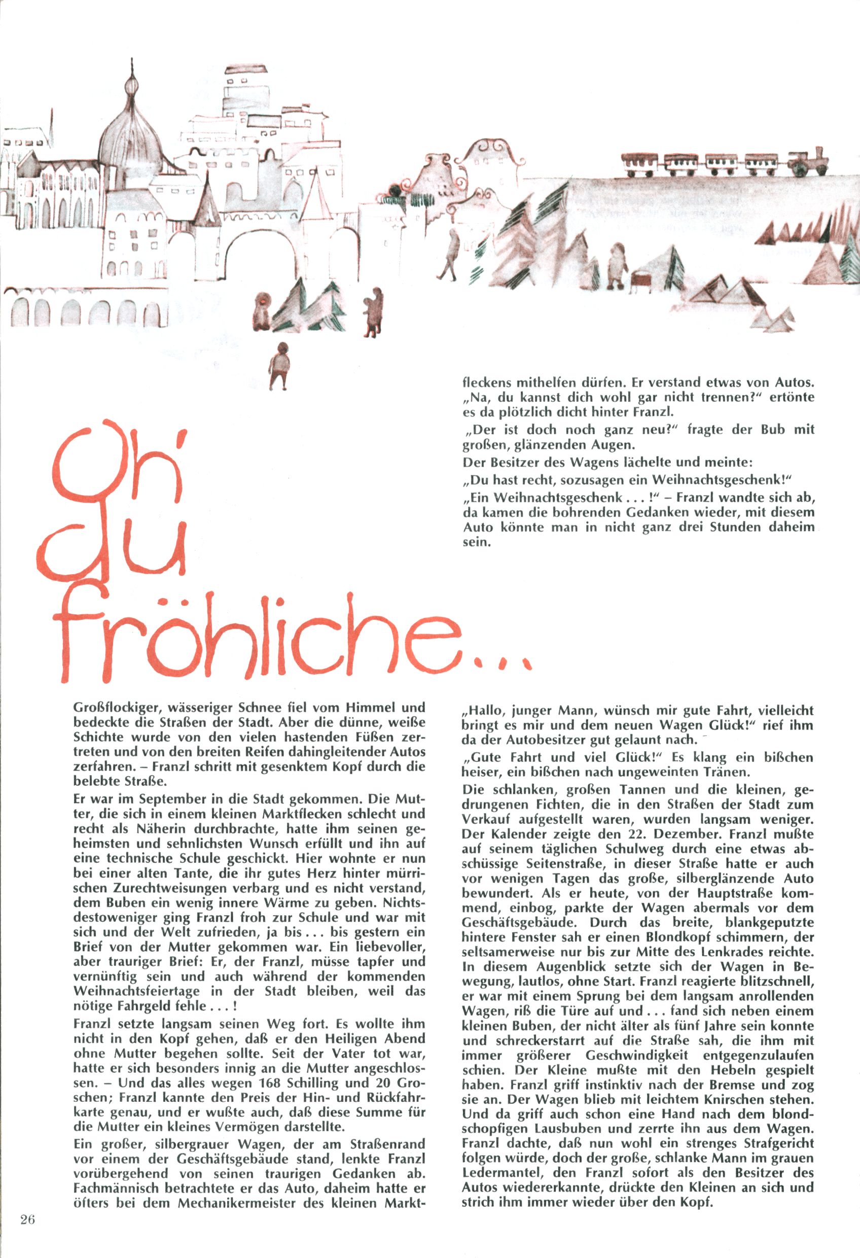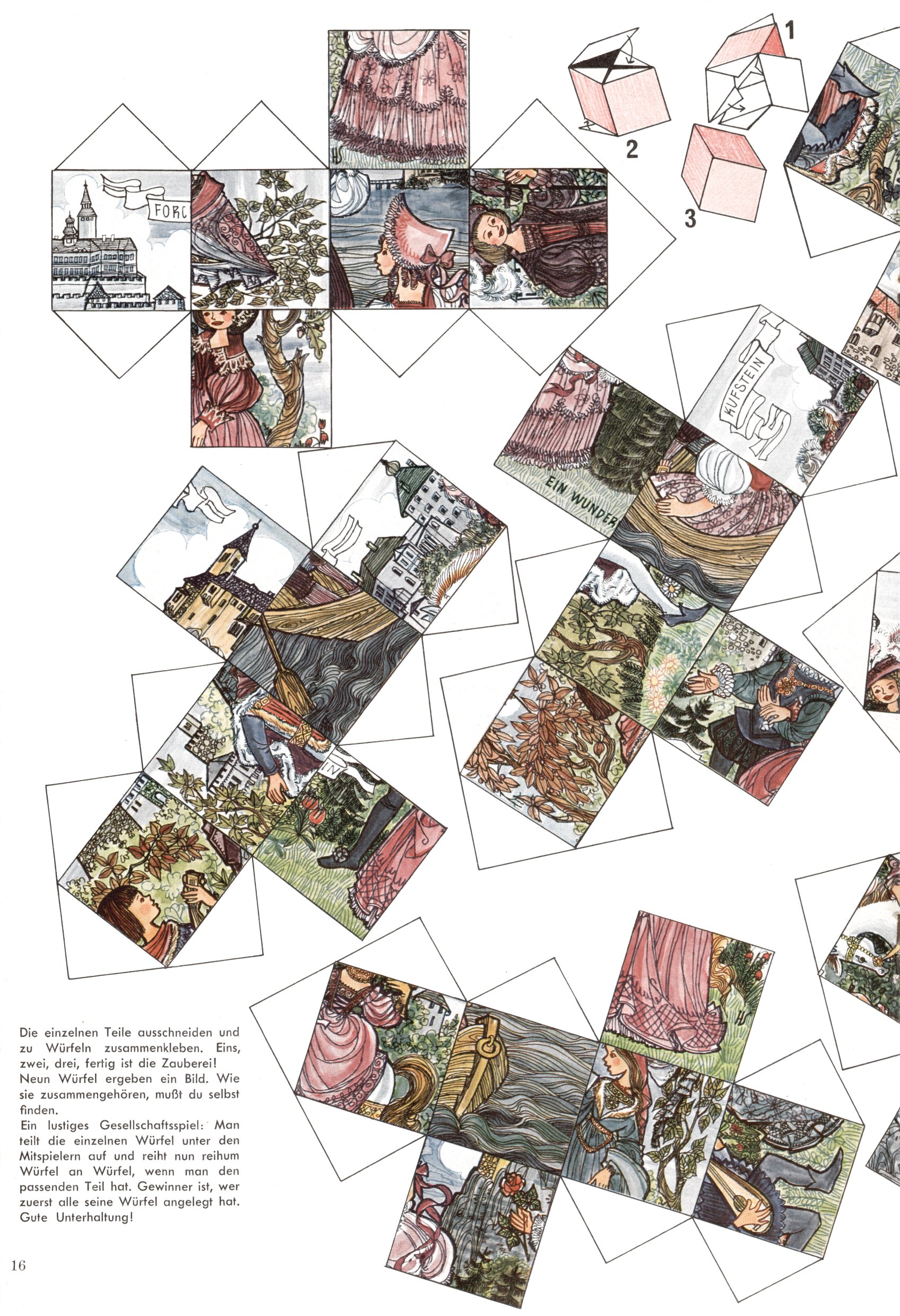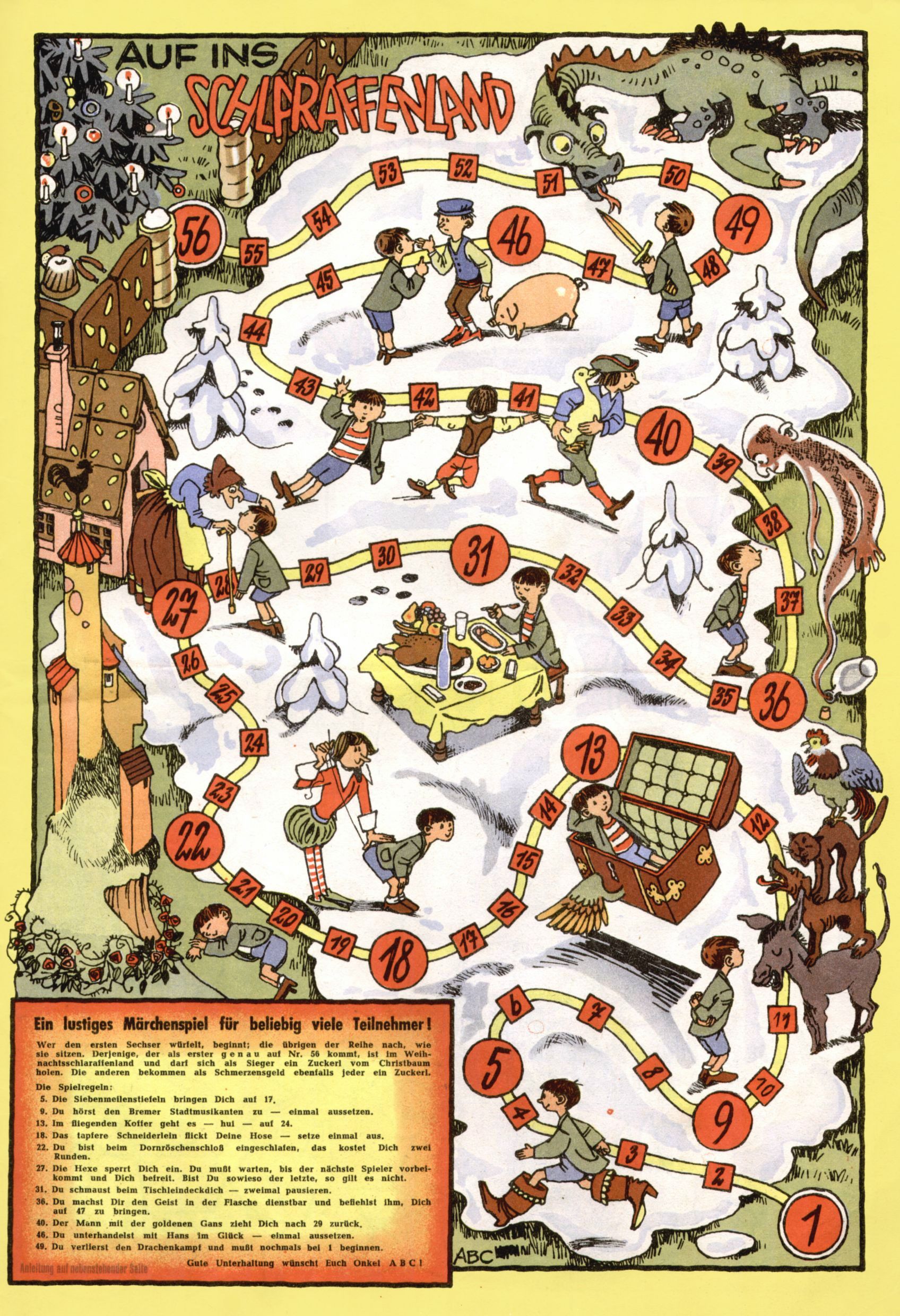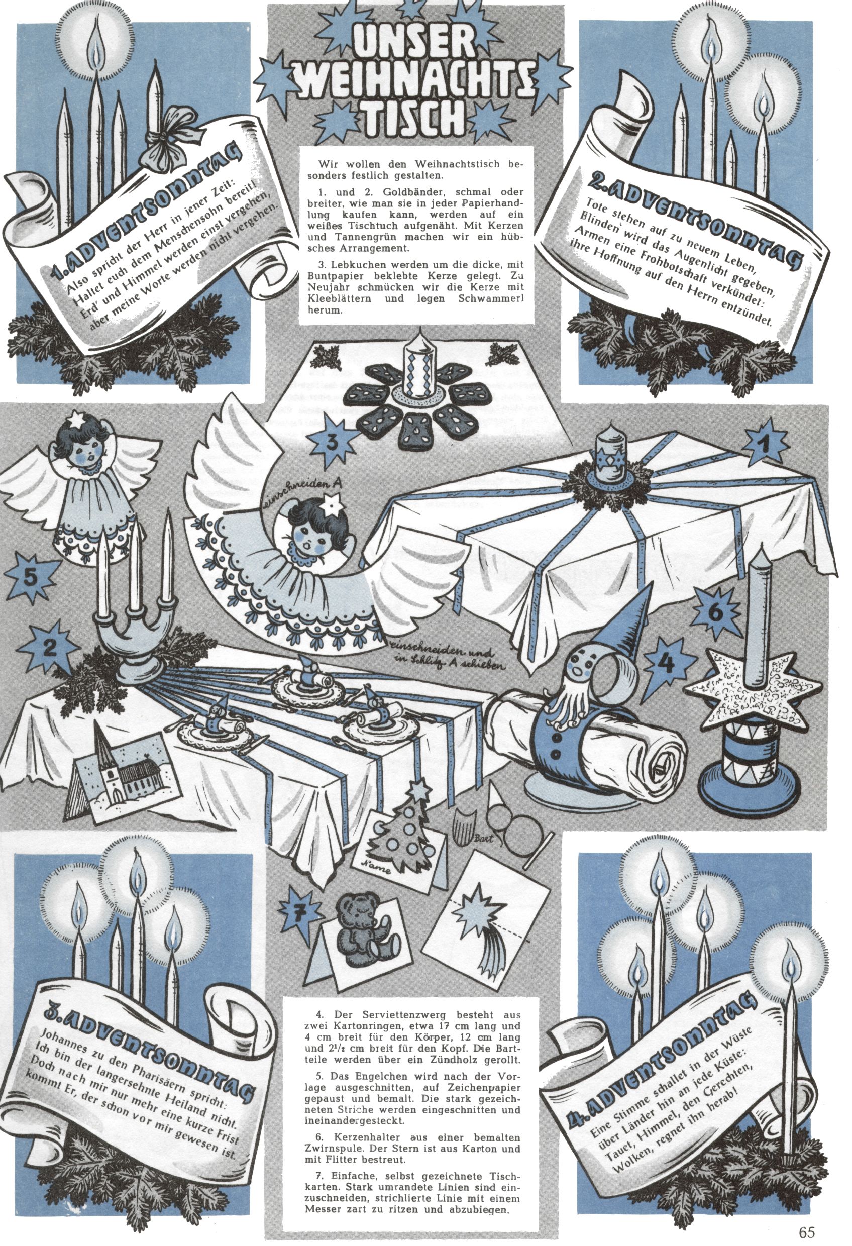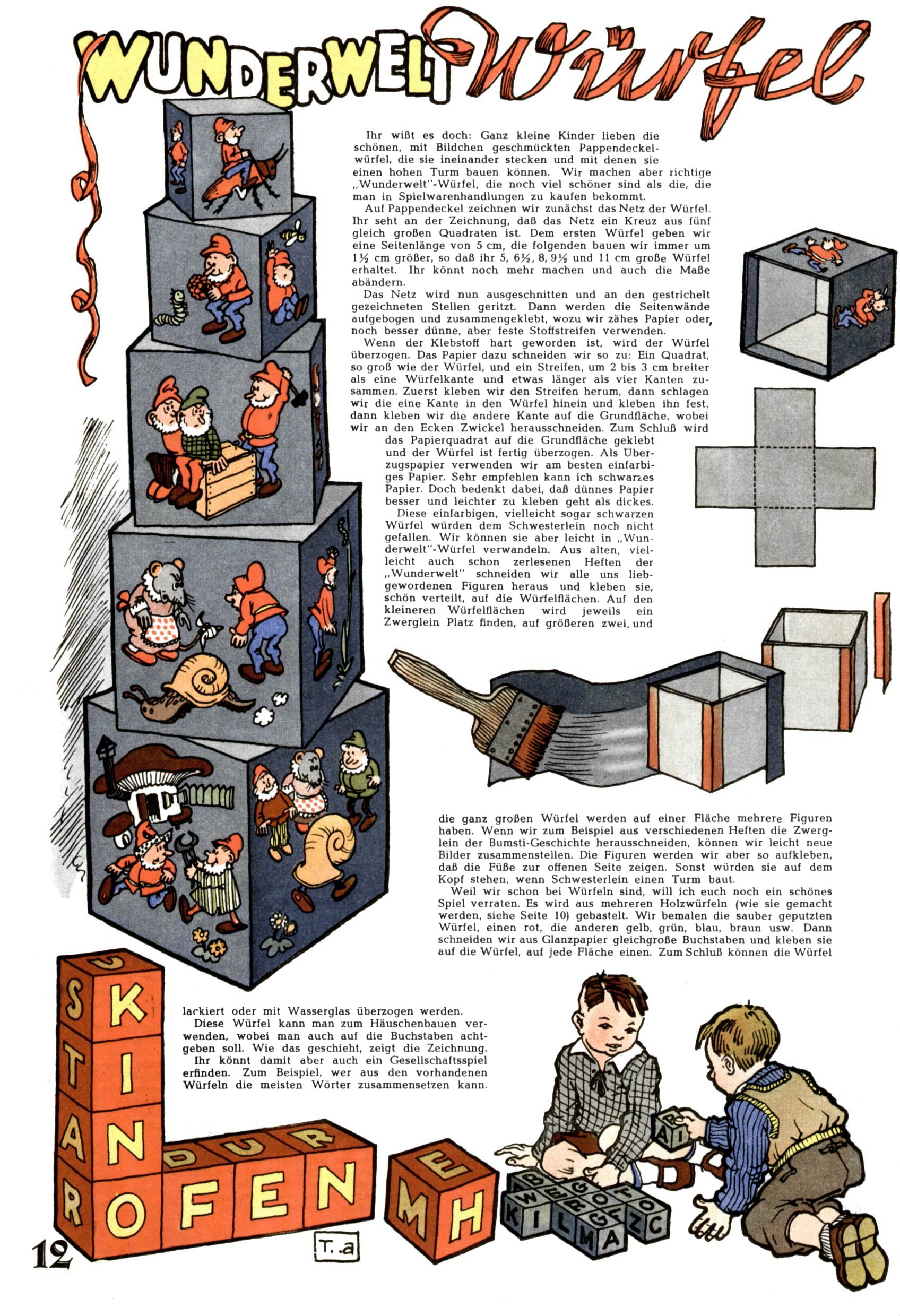 Die Wunderwelt im Festtagsgewand In den Sonderheften präsentierte sich die Wunderwelt wahrhaftig in Feiertagsstimmung. Mit wenigen Ausnahmen gab es pro Jahr drei Sonderhefte - zu Weihnachten bzw. im Advent, zu Ostern und in den Ferien im Sommer. Experimente mit Faschings- und Muttertagsheften hatten sich nicht bewährt. Selbst als es die Einzelhefte in der Krisensituation nach 1967 nicht mehr gab, wurde die Wunderwelt-Zeitung im Layout der Sonderhefte fortgesetzt: Zunächst mit 3 bis 5 und ab 1971 immerhin wieder mit 10-12 Heften pro Jahr. Die Weihnachts-, Oster- und Ferienhefte hatten naturgemäß verschiedene Schwerpunkte. Während im Sommer Spielen und Werken mit Material im Vordergrund stand, waren es zu Weihnachten Krippen und Adventhäuser; zu Ostern dann Erzählungen, Hasenstädte und Oster-Basteleien. Das bessere Papier der Sonderhefte erleichterte das Ausschneiden der insgesamt mehr als 1000 Papiermodelle erheblich. Die Sonderhefte waren vergleichsweise aufwändig gestaltet, aber auch ein wichtiges Zusatzgeschäft für die Zeitung. Die Kinder fieberten dem Erscheinungsdatum der jeweiligen Ausgabe nicht selten richtiggehend entgegen. Mit knapp 100 Seiten pro Jahr machten die Sonderhefte von der Menge her zwar nicht einmal ein Viertel aus, trugen aber zum Erscheinungsbild mindestens genauso viel bei wie die Standardhefte. Im Wesentlichen blieb das Layout der Sonderhefte über die Jahre hin unverändert. Mühselig wurde es, als man den Inhalt der Beiträge vorübergehend auf die Seiten gleichmäßig verteilte und die Kinder ermunterte, die Hefte in der Mitte zu zerschneiden. Die eine Hälfte enthielt dann etwa Erzählungen und Bastelvorschläge, der andere Teil der Zeitung Spielanleitungen. Zur übersichtlichkeit trugen diese Layoutversuche jedenfalls in keiner Weise bei und als besonderen Auswuchs gab es eine Zeitlang auf einer Seite oft mehrere Seitennummern, je nachdem, ob sich diese auf das Gesamtheft oder den herauszunehmenden und zu zerschneidenden Heftteil bezogen. Gegen Ende der 1950er Jahre kehrte man wieder zu einem ganzseitigen Layout zurück und Ideen wie ein Spiel-(Heft-im-)Heft gehörten der Vergangenheit an. In den Sonderheften experimentierte man dann noch ab Mitte der 1960er Jahre, als die Verkaufszahlen stark rückläufig waren, mit grundsätzlich neuen Darstellungsformen - weg vom Niedlich-Kitschigen und engagierte neue Grafikerinnen wie Gundi Groh und Hella Soyka. Den erhofften Erfolg brachte dies jedoch nicht mehr. |