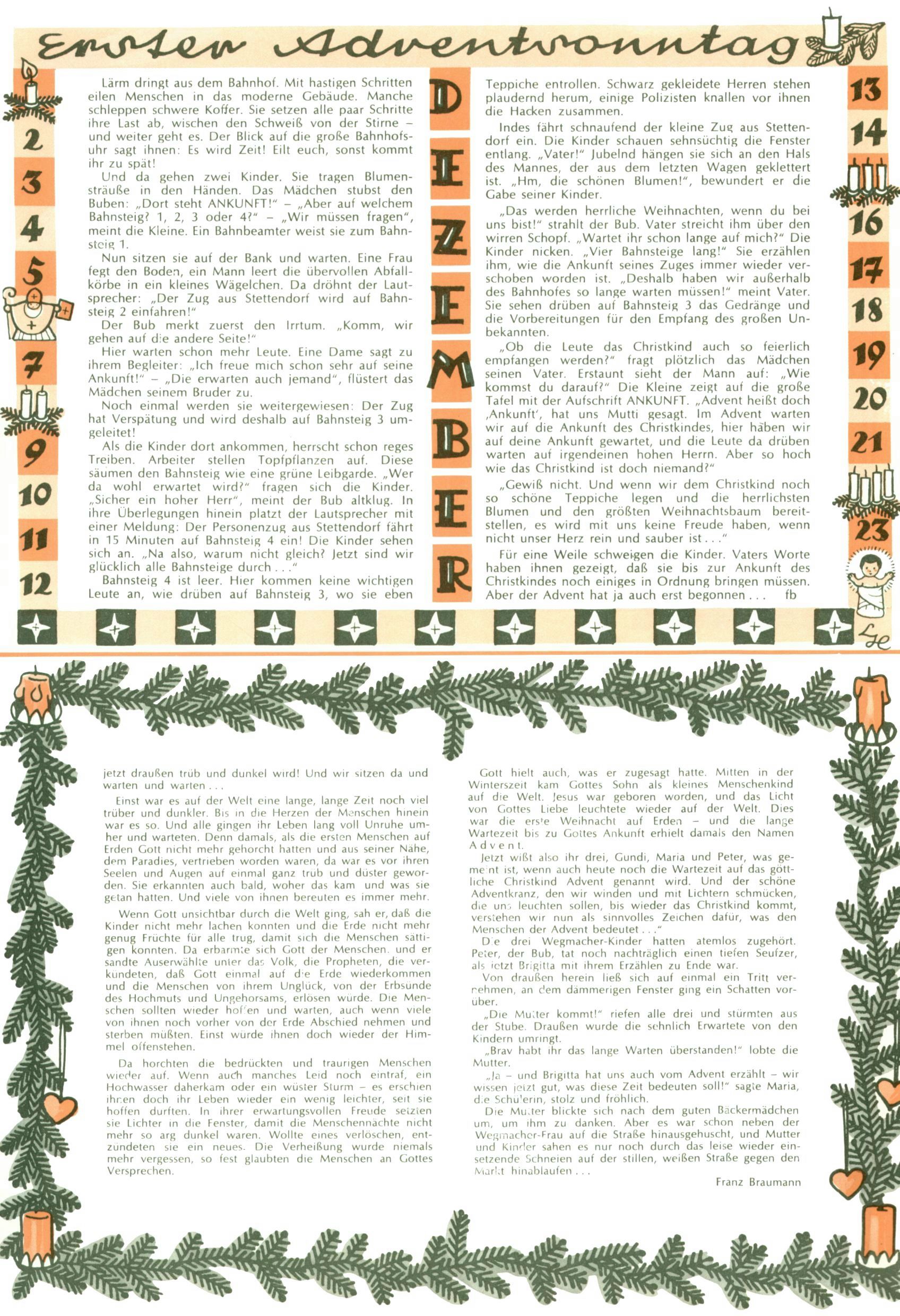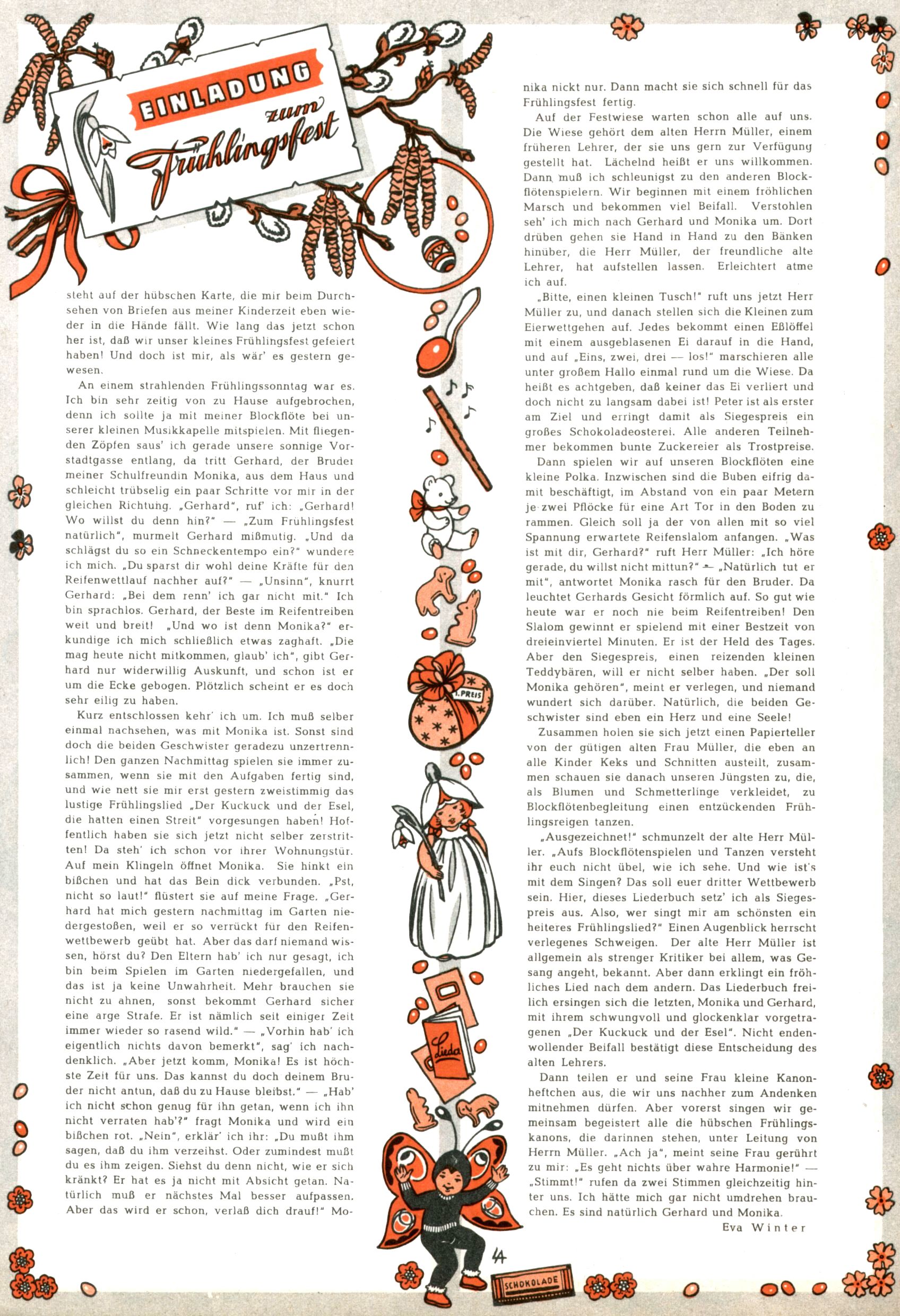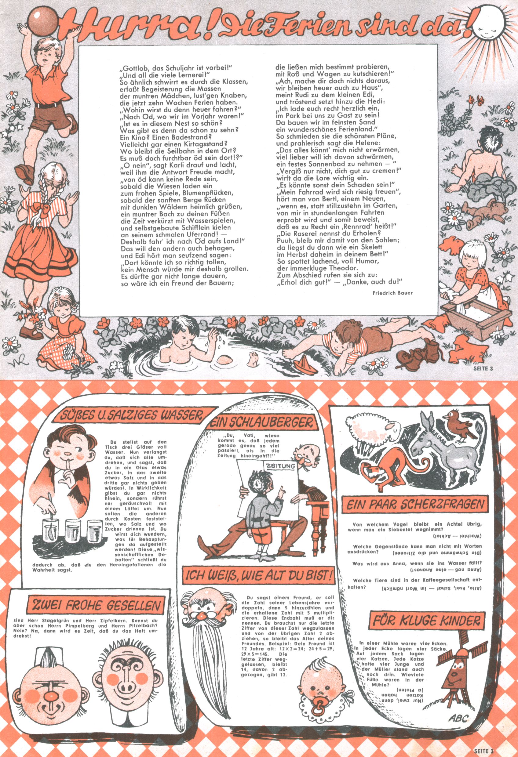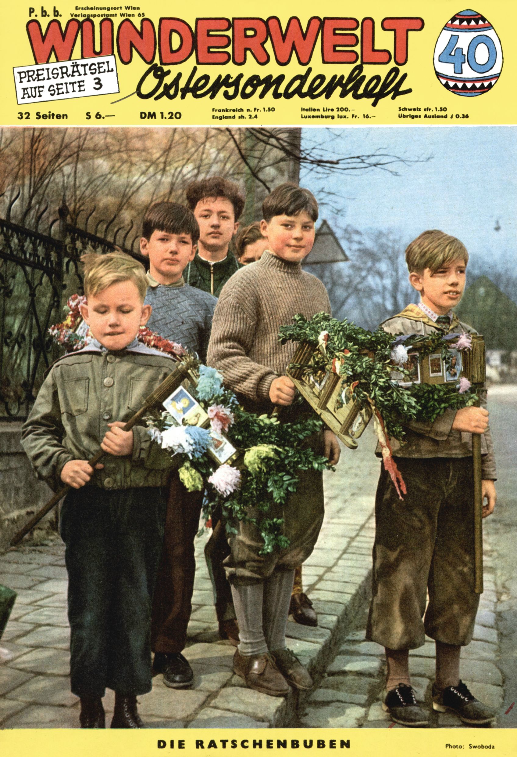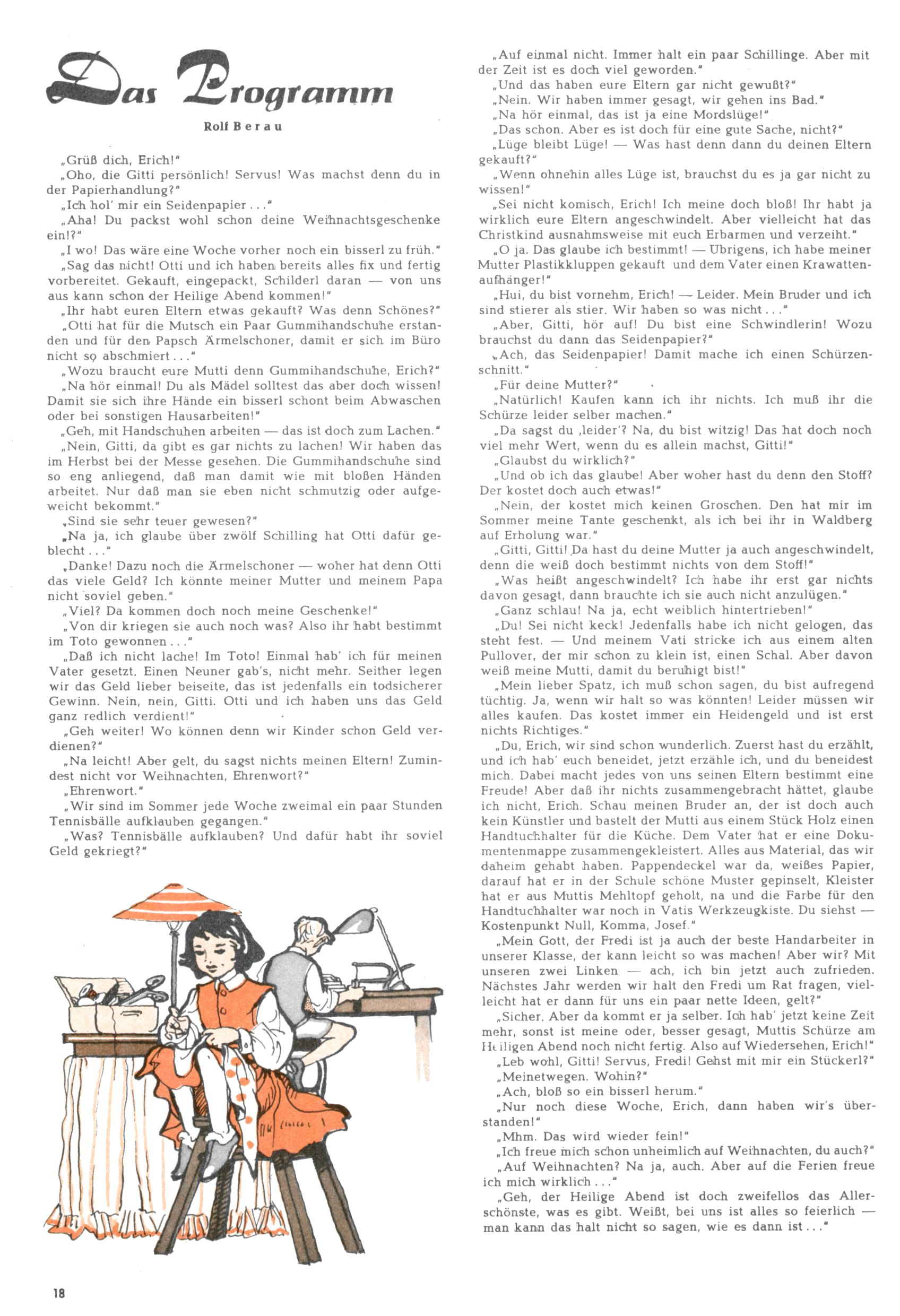 Die Wunderwelt im Festtagsgewand In den Sonderheften präsentierte sich die Wunderwelt wahrhaftig in Feiertagsstimmung. Mit wenigen Ausnahmen gab es pro Jahr drei Sonderhefte - zu Weihnachten bzw. im Advent, zu Ostern und in den Ferien im Sommer. Experimente mit Faschings- und Muttertagsheften hatten sich nicht bewährt. Selbst als es die Einzelhefte in der Krisensituation nach 1967 nicht mehr gab, wurde die Wunderwelt-Zeitung im Layout der Sonderhefte fortgesetzt: Zunächst mit 3 bis 5 und ab 1971 immerhin wieder mit 10-12 Heften pro Jahr. Die Weihnachts-, Oster- und Ferienhefte hatten naturgemäß verschiedene Schwerpunkte. Während im Sommer Spielen und Werken mit Material im Vordergrund stand, waren es zu Weihnachten Krippen und Adventhäuser; zu Ostern dann Erzählungen, Hasenstädte und Oster-Basteleien. Das bessere Papier der Sonderhefte erleichterte das Ausschneiden der insgesamt mehr als 1000 Papiermodelle erheblich. Die Sonderhefte waren vergleichsweise aufwändig gestaltet, aber auch ein wichtiges Zusatzgeschäft für die Zeitung. Die Kinder fieberten dem Erscheinungsdatum der jeweiligen Ausgabe nicht selten richtiggehend entgegen. Mit knapp 100 Seiten pro Jahr machten die Sonderhefte von der Menge her zwar nicht einmal ein Viertel aus, trugen aber zum Erscheinungsbild mindestens genauso viel bei wie die Standardhefte. Im Wesentlichen blieb das Layout der Sonderhefte über die Jahre hin unverändert. Mühselig wurde es, als man den Inhalt der Beiträge vorübergehend auf die Seiten gleichmäßig verteilte und die Kinder ermunterte, die Hefte in der Mitte zu zerschneiden. Die eine Hälfte enthielt dann etwa Erzählungen und Bastelvorschläge, der andere Teil der Zeitung Spielanleitungen. Zur übersichtlichkeit trugen diese Layoutversuche jedenfalls in keiner Weise bei und als besonderen Auswuchs gab es eine Zeitlang auf einer Seite oft mehrere Seitennummern, je nachdem, ob sich diese auf das Gesamtheft oder den herauszunehmenden und zu zerschneidenden Heftteil bezogen. Gegen Ende der 1950er Jahre kehrte man wieder zu einem ganzseitigen Layout zurück und Ideen wie ein Spiel-(Heft-im-)Heft gehörten der Vergangenheit an. In den Sonderheften experimentierte man dann noch ab Mitte der 1960er Jahre, als die Verkaufszahlen stark rückläufig waren, mit grundsätzlich neuen Darstellungsformen - weg vom Niedlich-Kitschigen und engagierte neue Grafikerinnen wie Gundi Groh und Hella Soyka. Den erhofften Erfolg brachte dies jedoch nicht mehr. |