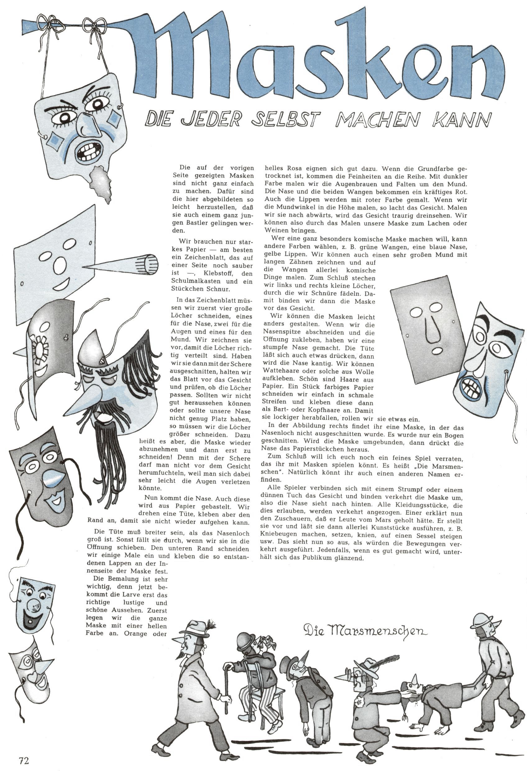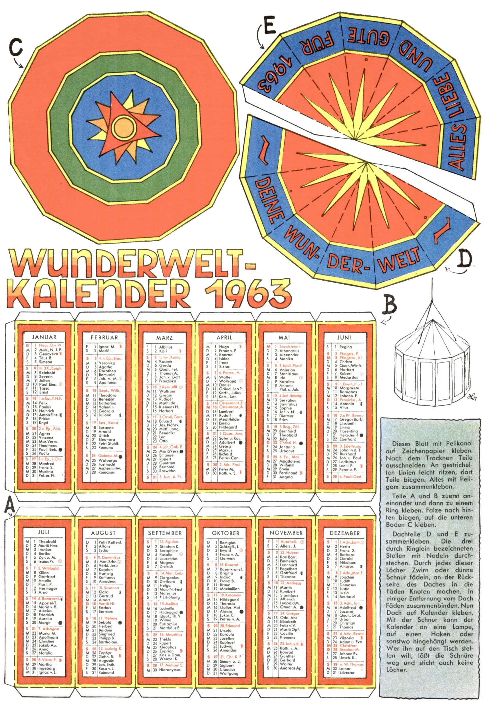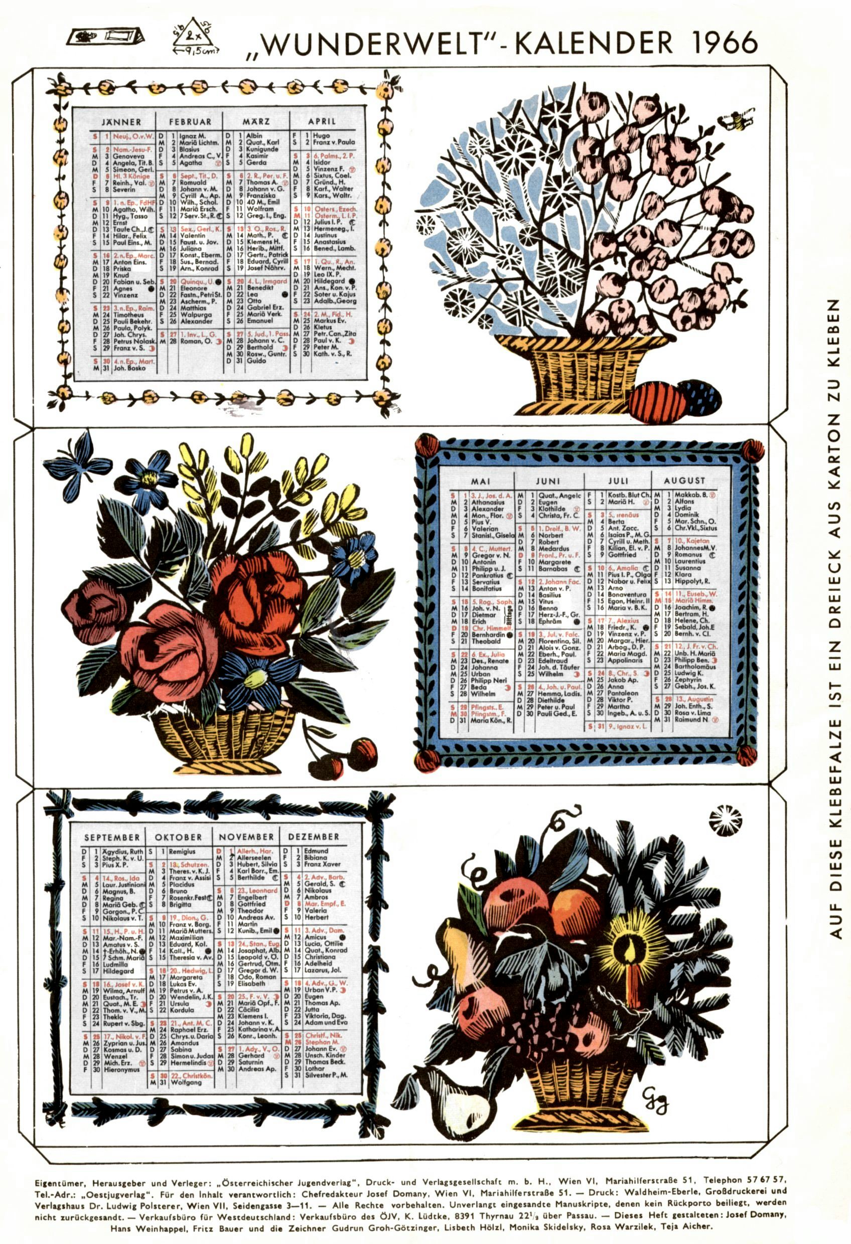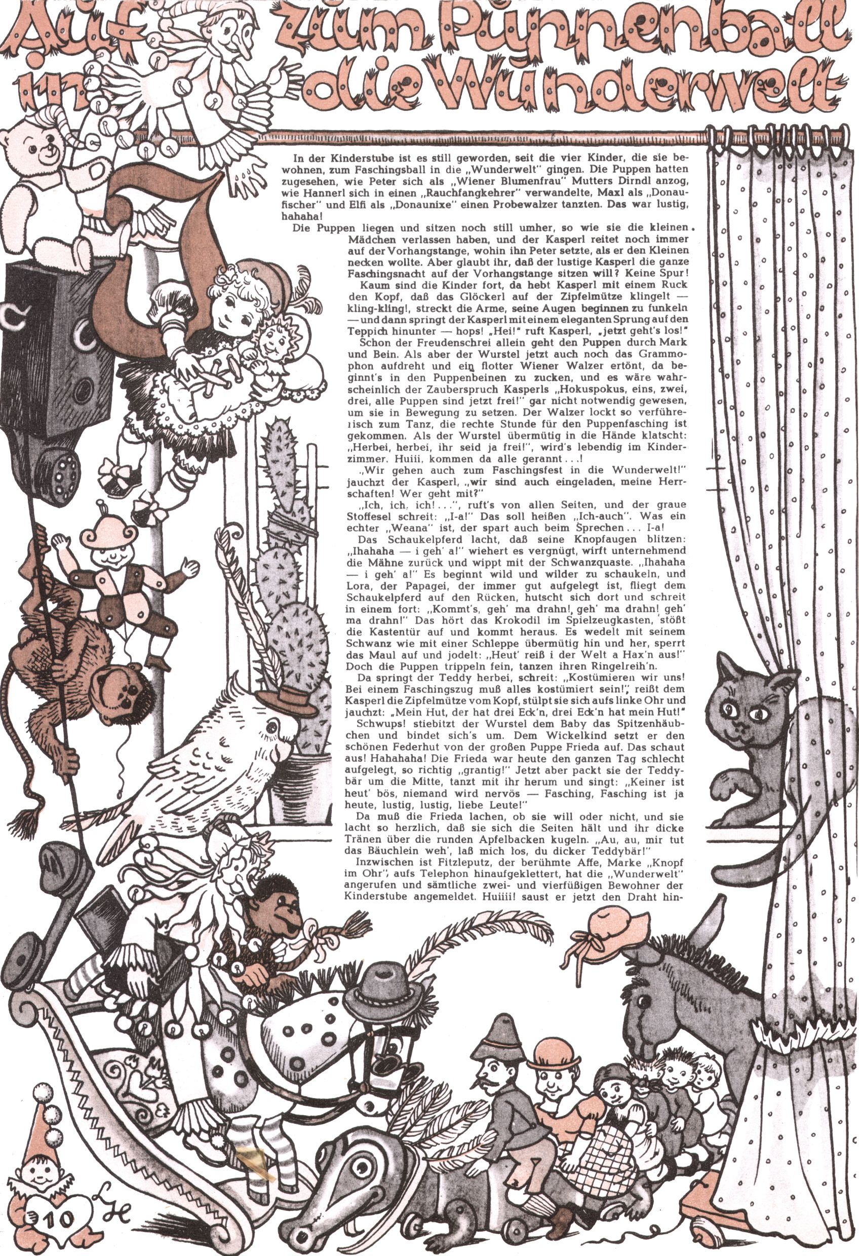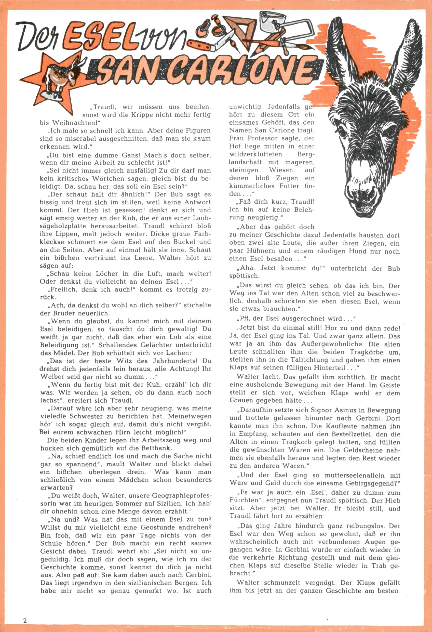 Die Wunderwelt im Festtagsgewand In den Sonderheften präsentierte sich die Wunderwelt wahrhaftig in Feiertagsstimmung. Mit wenigen Ausnahmen gab es pro Jahr drei Sonderhefte - zu Weihnachten bzw. im Advent, zu Ostern und in den Ferien im Sommer. Experimente mit Faschings- und Muttertagsheften hatten sich nicht bewährt. Selbst als es die Einzelhefte in der Krisensituation nach 1967 nicht mehr gab, wurde die Wunderwelt-Zeitung im Layout der Sonderhefte fortgesetzt: Zunächst mit 3 bis 5 und ab 1971 immerhin wieder mit 10-12 Heften pro Jahr. Die Weihnachts-, Oster- und Ferienhefte hatten naturgemäß verschiedene Schwerpunkte. Während im Sommer Spielen und Werken mit Material im Vordergrund stand, waren es zu Weihnachten Krippen und Adventhäuser; zu Ostern dann Erzählungen, Hasenstädte und Oster-Basteleien. Das bessere Papier der Sonderhefte erleichterte das Ausschneiden der insgesamt mehr als 1000 Papiermodelle erheblich. Die Sonderhefte waren vergleichsweise aufwändig gestaltet, aber auch ein wichtiges Zusatzgeschäft für die Zeitung. Die Kinder fieberten dem Erscheinungsdatum der jeweiligen Ausgabe nicht selten richtiggehend entgegen. Mit knapp 100 Seiten pro Jahr machten die Sonderhefte von der Menge her zwar nicht einmal ein Viertel aus, trugen aber zum Erscheinungsbild mindestens genauso viel bei wie die Standardhefte. Im Wesentlichen blieb das Layout der Sonderhefte über die Jahre hin unverändert. Mühselig wurde es, als man den Inhalt der Beiträge vorübergehend auf die Seiten gleichmäßig verteilte und die Kinder ermunterte, die Hefte in der Mitte zu zerschneiden. Die eine Hälfte enthielt dann etwa Erzählungen und Bastelvorschläge, der andere Teil der Zeitung Spielanleitungen. Zur übersichtlichkeit trugen diese Layoutversuche jedenfalls in keiner Weise bei und als besonderen Auswuchs gab es eine Zeitlang auf einer Seite oft mehrere Seitennummern, je nachdem, ob sich diese auf das Gesamtheft oder den herauszunehmenden und zu zerschneidenden Heftteil bezogen. Gegen Ende der 1950er Jahre kehrte man wieder zu einem ganzseitigen Layout zurück und Ideen wie ein Spiel-(Heft-im-)Heft gehörten der Vergangenheit an. In den Sonderheften experimentierte man dann noch ab Mitte der 1960er Jahre, als die Verkaufszahlen stark rückläufig waren, mit grundsätzlich neuen Darstellungsformen - weg vom Niedlich-Kitschigen und engagierte neue Grafikerinnen wie Gundi Groh und Hella Soyka. Den erhofften Erfolg brachte dies jedoch nicht mehr. |