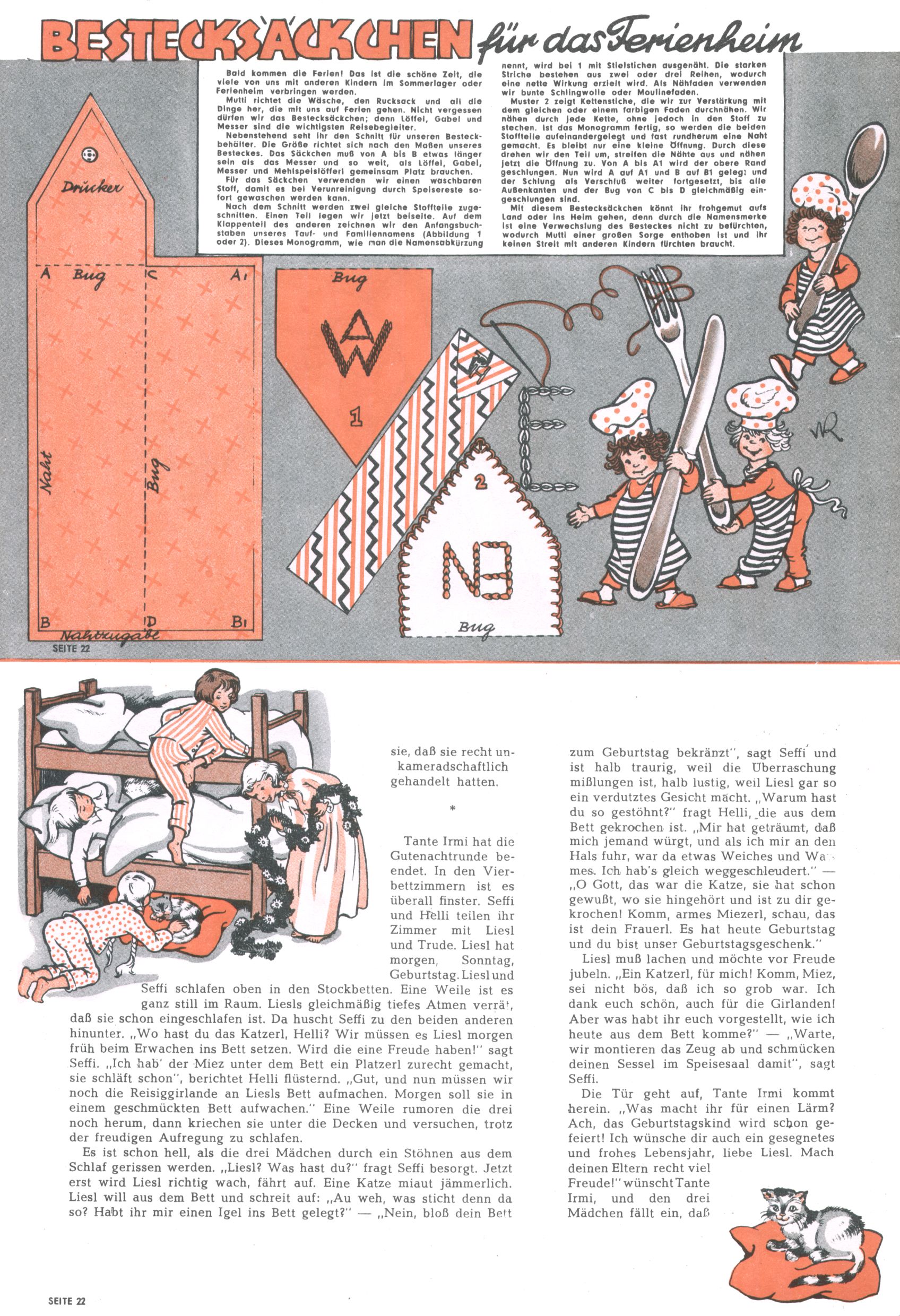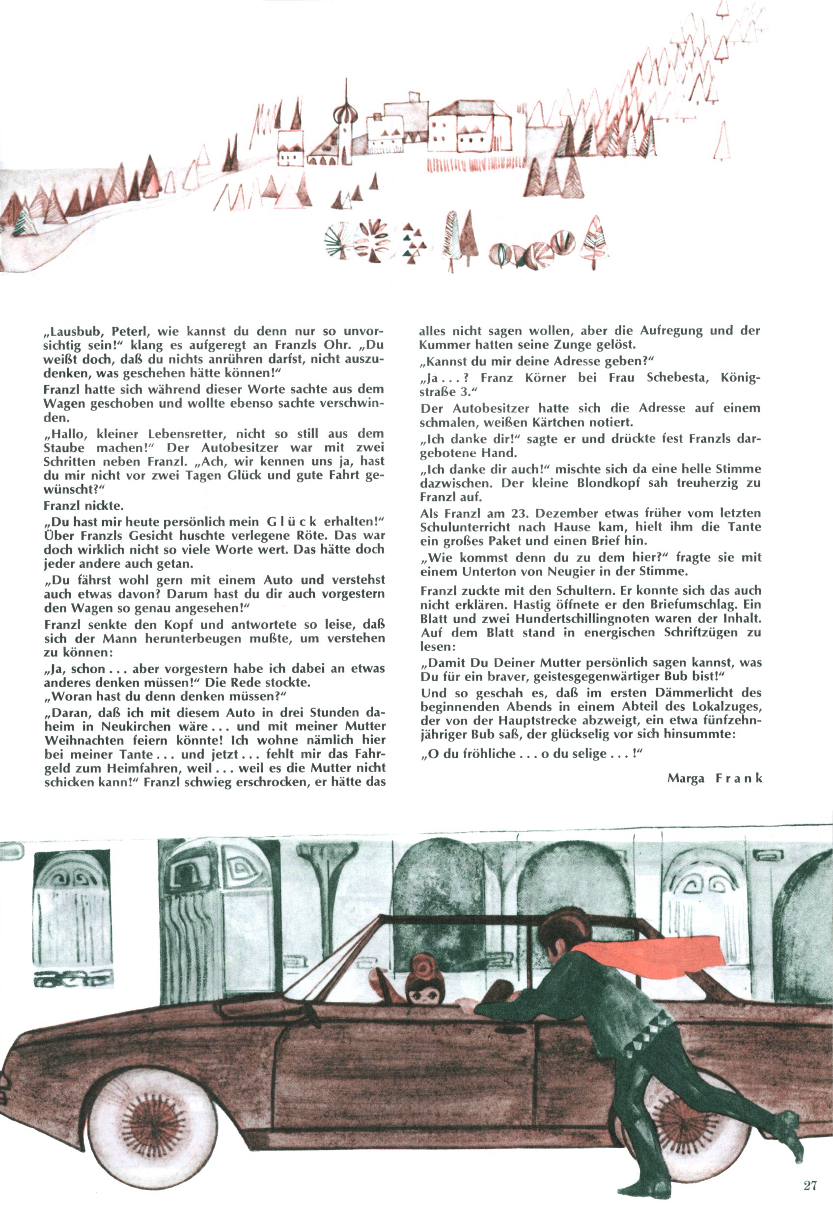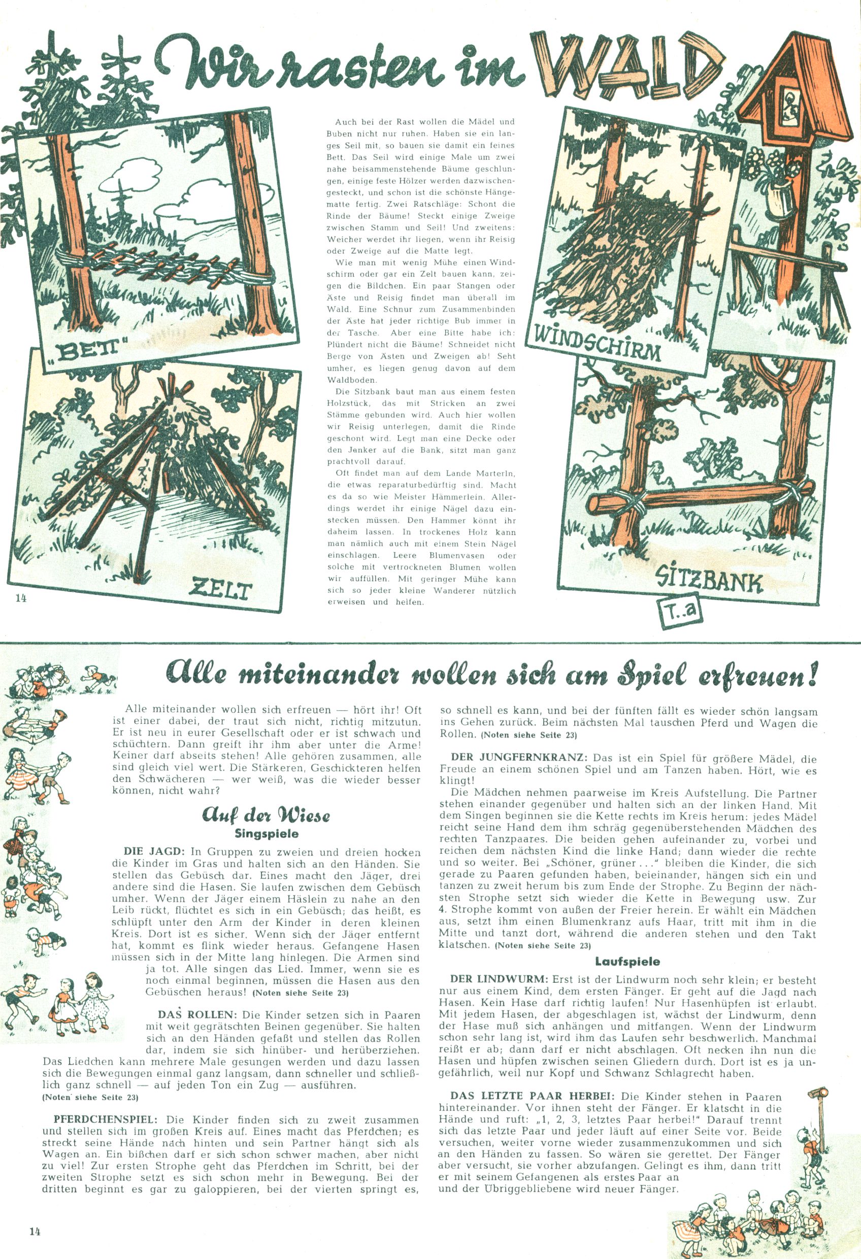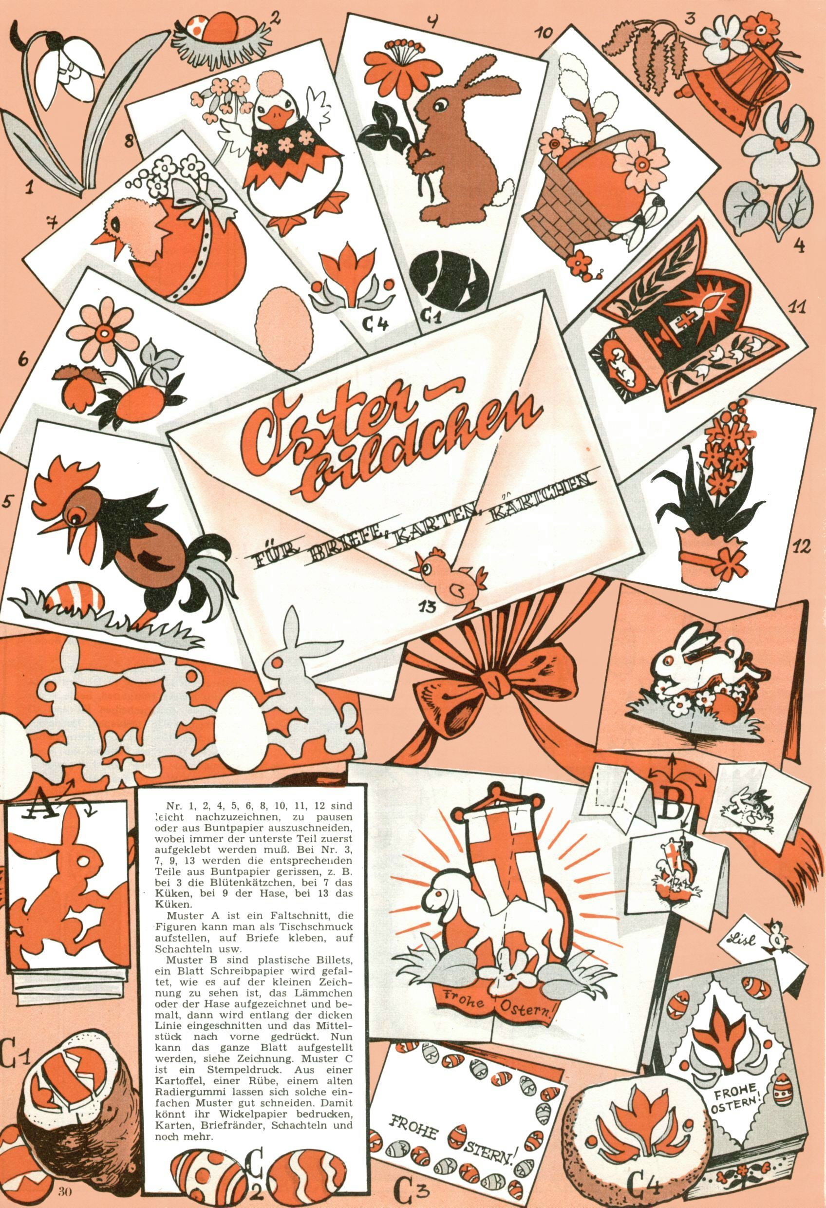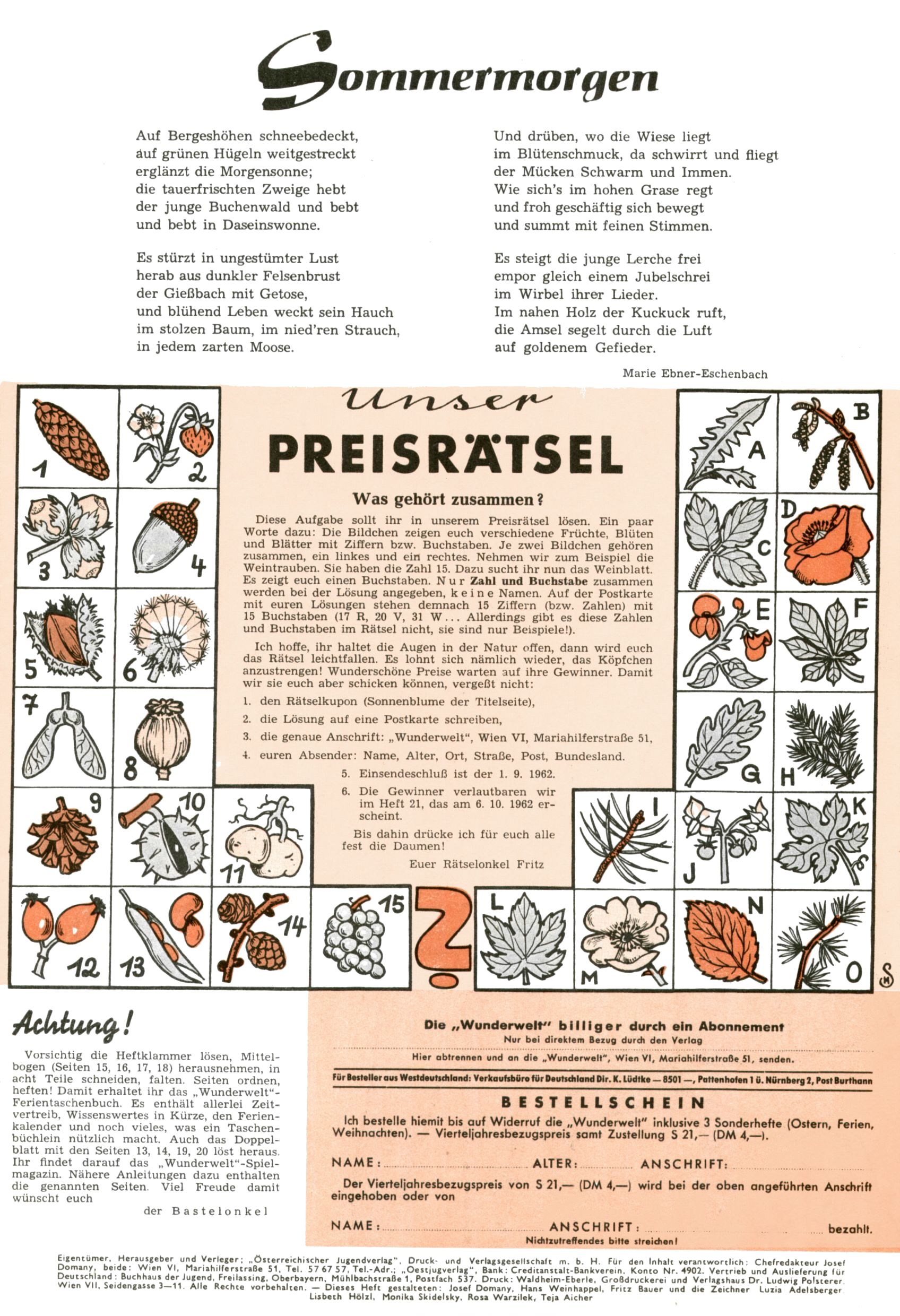 Die Wunderwelt im Festtagsgewand In den Sonderheften präsentierte sich die Wunderwelt wahrhaftig in Feiertagsstimmung. Mit wenigen Ausnahmen gab es pro Jahr drei Sonderhefte - zu Weihnachten bzw. im Advent, zu Ostern und in den Ferien im Sommer. Experimente mit Faschings- und Muttertagsheften hatten sich nicht bewährt. Selbst als es die Einzelhefte in der Krisensituation nach 1967 nicht mehr gab, wurde die Wunderwelt-Zeitung im Layout der Sonderhefte fortgesetzt: Zunächst mit 3 bis 5 und ab 1971 immerhin wieder mit 10-12 Heften pro Jahr. Die Weihnachts-, Oster- und Ferienhefte hatten naturgemäß verschiedene Schwerpunkte. Während im Sommer Spielen und Werken mit Material im Vordergrund stand, waren es zu Weihnachten Krippen und Adventhäuser; zu Ostern dann Erzählungen, Hasenstädte und Oster-Basteleien. Das bessere Papier der Sonderhefte erleichterte das Ausschneiden der insgesamt mehr als 1000 Papiermodelle erheblich. Die Sonderhefte waren vergleichsweise aufwändig gestaltet, aber auch ein wichtiges Zusatzgeschäft für die Zeitung. Die Kinder fieberten dem Erscheinungsdatum der jeweiligen Ausgabe nicht selten richtiggehend entgegen. Mit knapp 100 Seiten pro Jahr machten die Sonderhefte von der Menge her zwar nicht einmal ein Viertel aus, trugen aber zum Erscheinungsbild mindestens genauso viel bei wie die Standardhefte. Im Wesentlichen blieb das Layout der Sonderhefte über die Jahre hin unverändert. Mühselig wurde es, als man den Inhalt der Beiträge vorübergehend auf die Seiten gleichmäßig verteilte und die Kinder ermunterte, die Hefte in der Mitte zu zerschneiden. Die eine Hälfte enthielt dann etwa Erzählungen und Bastelvorschläge, der andere Teil der Zeitung Spielanleitungen. Zur übersichtlichkeit trugen diese Layoutversuche jedenfalls in keiner Weise bei und als besonderen Auswuchs gab es eine Zeitlang auf einer Seite oft mehrere Seitennummern, je nachdem, ob sich diese auf das Gesamtheft oder den herauszunehmenden und zu zerschneidenden Heftteil bezogen. Gegen Ende der 1950er Jahre kehrte man wieder zu einem ganzseitigen Layout zurück und Ideen wie ein Spiel-(Heft-im-)Heft gehörten der Vergangenheit an. In den Sonderheften experimentierte man dann noch ab Mitte der 1960er Jahre, als die Verkaufszahlen stark rückläufig waren, mit grundsätzlich neuen Darstellungsformen - weg vom Niedlich-Kitschigen und engagierte neue Grafikerinnen wie Gundi Groh und Hella Soyka. Den erhofften Erfolg brachte dies jedoch nicht mehr. |