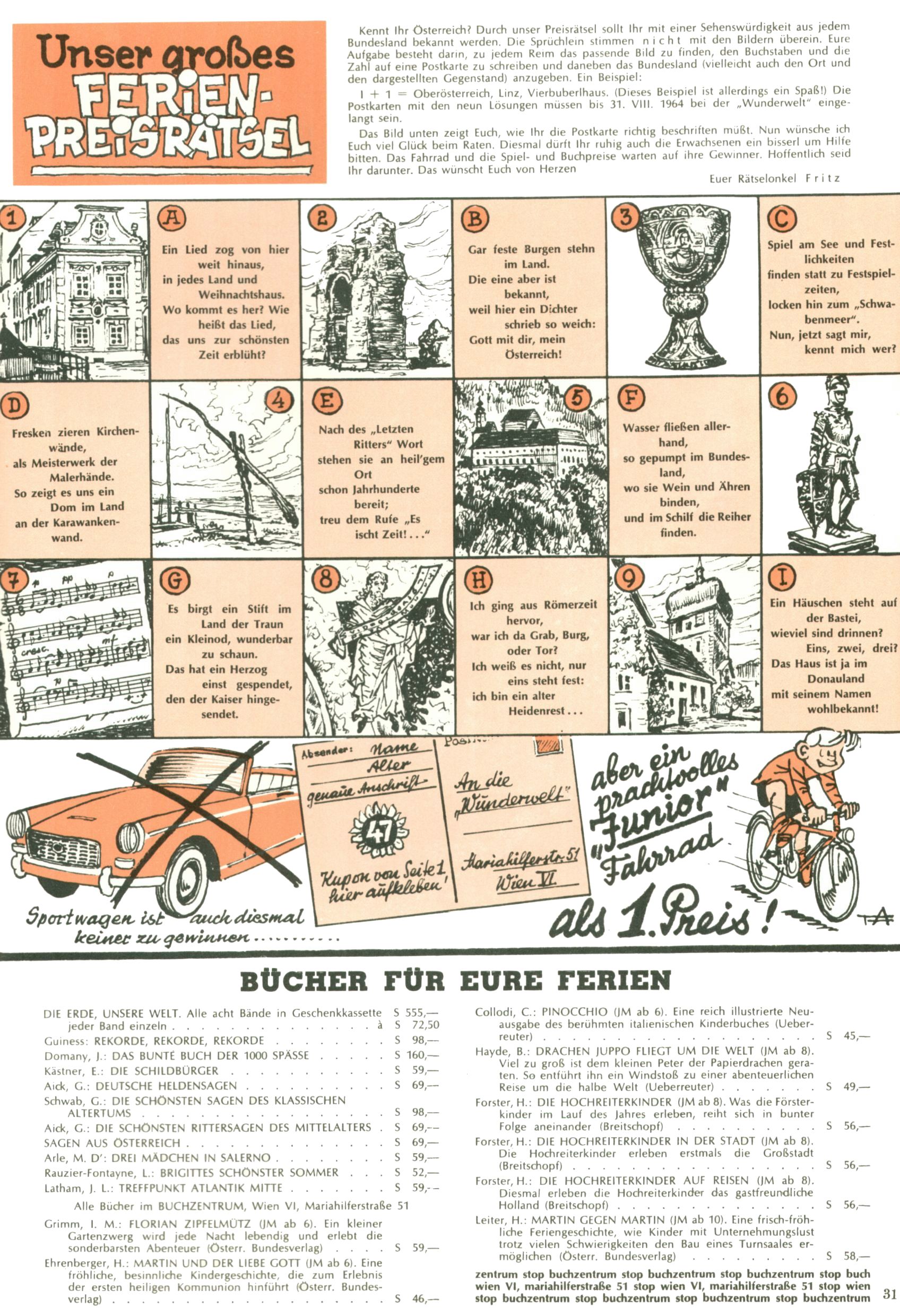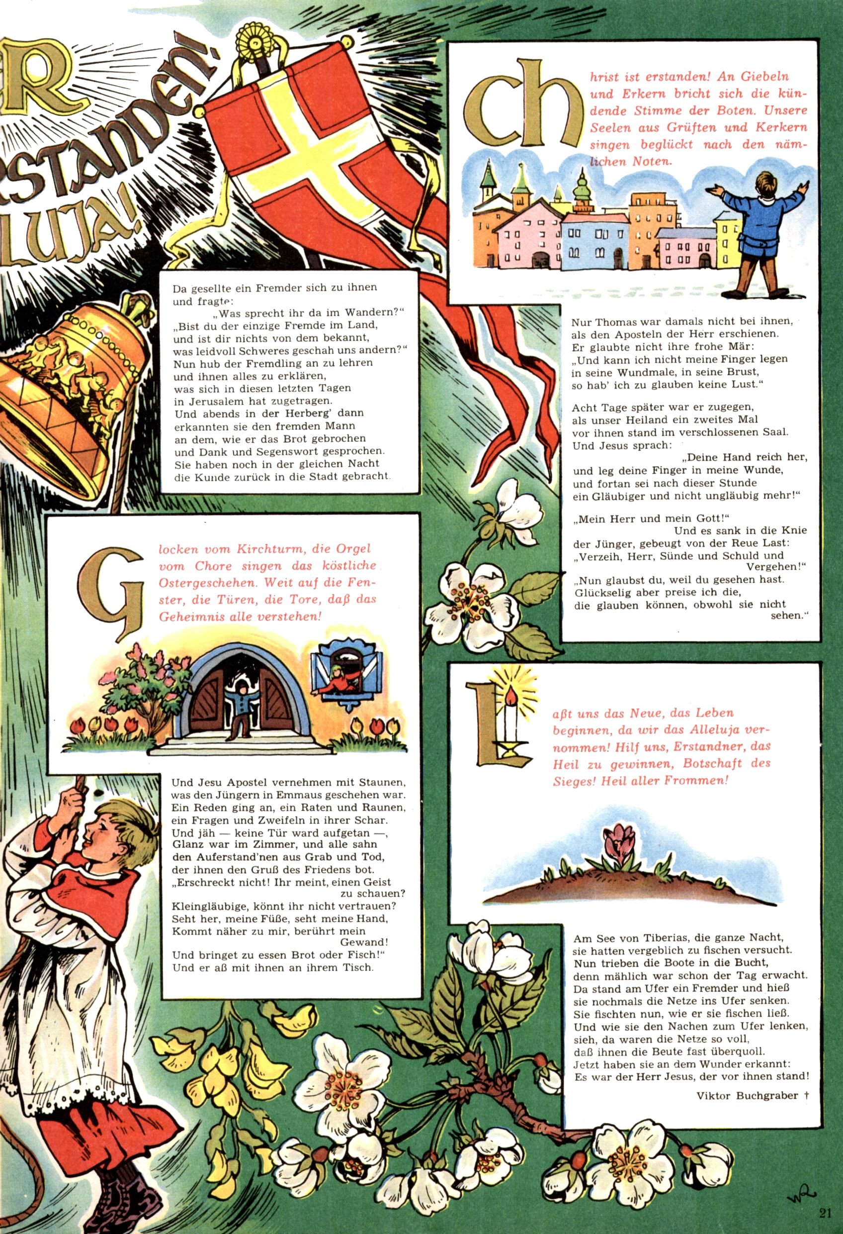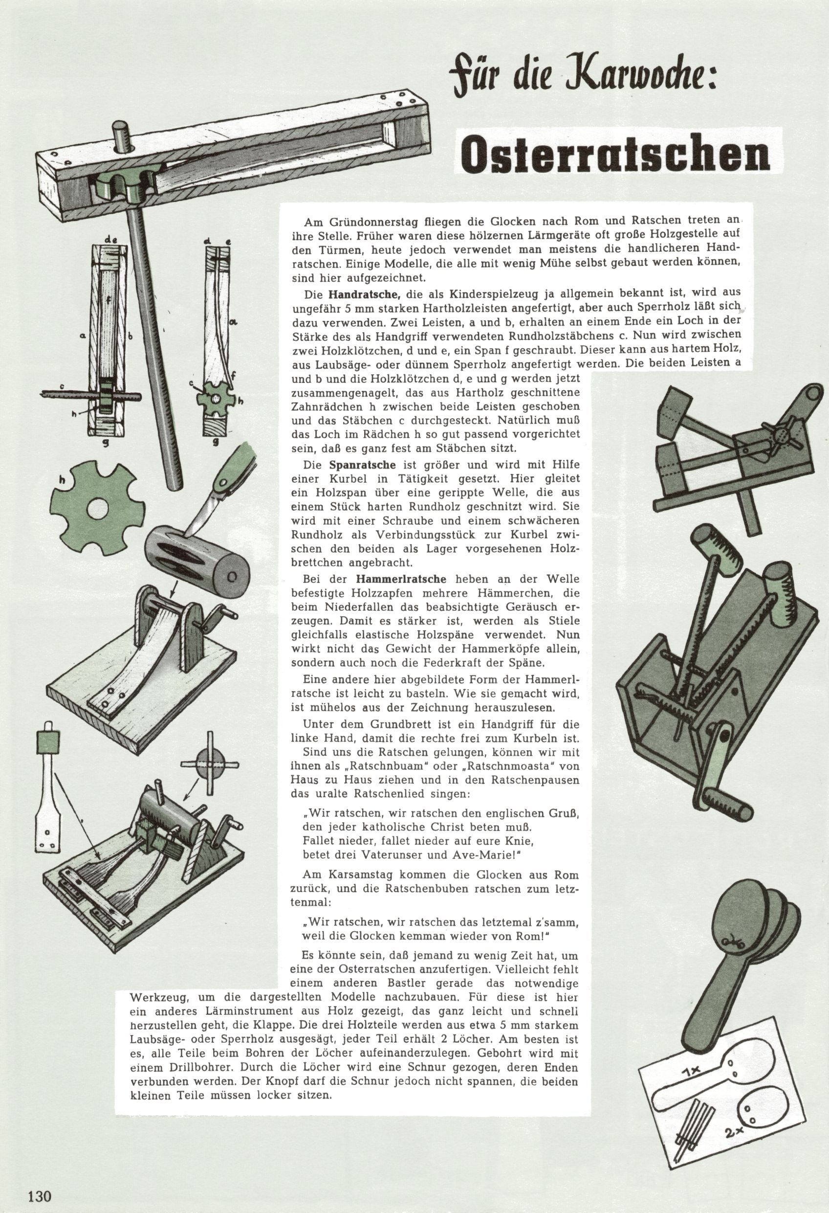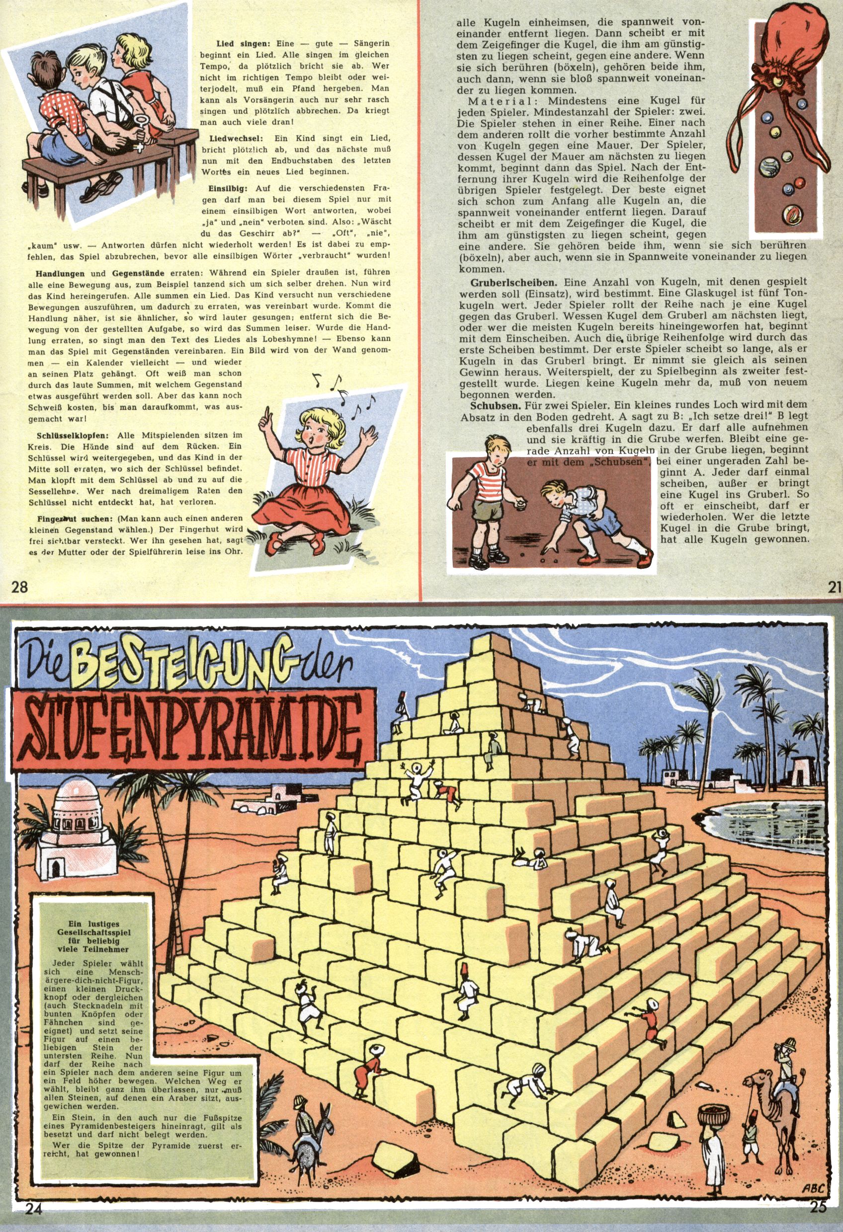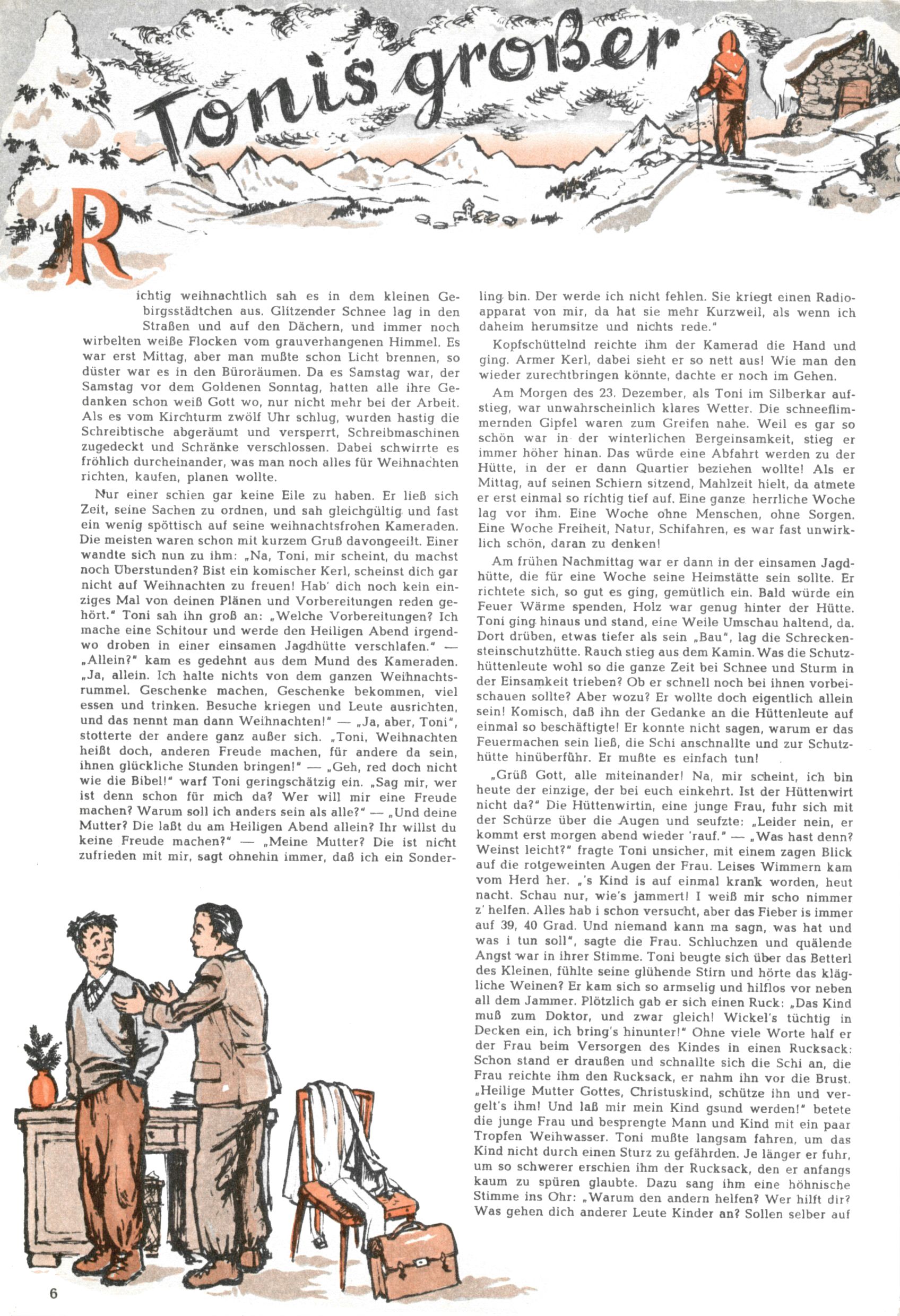 Die Wunderwelt im Festtagsgewand In den Sonderheften präsentierte sich die Wunderwelt wahrhaftig in Feiertagsstimmung. Mit wenigen Ausnahmen gab es pro Jahr drei Sonderhefte - zu Weihnachten bzw. im Advent, zu Ostern und in den Ferien im Sommer. Experimente mit Faschings- und Muttertagsheften hatten sich nicht bewährt. Selbst als es die Einzelhefte in der Krisensituation nach 1967 nicht mehr gab, wurde die Wunderwelt-Zeitung im Layout der Sonderhefte fortgesetzt: Zunächst mit 3 bis 5 und ab 1971 immerhin wieder mit 10-12 Heften pro Jahr. Die Weihnachts-, Oster- und Ferienhefte hatten naturgemäß verschiedene Schwerpunkte. Während im Sommer Spielen und Werken mit Material im Vordergrund stand, waren es zu Weihnachten Krippen und Adventhäuser; zu Ostern dann Erzählungen, Hasenstädte und Oster-Basteleien. Das bessere Papier der Sonderhefte erleichterte das Ausschneiden der insgesamt mehr als 1000 Papiermodelle erheblich. Die Sonderhefte waren vergleichsweise aufwändig gestaltet, aber auch ein wichtiges Zusatzgeschäft für die Zeitung. Die Kinder fieberten dem Erscheinungsdatum der jeweiligen Ausgabe nicht selten richtiggehend entgegen. Mit knapp 100 Seiten pro Jahr machten die Sonderhefte von der Menge her zwar nicht einmal ein Viertel aus, trugen aber zum Erscheinungsbild mindestens genauso viel bei wie die Standardhefte. Im Wesentlichen blieb das Layout der Sonderhefte über die Jahre hin unverändert. Mühselig wurde es, als man den Inhalt der Beiträge vorübergehend auf die Seiten gleichmäßig verteilte und die Kinder ermunterte, die Hefte in der Mitte zu zerschneiden. Die eine Hälfte enthielt dann etwa Erzählungen und Bastelvorschläge, der andere Teil der Zeitung Spielanleitungen. Zur übersichtlichkeit trugen diese Layoutversuche jedenfalls in keiner Weise bei und als besonderen Auswuchs gab es eine Zeitlang auf einer Seite oft mehrere Seitennummern, je nachdem, ob sich diese auf das Gesamtheft oder den herauszunehmenden und zu zerschneidenden Heftteil bezogen. Gegen Ende der 1950er Jahre kehrte man wieder zu einem ganzseitigen Layout zurück und Ideen wie ein Spiel-(Heft-im-)Heft gehörten der Vergangenheit an. In den Sonderheften experimentierte man dann noch ab Mitte der 1960er Jahre, als die Verkaufszahlen stark rückläufig waren, mit grundsätzlich neuen Darstellungsformen - weg vom Niedlich-Kitschigen und engagierte neue Grafikerinnen wie Gundi Groh und Hella Soyka. Den erhofften Erfolg brachte dies jedoch nicht mehr. |