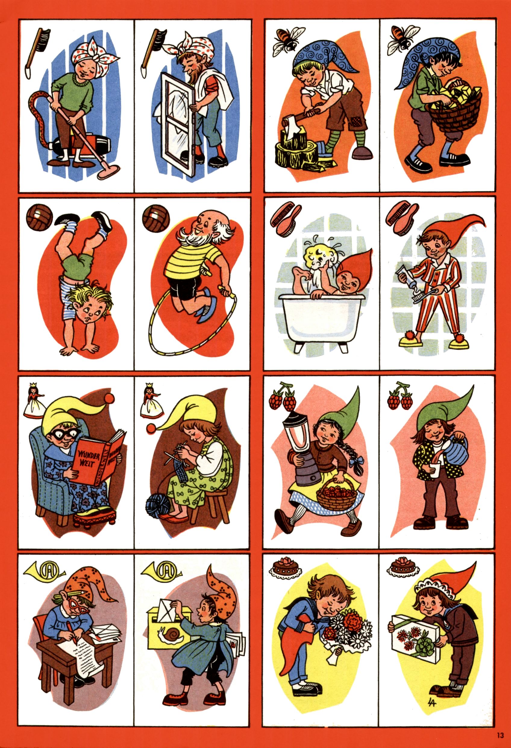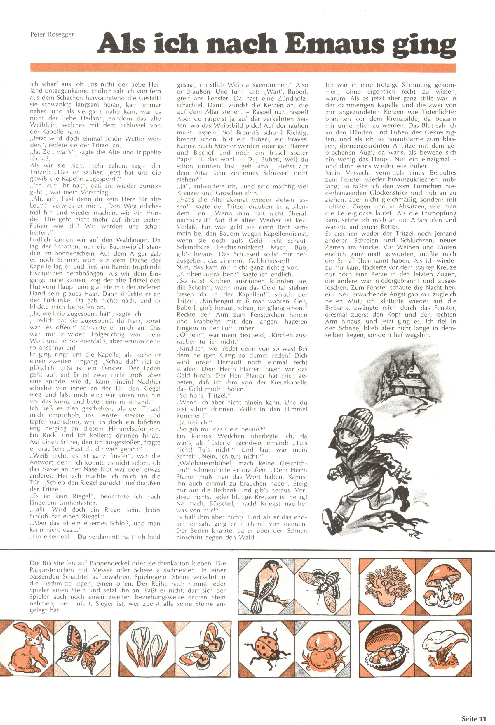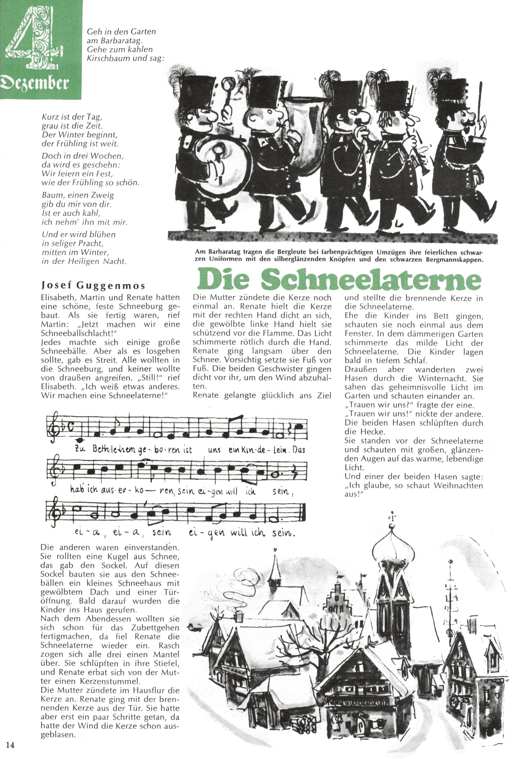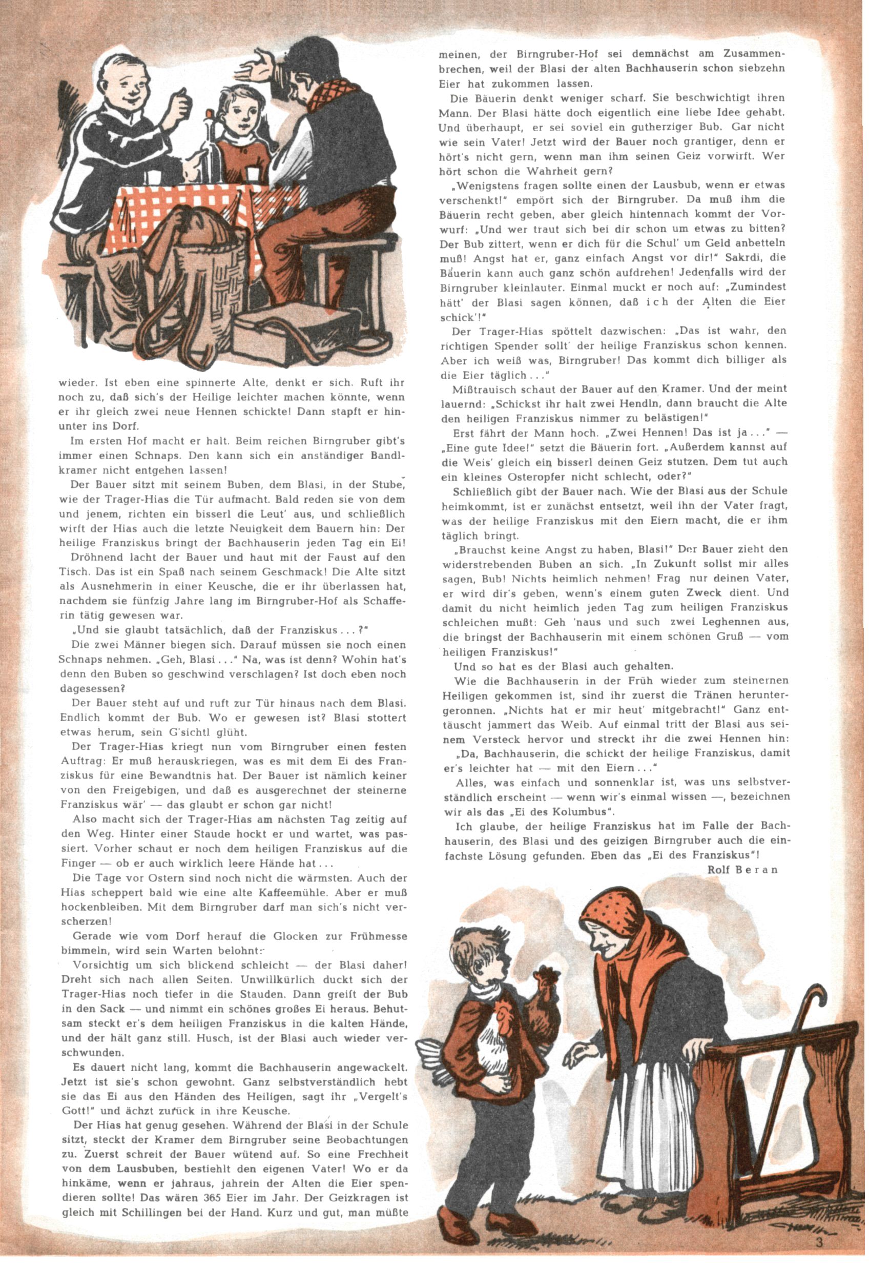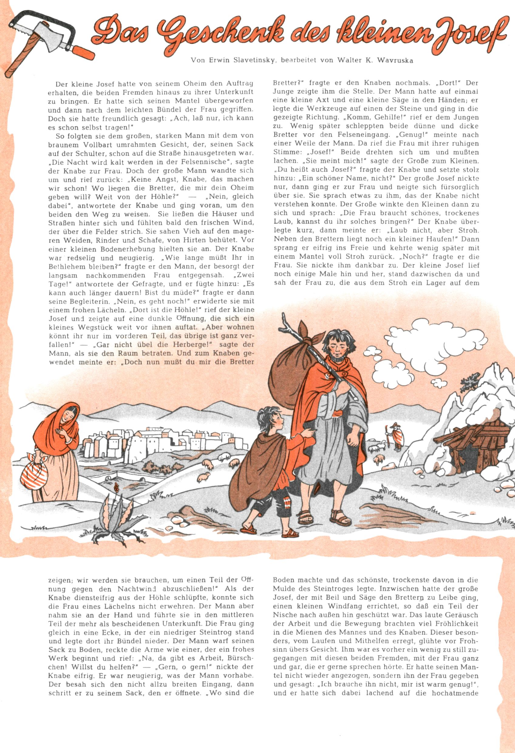 Die Wunderwelt im Festtagsgewand In den Sonderheften präsentierte sich die Wunderwelt wahrhaftig in Feiertagsstimmung. Mit wenigen Ausnahmen gab es pro Jahr drei Sonderhefte - zu Weihnachten bzw. im Advent, zu Ostern und in den Ferien im Sommer. Experimente mit Faschings- und Muttertagsheften hatten sich nicht bewährt. Selbst als es die Einzelhefte in der Krisensituation nach 1967 nicht mehr gab, wurde die Wunderwelt-Zeitung im Layout der Sonderhefte fortgesetzt: Zunächst mit 3 bis 5 und ab 1971 immerhin wieder mit 10-12 Heften pro Jahr. Die Weihnachts-, Oster- und Ferienhefte hatten naturgemäß verschiedene Schwerpunkte. Während im Sommer Spielen und Werken mit Material im Vordergrund stand, waren es zu Weihnachten Krippen und Adventhäuser; zu Ostern dann Erzählungen, Hasenstädte und Oster-Basteleien. Das bessere Papier der Sonderhefte erleichterte das Ausschneiden der insgesamt mehr als 1000 Papiermodelle erheblich. Die Sonderhefte waren vergleichsweise aufwändig gestaltet, aber auch ein wichtiges Zusatzgeschäft für die Zeitung. Die Kinder fieberten dem Erscheinungsdatum der jeweiligen Ausgabe nicht selten richtiggehend entgegen. Mit knapp 100 Seiten pro Jahr machten die Sonderhefte von der Menge her zwar nicht einmal ein Viertel aus, trugen aber zum Erscheinungsbild mindestens genauso viel bei wie die Standardhefte. Im Wesentlichen blieb das Layout der Sonderhefte über die Jahre hin unverändert. Mühselig wurde es, als man den Inhalt der Beiträge vorübergehend auf die Seiten gleichmäßig verteilte und die Kinder ermunterte, die Hefte in der Mitte zu zerschneiden. Die eine Hälfte enthielt dann etwa Erzählungen und Bastelvorschläge, der andere Teil der Zeitung Spielanleitungen. Zur übersichtlichkeit trugen diese Layoutversuche jedenfalls in keiner Weise bei und als besonderen Auswuchs gab es eine Zeitlang auf einer Seite oft mehrere Seitennummern, je nachdem, ob sich diese auf das Gesamtheft oder den herauszunehmenden und zu zerschneidenden Heftteil bezogen. Gegen Ende der 1950er Jahre kehrte man wieder zu einem ganzseitigen Layout zurück und Ideen wie ein Spiel-(Heft-im-)Heft gehörten der Vergangenheit an. In den Sonderheften experimentierte man dann noch ab Mitte der 1960er Jahre, als die Verkaufszahlen stark rückläufig waren, mit grundsätzlich neuen Darstellungsformen - weg vom Niedlich-Kitschigen und engagierte neue Grafikerinnen wie Gundi Groh und Hella Soyka. Den erhofften Erfolg brachte dies jedoch nicht mehr. |