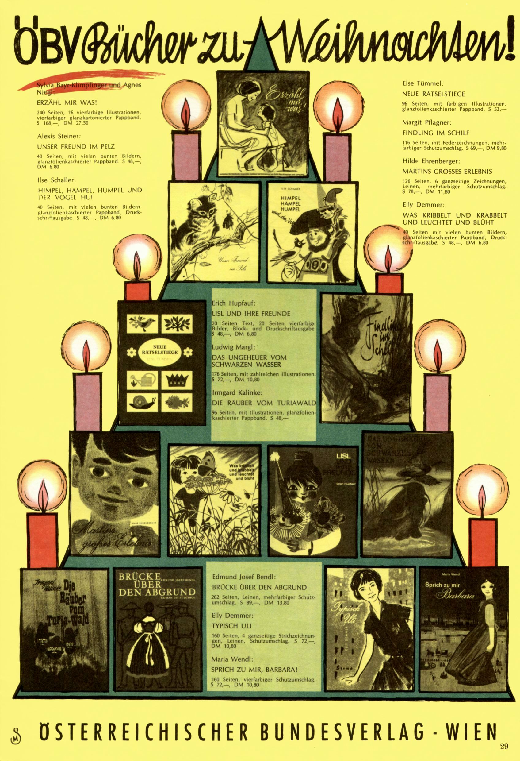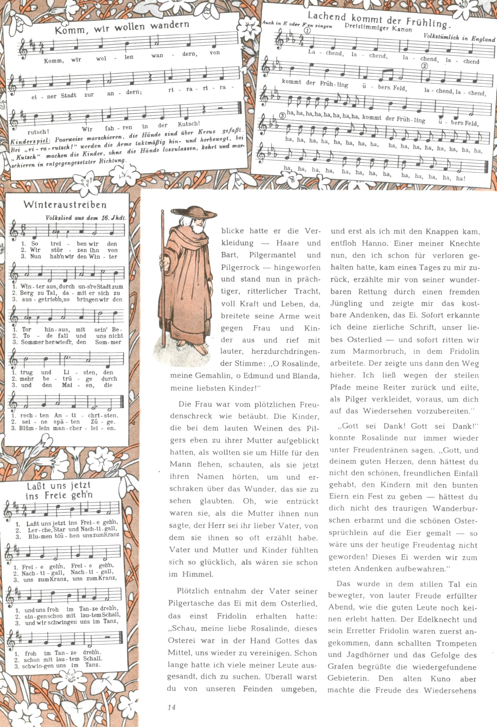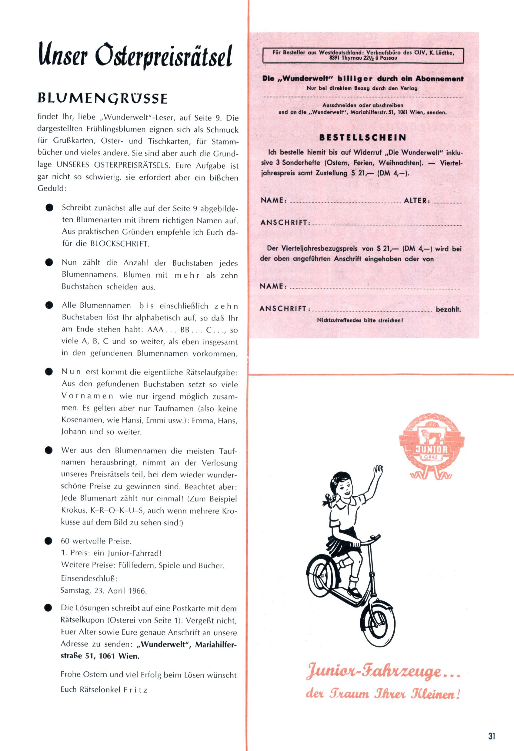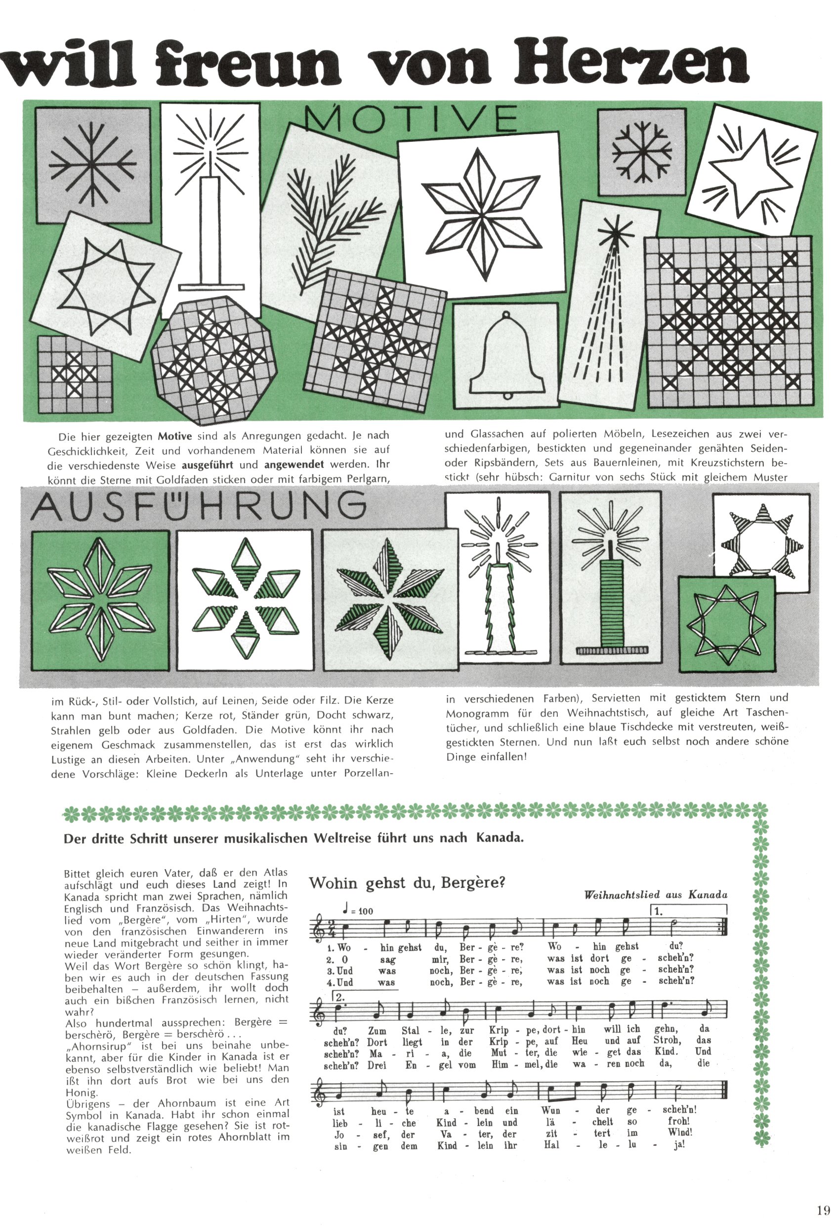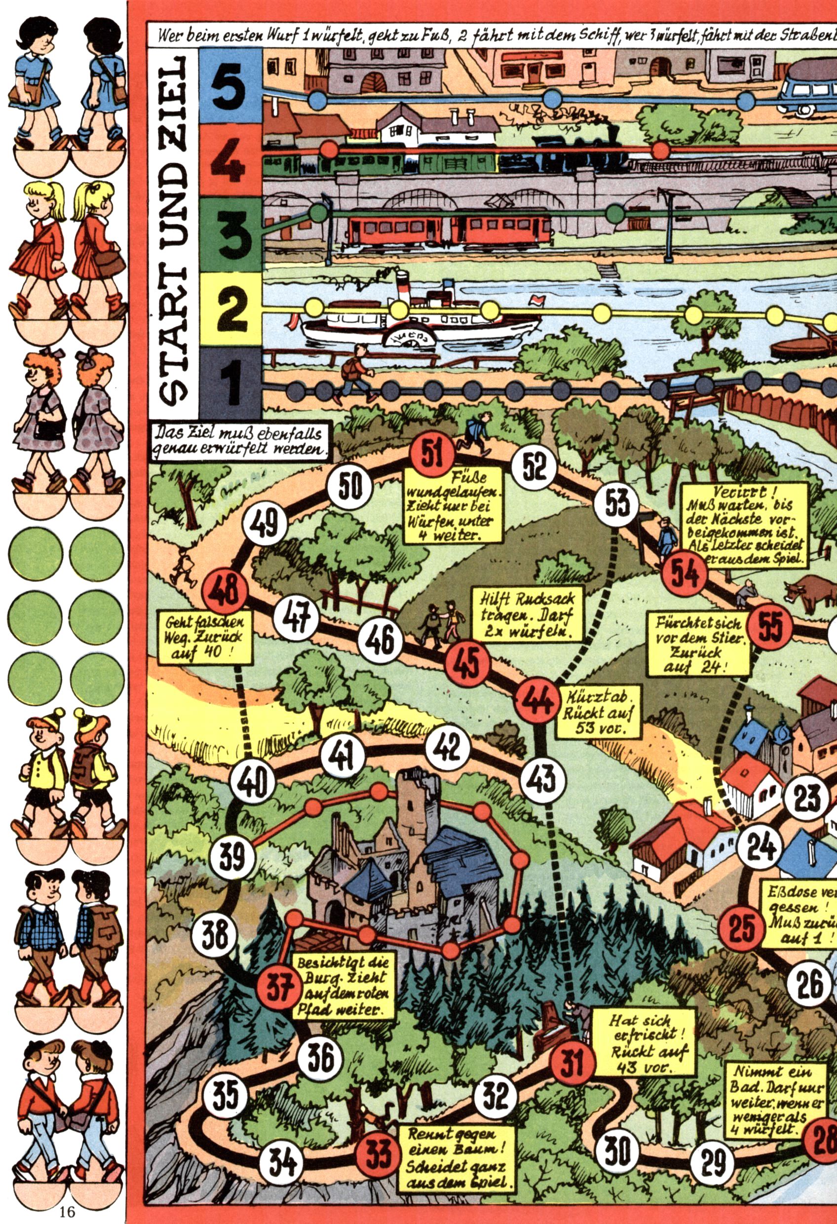 Die Wunderwelt im Festtagsgewand In den Sonderheften präsentierte sich die Wunderwelt wahrhaftig in Feiertagsstimmung. Mit wenigen Ausnahmen gab es pro Jahr drei Sonderhefte - zu Weihnachten bzw. im Advent, zu Ostern und in den Ferien im Sommer. Experimente mit Faschings- und Muttertagsheften hatten sich nicht bewährt. Selbst als es die Einzelhefte in der Krisensituation nach 1967 nicht mehr gab, wurde die Wunderwelt-Zeitung im Layout der Sonderhefte fortgesetzt: Zunächst mit 3 bis 5 und ab 1971 immerhin wieder mit 10-12 Heften pro Jahr. Die Weihnachts-, Oster- und Ferienhefte hatten naturgemäß verschiedene Schwerpunkte. Während im Sommer Spielen und Werken mit Material im Vordergrund stand, waren es zu Weihnachten Krippen und Adventhäuser; zu Ostern dann Erzählungen, Hasenstädte und Oster-Basteleien. Das bessere Papier der Sonderhefte erleichterte das Ausschneiden der insgesamt mehr als 1000 Papiermodelle erheblich. Die Sonderhefte waren vergleichsweise aufwändig gestaltet, aber auch ein wichtiges Zusatzgeschäft für die Zeitung. Die Kinder fieberten dem Erscheinungsdatum der jeweiligen Ausgabe nicht selten richtiggehend entgegen. Mit knapp 100 Seiten pro Jahr machten die Sonderhefte von der Menge her zwar nicht einmal ein Viertel aus, trugen aber zum Erscheinungsbild mindestens genauso viel bei wie die Standardhefte. Im Wesentlichen blieb das Layout der Sonderhefte über die Jahre hin unverändert. Mühselig wurde es, als man den Inhalt der Beiträge vorübergehend auf die Seiten gleichmäßig verteilte und die Kinder ermunterte, die Hefte in der Mitte zu zerschneiden. Die eine Hälfte enthielt dann etwa Erzählungen und Bastelvorschläge, der andere Teil der Zeitung Spielanleitungen. Zur übersichtlichkeit trugen diese Layoutversuche jedenfalls in keiner Weise bei und als besonderen Auswuchs gab es eine Zeitlang auf einer Seite oft mehrere Seitennummern, je nachdem, ob sich diese auf das Gesamtheft oder den herauszunehmenden und zu zerschneidenden Heftteil bezogen. Gegen Ende der 1950er Jahre kehrte man wieder zu einem ganzseitigen Layout zurück und Ideen wie ein Spiel-(Heft-im-)Heft gehörten der Vergangenheit an. In den Sonderheften experimentierte man dann noch ab Mitte der 1960er Jahre, als die Verkaufszahlen stark rückläufig waren, mit grundsätzlich neuen Darstellungsformen - weg vom Niedlich-Kitschigen und engagierte neue Grafikerinnen wie Gundi Groh und Hella Soyka. Den erhofften Erfolg brachte dies jedoch nicht mehr. |
