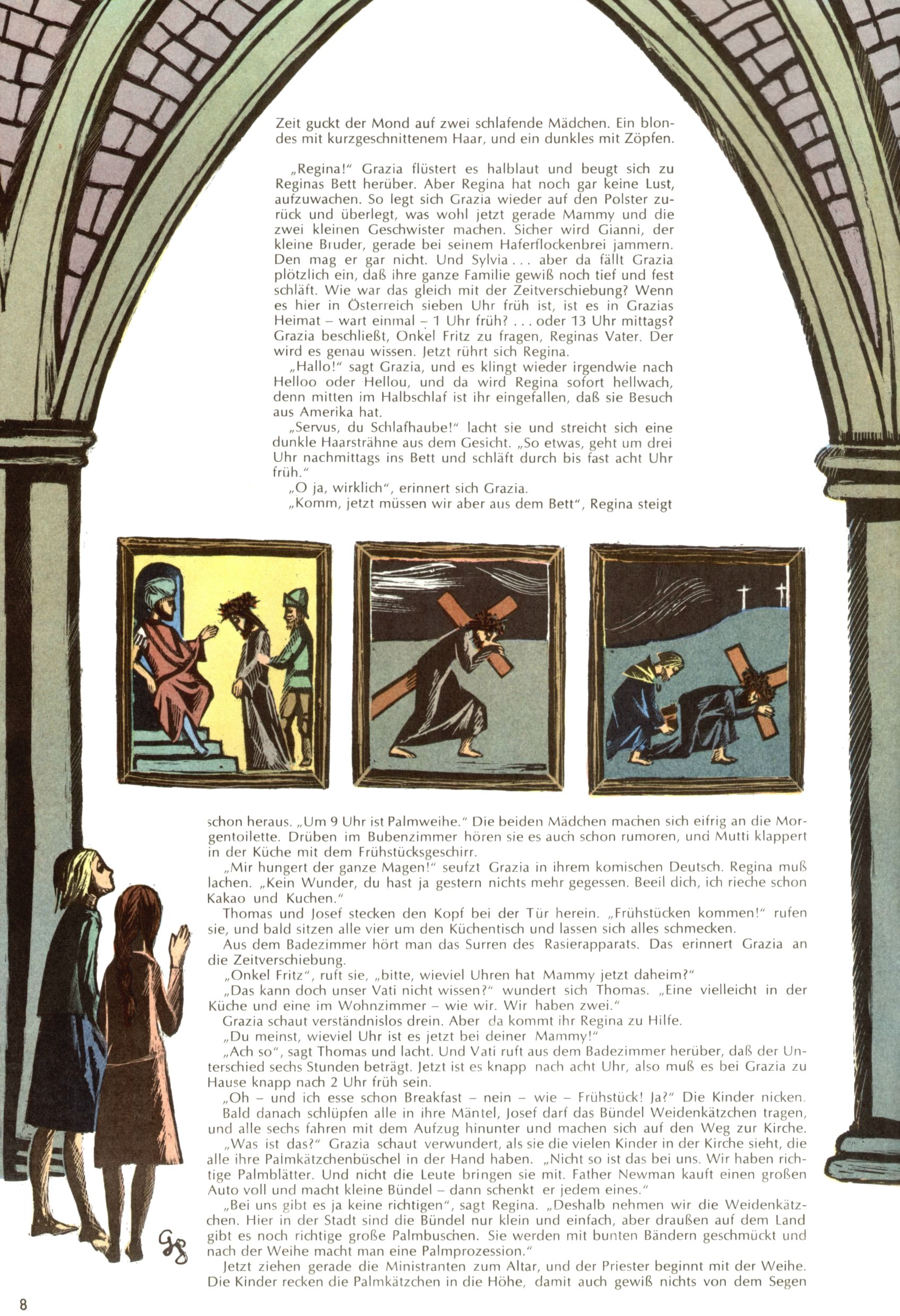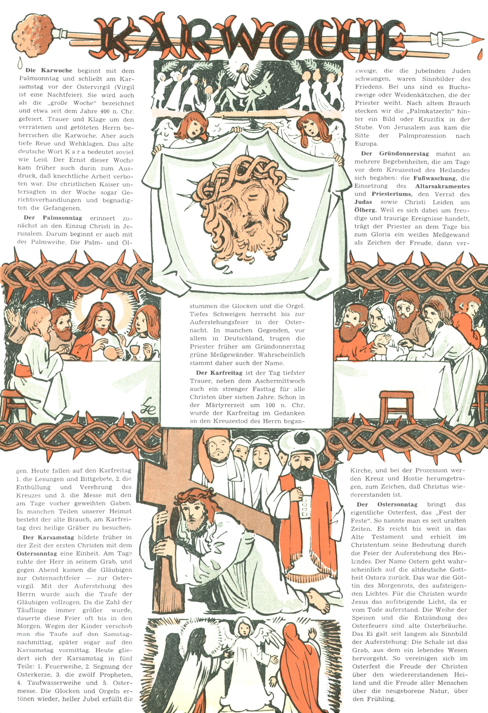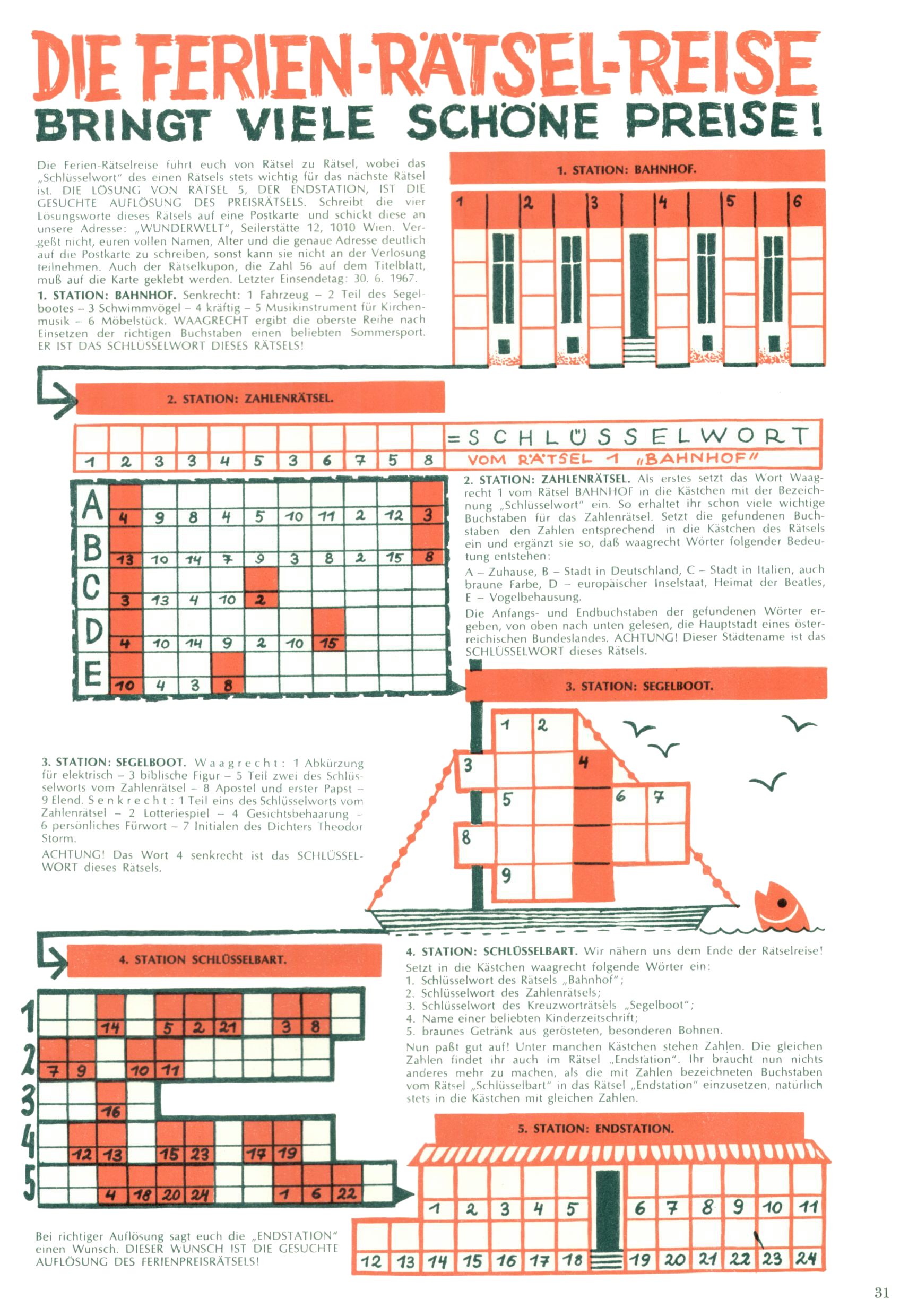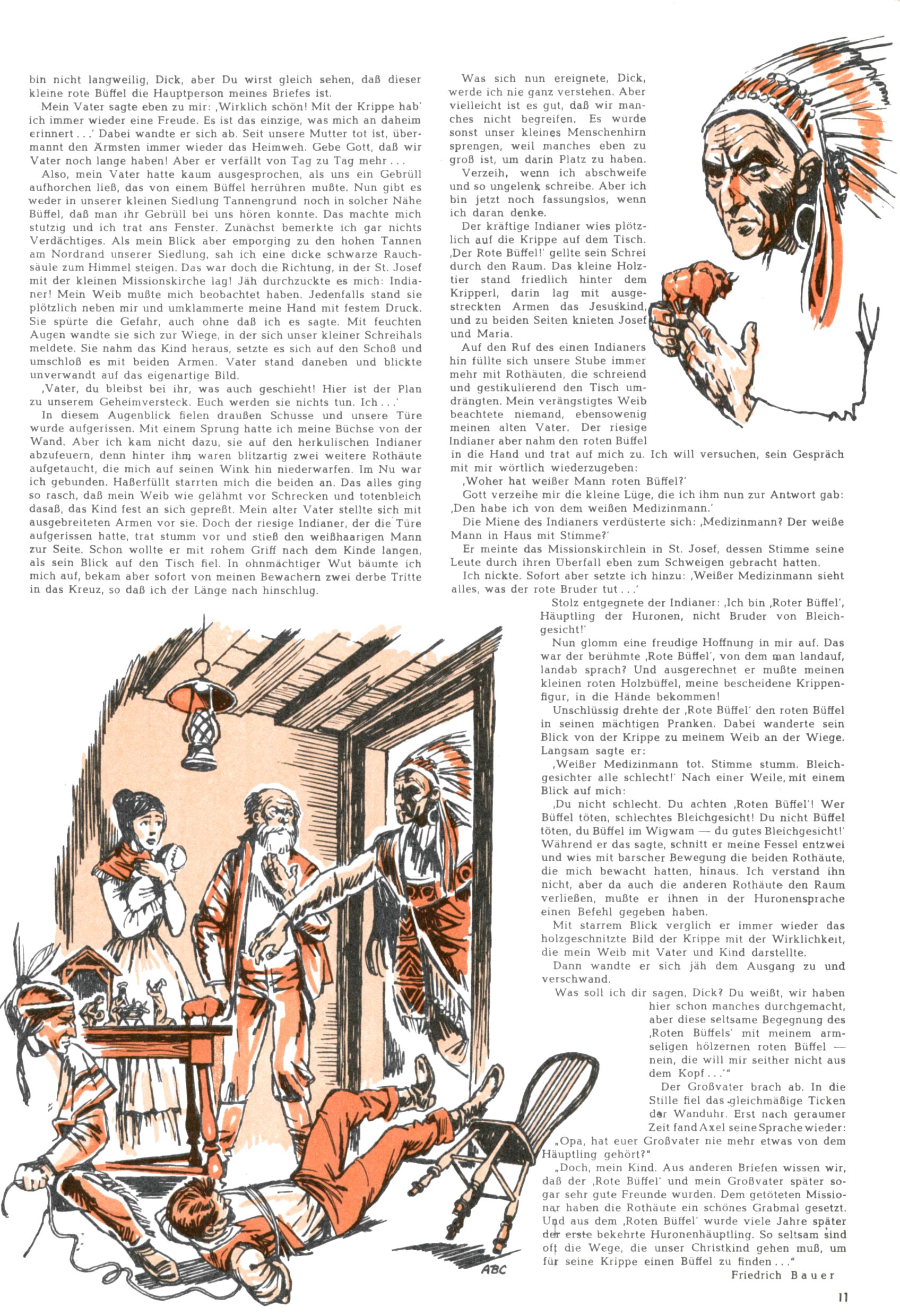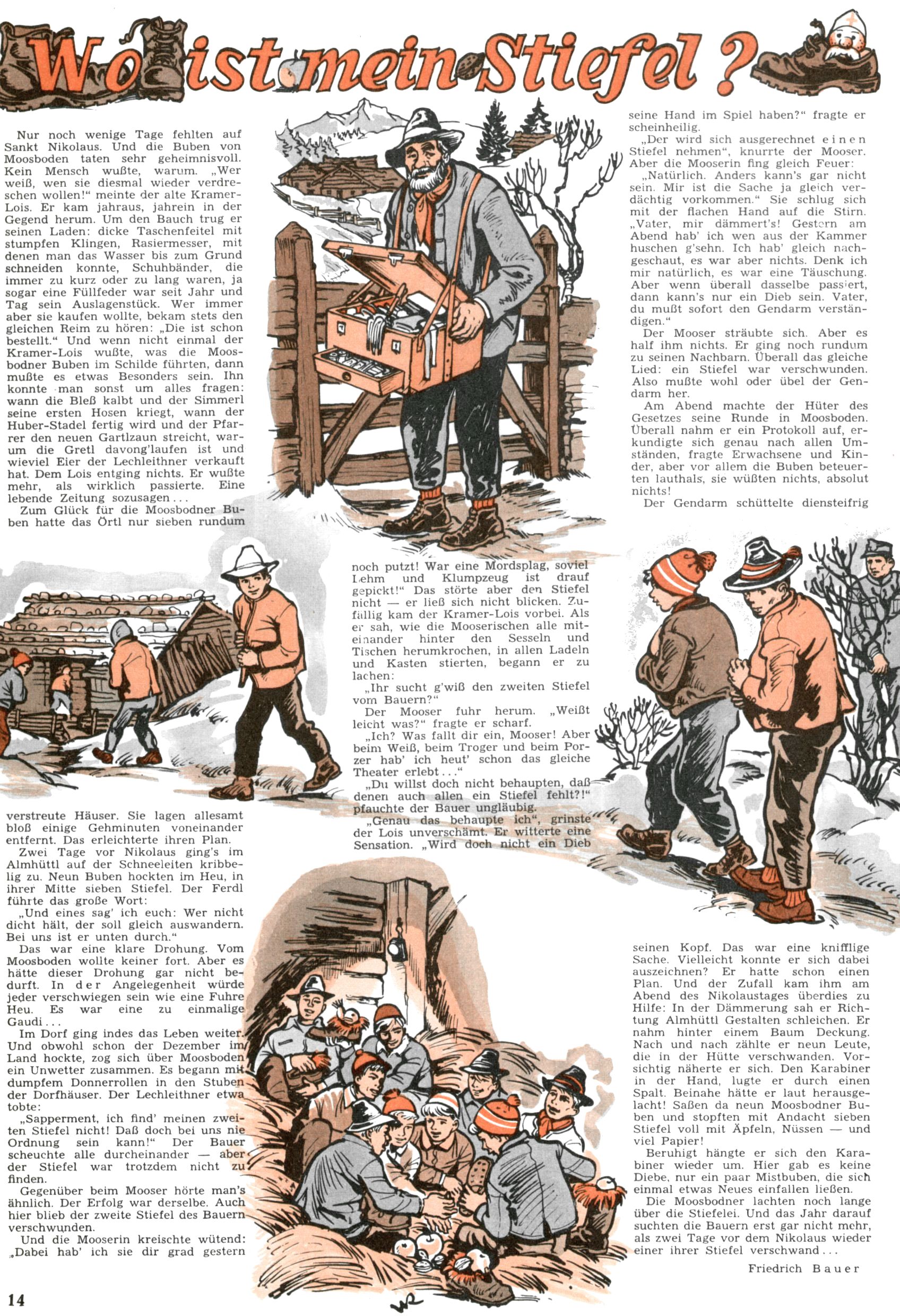 Die Wunderwelt im Festtagsgewand In den Sonderheften präsentierte sich die Wunderwelt wahrhaftig in Feiertagsstimmung. Mit wenigen Ausnahmen gab es pro Jahr drei Sonderhefte - zu Weihnachten bzw. im Advent, zu Ostern und in den Ferien im Sommer. Experimente mit Faschings- und Muttertagsheften hatten sich nicht bewährt. Selbst als es die Einzelhefte in der Krisensituation nach 1967 nicht mehr gab, wurde die Wunderwelt-Zeitung im Layout der Sonderhefte fortgesetzt: Zunächst mit 3 bis 5 und ab 1971 immerhin wieder mit 10-12 Heften pro Jahr. Die Weihnachts-, Oster- und Ferienhefte hatten naturgemäß verschiedene Schwerpunkte. Während im Sommer Spielen und Werken mit Material im Vordergrund stand, waren es zu Weihnachten Krippen und Adventhäuser; zu Ostern dann Erzählungen, Hasenstädte und Oster-Basteleien. Das bessere Papier der Sonderhefte erleichterte das Ausschneiden der insgesamt mehr als 1000 Papiermodelle erheblich. Die Sonderhefte waren vergleichsweise aufwändig gestaltet, aber auch ein wichtiges Zusatzgeschäft für die Zeitung. Die Kinder fieberten dem Erscheinungsdatum der jeweiligen Ausgabe nicht selten richtiggehend entgegen. Mit knapp 100 Seiten pro Jahr machten die Sonderhefte von der Menge her zwar nicht einmal ein Viertel aus, trugen aber zum Erscheinungsbild mindestens genauso viel bei wie die Standardhefte. Im Wesentlichen blieb das Layout der Sonderhefte über die Jahre hin unverändert. Mühselig wurde es, als man den Inhalt der Beiträge vorübergehend auf die Seiten gleichmäßig verteilte und die Kinder ermunterte, die Hefte in der Mitte zu zerschneiden. Die eine Hälfte enthielt dann etwa Erzählungen und Bastelvorschläge, der andere Teil der Zeitung Spielanleitungen. Zur übersichtlichkeit trugen diese Layoutversuche jedenfalls in keiner Weise bei und als besonderen Auswuchs gab es eine Zeitlang auf einer Seite oft mehrere Seitennummern, je nachdem, ob sich diese auf das Gesamtheft oder den herauszunehmenden und zu zerschneidenden Heftteil bezogen. Gegen Ende der 1950er Jahre kehrte man wieder zu einem ganzseitigen Layout zurück und Ideen wie ein Spiel-(Heft-im-)Heft gehörten der Vergangenheit an. In den Sonderheften experimentierte man dann noch ab Mitte der 1960er Jahre, als die Verkaufszahlen stark rückläufig waren, mit grundsätzlich neuen Darstellungsformen - weg vom Niedlich-Kitschigen und engagierte neue Grafikerinnen wie Gundi Groh und Hella Soyka. Den erhofften Erfolg brachte dies jedoch nicht mehr. |