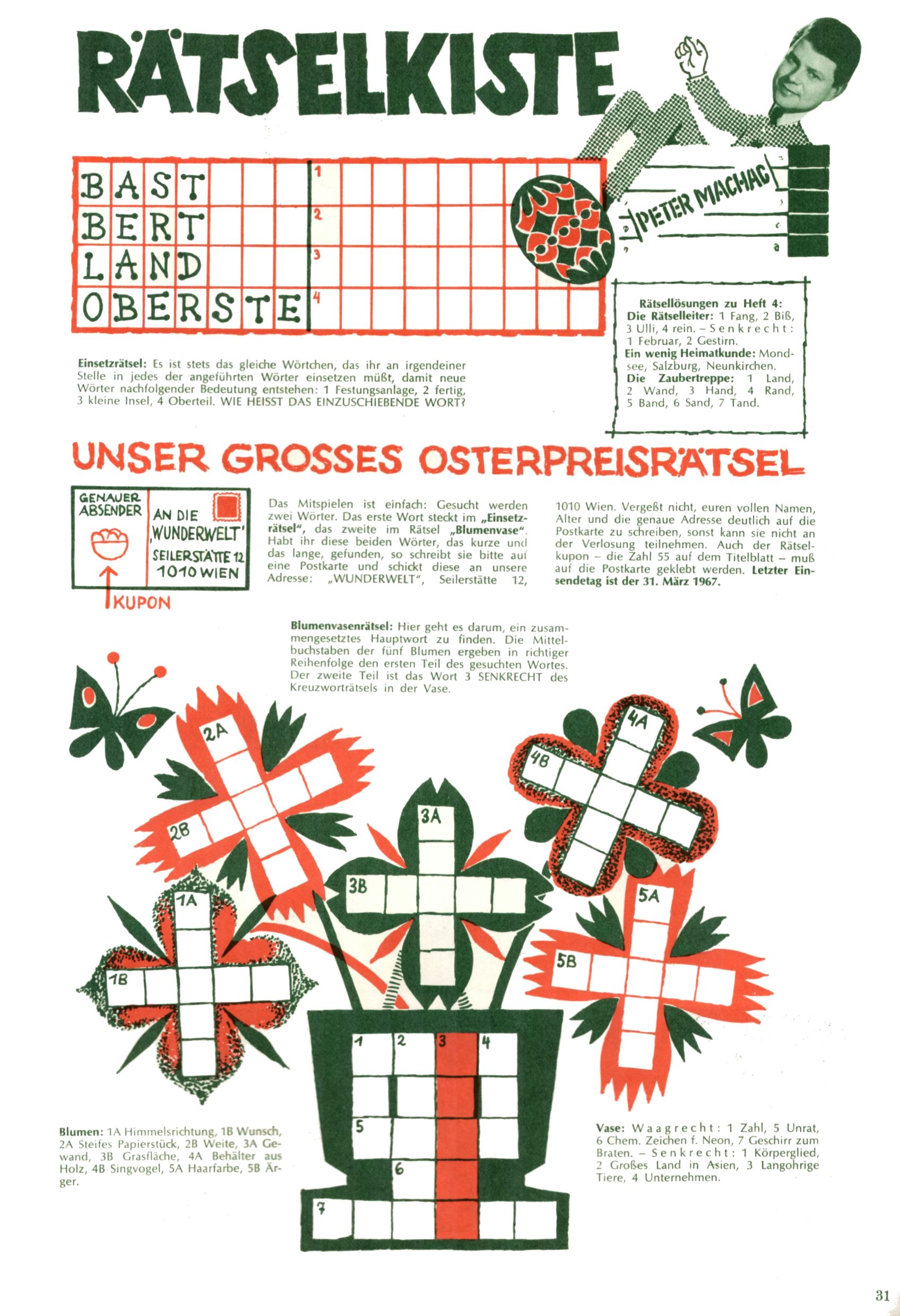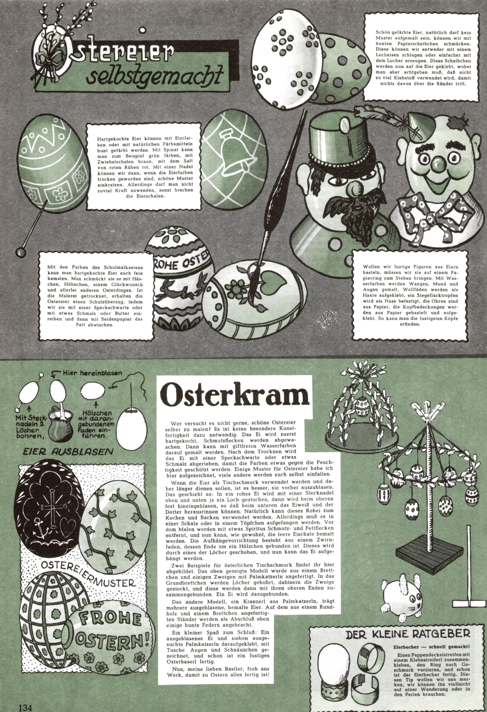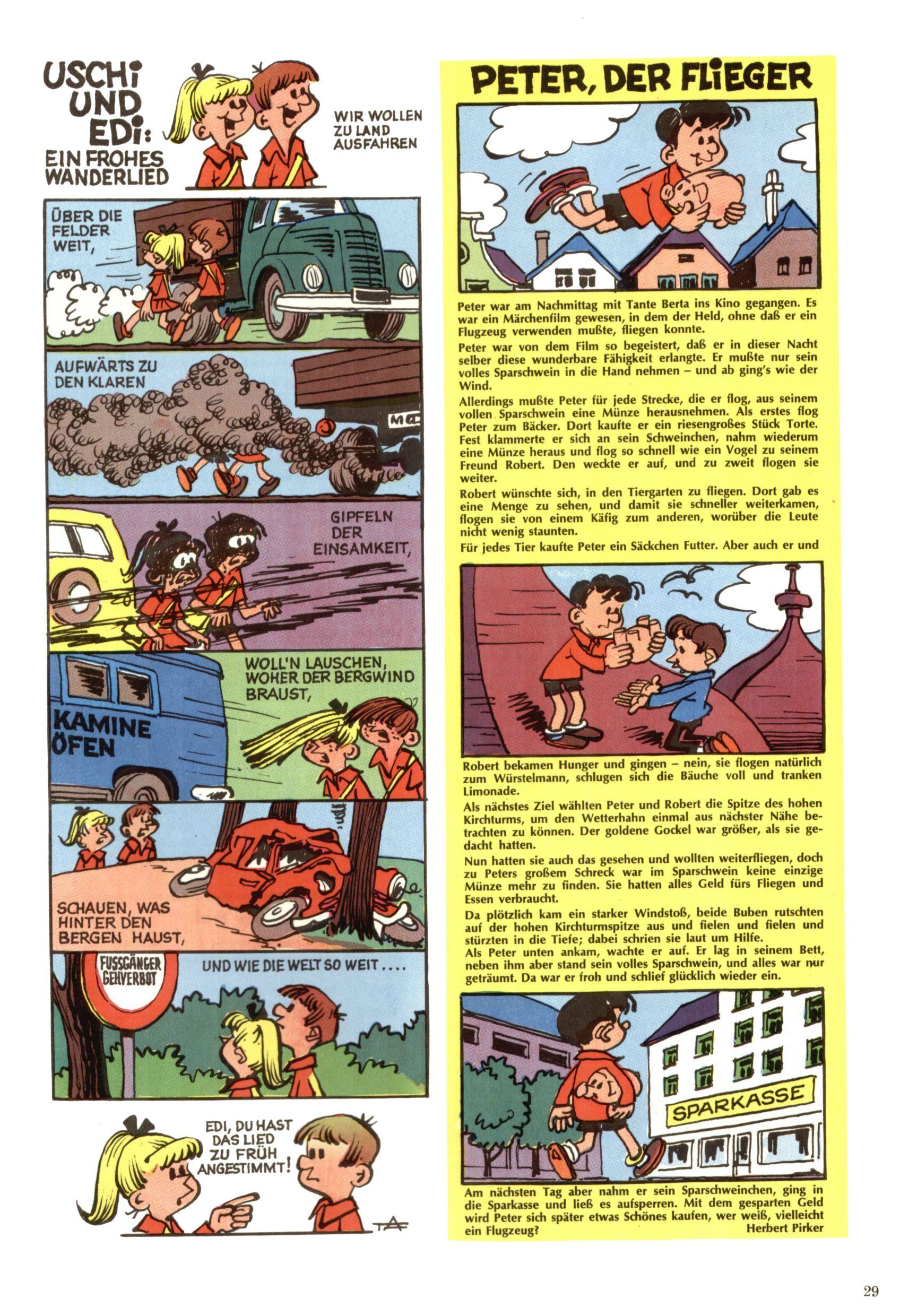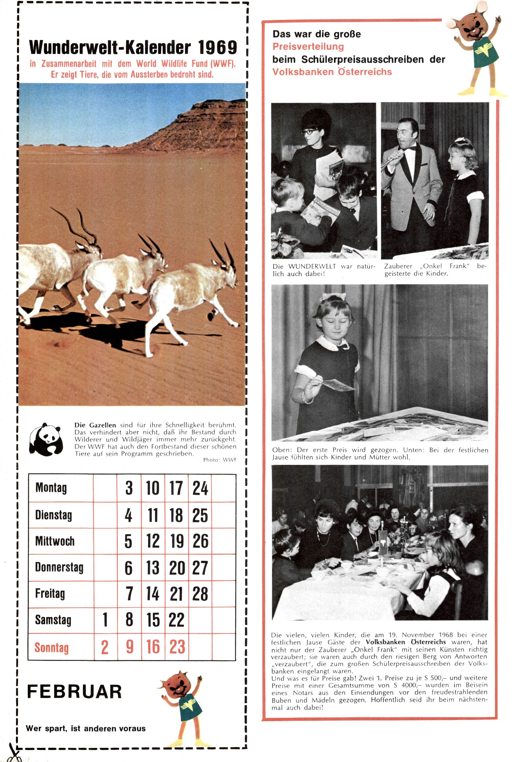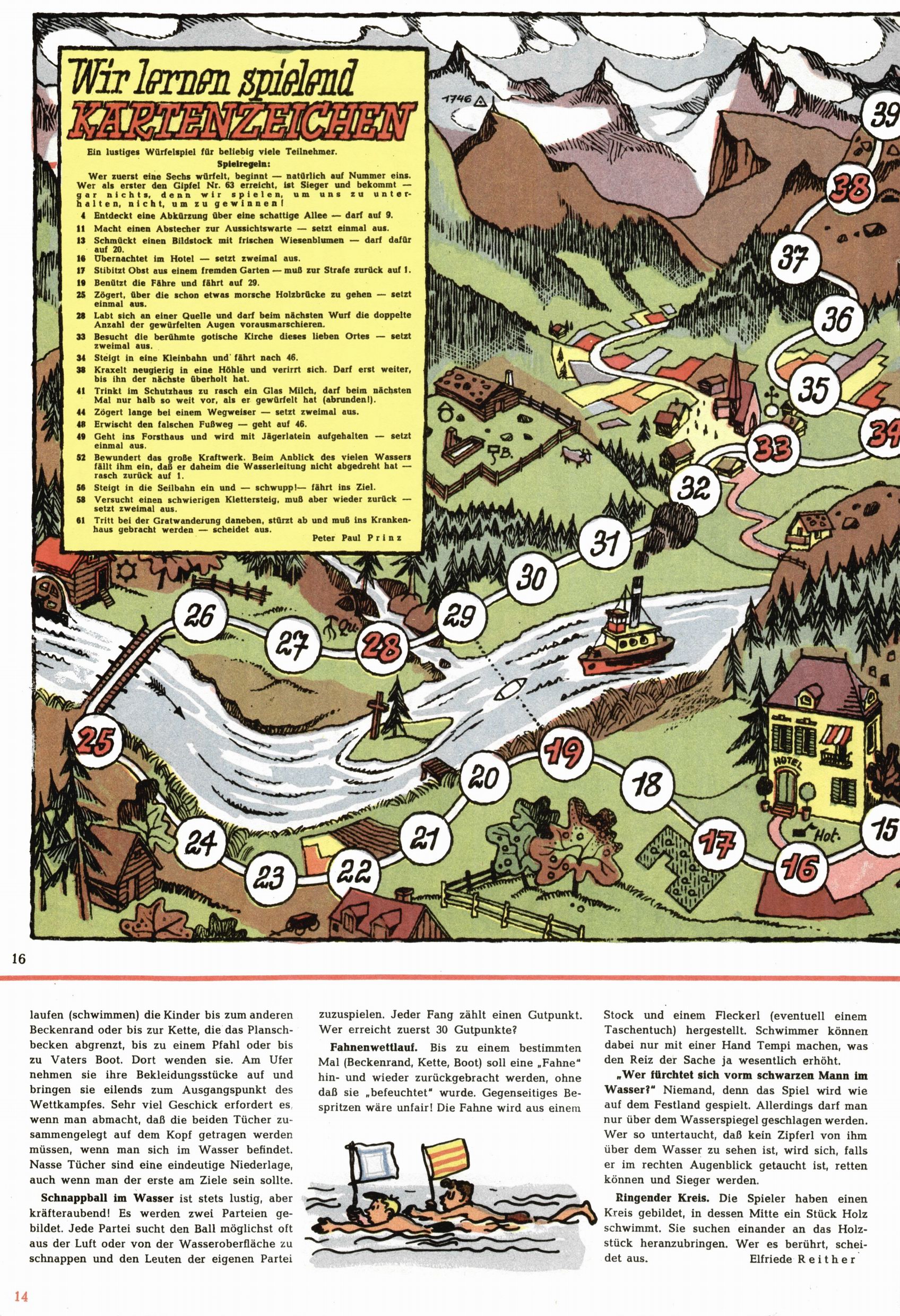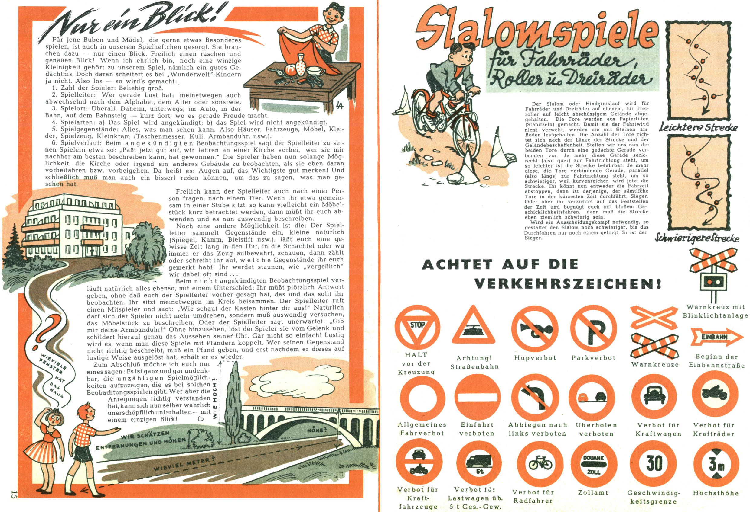 Die Wunderwelt im Festtagsgewand In den Sonderheften präsentierte sich die Wunderwelt wahrhaftig in Feiertagsstimmung. Mit wenigen Ausnahmen gab es pro Jahr drei Sonderhefte - zu Weihnachten bzw. im Advent, zu Ostern und in den Ferien im Sommer. Experimente mit Faschings- und Muttertagsheften hatten sich nicht bewährt. Selbst als es die Einzelhefte in der Krisensituation nach 1967 nicht mehr gab, wurde die Wunderwelt-Zeitung im Layout der Sonderhefte fortgesetzt: Zunächst mit 3 bis 5 und ab 1971 immerhin wieder mit 10-12 Heften pro Jahr. Die Weihnachts-, Oster- und Ferienhefte hatten naturgemäß verschiedene Schwerpunkte. Während im Sommer Spielen und Werken mit Material im Vordergrund stand, waren es zu Weihnachten Krippen und Adventhäuser; zu Ostern dann Erzählungen, Hasenstädte und Oster-Basteleien. Das bessere Papier der Sonderhefte erleichterte das Ausschneiden der insgesamt mehr als 1000 Papiermodelle erheblich. Die Sonderhefte waren vergleichsweise aufwändig gestaltet, aber auch ein wichtiges Zusatzgeschäft für die Zeitung. Die Kinder fieberten dem Erscheinungsdatum der jeweiligen Ausgabe nicht selten richtiggehend entgegen. Mit knapp 100 Seiten pro Jahr machten die Sonderhefte von der Menge her zwar nicht einmal ein Viertel aus, trugen aber zum Erscheinungsbild mindestens genauso viel bei wie die Standardhefte. Im Wesentlichen blieb das Layout der Sonderhefte über die Jahre hin unverändert. Mühselig wurde es, als man den Inhalt der Beiträge vorübergehend auf die Seiten gleichmäßig verteilte und die Kinder ermunterte, die Hefte in der Mitte zu zerschneiden. Die eine Hälfte enthielt dann etwa Erzählungen und Bastelvorschläge, der andere Teil der Zeitung Spielanleitungen. Zur übersichtlichkeit trugen diese Layoutversuche jedenfalls in keiner Weise bei und als besonderen Auswuchs gab es eine Zeitlang auf einer Seite oft mehrere Seitennummern, je nachdem, ob sich diese auf das Gesamtheft oder den herauszunehmenden und zu zerschneidenden Heftteil bezogen. Gegen Ende der 1950er Jahre kehrte man wieder zu einem ganzseitigen Layout zurück und Ideen wie ein Spiel-(Heft-im-)Heft gehörten der Vergangenheit an. In den Sonderheften experimentierte man dann noch ab Mitte der 1960er Jahre, als die Verkaufszahlen stark rückläufig waren, mit grundsätzlich neuen Darstellungsformen - weg vom Niedlich-Kitschigen und engagierte neue Grafikerinnen wie Gundi Groh und Hella Soyka. Den erhofften Erfolg brachte dies jedoch nicht mehr. |