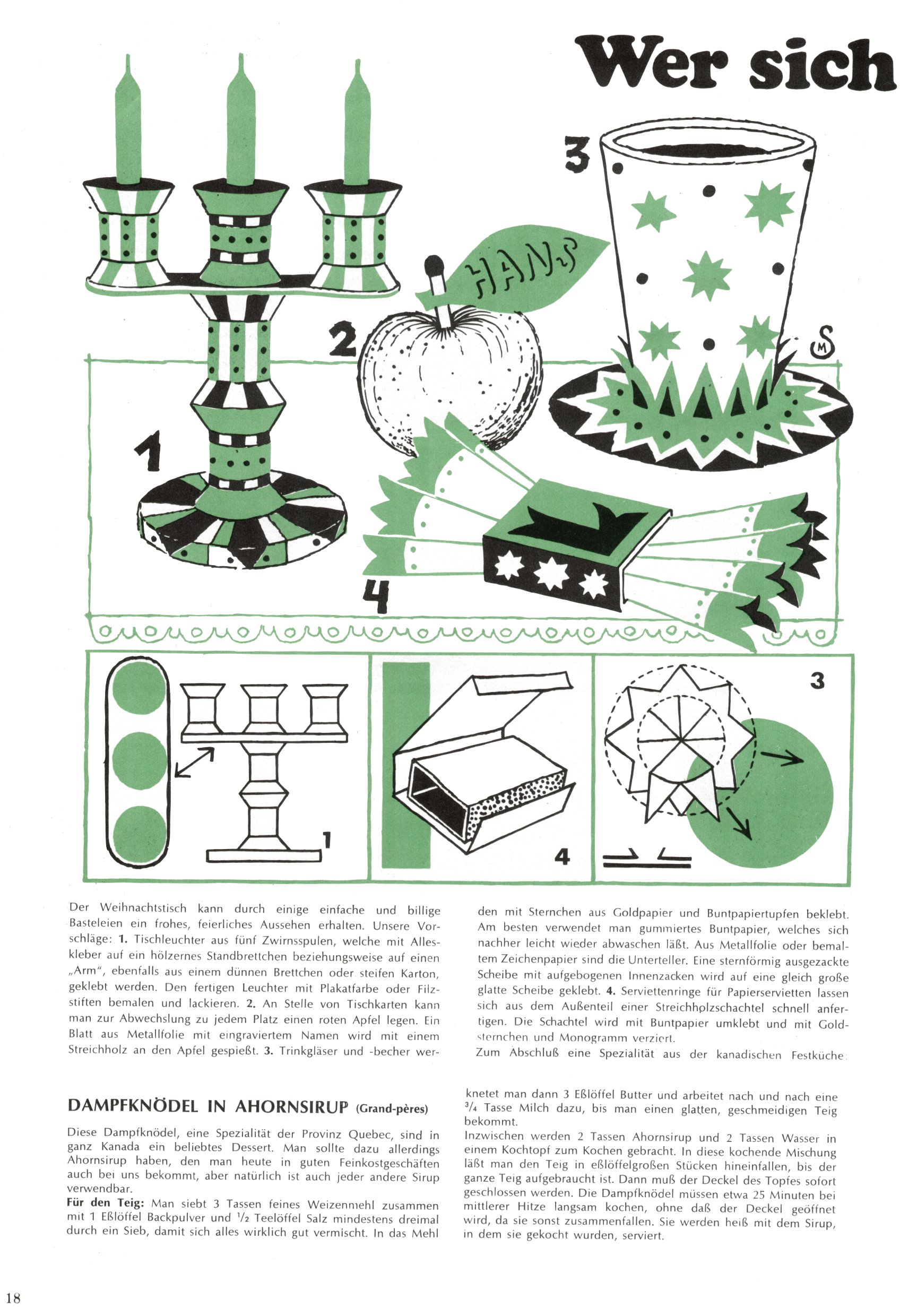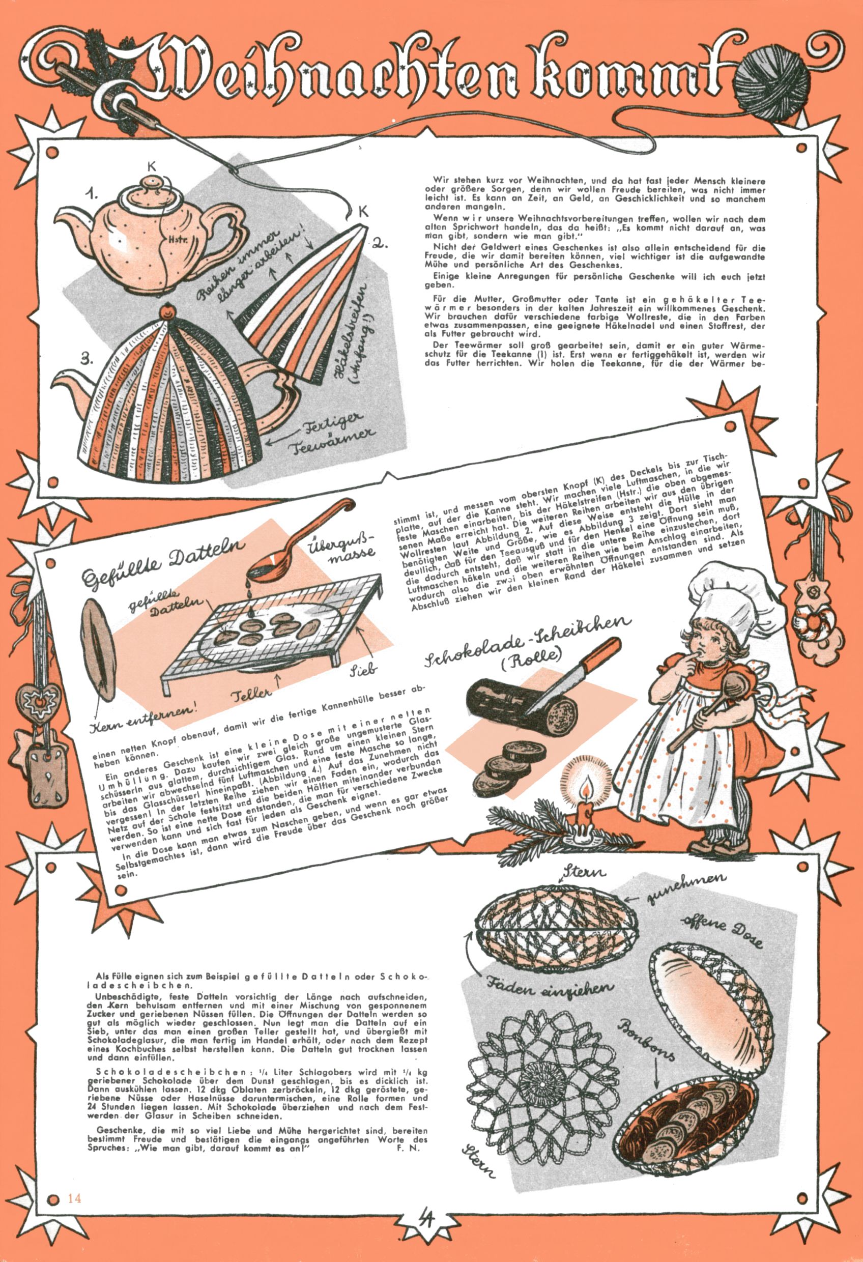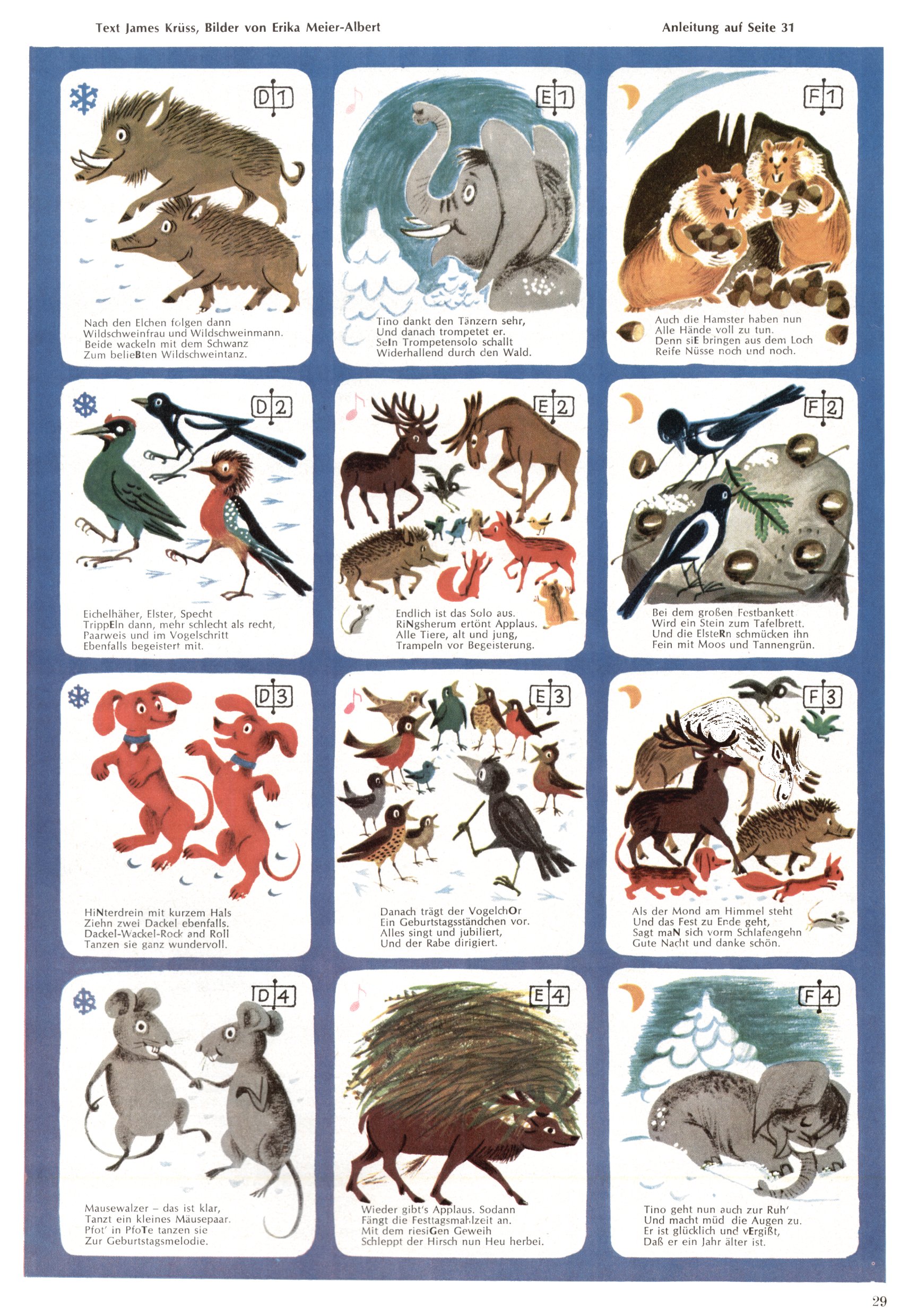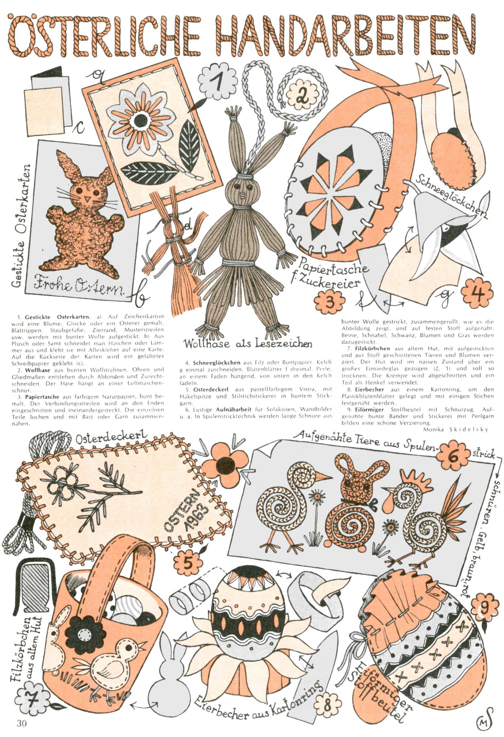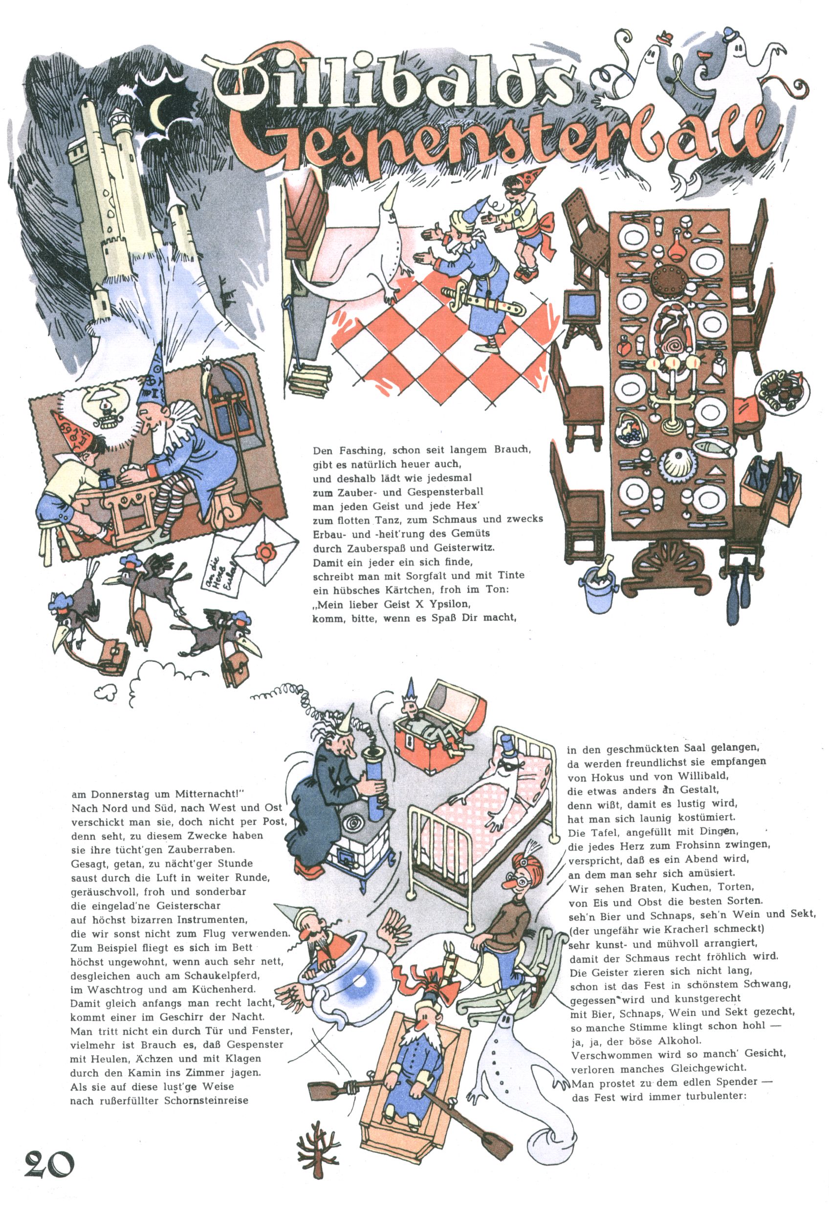 Die Wunderwelt im Festtagsgewand In den Sonderheften präsentierte sich die Wunderwelt wahrhaftig in Feiertagsstimmung. Mit wenigen Ausnahmen gab es pro Jahr drei Sonderhefte - zu Weihnachten bzw. im Advent, zu Ostern und in den Ferien im Sommer. Experimente mit Faschings- und Muttertagsheften hatten sich nicht bewährt. Selbst als es die Einzelhefte in der Krisensituation nach 1967 nicht mehr gab, wurde die Wunderwelt-Zeitung im Layout der Sonderhefte fortgesetzt: Zunächst mit 3 bis 5 und ab 1971 immerhin wieder mit 10-12 Heften pro Jahr. Die Weihnachts-, Oster- und Ferienhefte hatten naturgemäß verschiedene Schwerpunkte. Während im Sommer Spielen und Werken mit Material im Vordergrund stand, waren es zu Weihnachten Krippen und Adventhäuser; zu Ostern dann Erzählungen, Hasenstädte und Oster-Basteleien. Das bessere Papier der Sonderhefte erleichterte das Ausschneiden der insgesamt mehr als 1000 Papiermodelle erheblich. Die Sonderhefte waren vergleichsweise aufwändig gestaltet, aber auch ein wichtiges Zusatzgeschäft für die Zeitung. Die Kinder fieberten dem Erscheinungsdatum der jeweiligen Ausgabe nicht selten richtiggehend entgegen. Mit knapp 100 Seiten pro Jahr machten die Sonderhefte von der Menge her zwar nicht einmal ein Viertel aus, trugen aber zum Erscheinungsbild mindestens genauso viel bei wie die Standardhefte. Im Wesentlichen blieb das Layout der Sonderhefte über die Jahre hin unverändert. Mühselig wurde es, als man den Inhalt der Beiträge vorübergehend auf die Seiten gleichmäßig verteilte und die Kinder ermunterte, die Hefte in der Mitte zu zerschneiden. Die eine Hälfte enthielt dann etwa Erzählungen und Bastelvorschläge, der andere Teil der Zeitung Spielanleitungen. Zur übersichtlichkeit trugen diese Layoutversuche jedenfalls in keiner Weise bei und als besonderen Auswuchs gab es eine Zeitlang auf einer Seite oft mehrere Seitennummern, je nachdem, ob sich diese auf das Gesamtheft oder den herauszunehmenden und zu zerschneidenden Heftteil bezogen. Gegen Ende der 1950er Jahre kehrte man wieder zu einem ganzseitigen Layout zurück und Ideen wie ein Spiel-(Heft-im-)Heft gehörten der Vergangenheit an. In den Sonderheften experimentierte man dann noch ab Mitte der 1960er Jahre, als die Verkaufszahlen stark rückläufig waren, mit grundsätzlich neuen Darstellungsformen - weg vom Niedlich-Kitschigen und engagierte neue Grafikerinnen wie Gundi Groh und Hella Soyka. Den erhofften Erfolg brachte dies jedoch nicht mehr. |