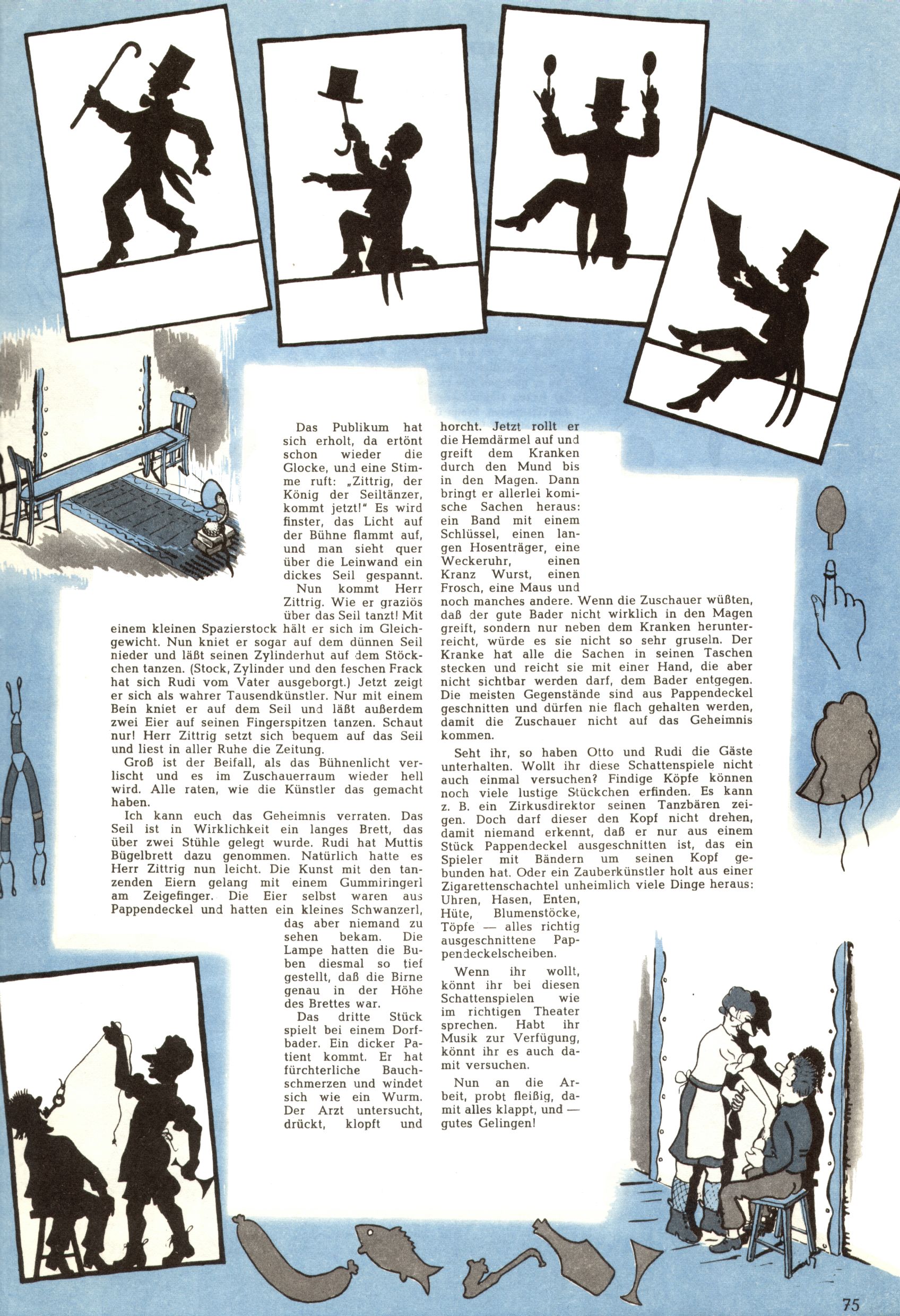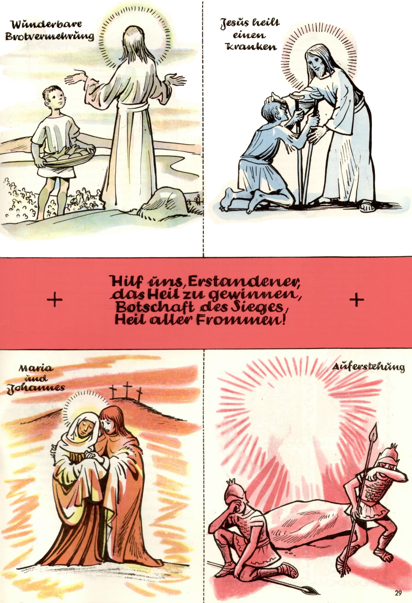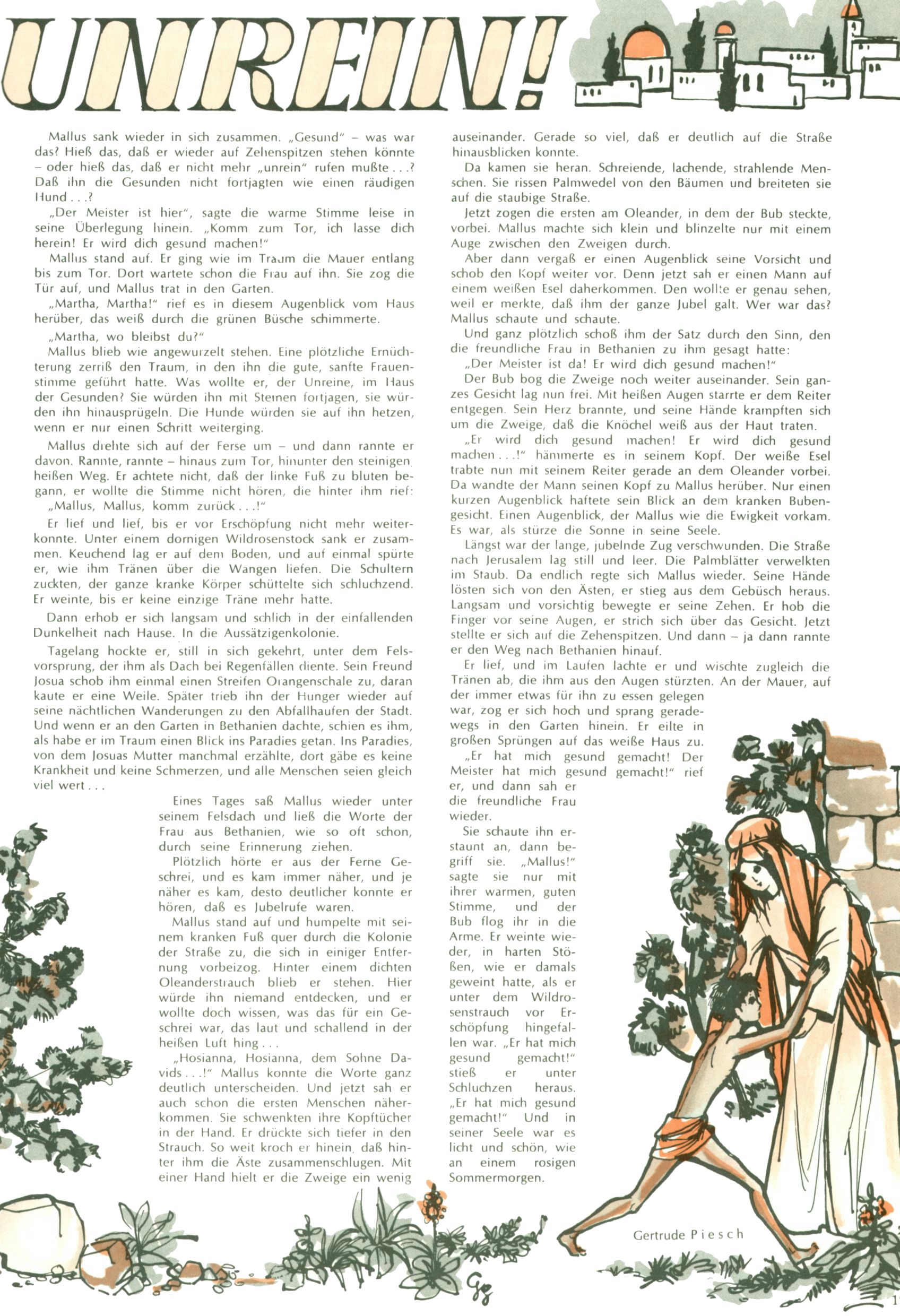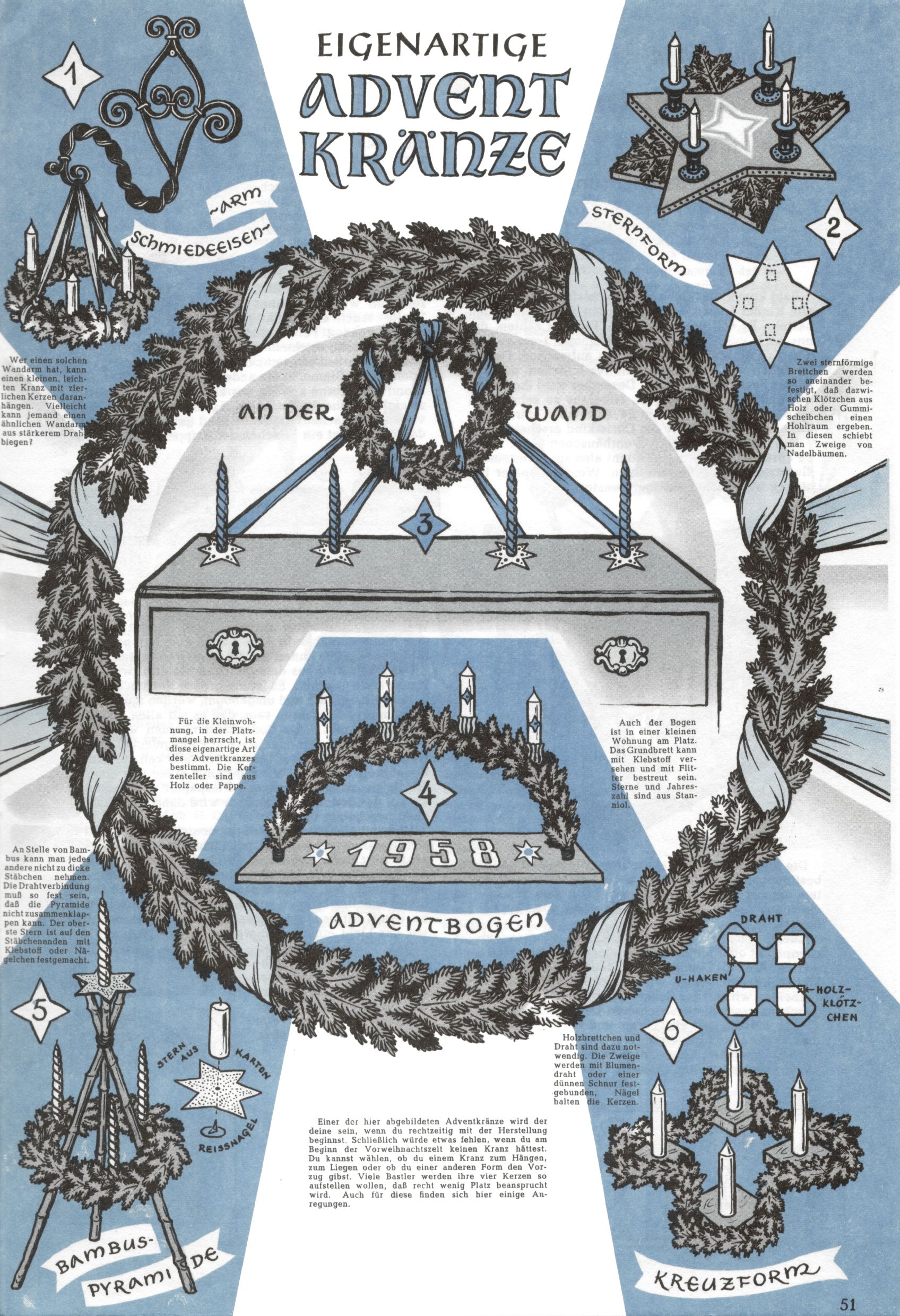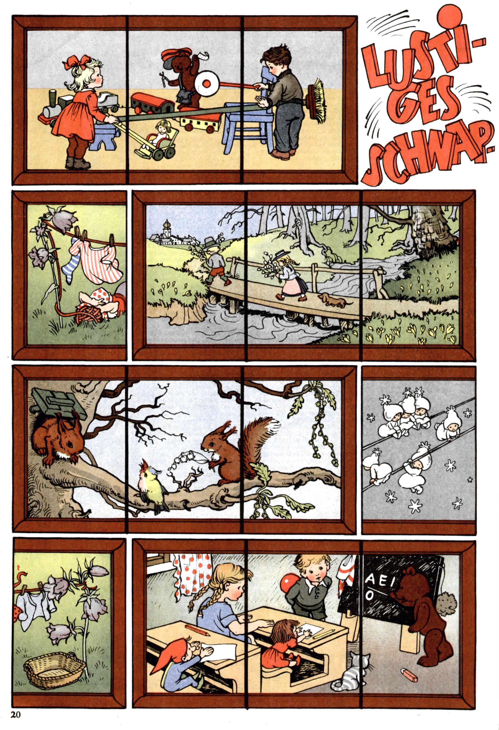 Die Wunderwelt im Festtagsgewand In den Sonderheften präsentierte sich die Wunderwelt wahrhaftig in Feiertagsstimmung. Mit wenigen Ausnahmen gab es pro Jahr drei Sonderhefte - zu Weihnachten bzw. im Advent, zu Ostern und in den Ferien im Sommer. Experimente mit Faschings- und Muttertagsheften hatten sich nicht bewährt. Selbst als es die Einzelhefte in der Krisensituation nach 1967 nicht mehr gab, wurde die Wunderwelt-Zeitung im Layout der Sonderhefte fortgesetzt: Zunächst mit 3 bis 5 und ab 1971 immerhin wieder mit 10-12 Heften pro Jahr. Die Weihnachts-, Oster- und Ferienhefte hatten naturgemäß verschiedene Schwerpunkte. Während im Sommer Spielen und Werken mit Material im Vordergrund stand, waren es zu Weihnachten Krippen und Adventhäuser; zu Ostern dann Erzählungen, Hasenstädte und Oster-Basteleien. Das bessere Papier der Sonderhefte erleichterte das Ausschneiden der insgesamt mehr als 1000 Papiermodelle erheblich. Die Sonderhefte waren vergleichsweise aufwändig gestaltet, aber auch ein wichtiges Zusatzgeschäft für die Zeitung. Die Kinder fieberten dem Erscheinungsdatum der jeweiligen Ausgabe nicht selten richtiggehend entgegen. Mit knapp 100 Seiten pro Jahr machten die Sonderhefte von der Menge her zwar nicht einmal ein Viertel aus, trugen aber zum Erscheinungsbild mindestens genauso viel bei wie die Standardhefte. Im Wesentlichen blieb das Layout der Sonderhefte über die Jahre hin unverändert. Mühselig wurde es, als man den Inhalt der Beiträge vorübergehend auf die Seiten gleichmäßig verteilte und die Kinder ermunterte, die Hefte in der Mitte zu zerschneiden. Die eine Hälfte enthielt dann etwa Erzählungen und Bastelvorschläge, der andere Teil der Zeitung Spielanleitungen. Zur übersichtlichkeit trugen diese Layoutversuche jedenfalls in keiner Weise bei und als besonderen Auswuchs gab es eine Zeitlang auf einer Seite oft mehrere Seitennummern, je nachdem, ob sich diese auf das Gesamtheft oder den herauszunehmenden und zu zerschneidenden Heftteil bezogen. Gegen Ende der 1950er Jahre kehrte man wieder zu einem ganzseitigen Layout zurück und Ideen wie ein Spiel-(Heft-im-)Heft gehörten der Vergangenheit an. In den Sonderheften experimentierte man dann noch ab Mitte der 1960er Jahre, als die Verkaufszahlen stark rückläufig waren, mit grundsätzlich neuen Darstellungsformen - weg vom Niedlich-Kitschigen und engagierte neue Grafikerinnen wie Gundi Groh und Hella Soyka. Den erhofften Erfolg brachte dies jedoch nicht mehr. |