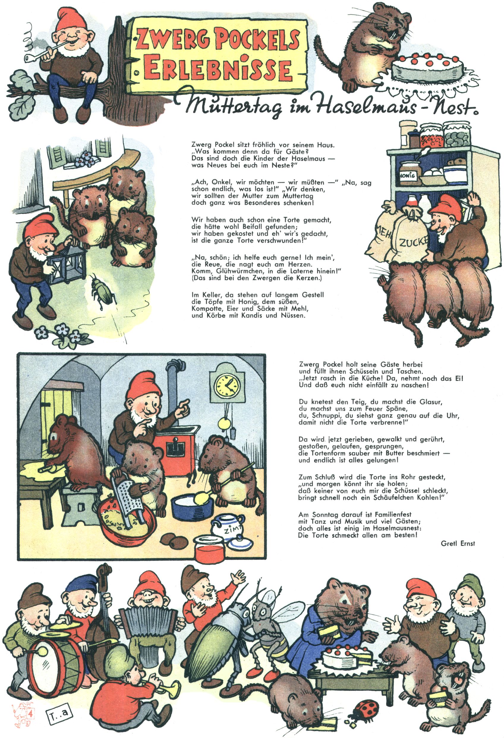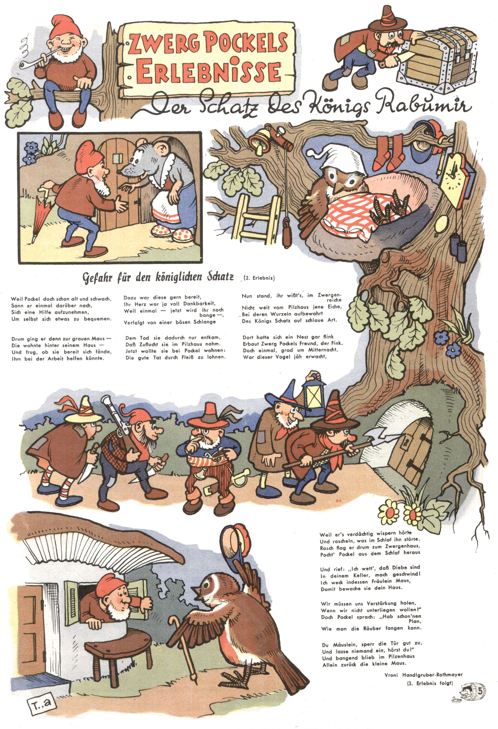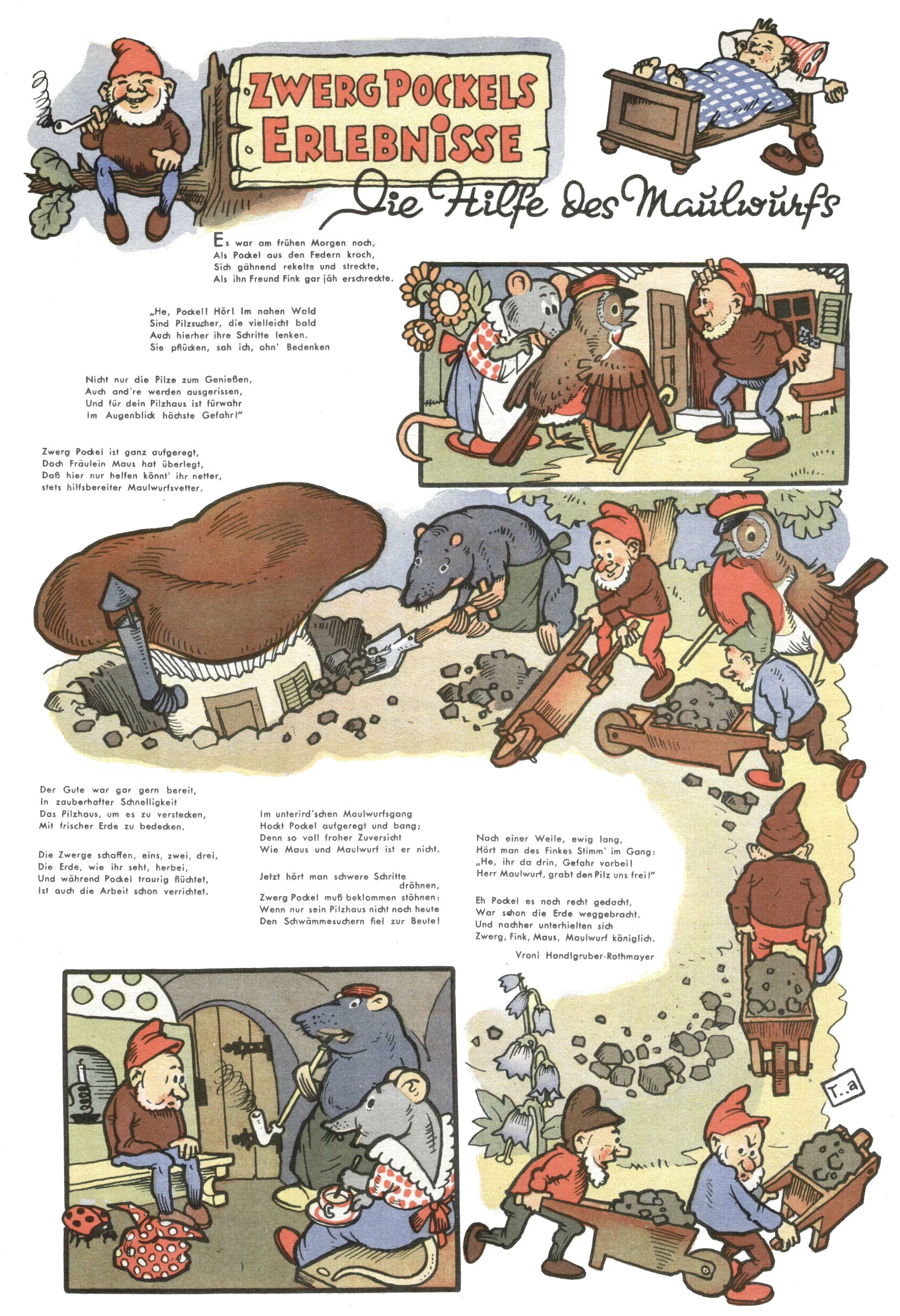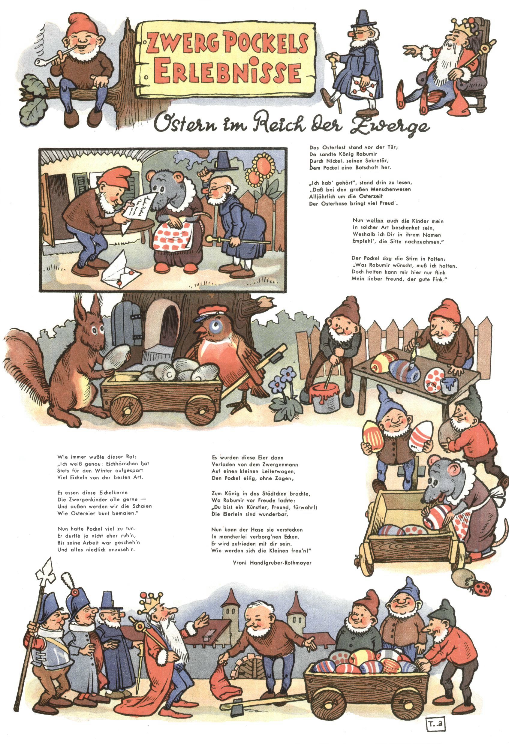 kreieren. Zunächst zeichnete Teja Aicher zu Texten über Pockls Abenteuer von Vroni Rothmayer-Handlgruber (Der Schatz des Königs Rabumir / Zwerg Pockl malt ein Fröschlein / Die Hilfe des Maulwurfs / Die Rettung Fräulein Schmetterlings / Ostern im Reich der Zwerge / Zwerg Pockl verjagt die böse Spinne) und Gretl Ernst (Muttertag im Haselmaus-Nest).