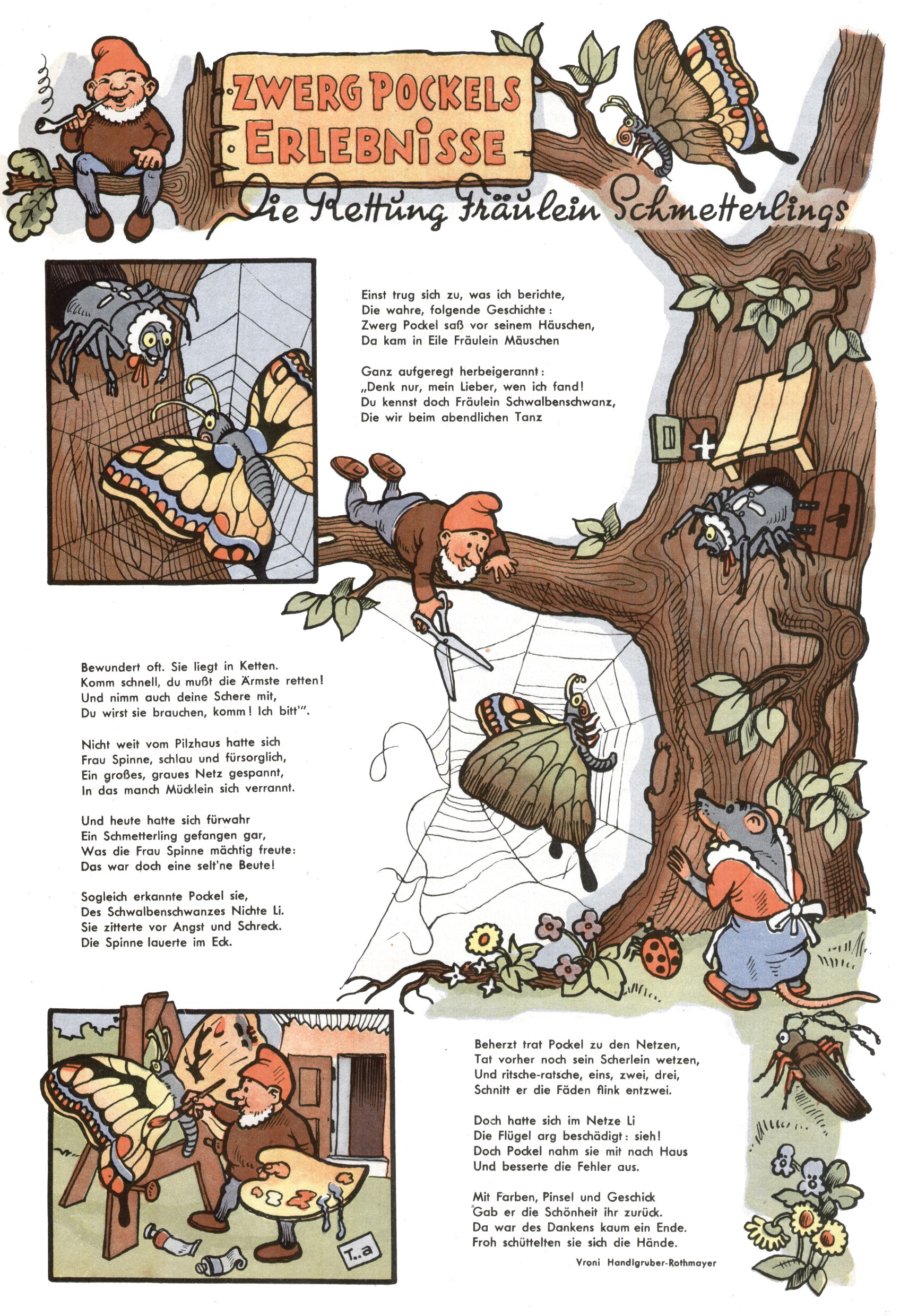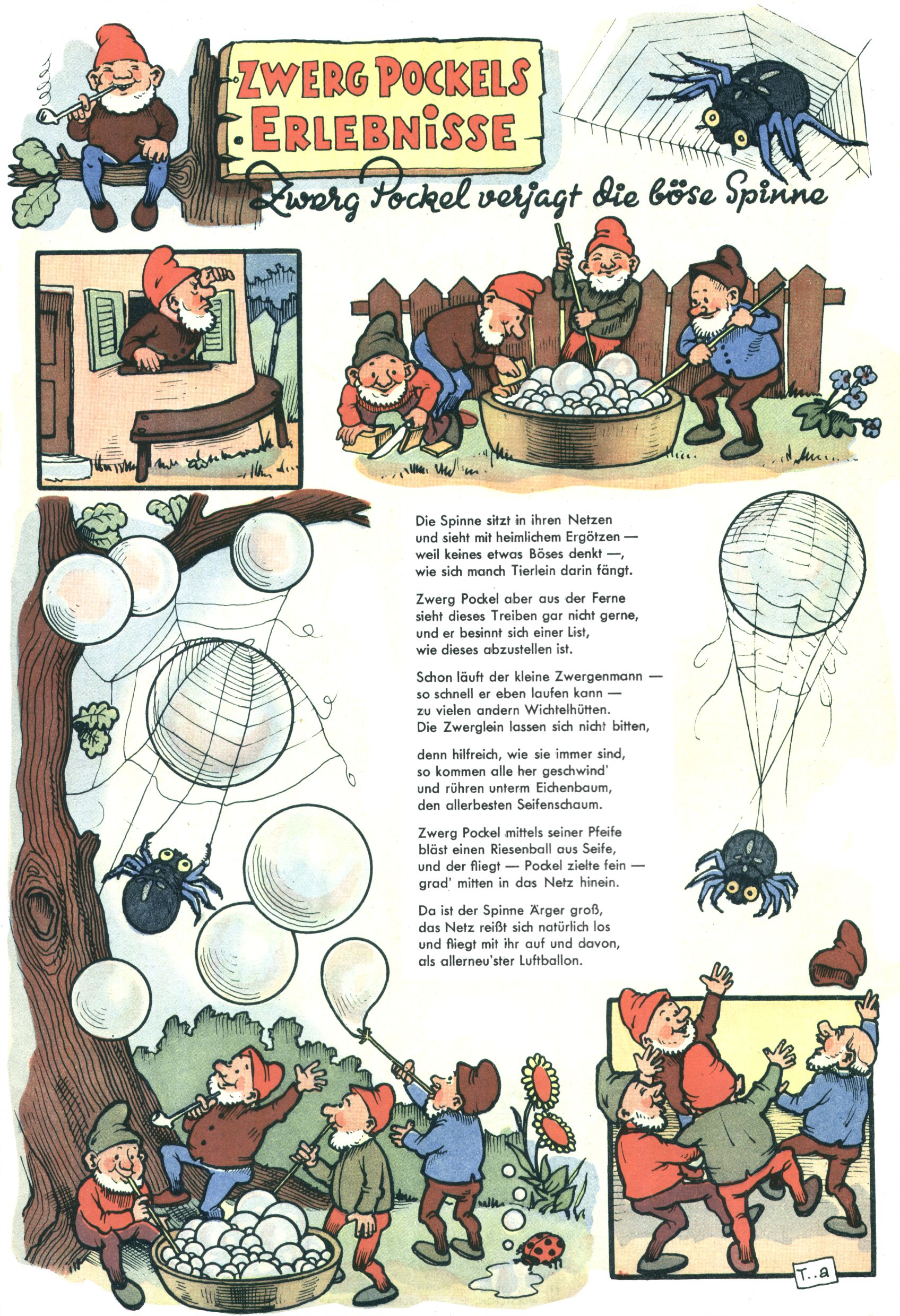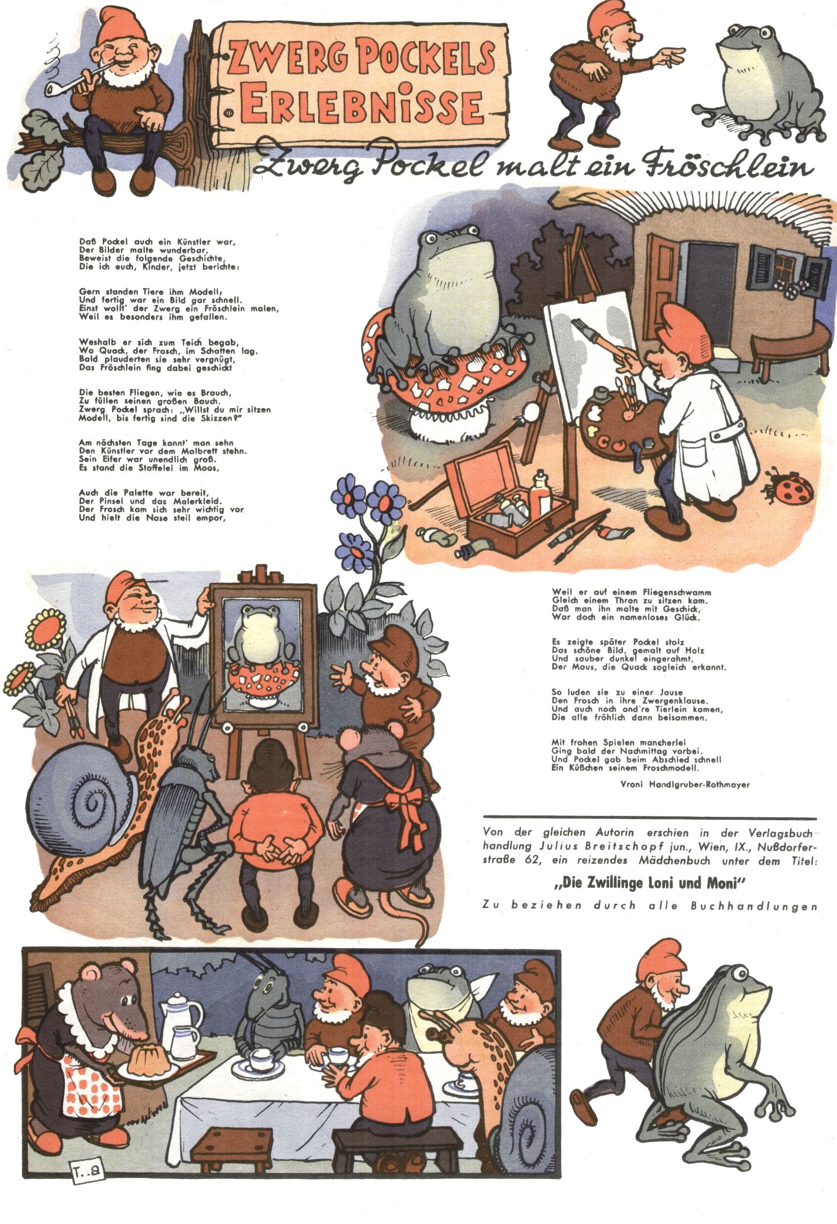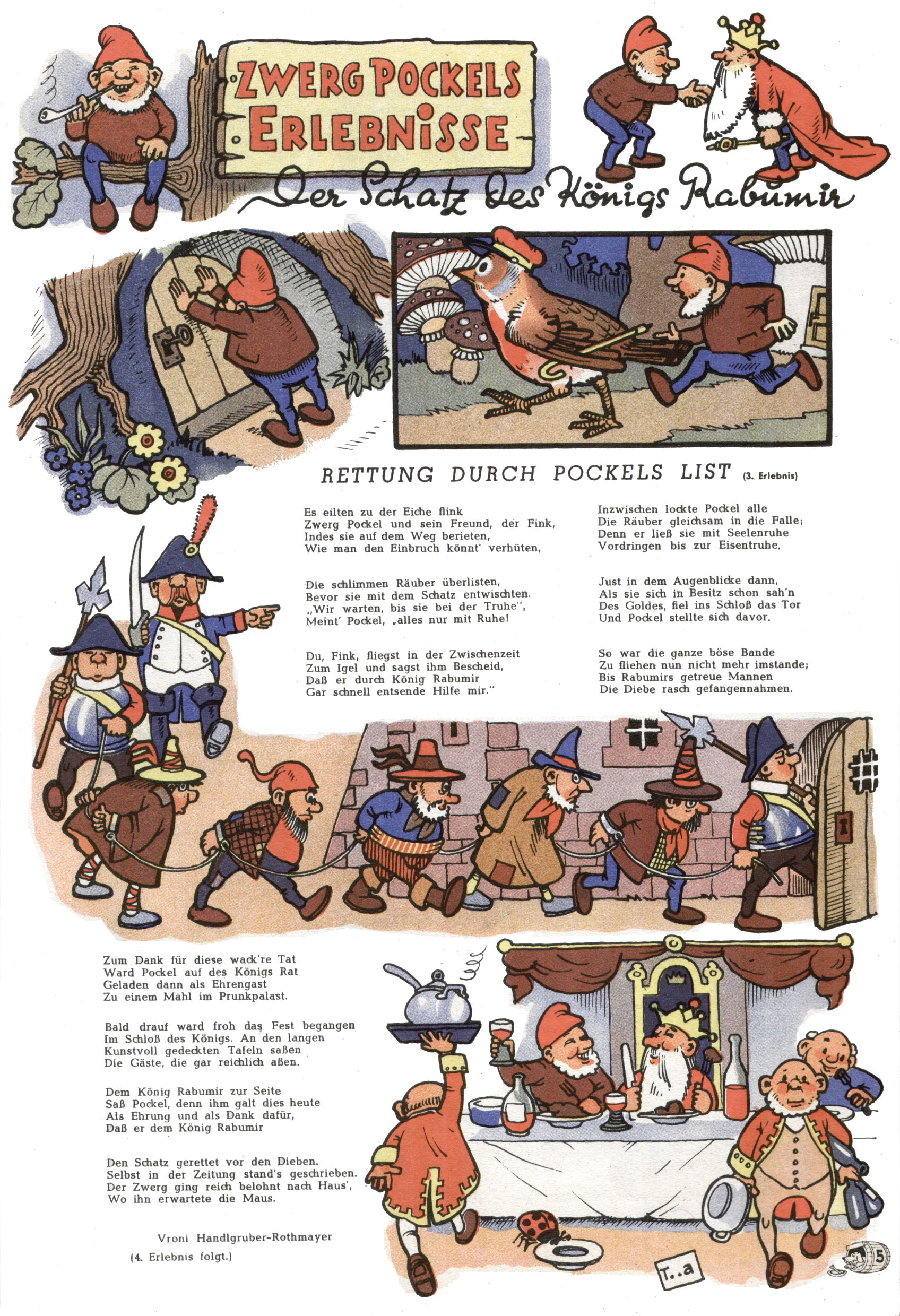 kreieren. Zunächst zeichnete Teja Aicher zu Texten über Pockls Abenteuer von Vroni Rothmayer-Handlgruber (Der Schatz des Königs Rabumir / Zwerg Pockl malt ein Fröschlein / Die Hilfe des Maulwurfs / Die Rettung Fräulein Schmetterlings / Ostern im Reich der Zwerge / Zwerg Pockl verjagt die böse Spinne) und Gretl Ernst (Muttertag im Haselmaus-Nest).